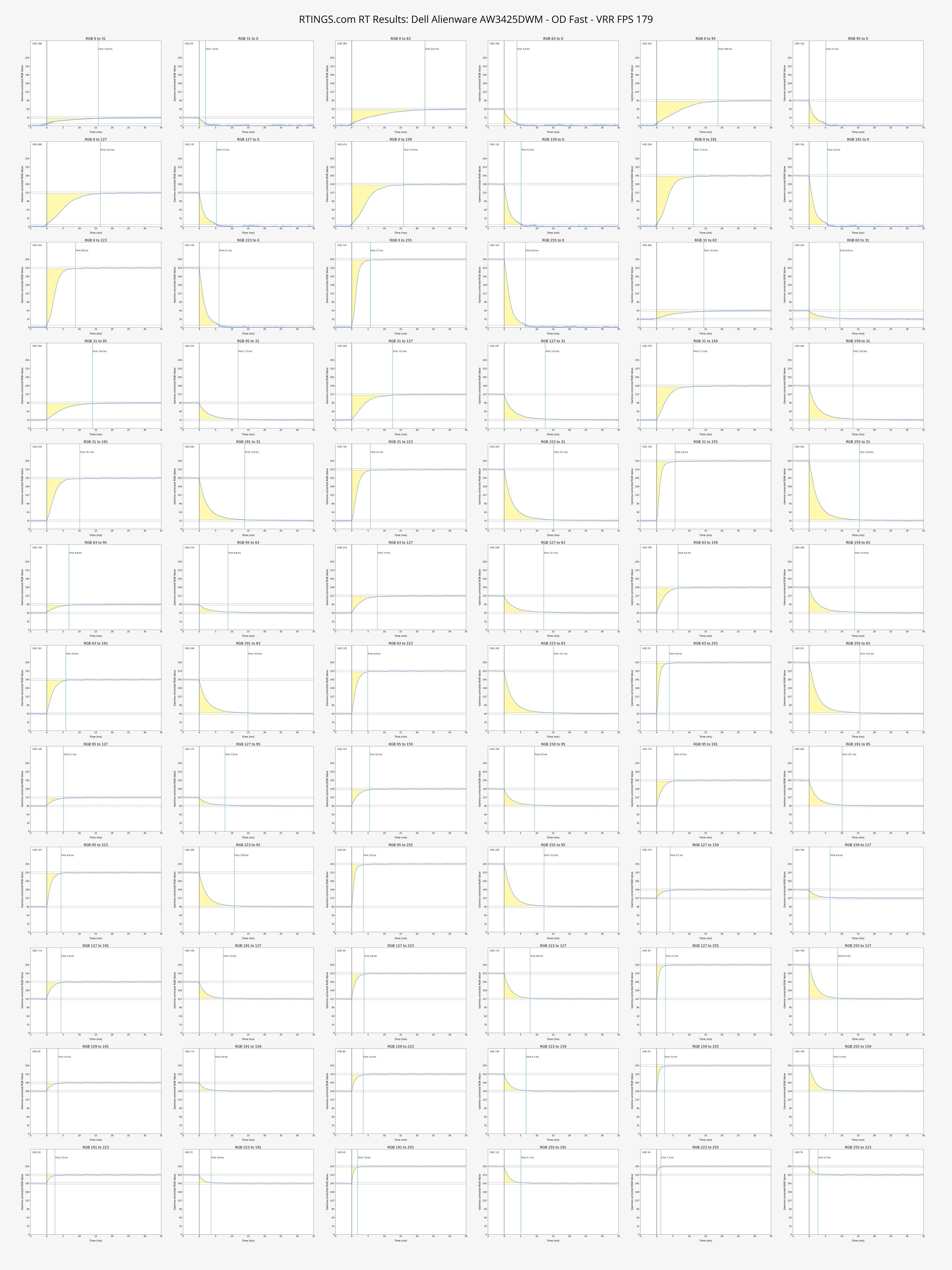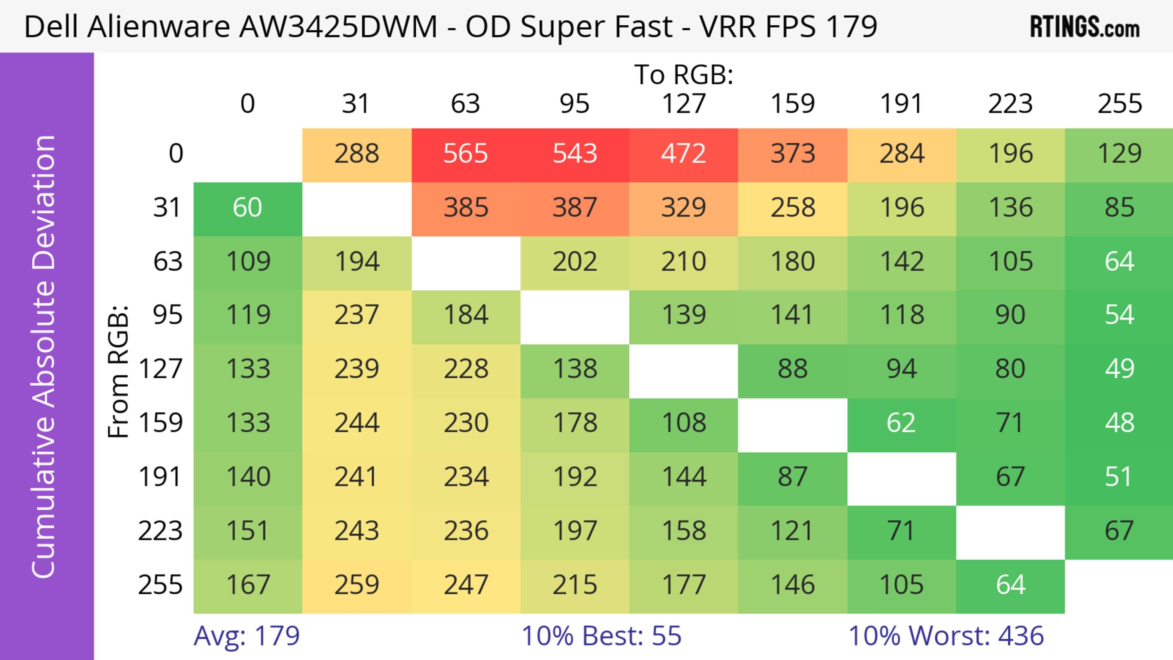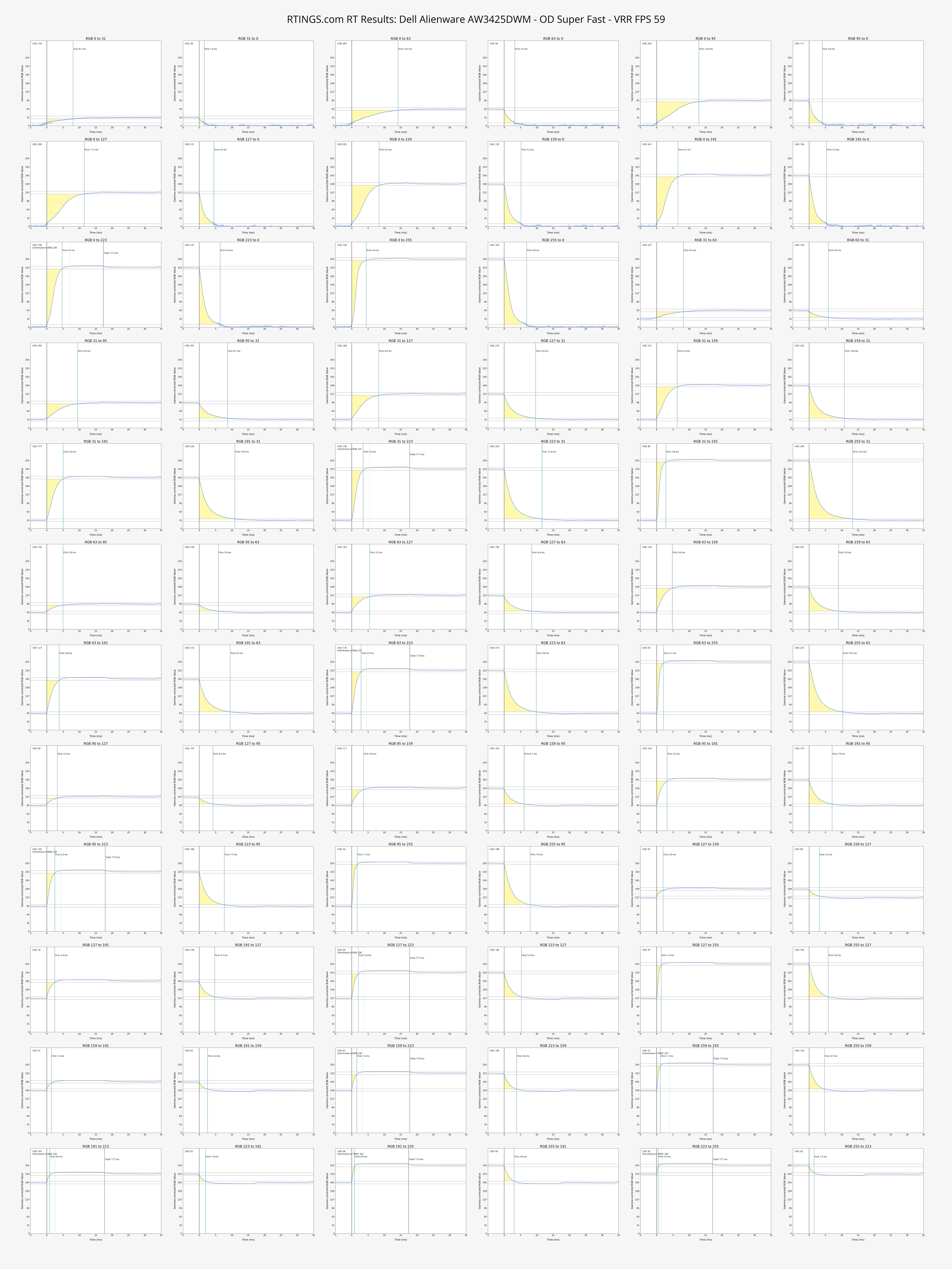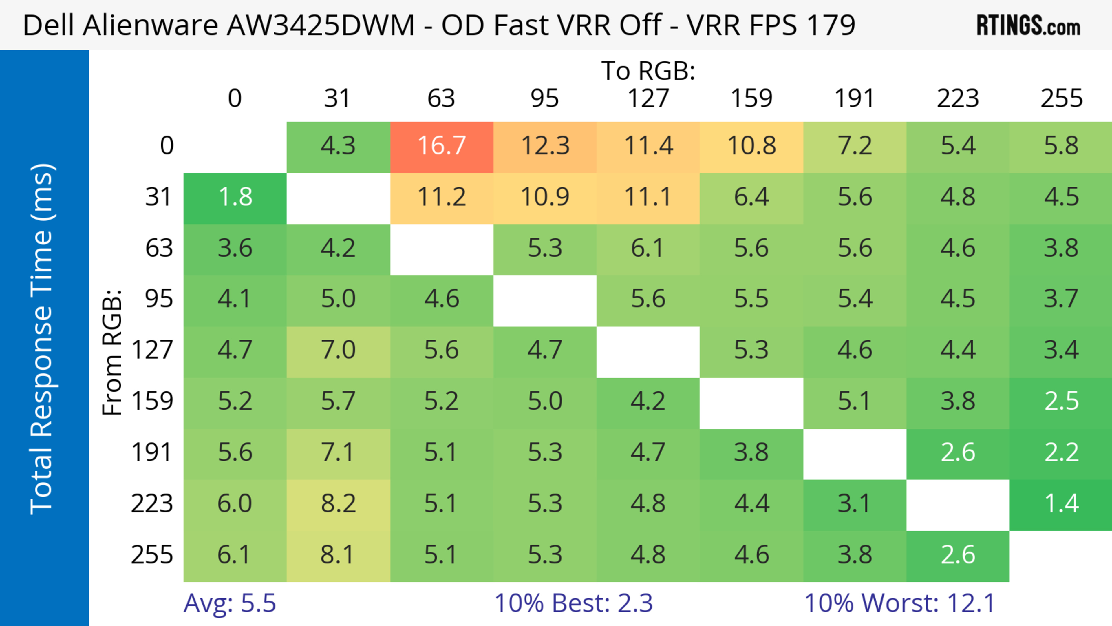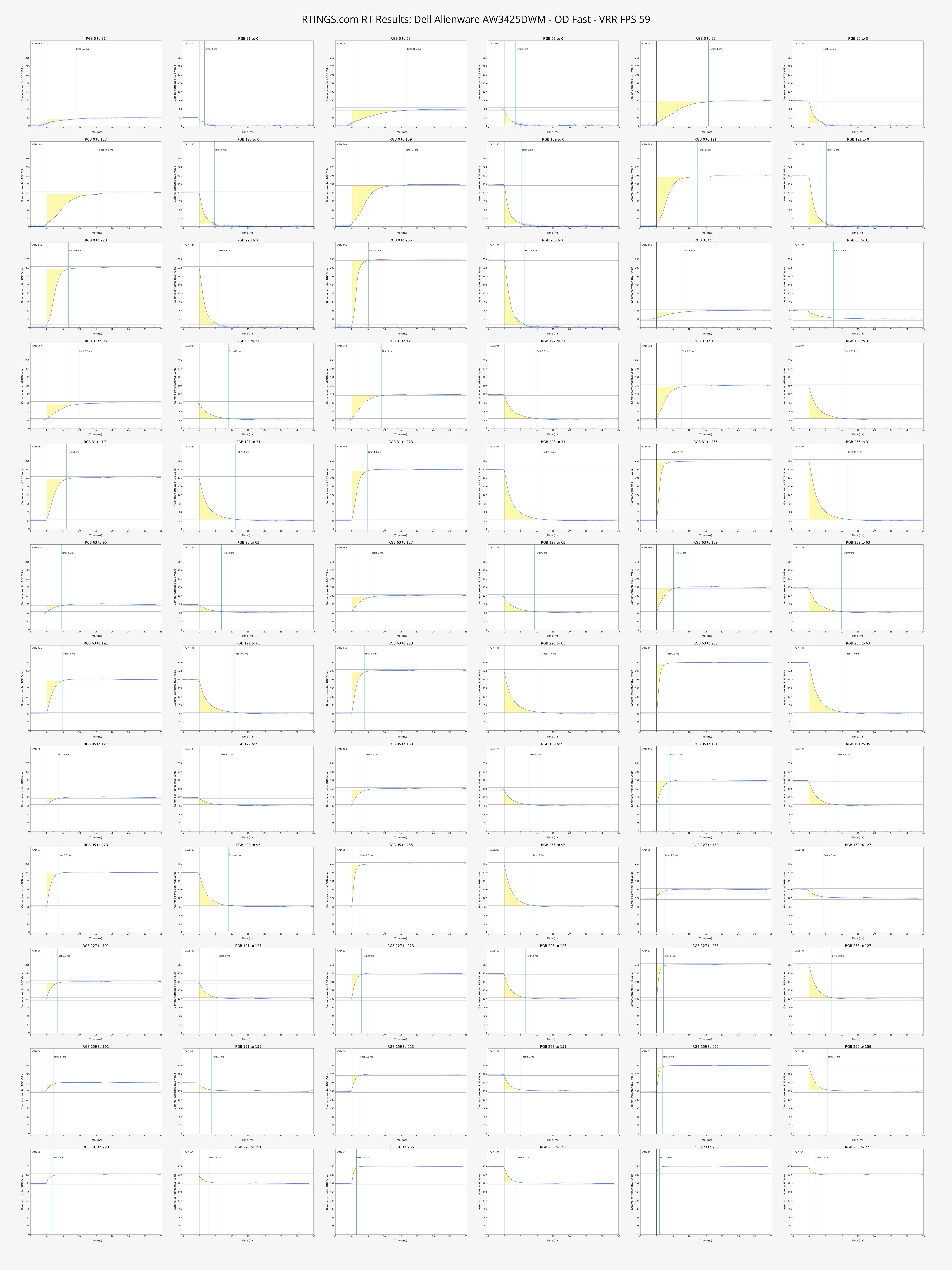 The Dell AW3425DWM has good motion handling across its VRR range. The 'Super Fast' Response Time setting is consistent as the refresh rate drops, but it has a slow response time with most transitions, particularly when going from dark to brighter colors, leading to black smearing behind fast-moving objects.