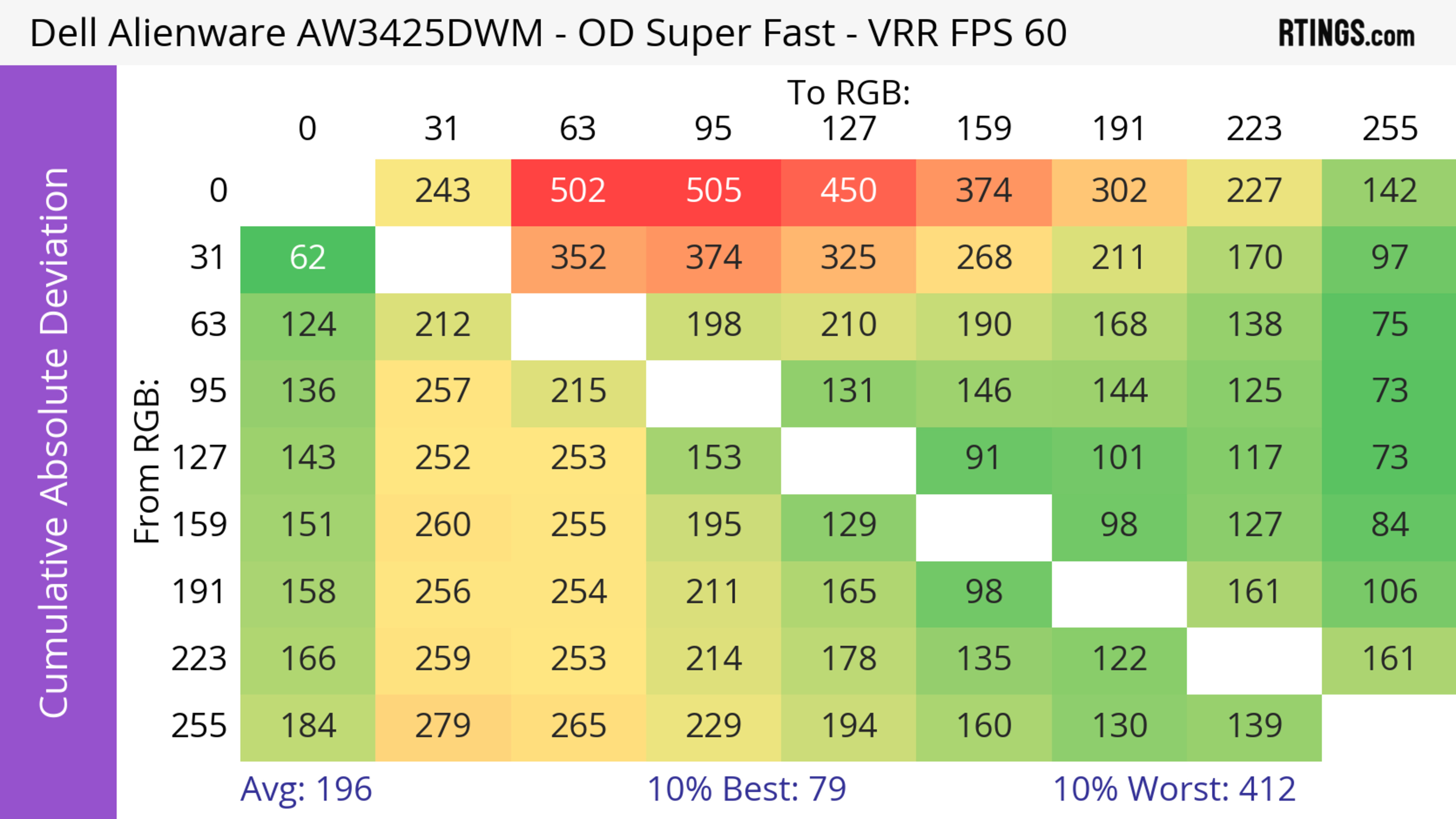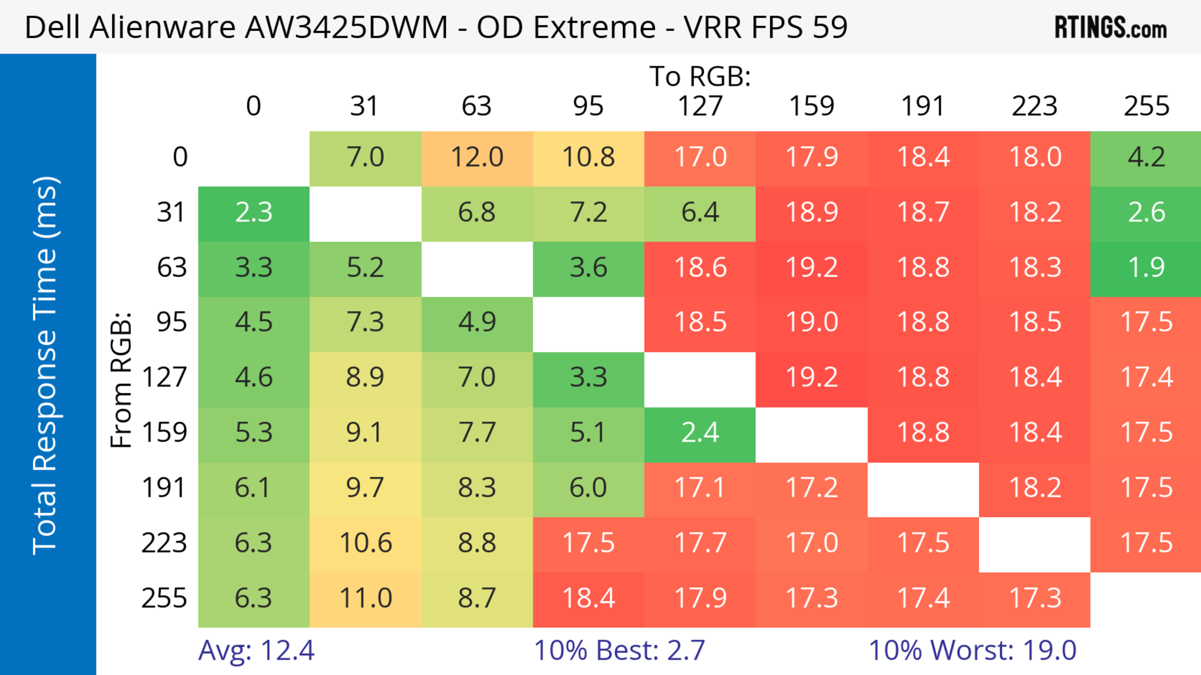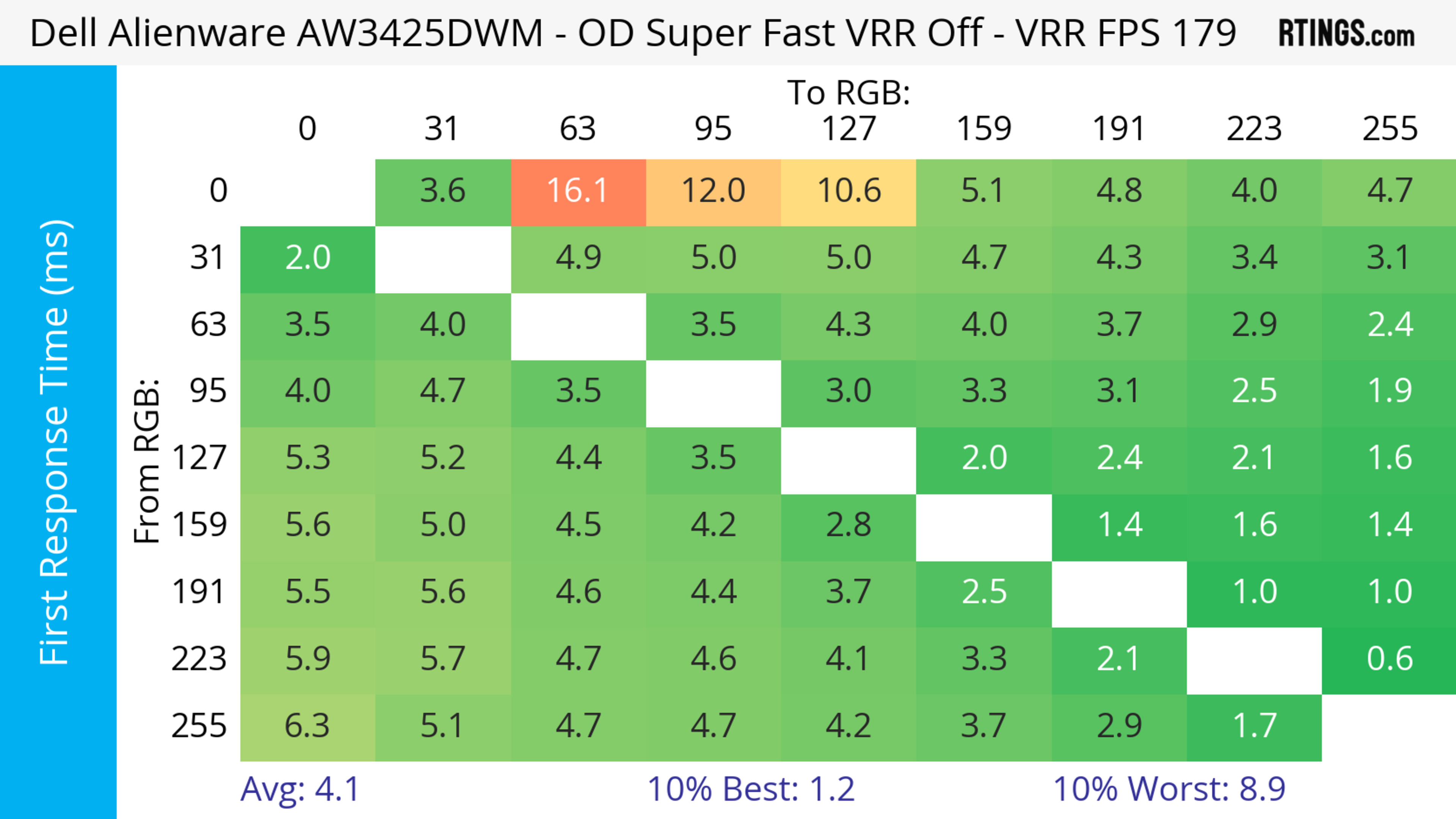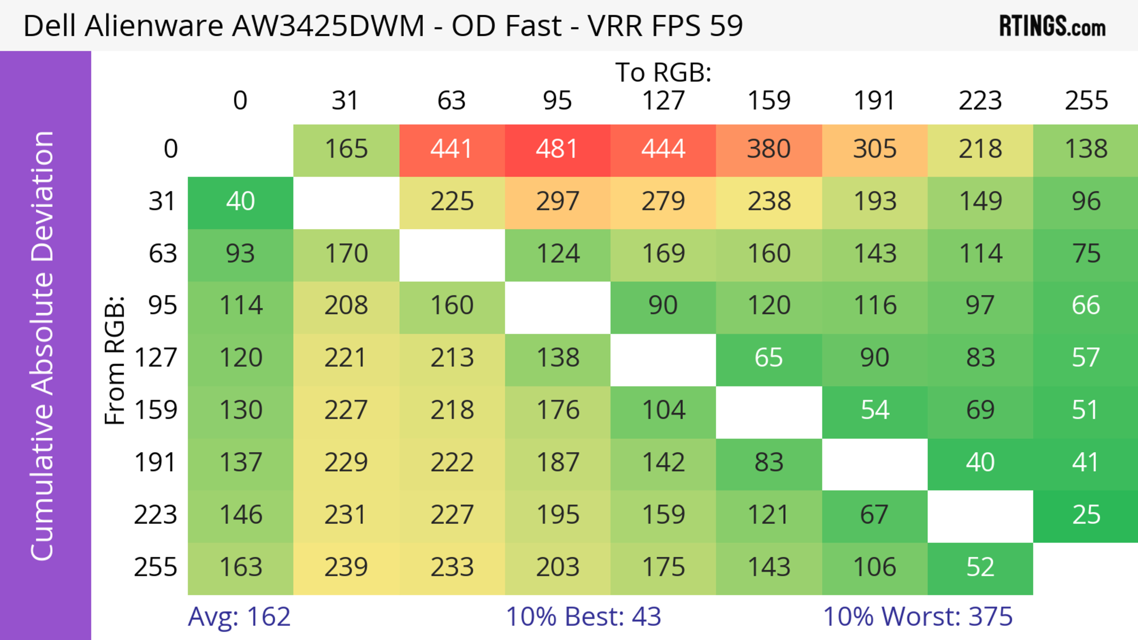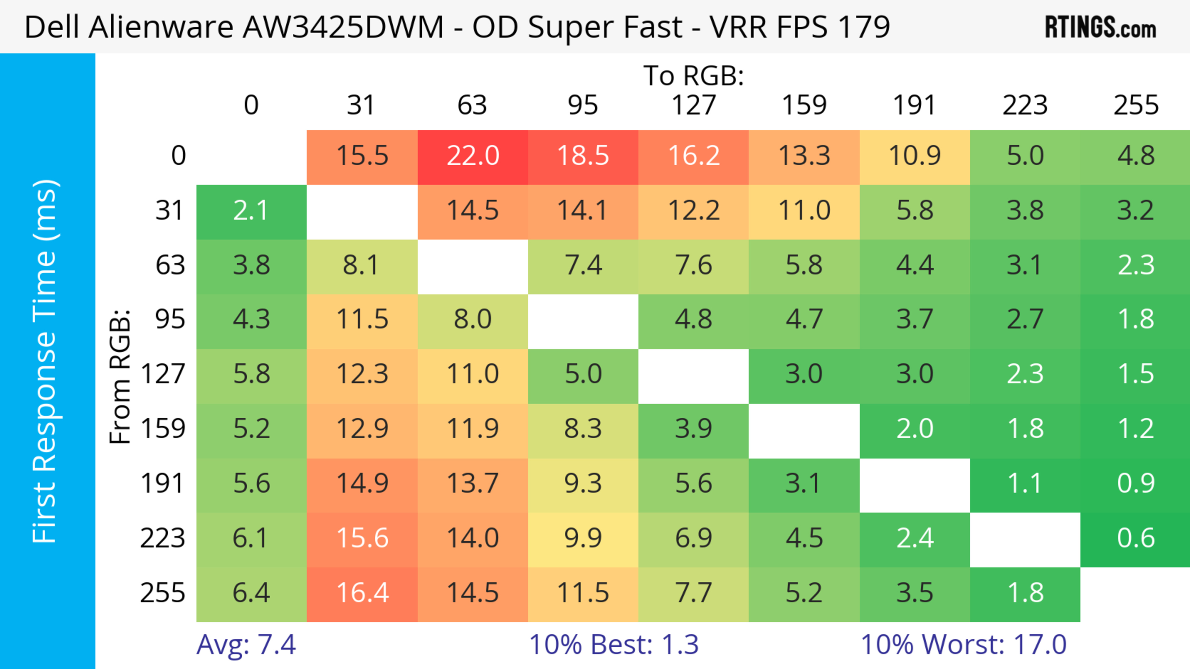 The Dell AW3425DWM has good motion handling across its VRR range. The 'Super Fast' Response Time setting is consistent as the refresh rate drops, but it has a slow response time with most transitions, particularly when going from dark to brighter colors, leading to black smearing behind fast-moving objects.