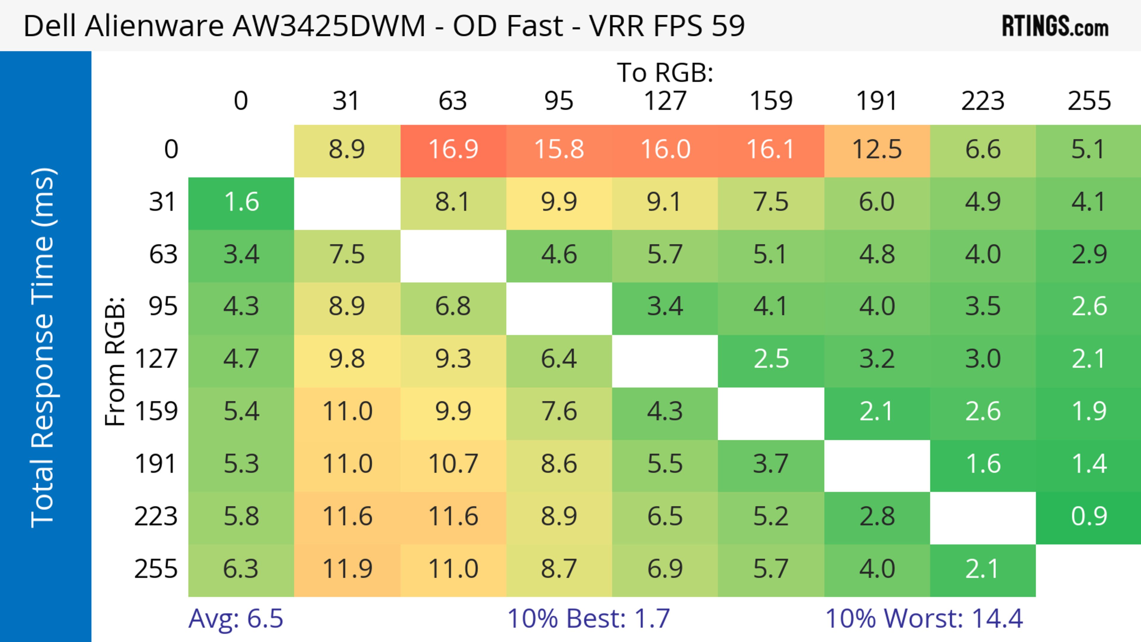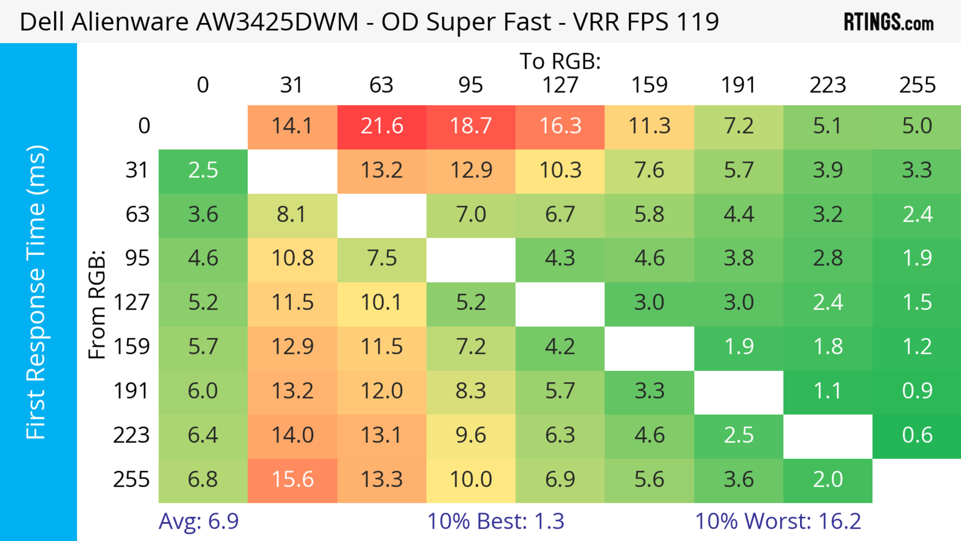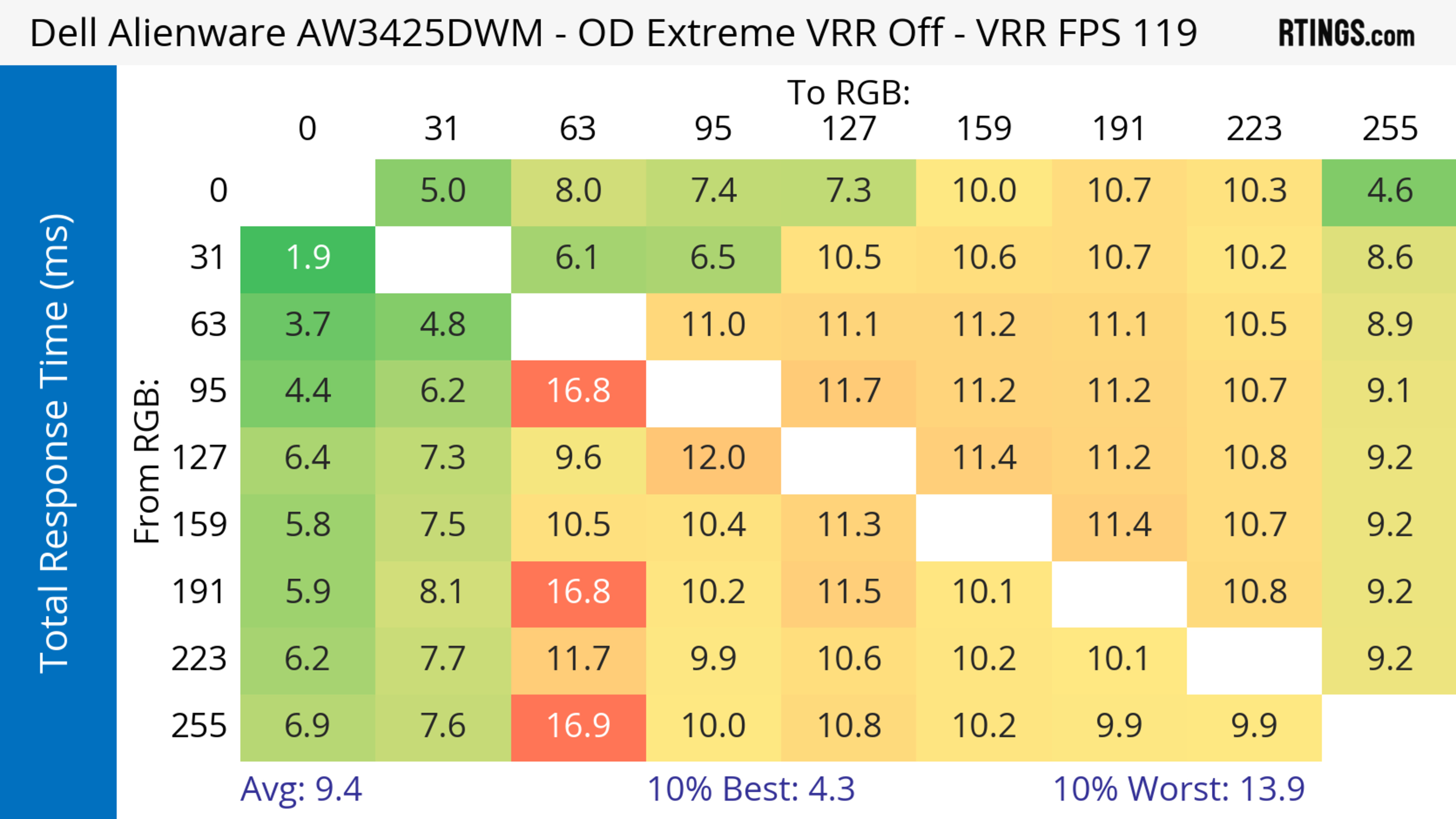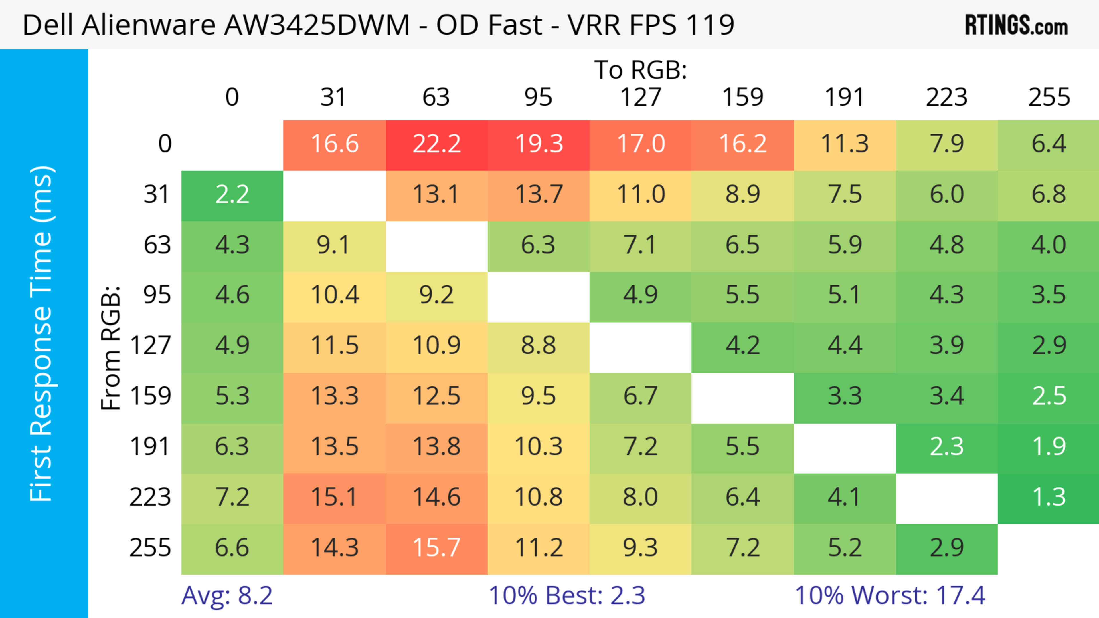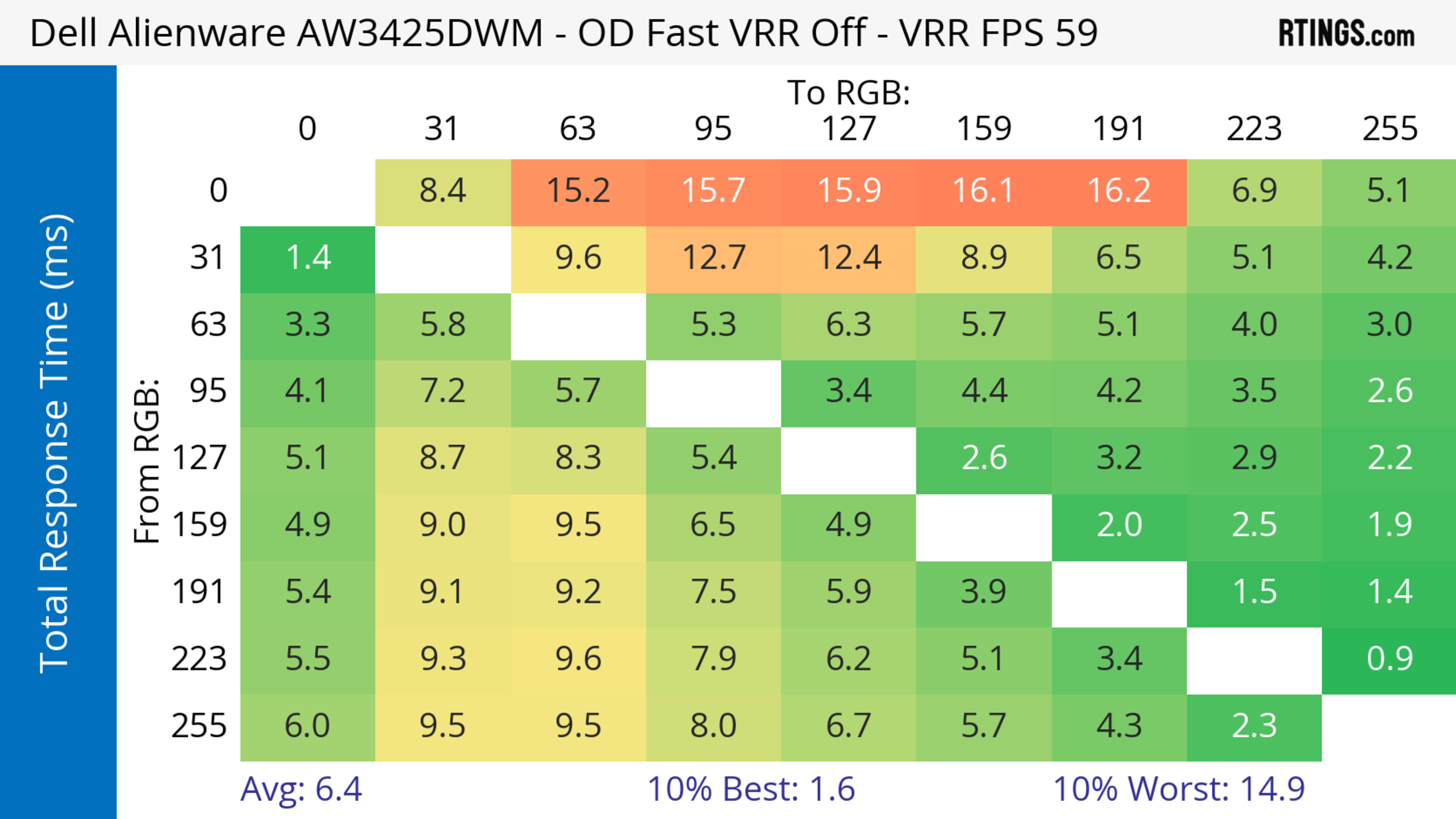 The Dell AW3425DWM has good motion handling across its VRR range. The 'Super Fast' Response Time setting is consistent as the refresh rate drops, but it has a slow response time with most transitions, particularly when going from dark to brighter colors, leading to black smearing behind fast-moving objects.