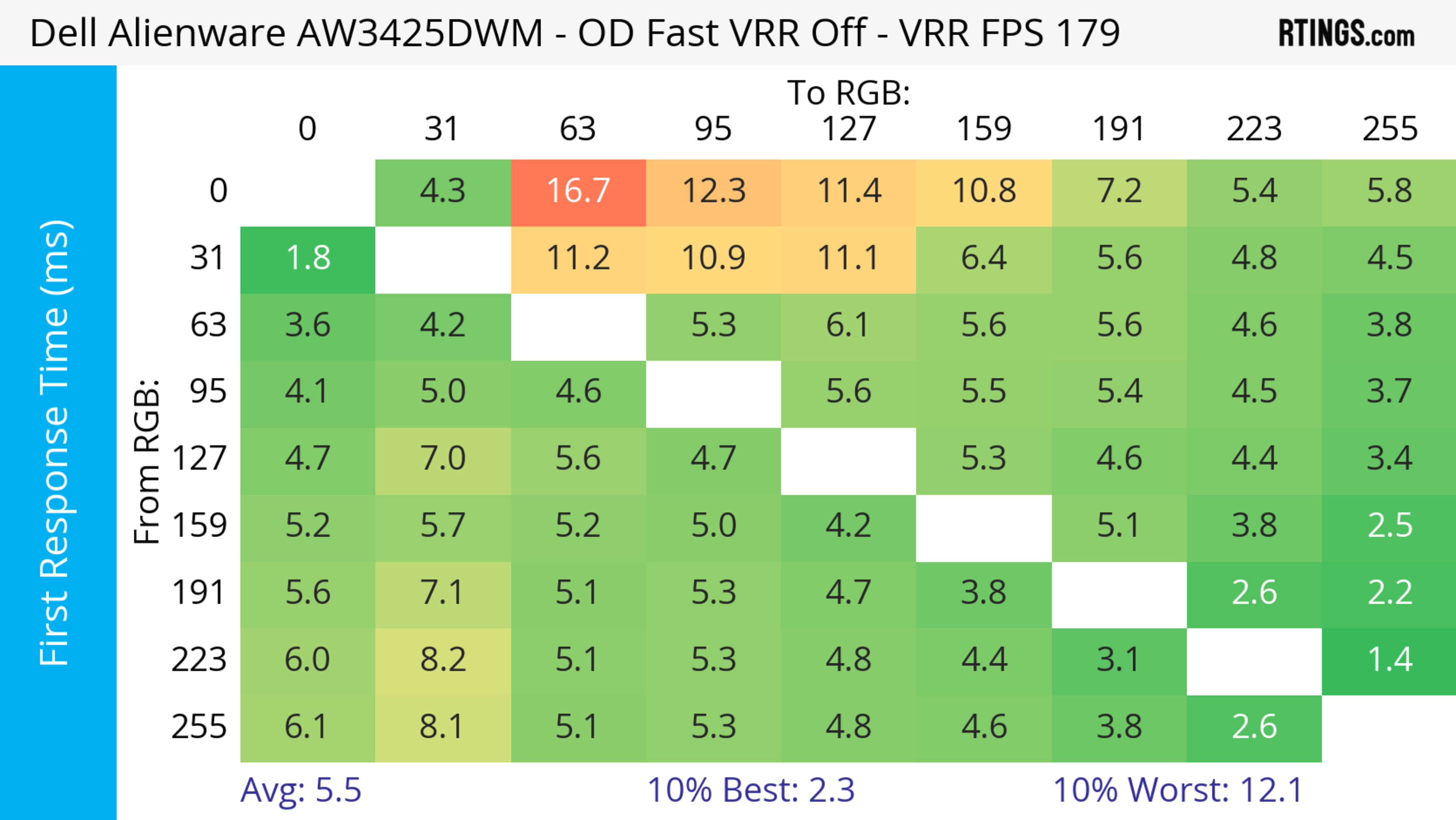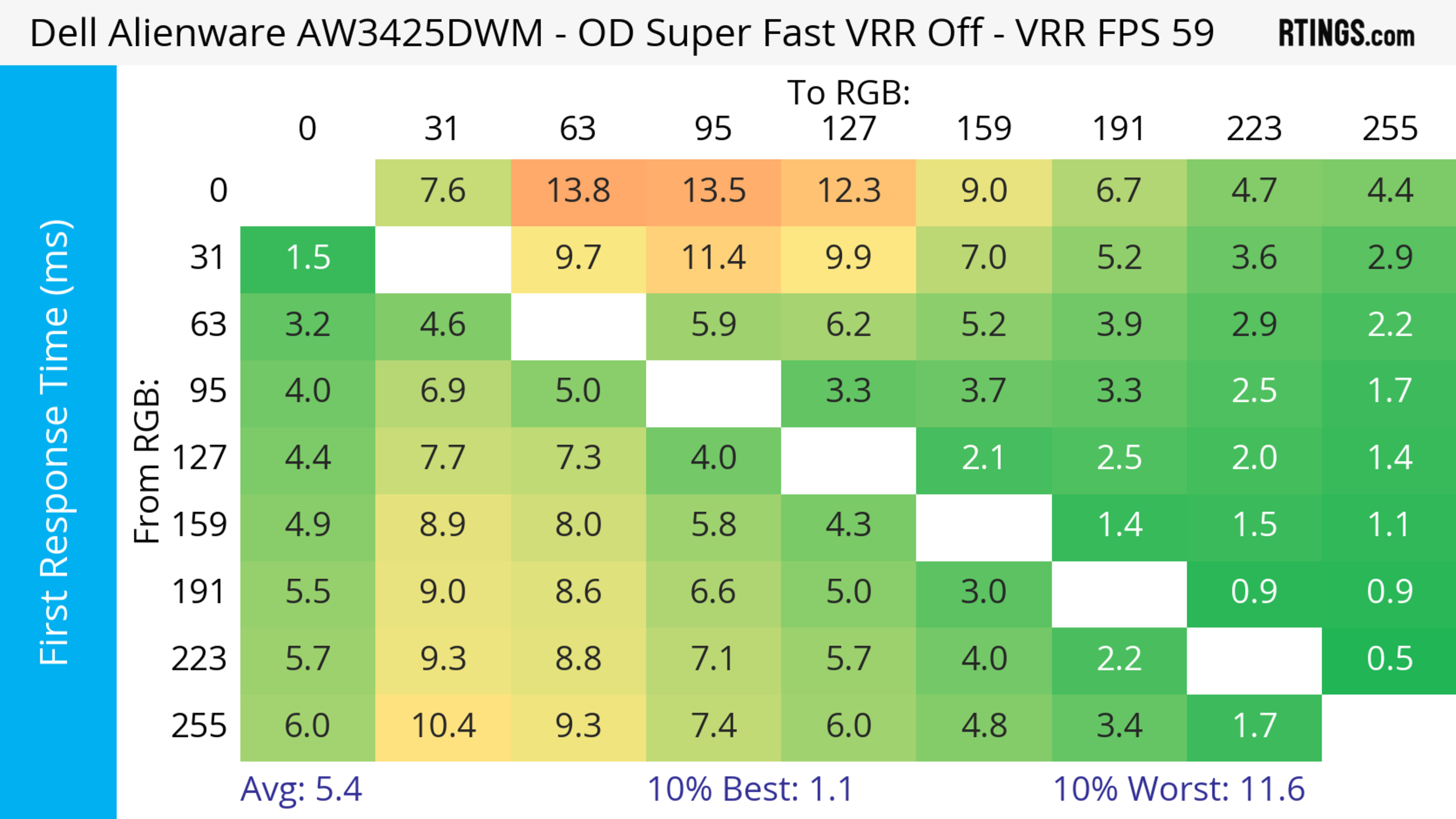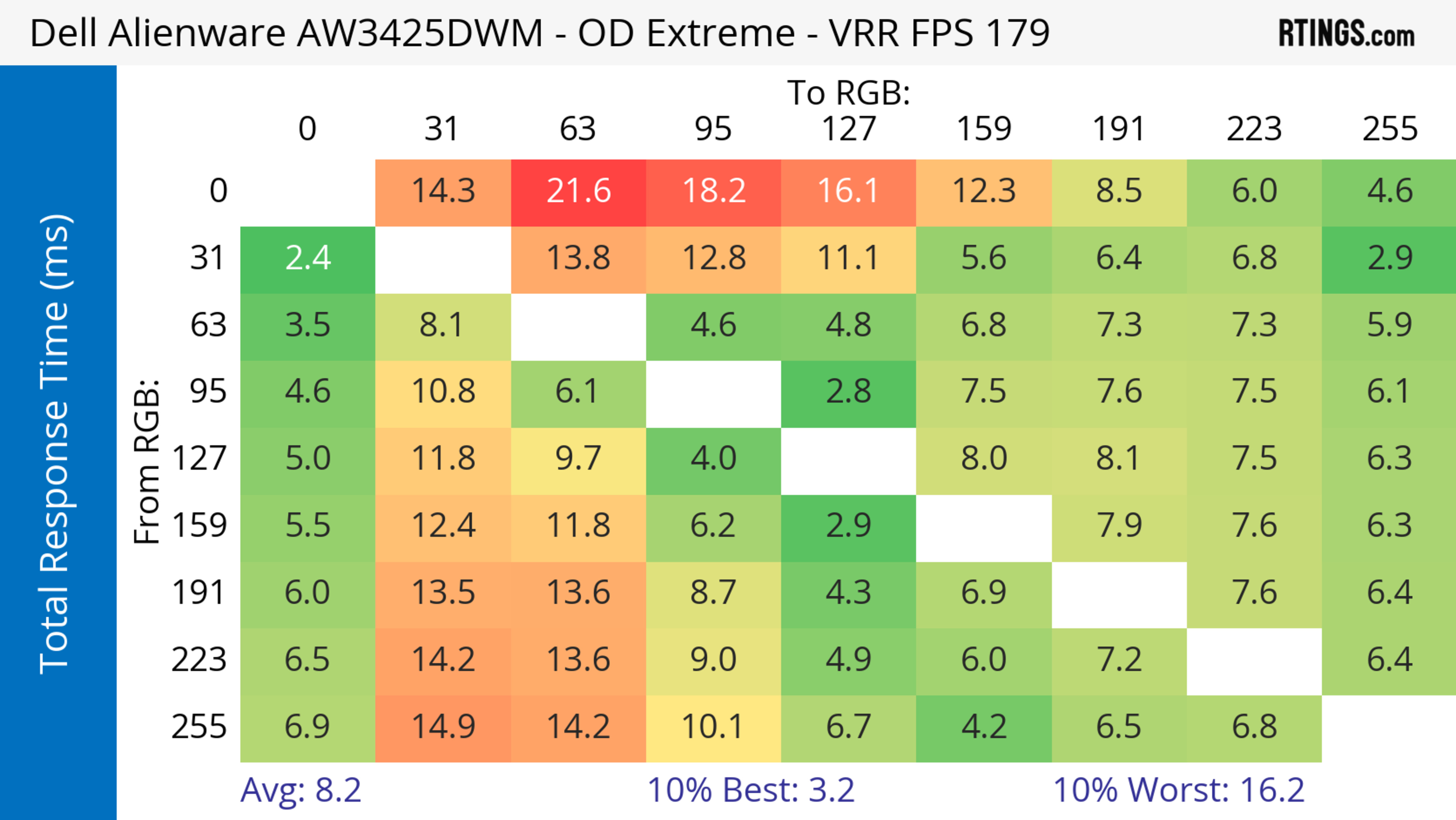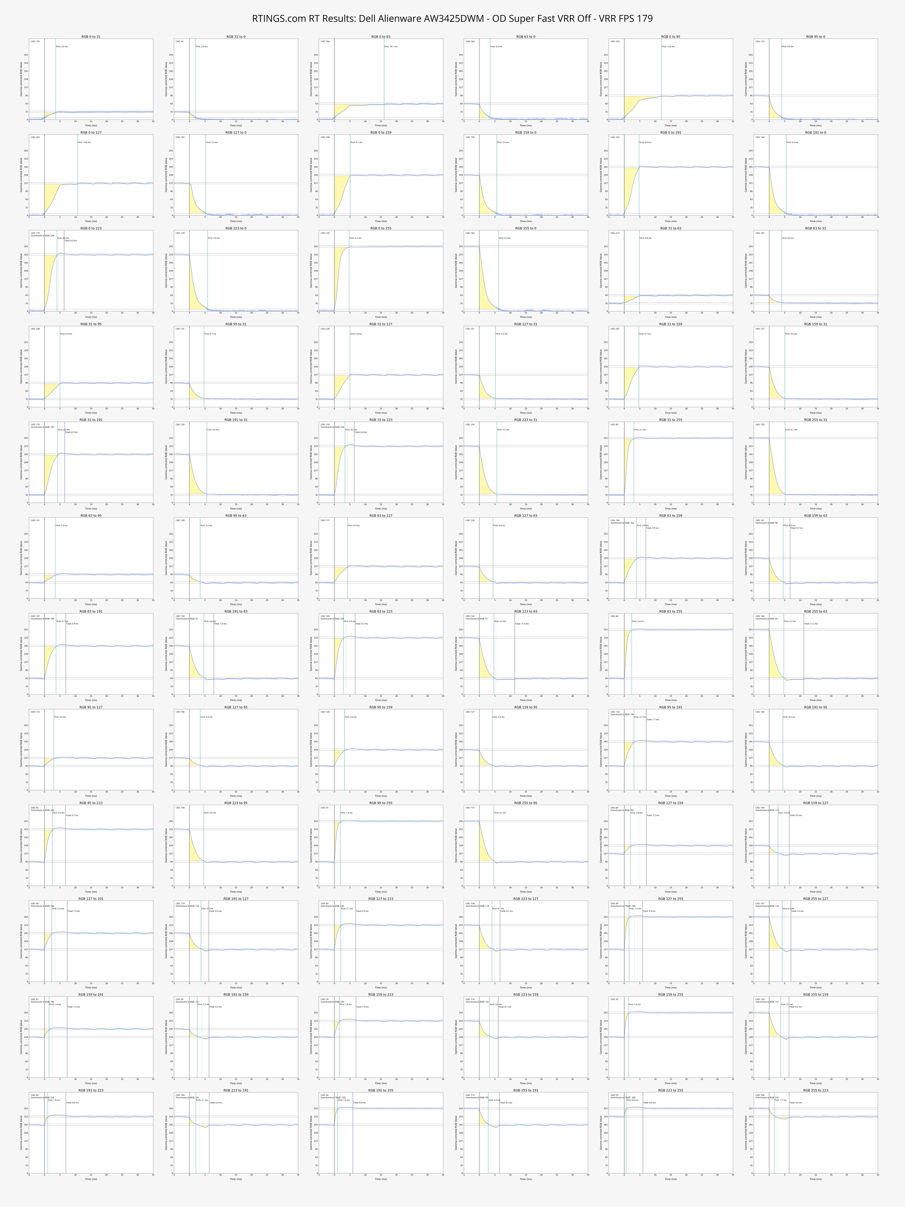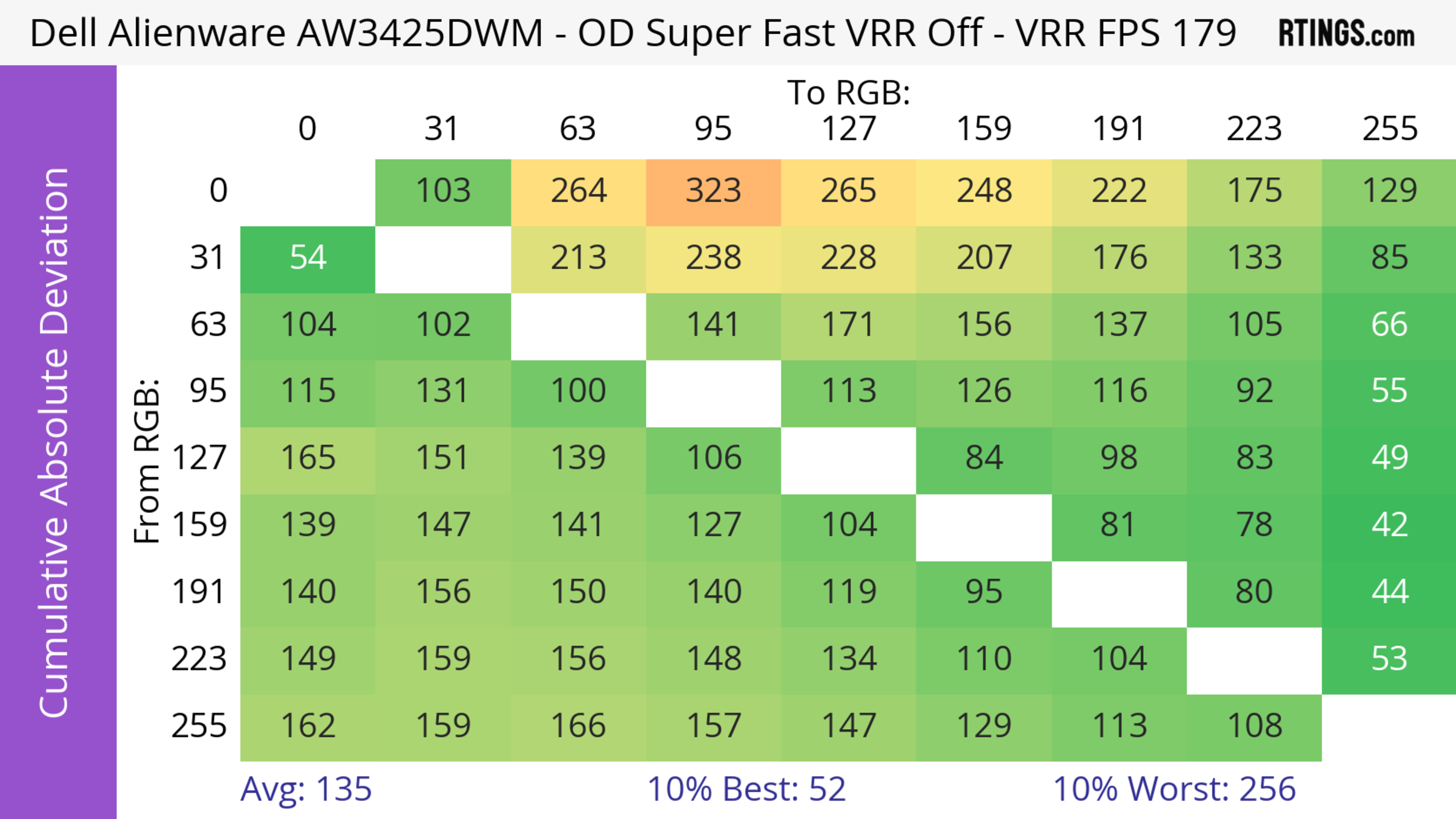 The Dell AW3425DWM has good motion handling across its VRR range. The 'Super Fast' Response Time setting is consistent as the refresh rate drops, but it has a slow response time with most transitions, particularly when going from dark to brighter colors, leading to black smearing behind fast-moving objects.