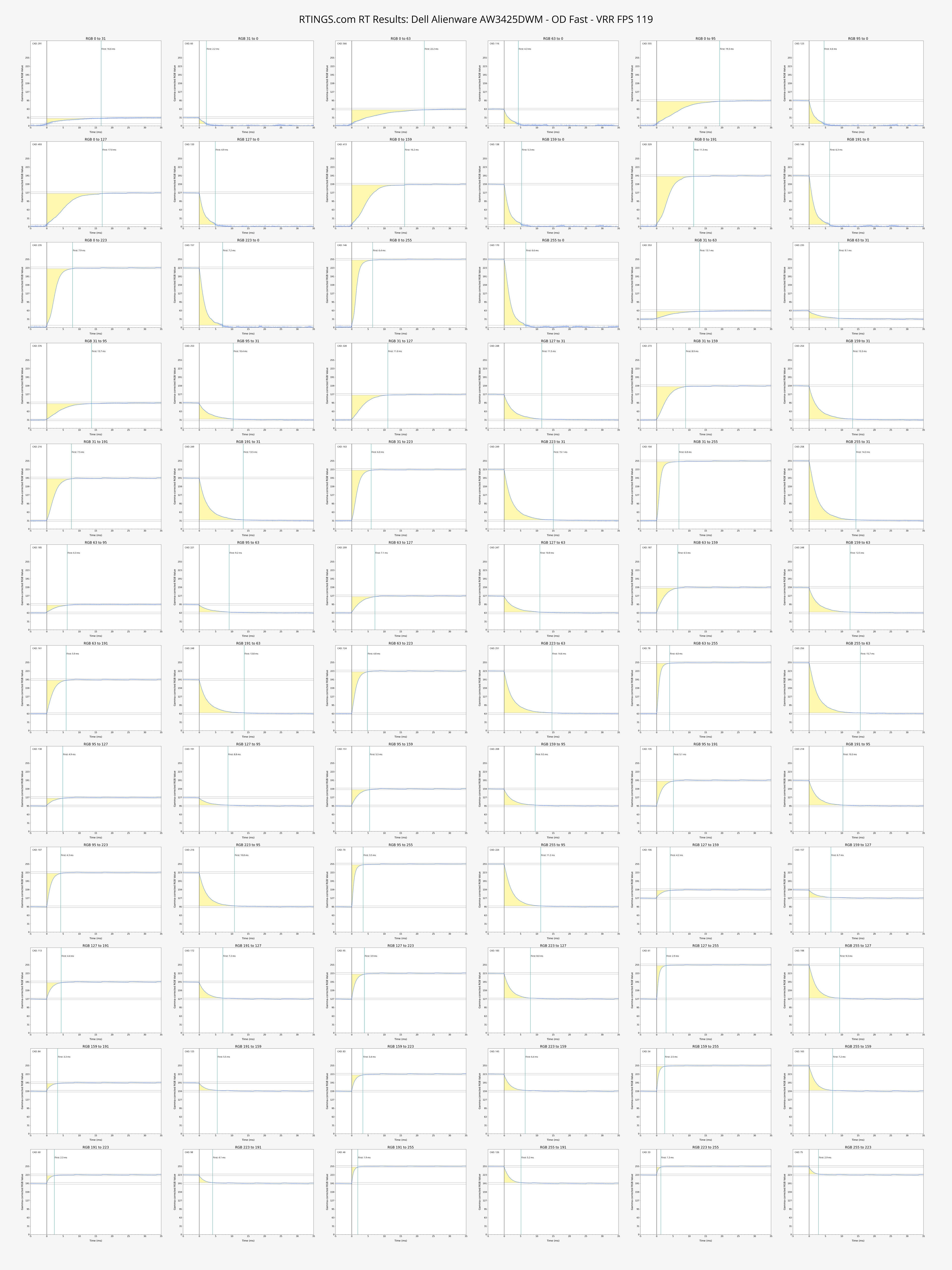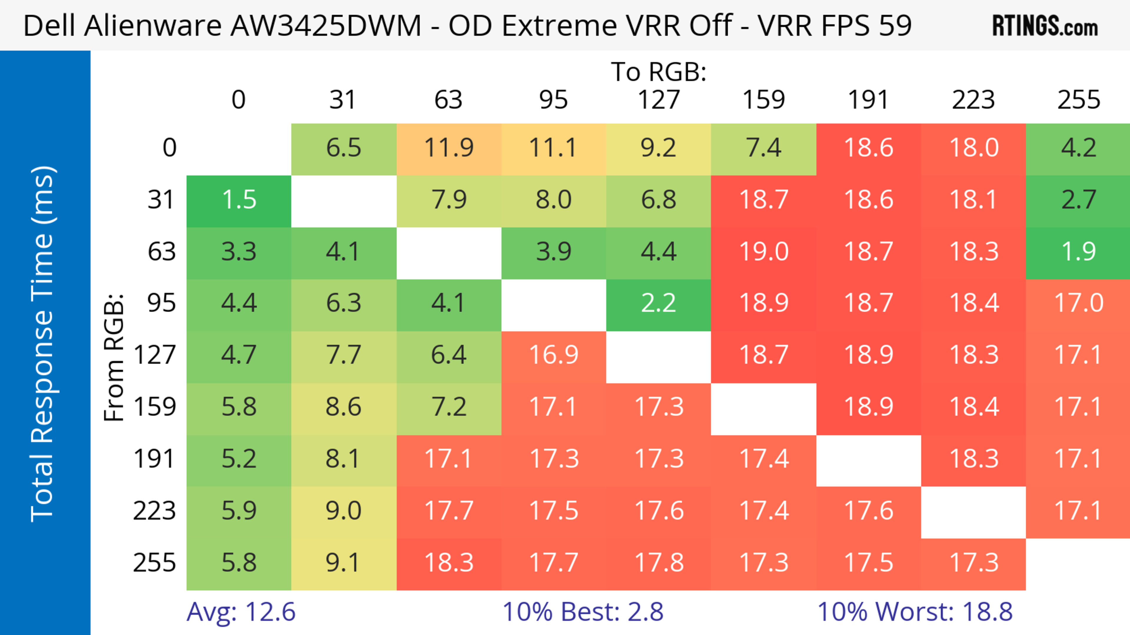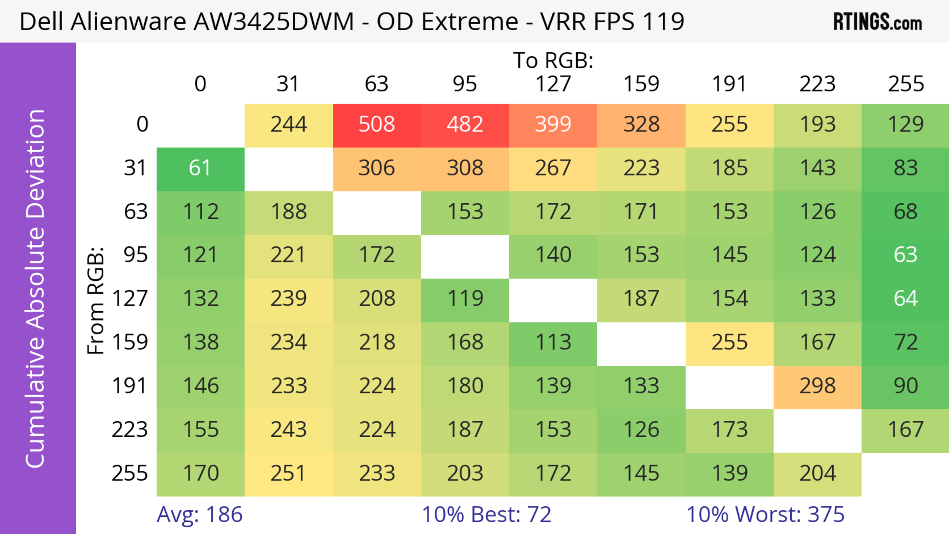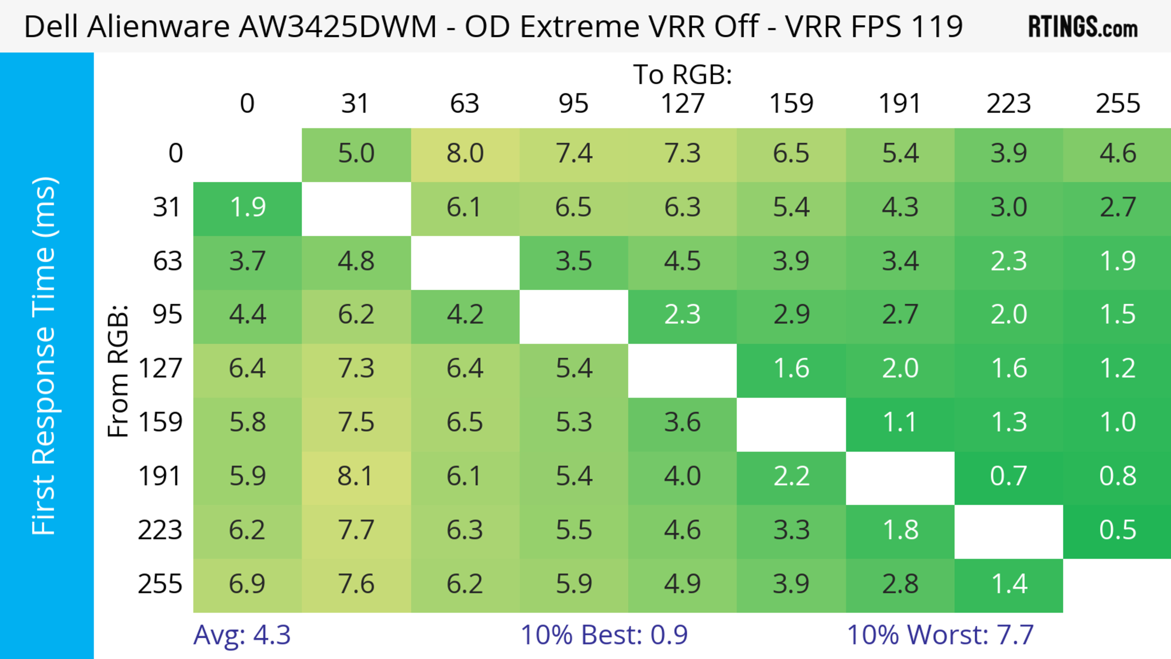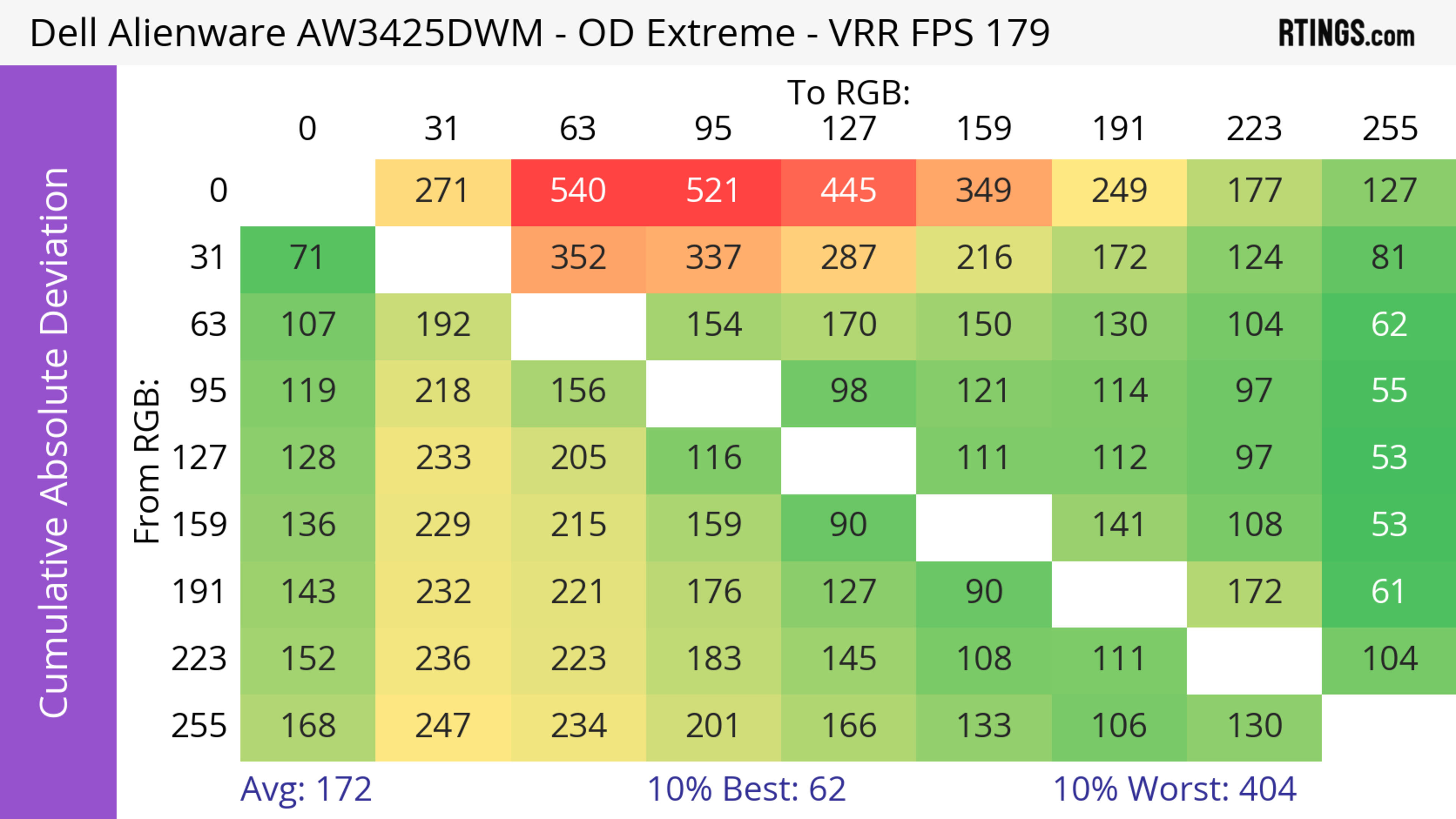 The Dell AW3425DWM has good motion handling across its VRR range. The 'Super Fast' Response Time setting is consistent as the refresh rate drops, but it has a slow response time with most transitions, particularly when going from dark to brighter colors, leading to black smearing behind fast-moving objects.