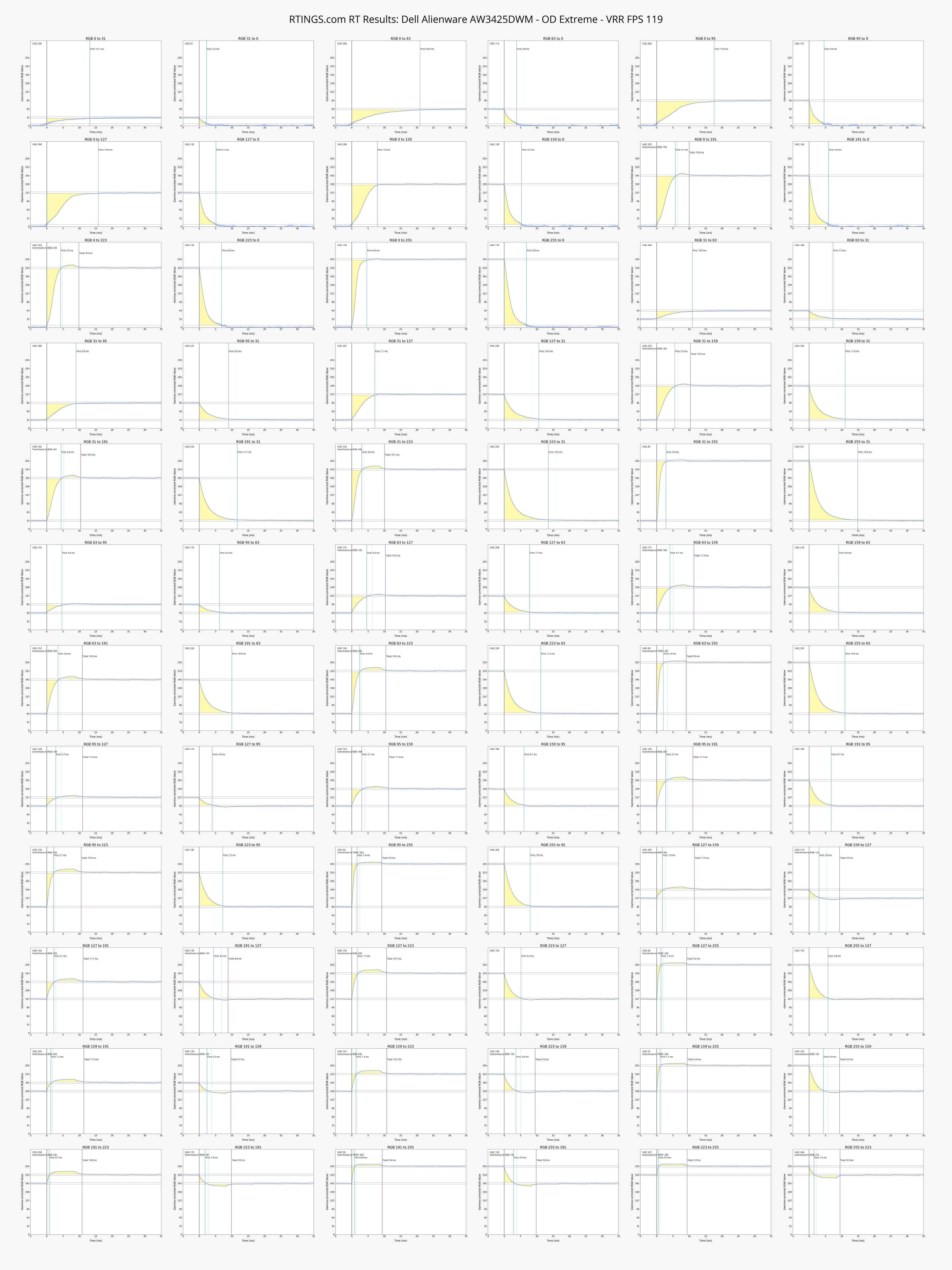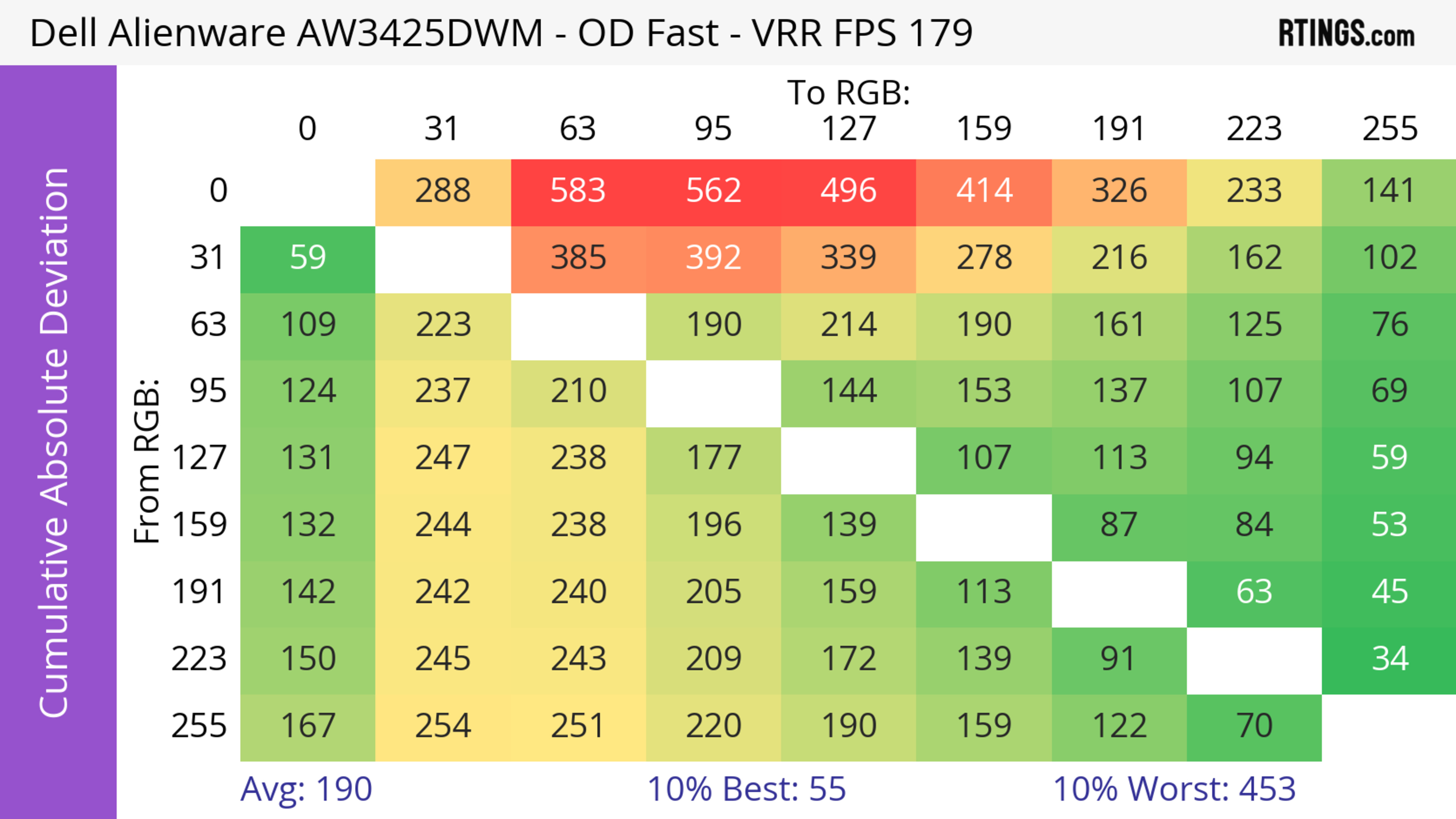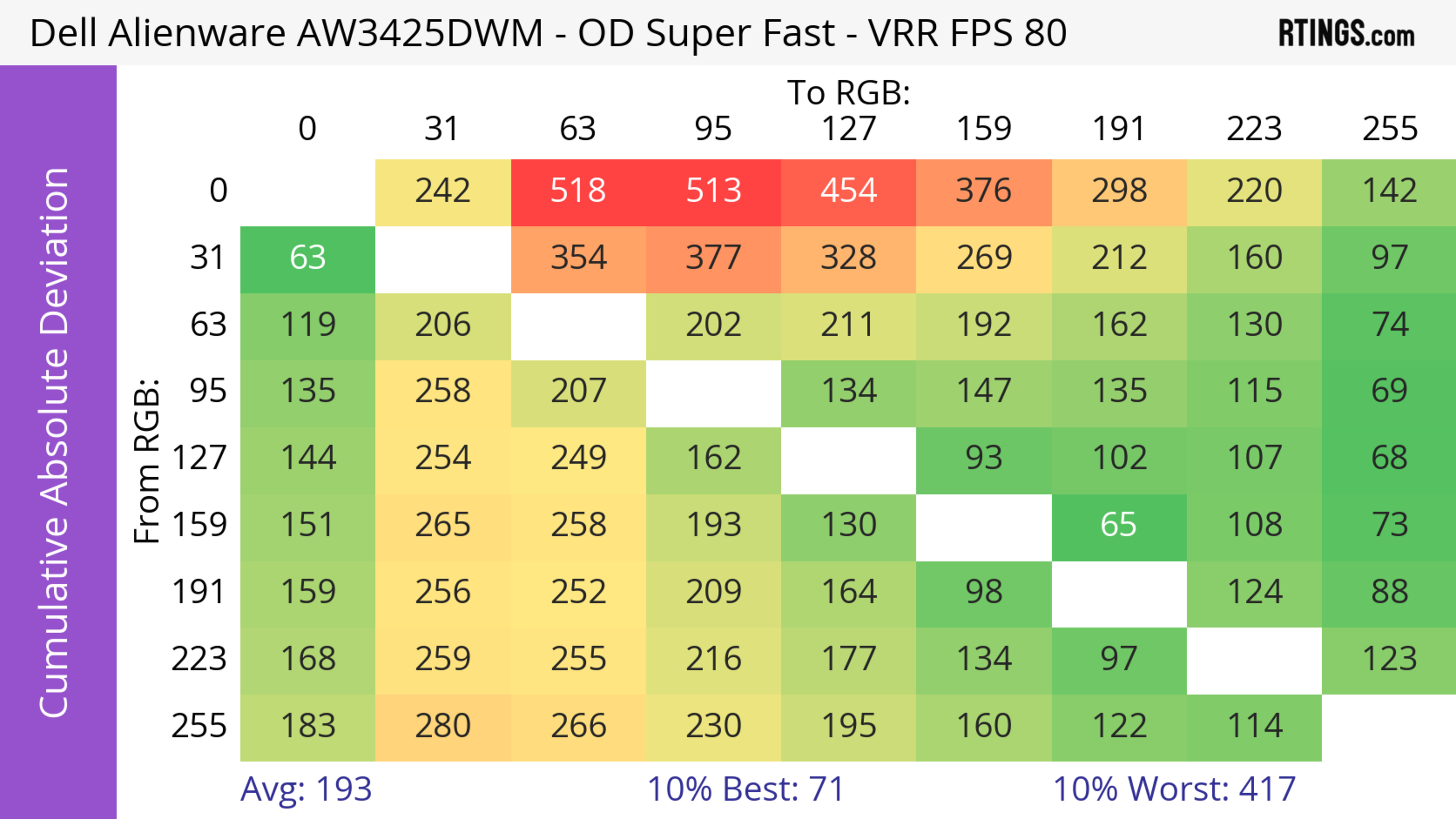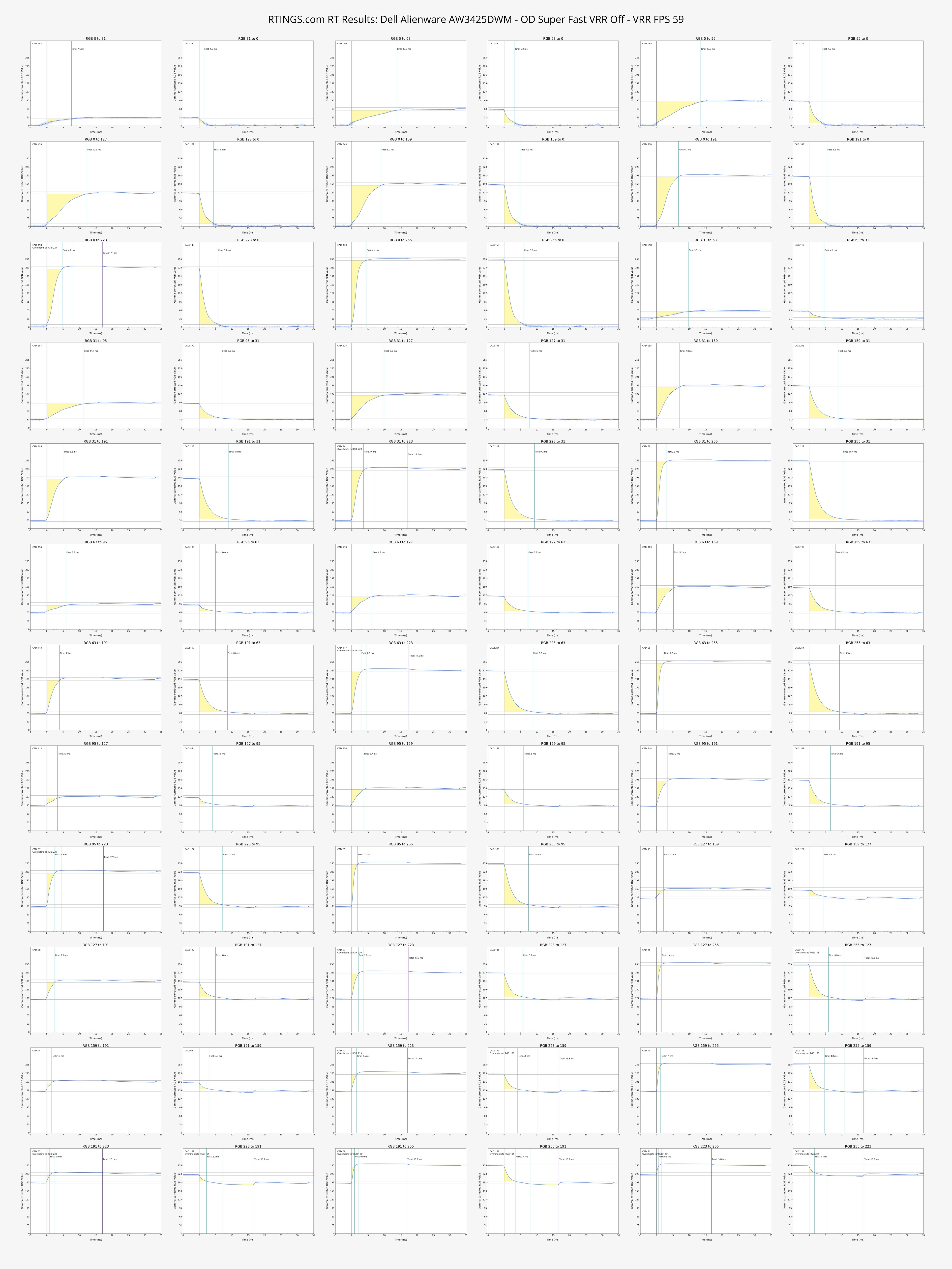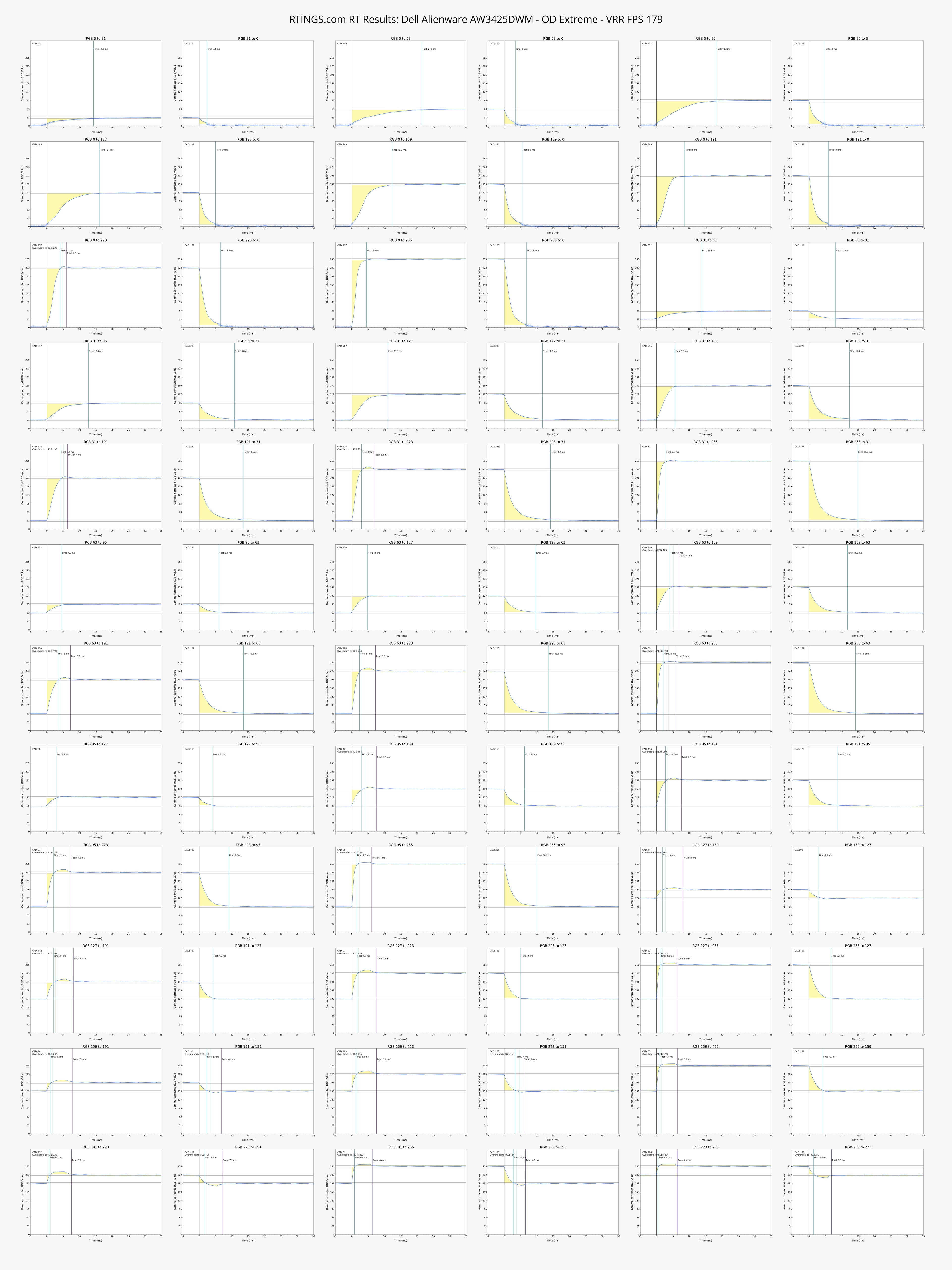 The Dell AW3425DWM has good motion handling across its VRR range. The 'Super Fast' Response Time setting is consistent as the refresh rate drops, but it has a slow response time with most transitions, particularly when going from dark to brighter colors, leading to black smearing behind fast-moving objects.