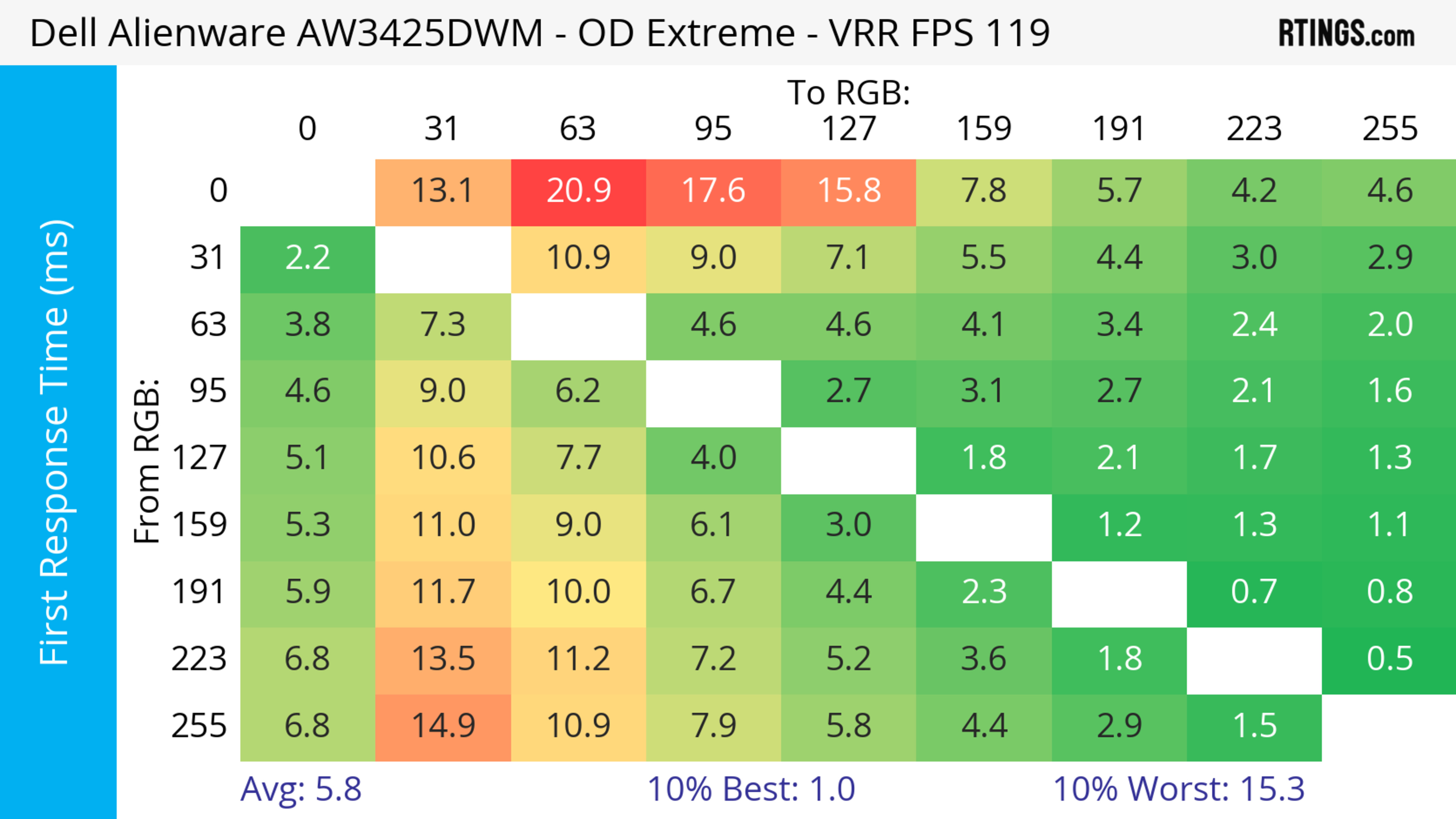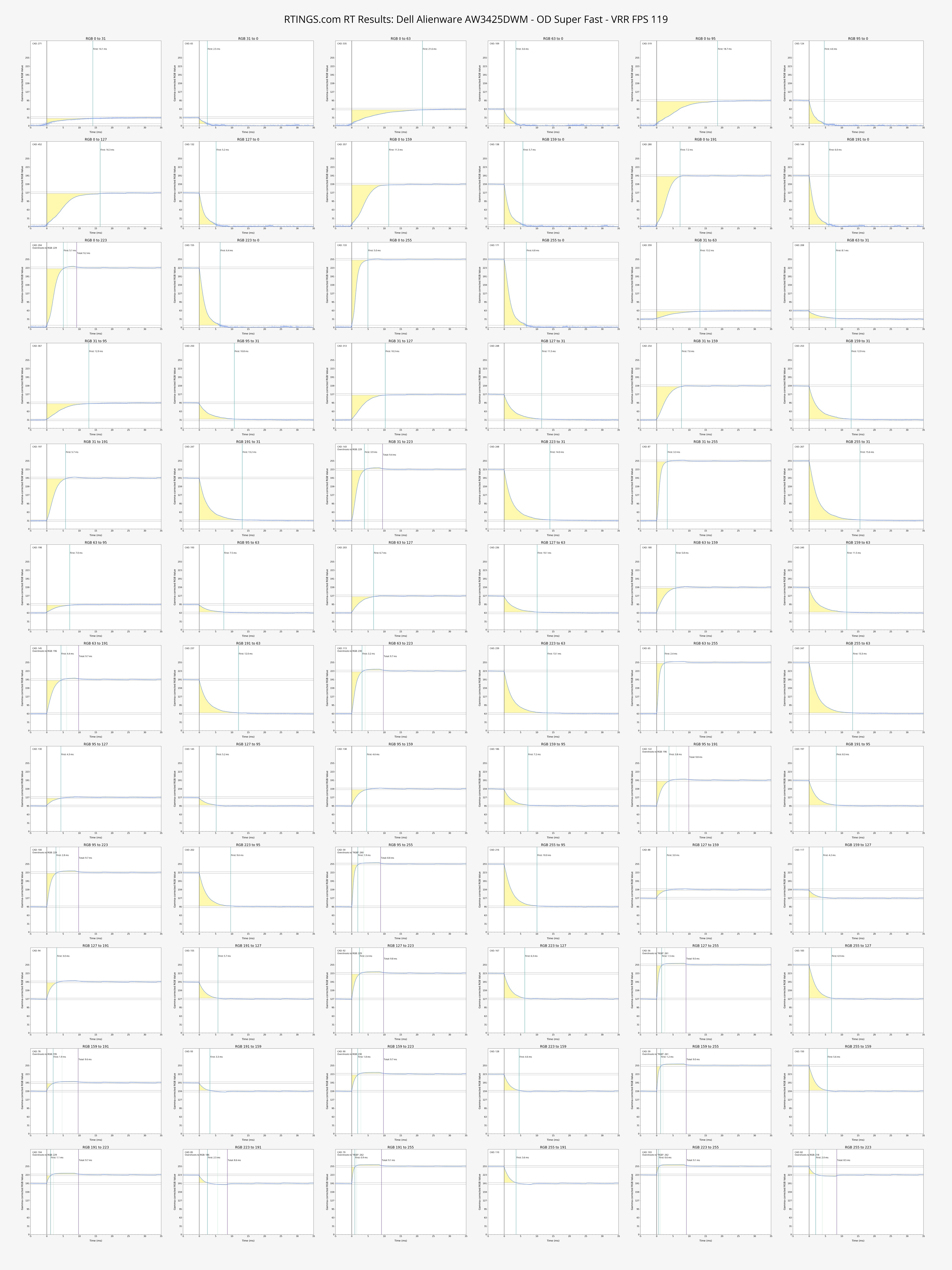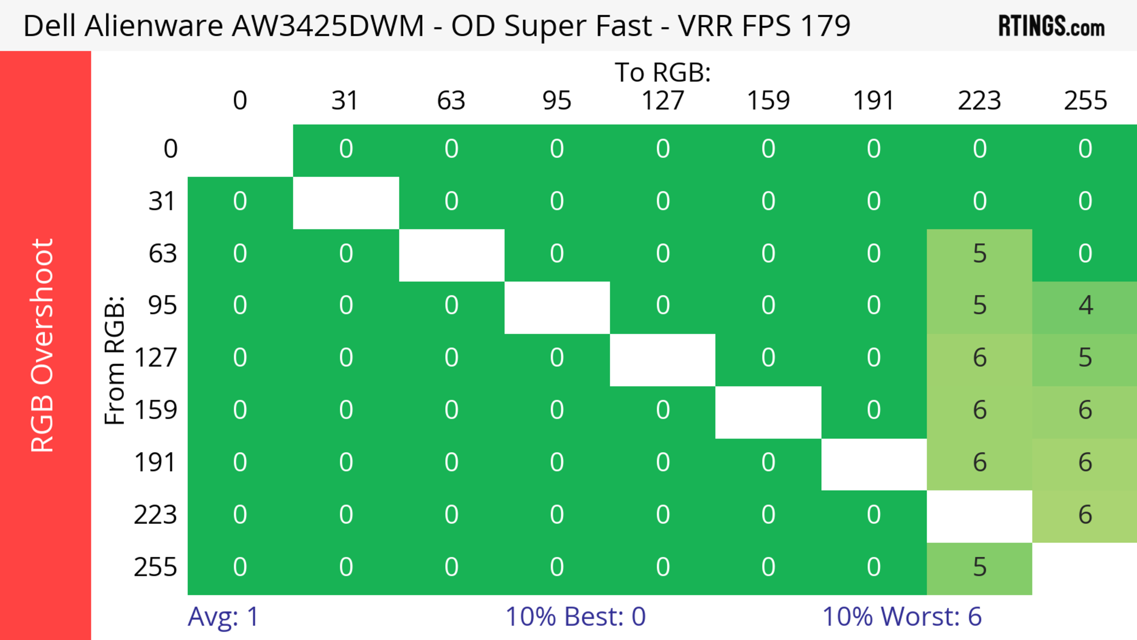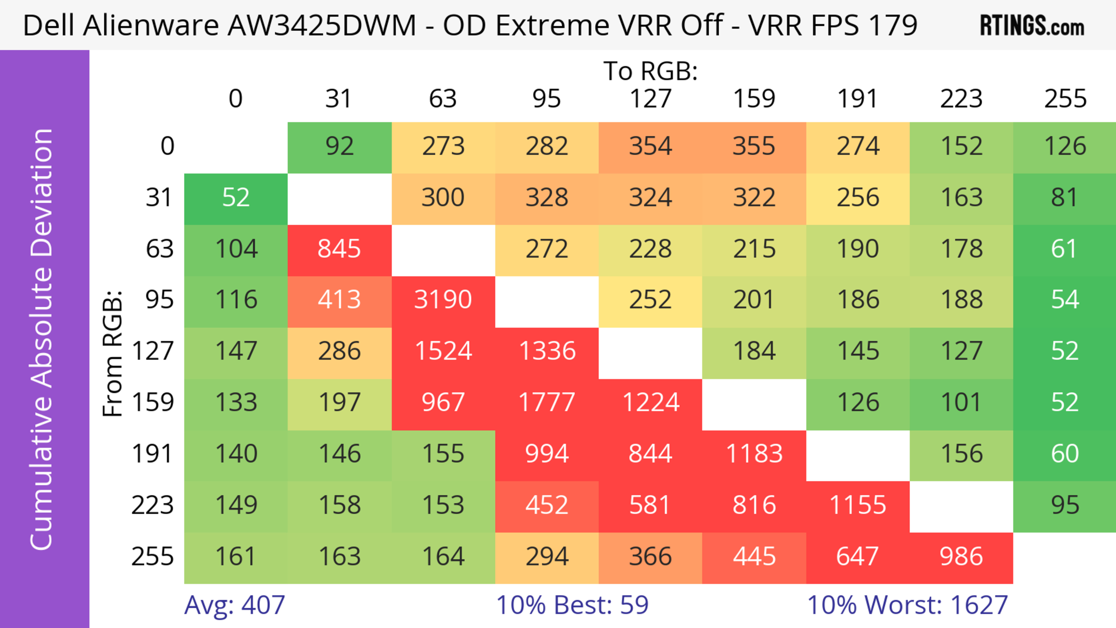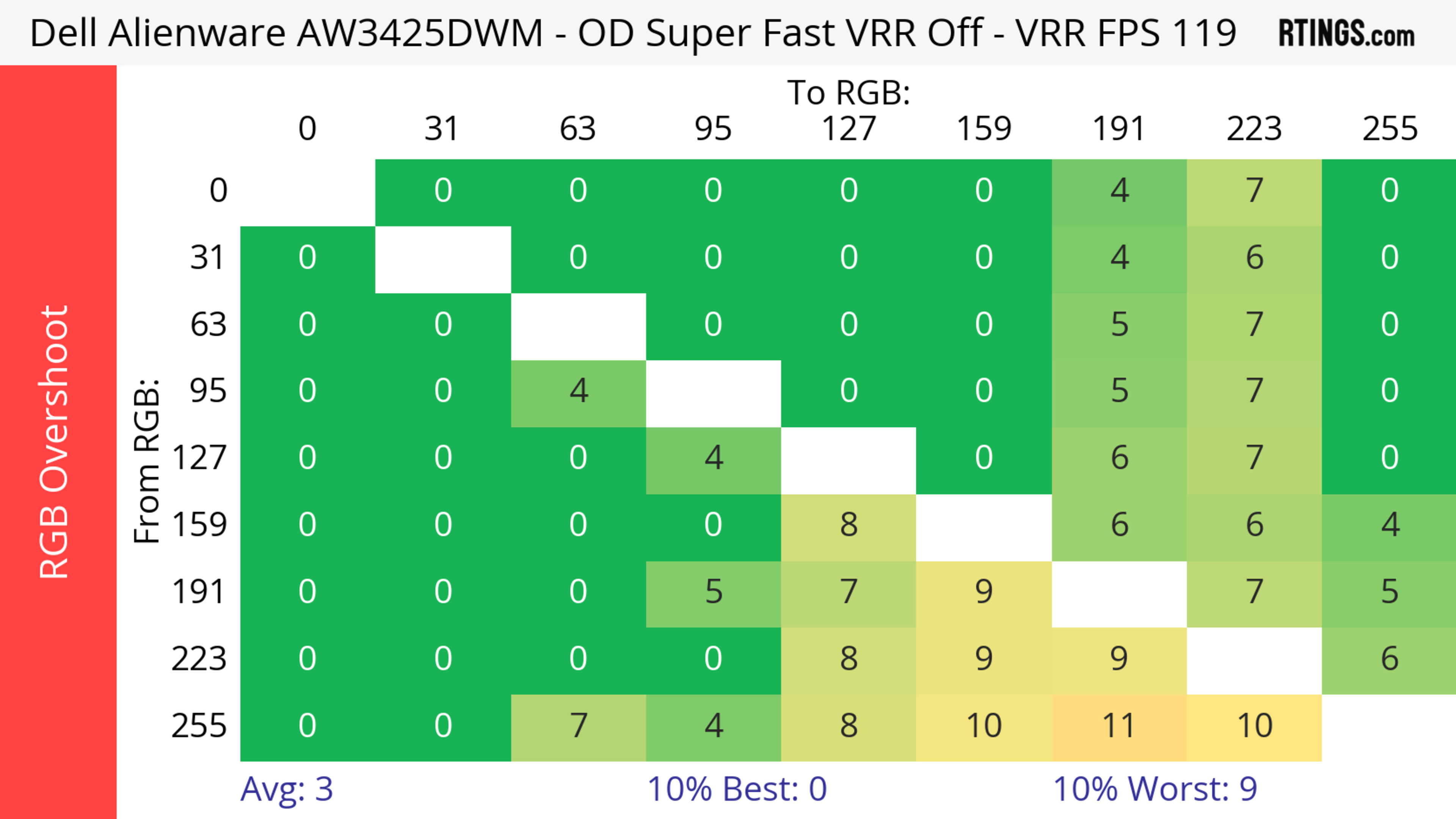 The Dell AW3425DWM has good motion handling across its VRR range. The 'Super Fast' Response Time setting is consistent as the refresh rate drops, but it has a slow response time with most transitions, particularly when going from dark to brighter colors, leading to black smearing behind fast-moving objects.