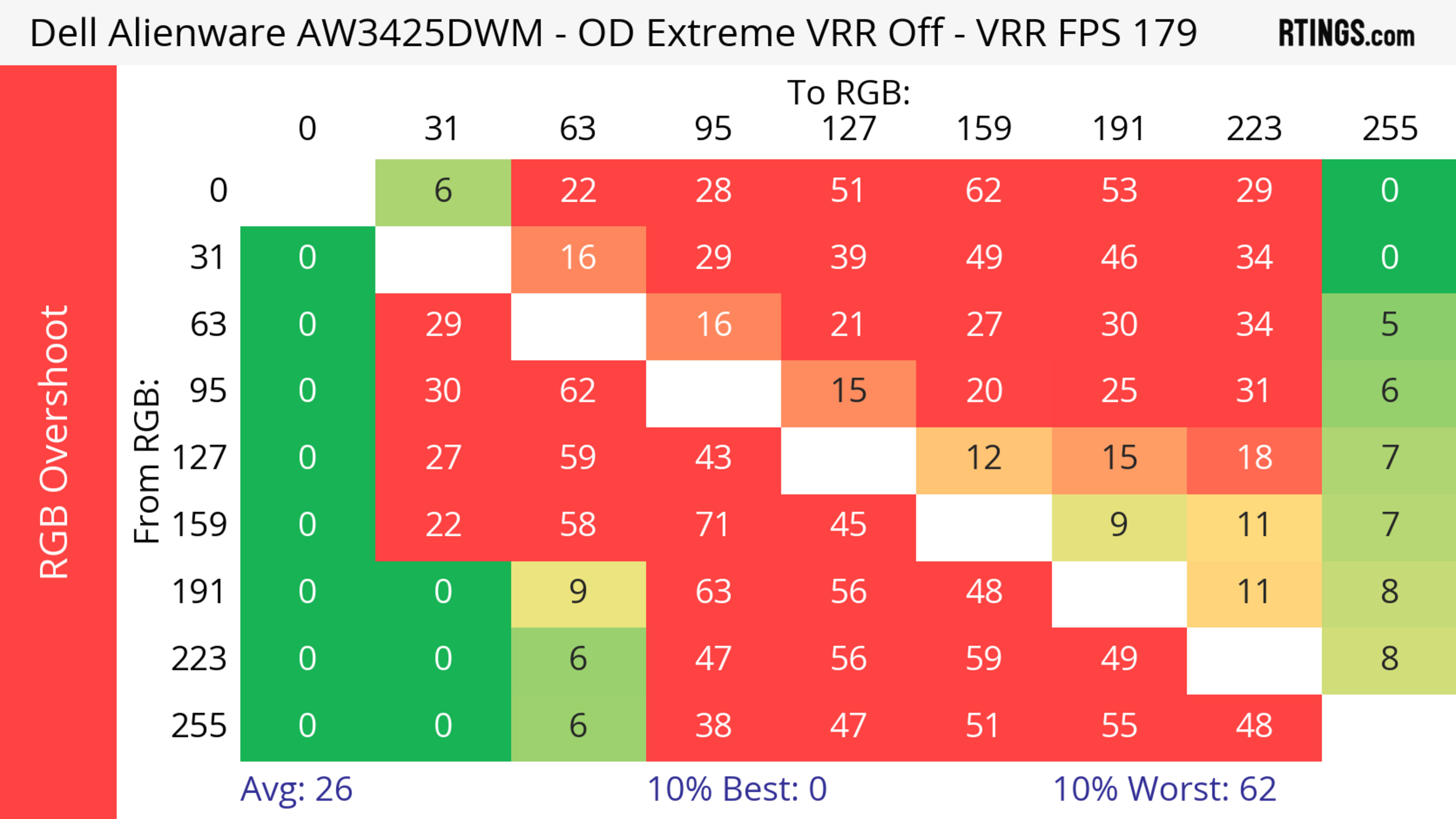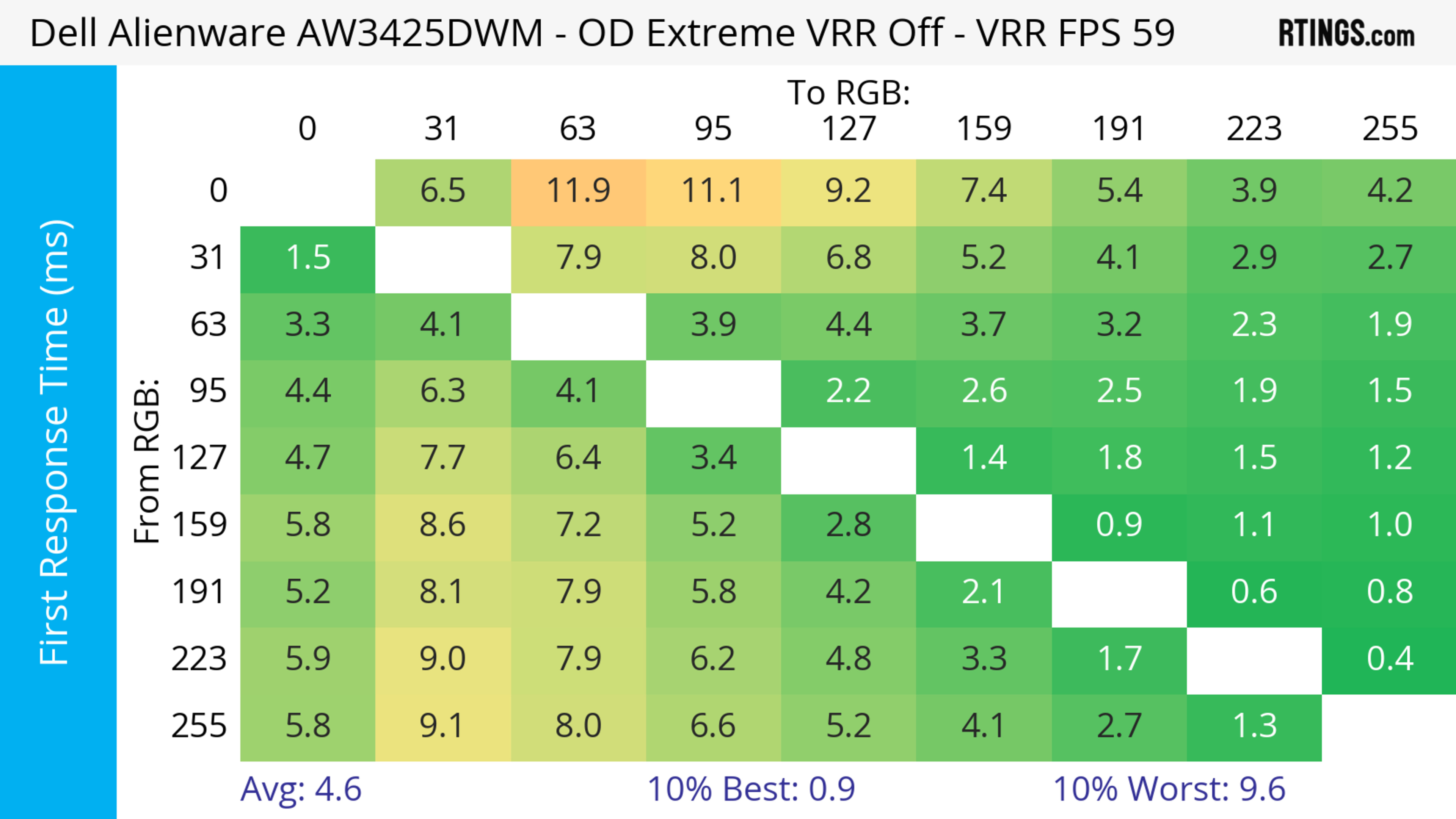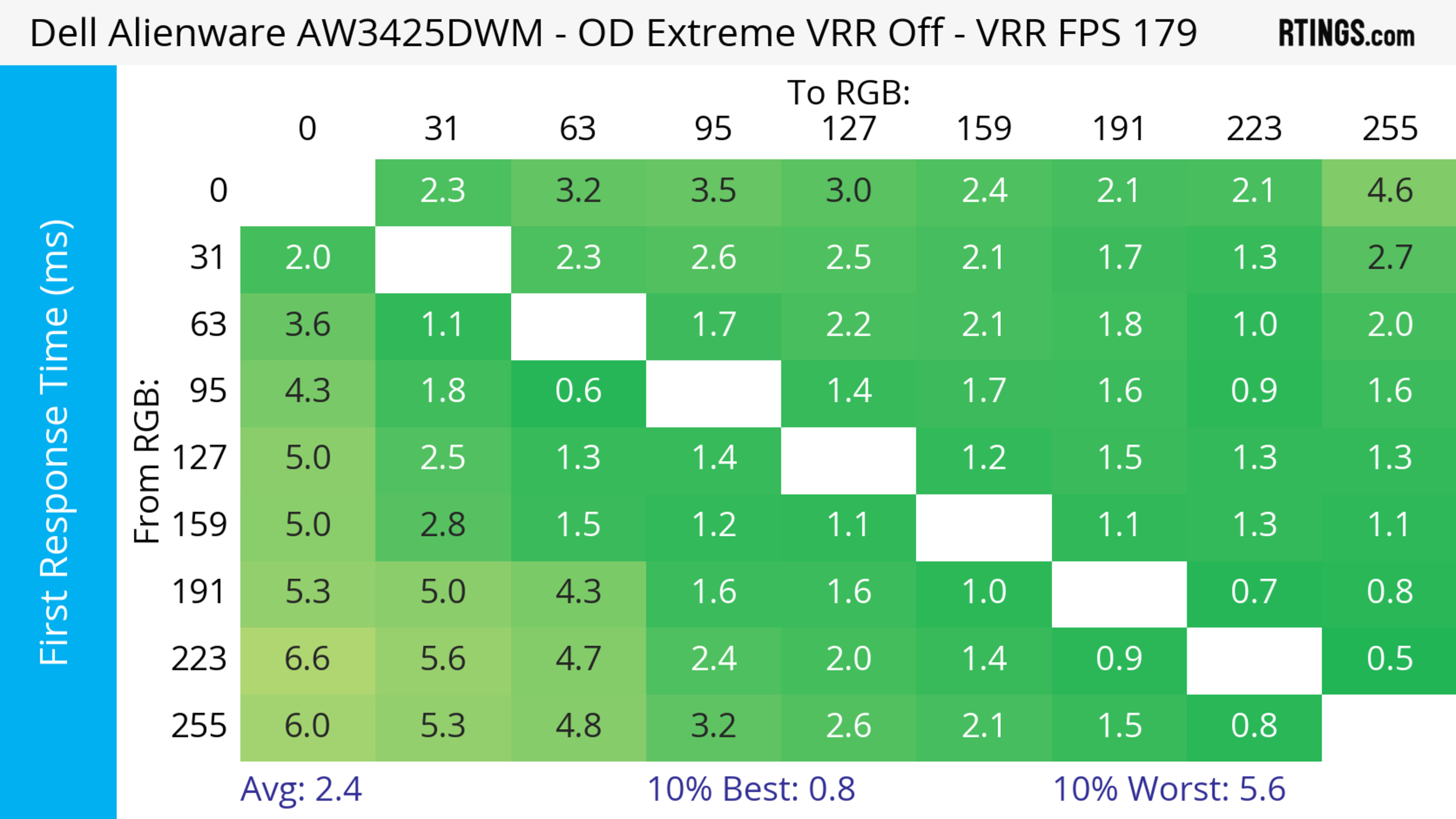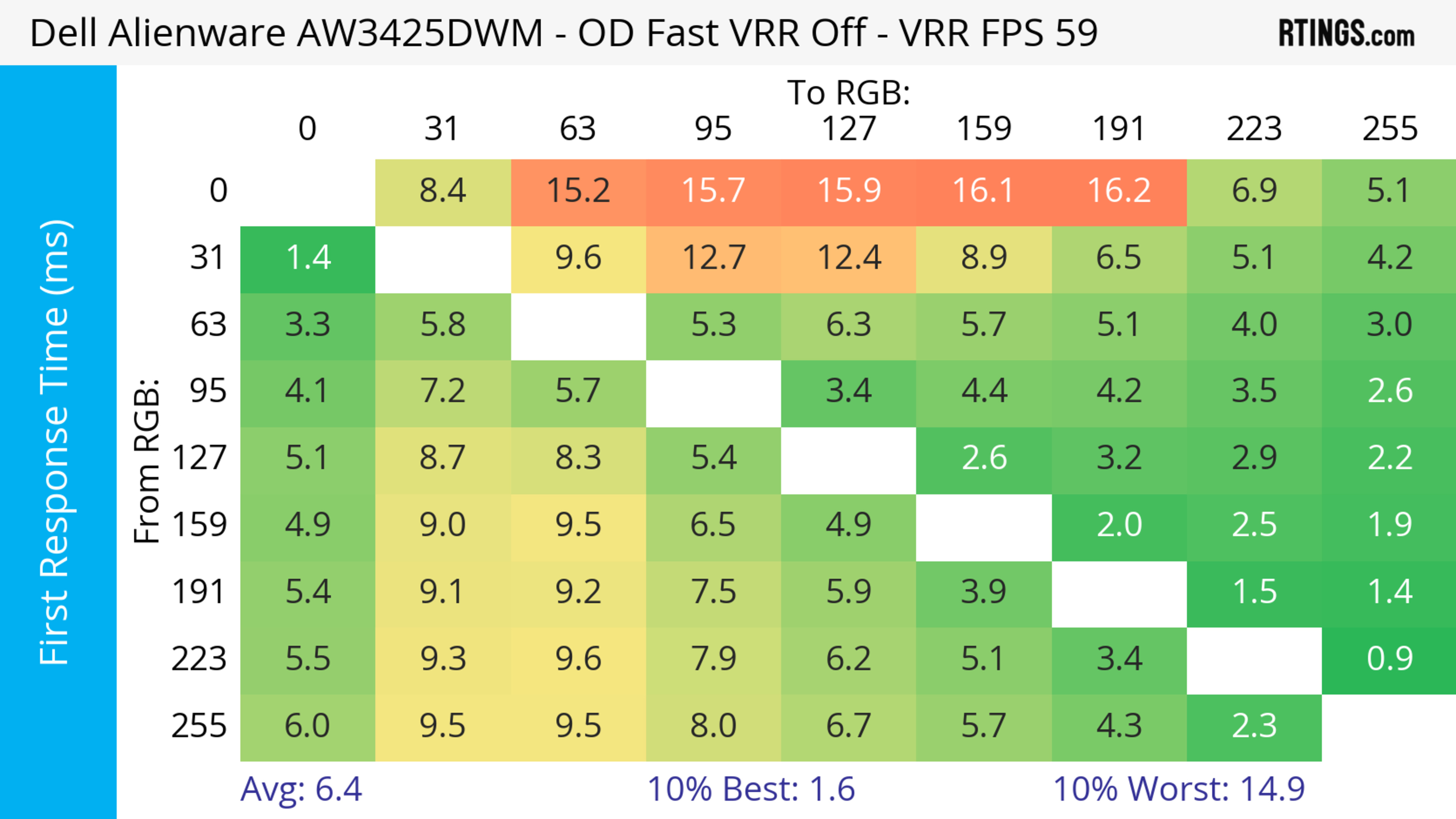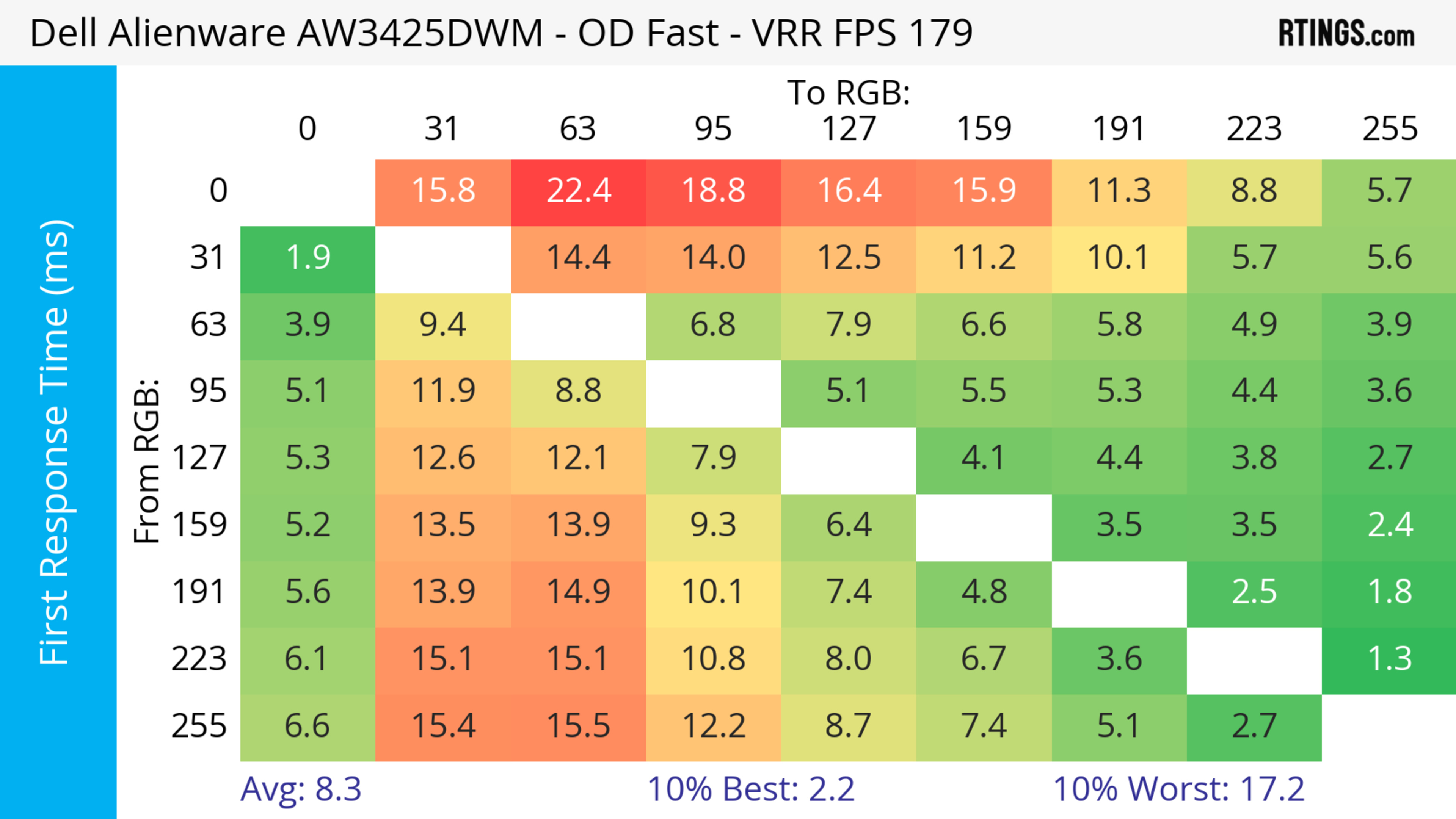 The Dell AW3425DWM has good motion handling across its VRR range. The 'Super Fast' Response Time setting is consistent as the refresh rate drops, but it has a slow response time with most transitions, particularly when going from dark to brighter colors, leading to black smearing behind fast-moving objects.