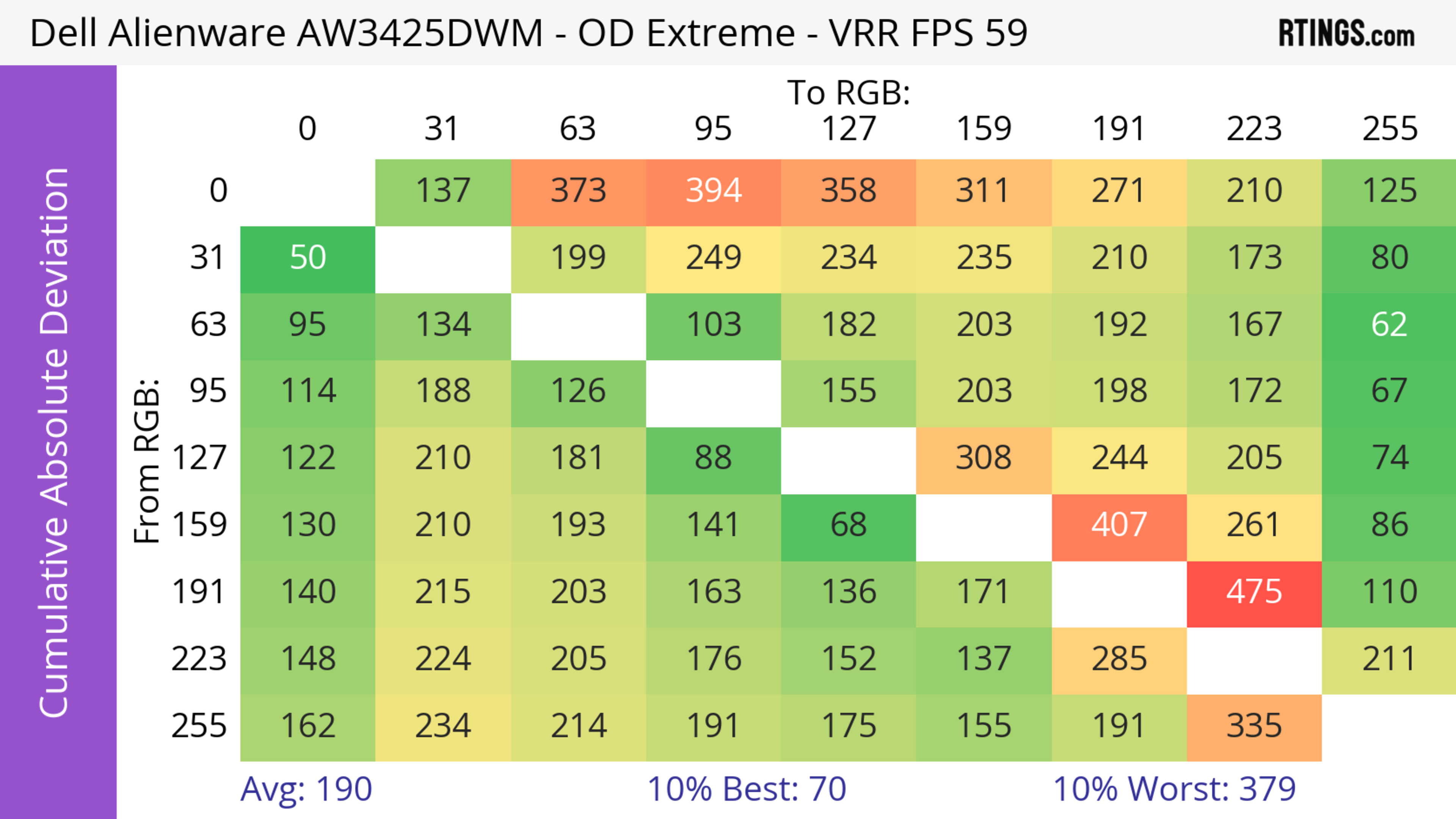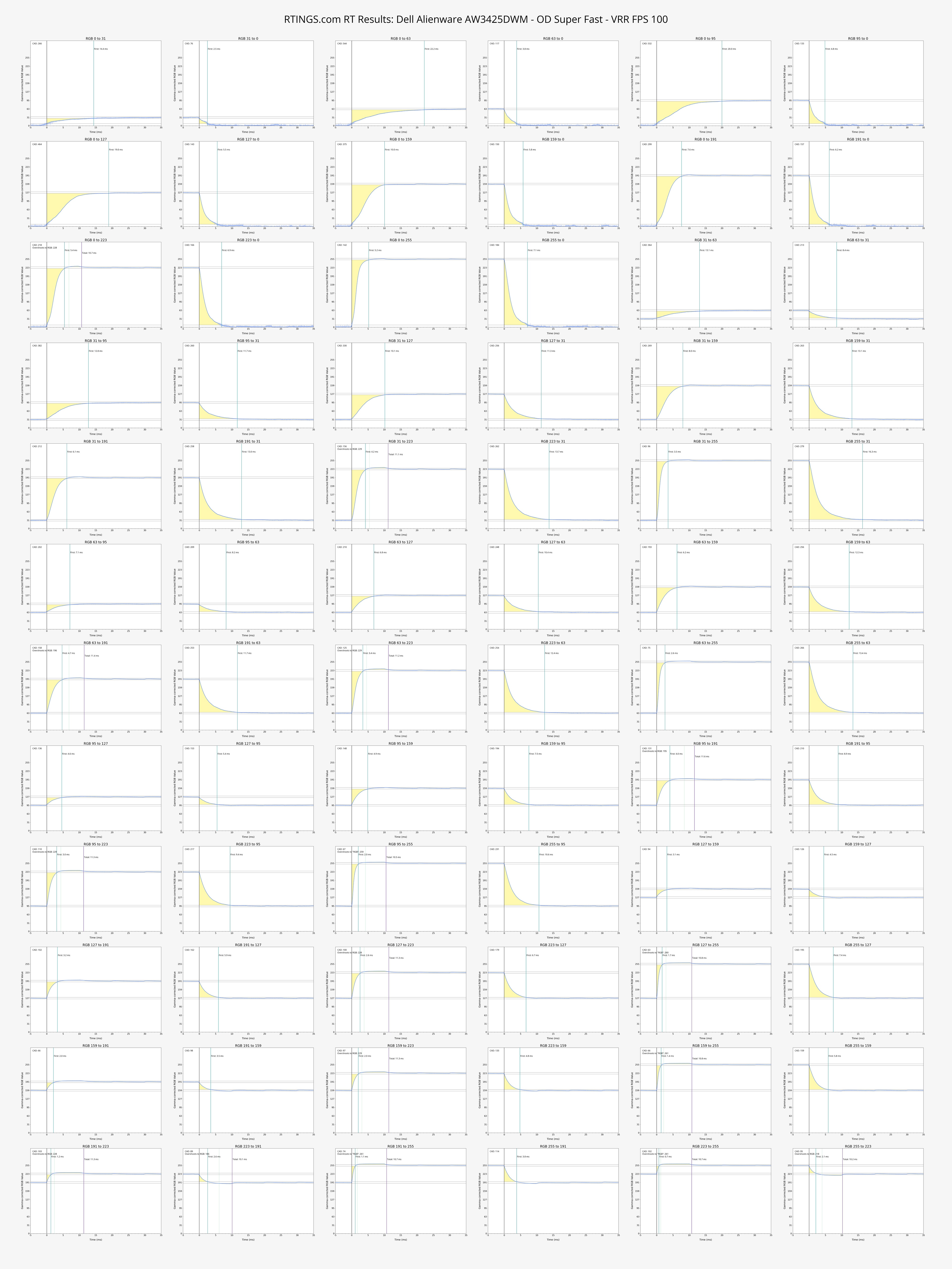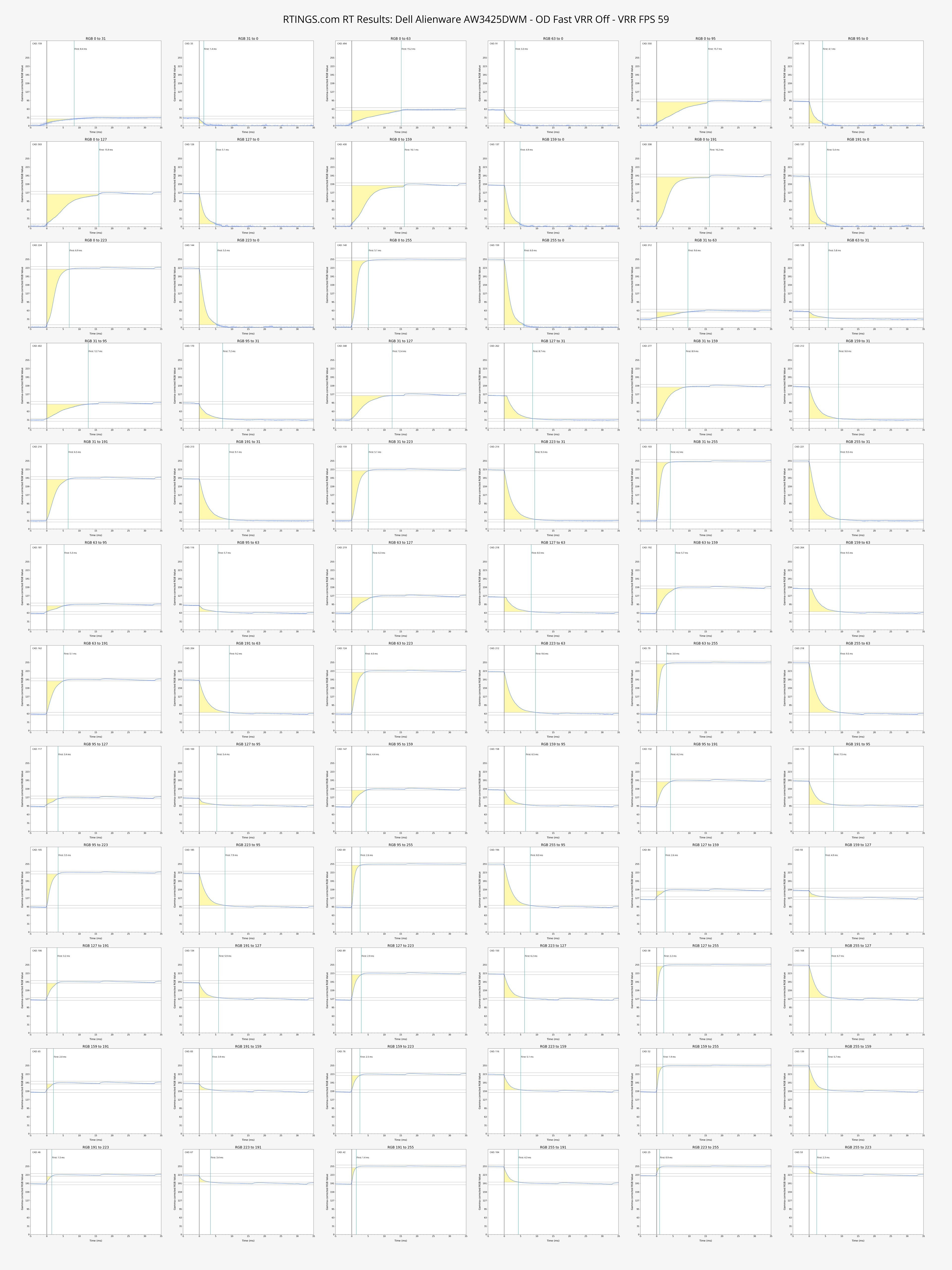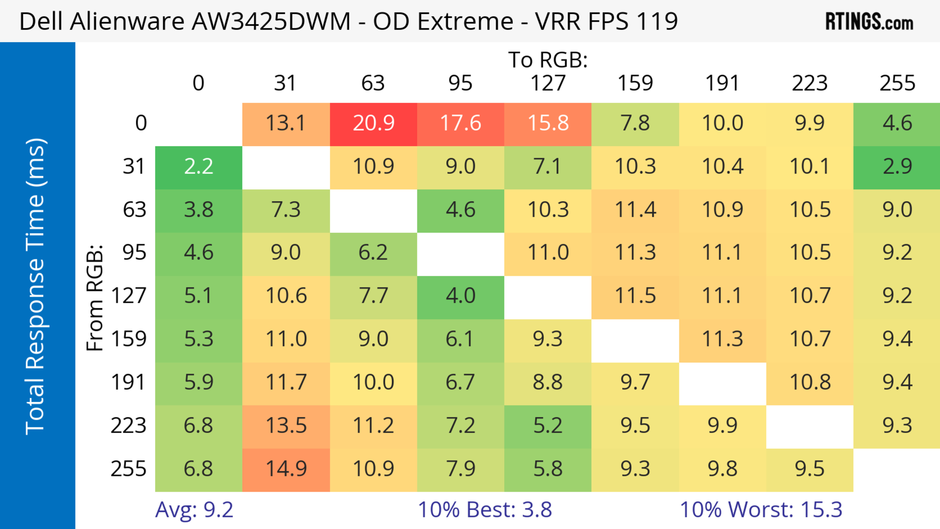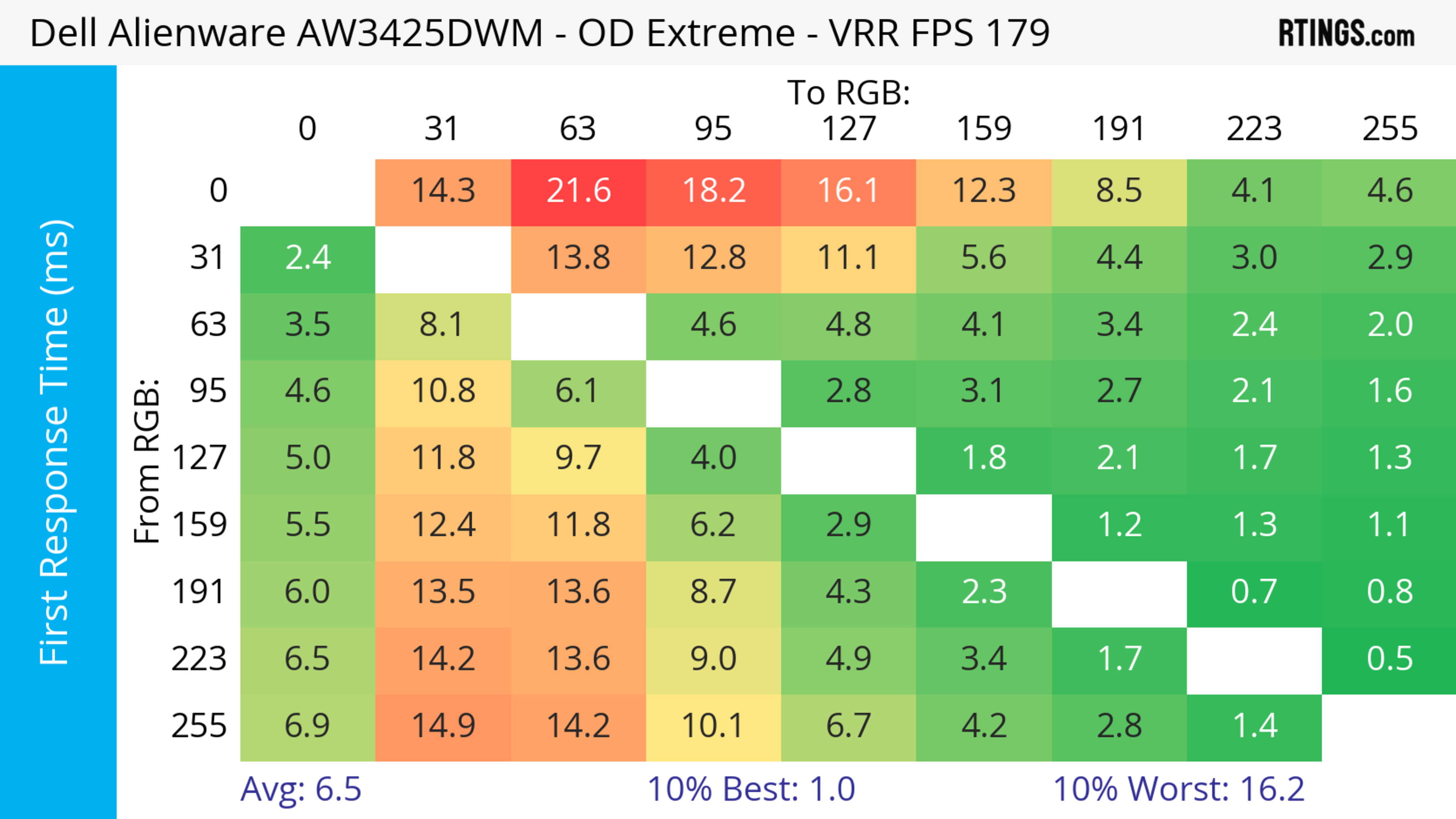 The Dell AW3425DWM has good motion handling across its VRR range. The 'Super Fast' Response Time setting is consistent as the refresh rate drops, but it has a slow response time with most transitions, particularly when going from dark to brighter colors, leading to black smearing behind fast-moving objects.