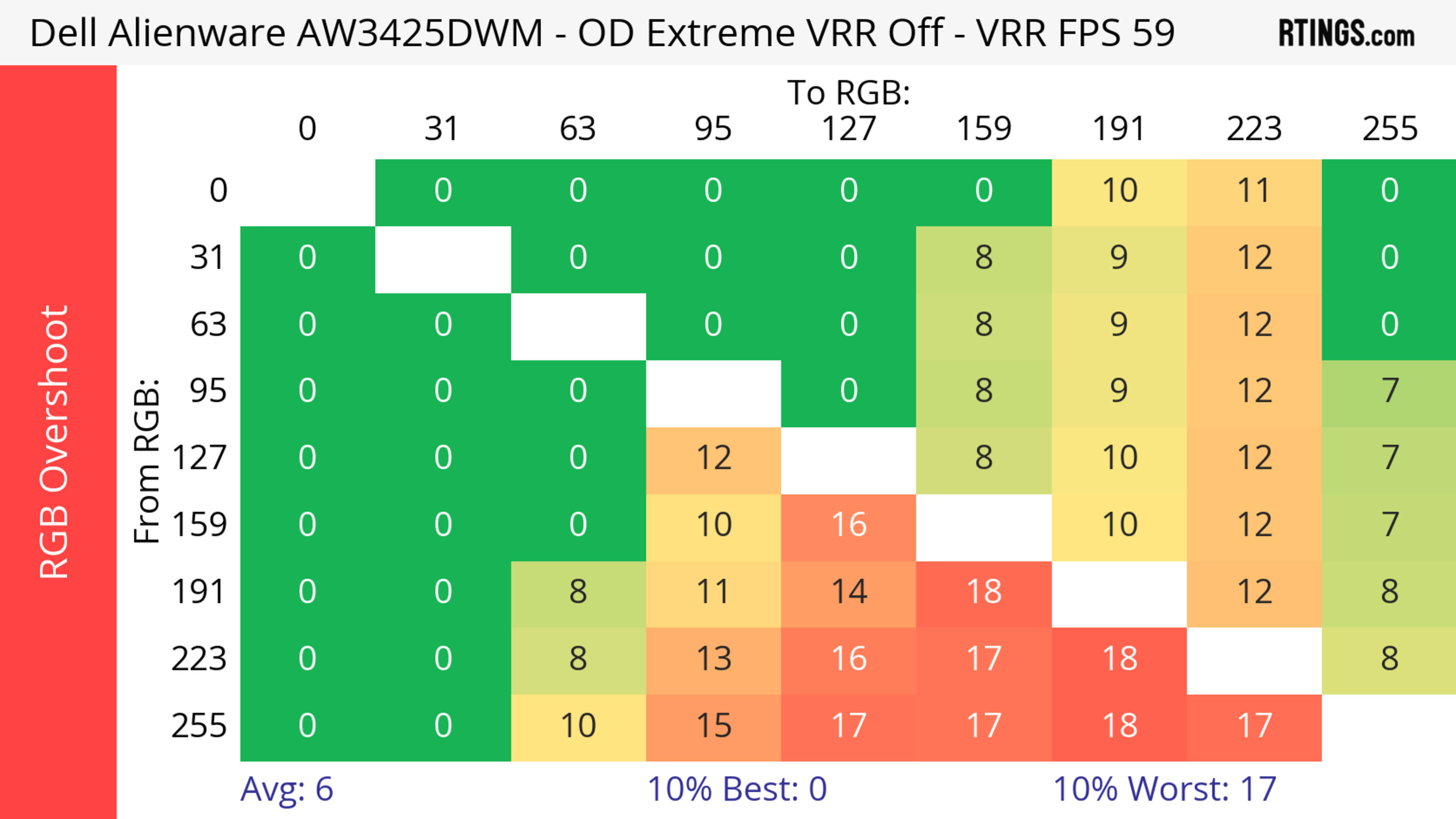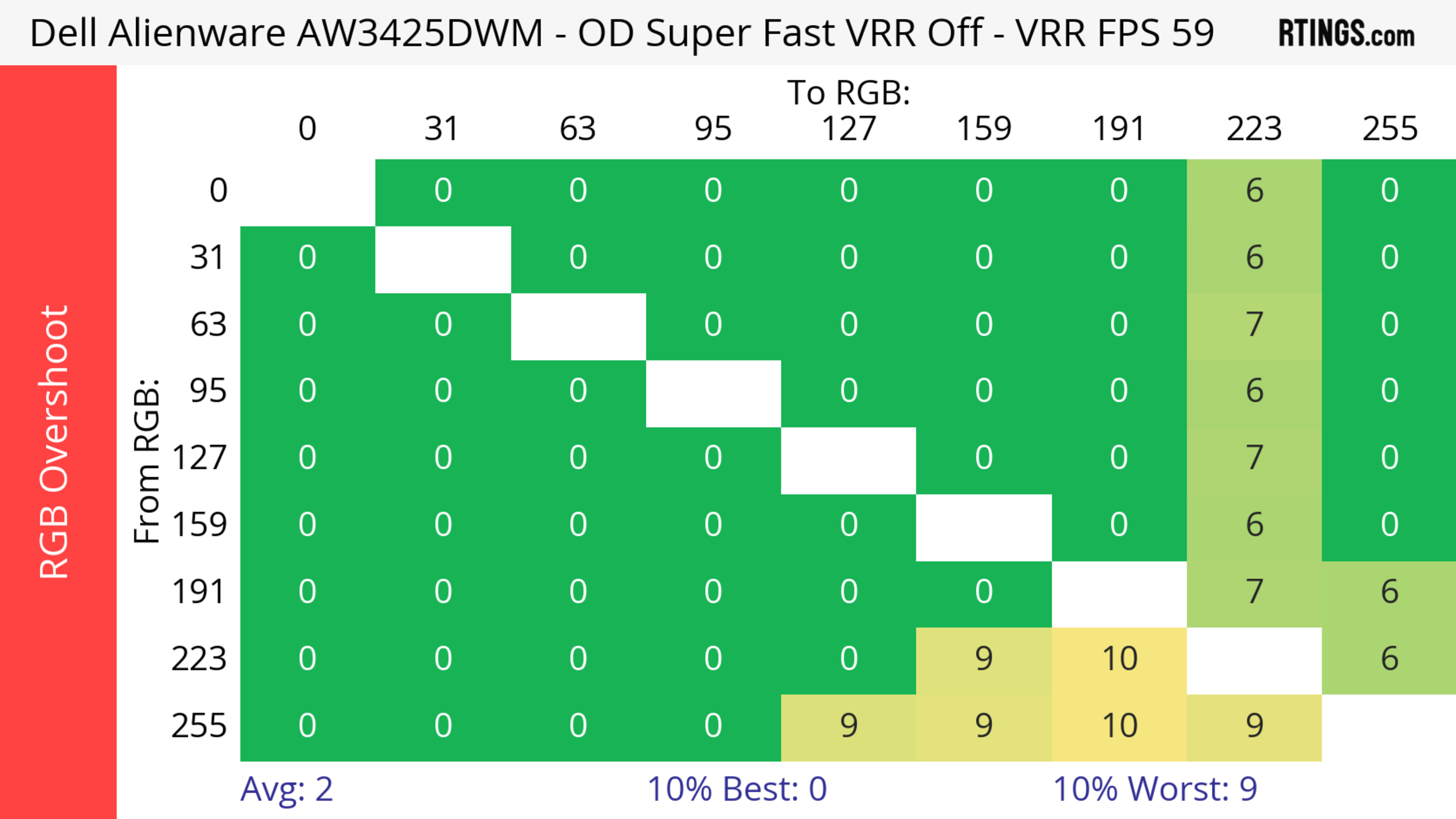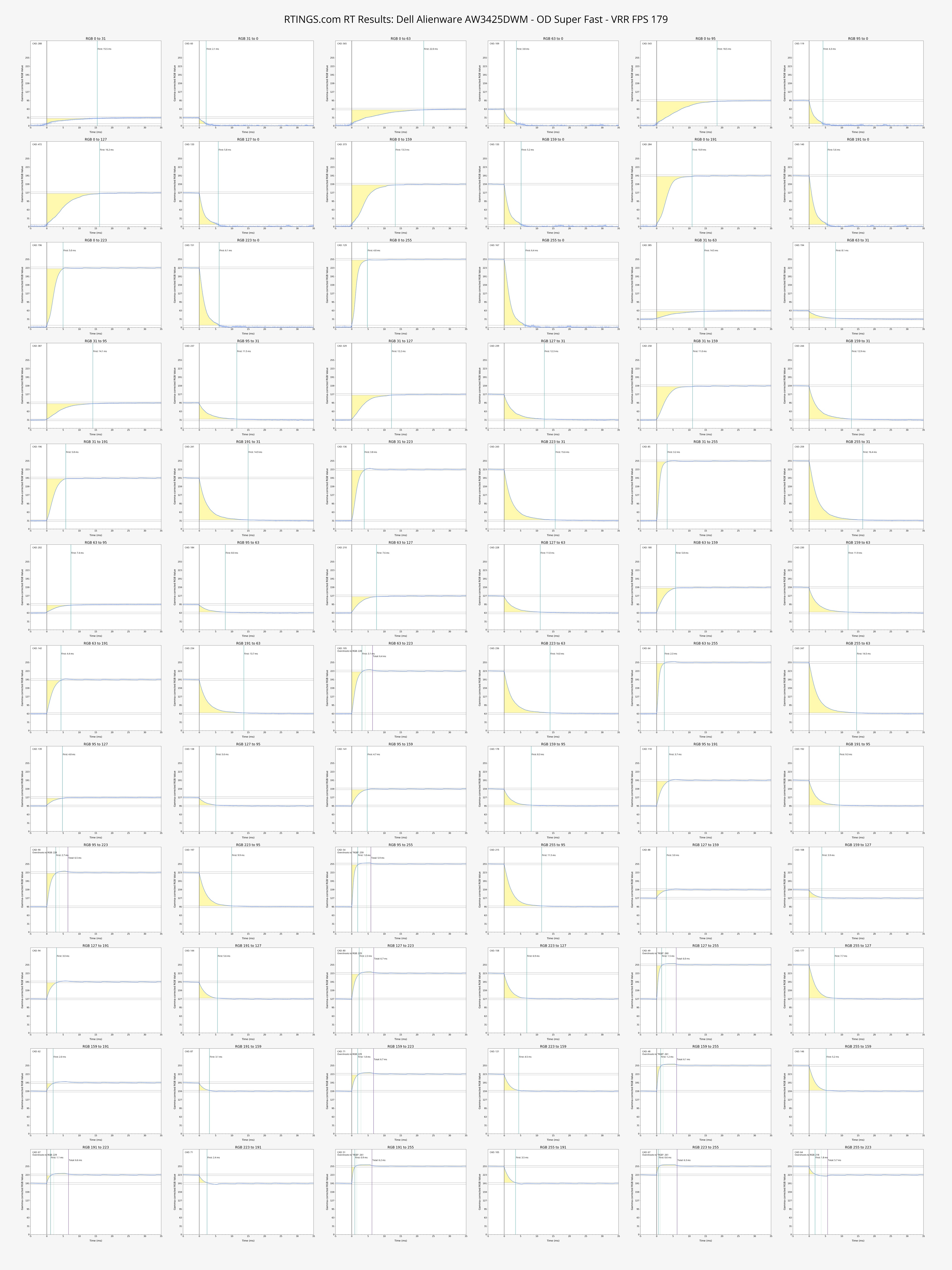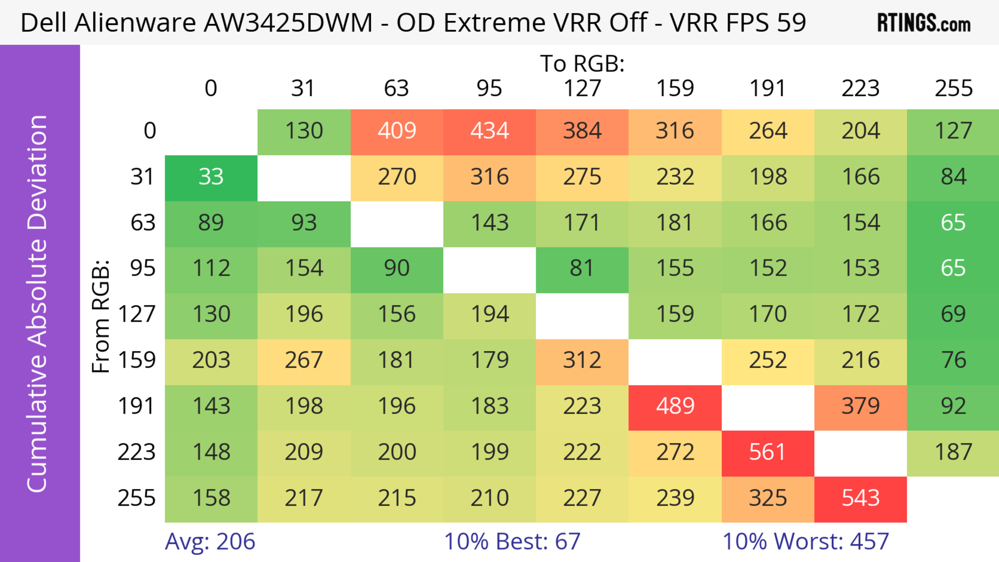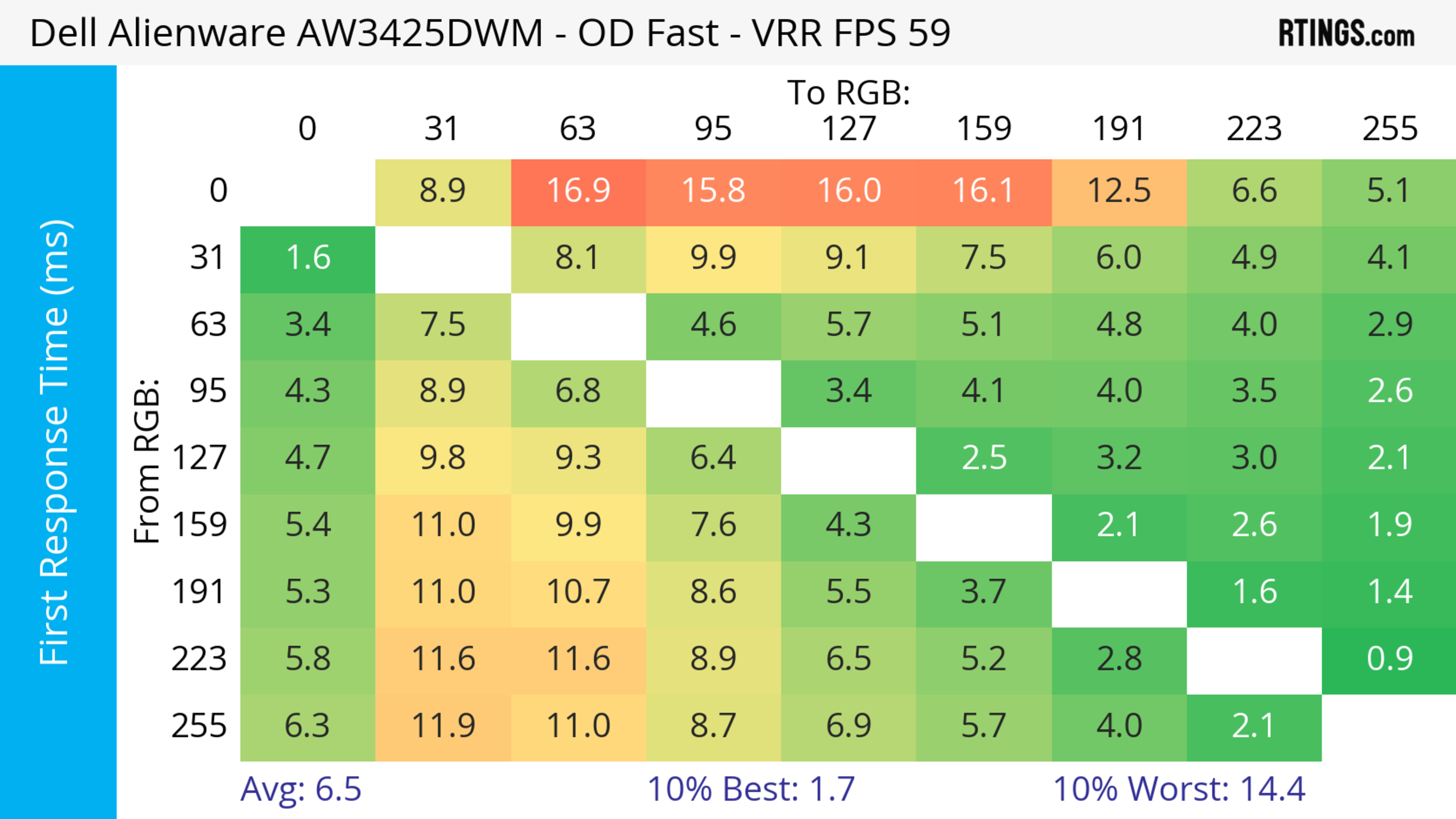 The Dell AW3425DWM has good motion handling across its VRR range. The 'Super Fast' Response Time setting is consistent as the refresh rate drops, but it has a slow response time with most transitions, particularly when going from dark to brighter colors, leading to black smearing behind fast-moving objects.