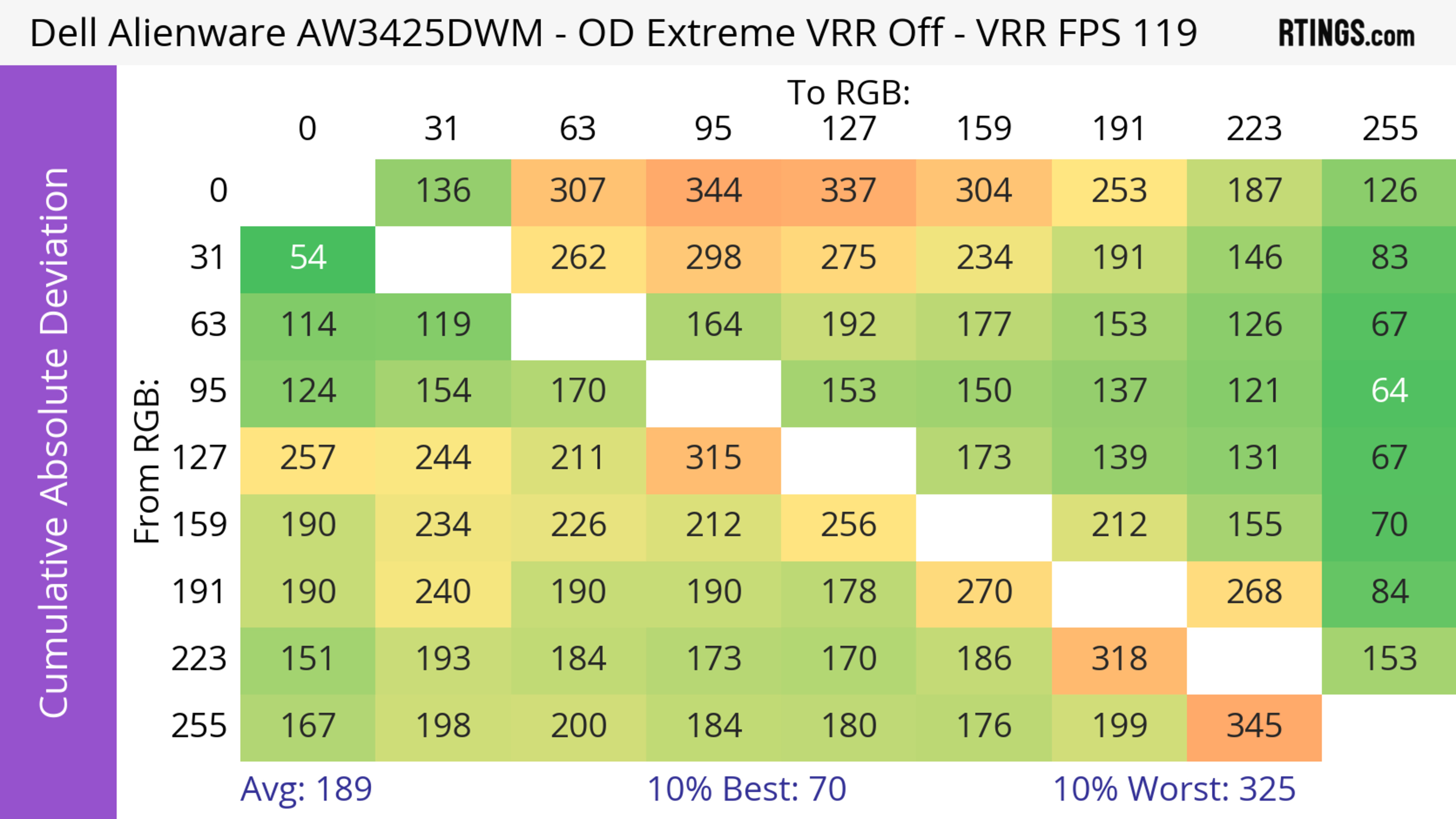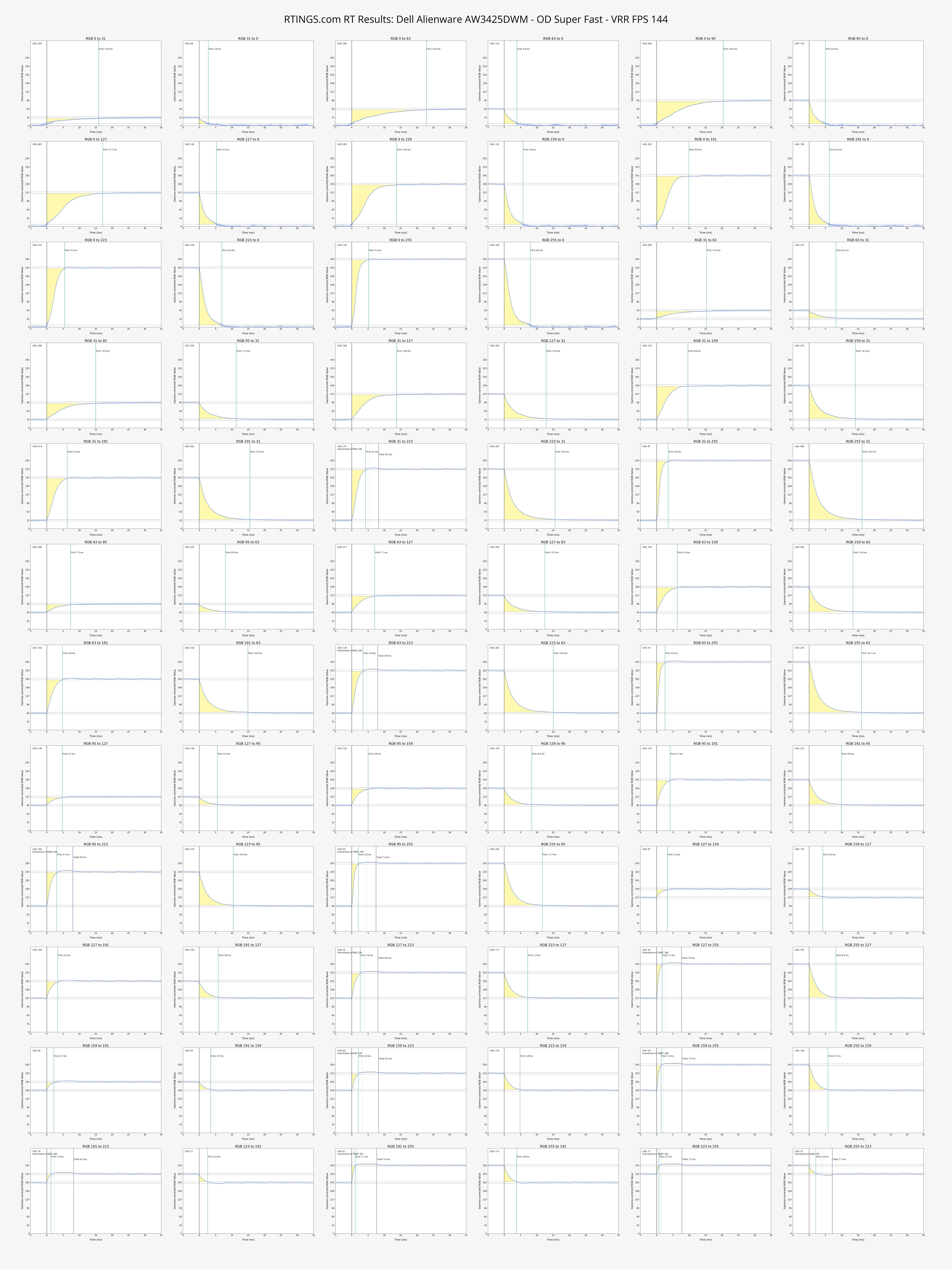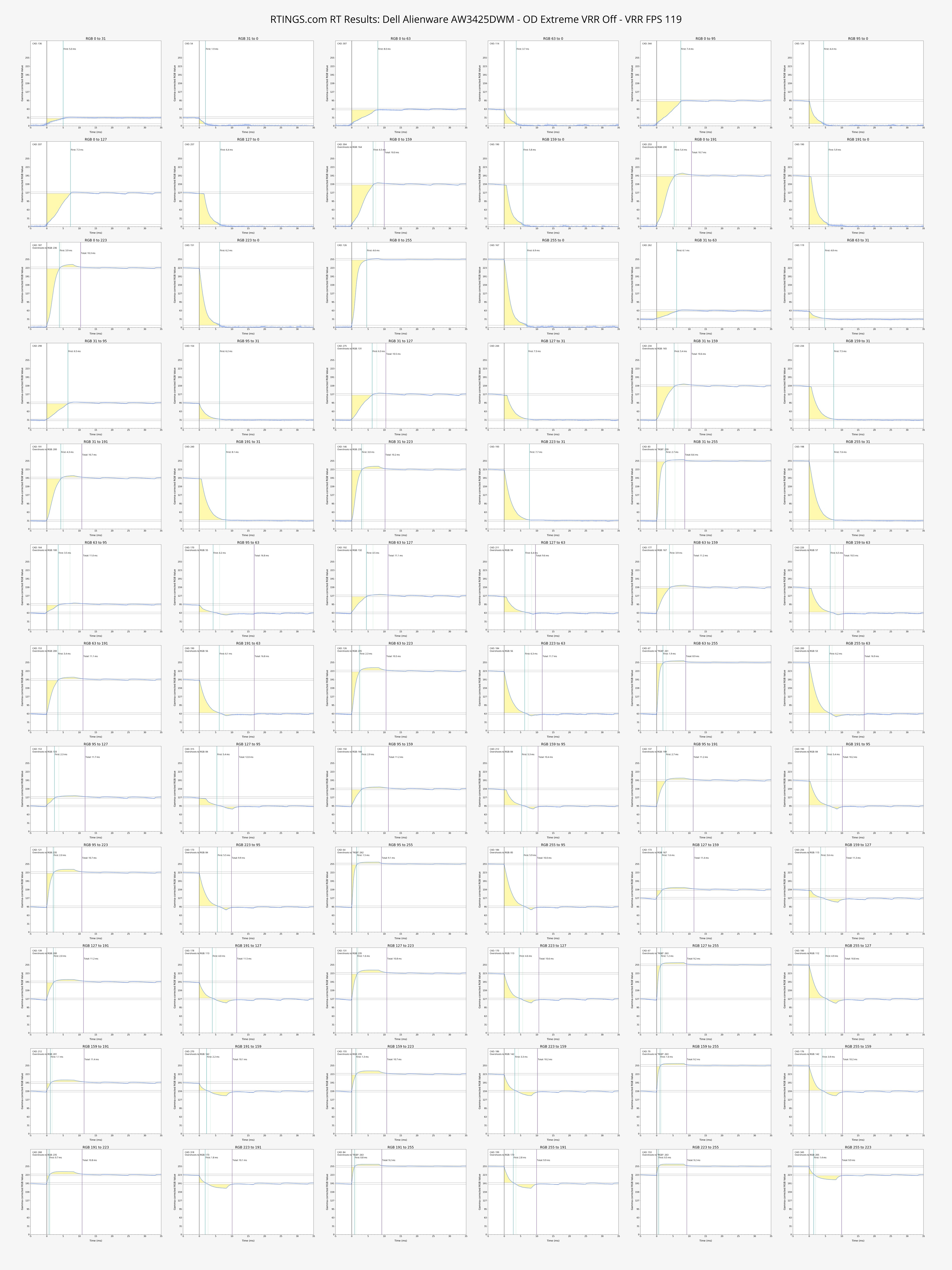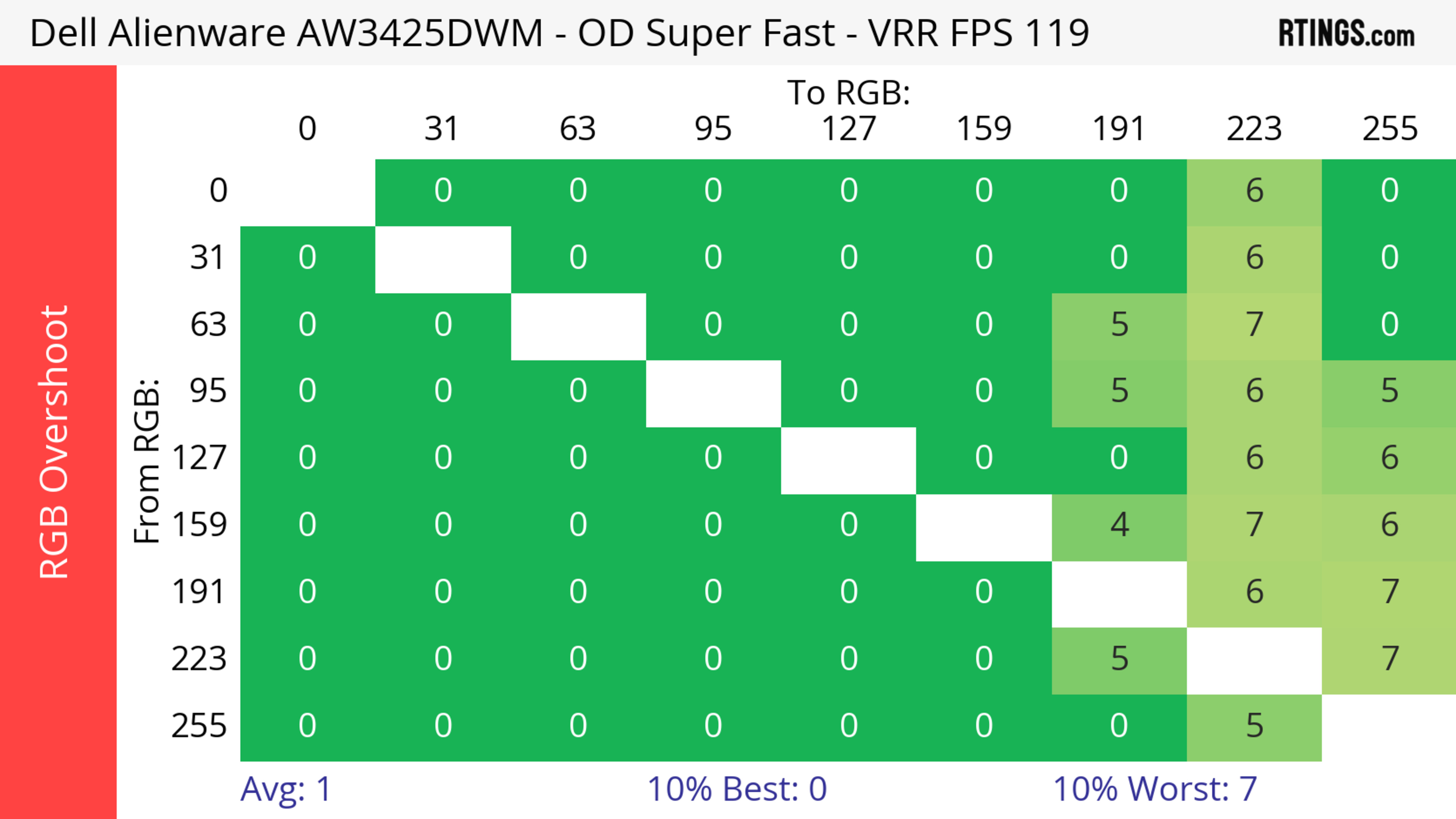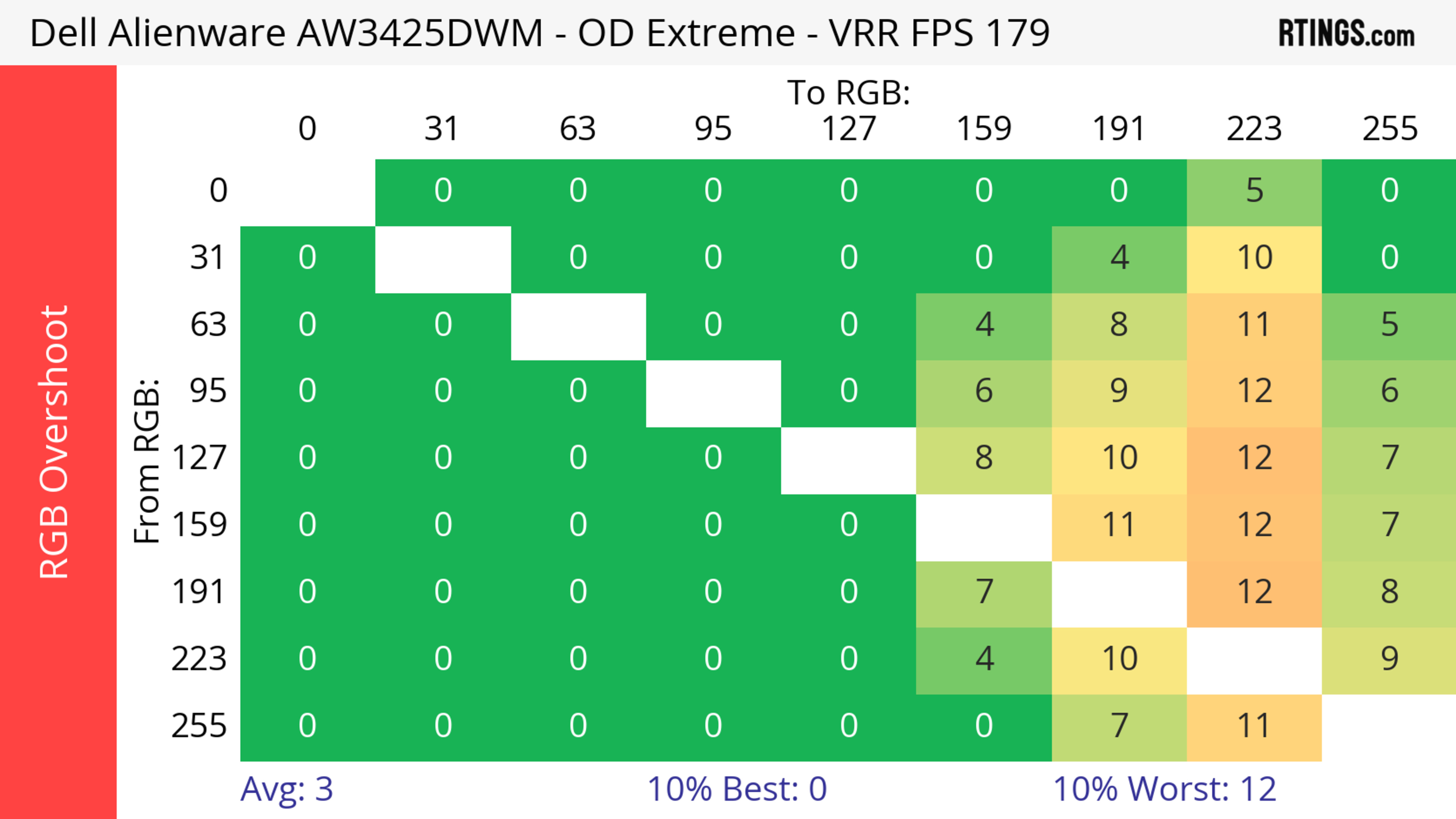 The Dell AW3425DWM has good motion handling across its VRR range. The 'Super Fast' Response Time setting is consistent as the refresh rate drops, but it has a slow response time with most transitions, particularly when going from dark to brighter colors, leading to black smearing behind fast-moving objects.