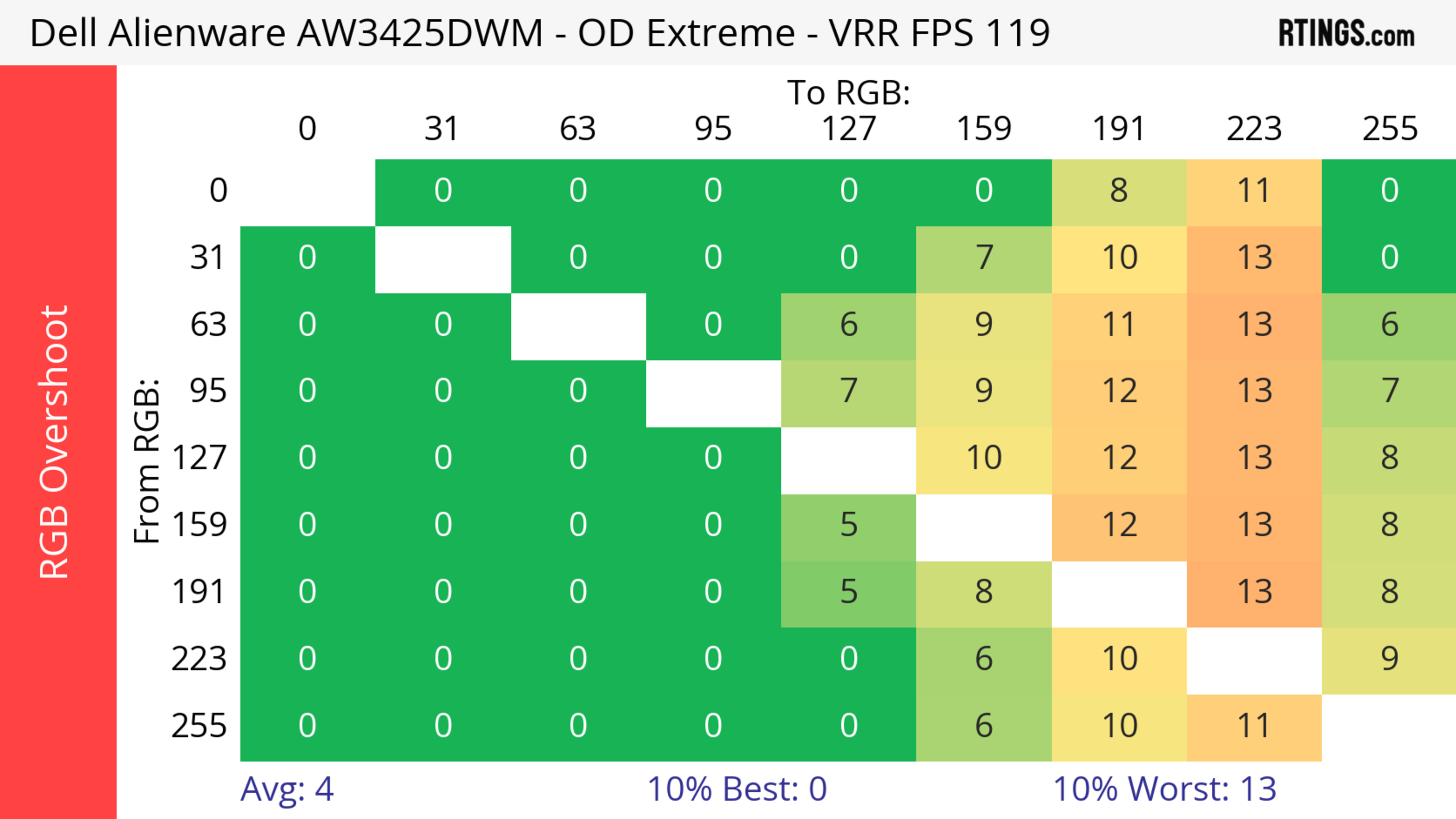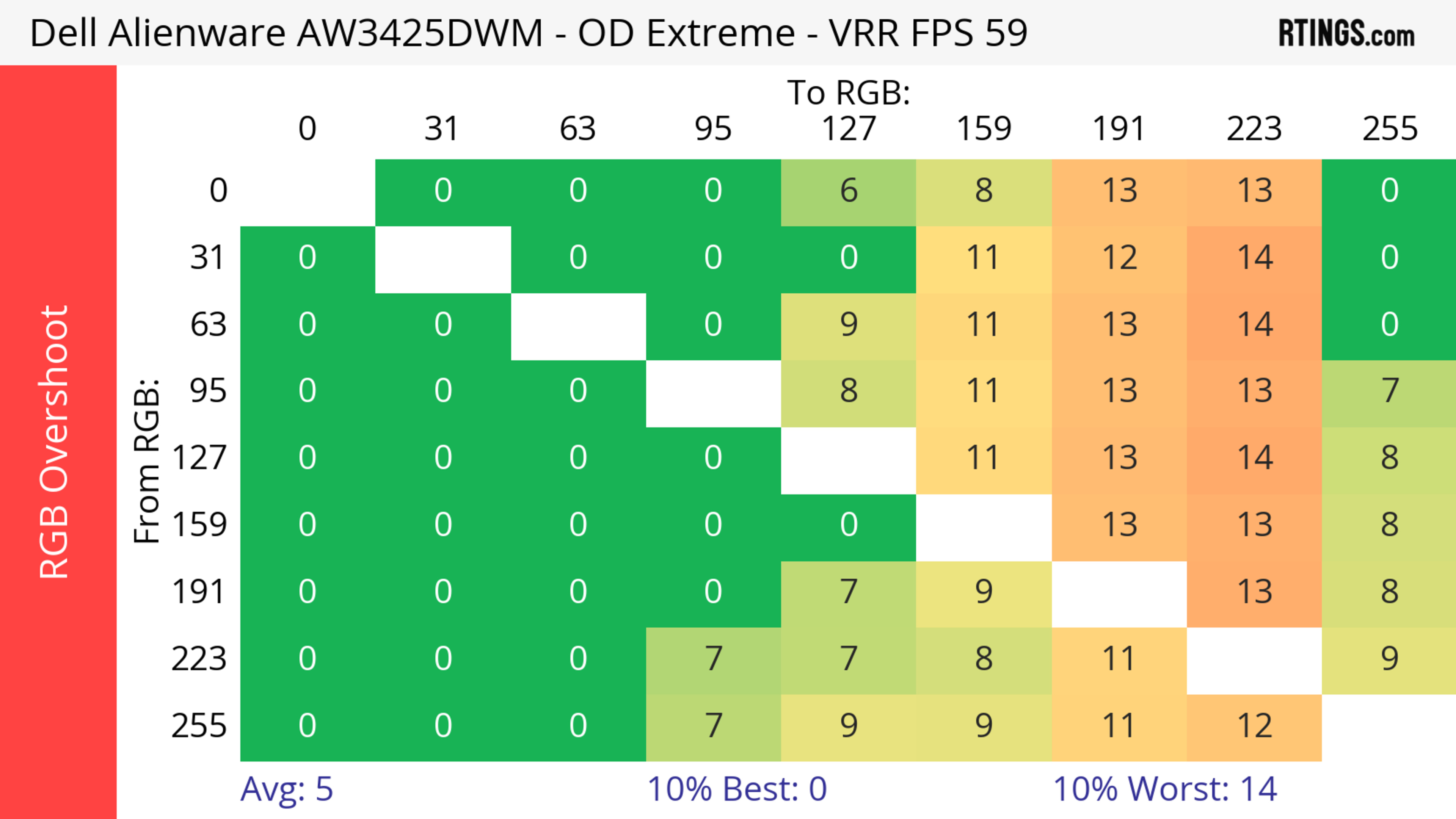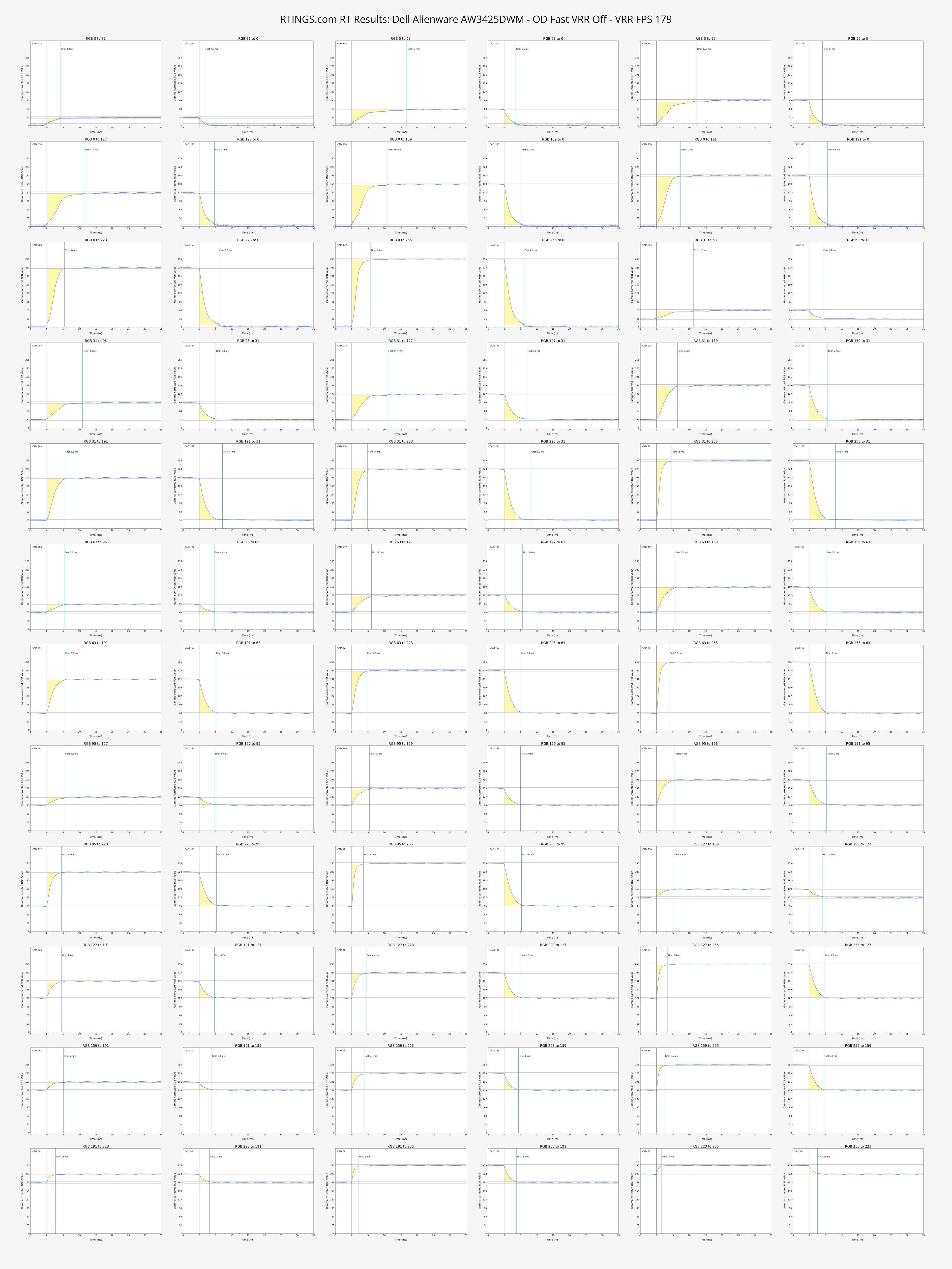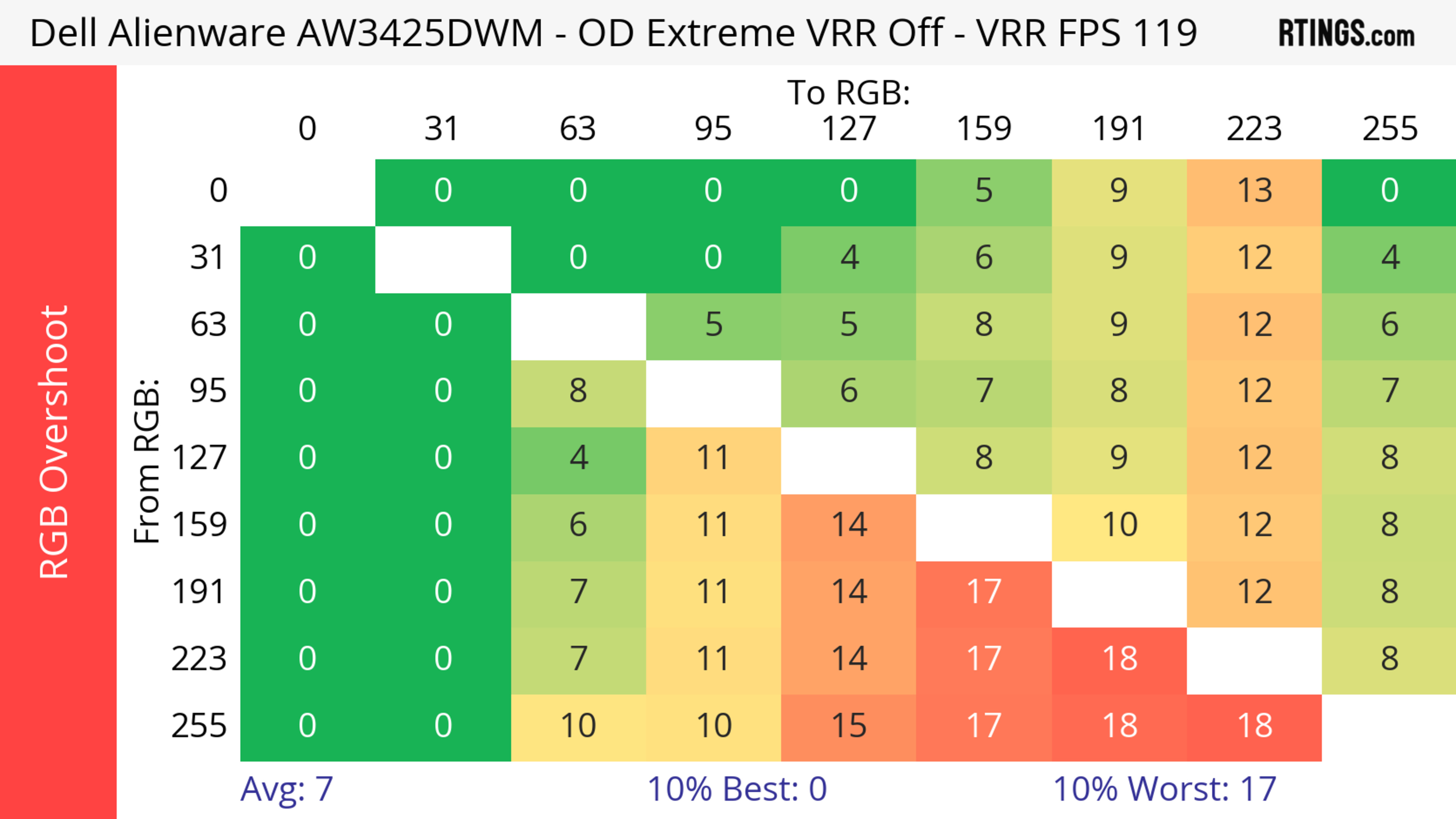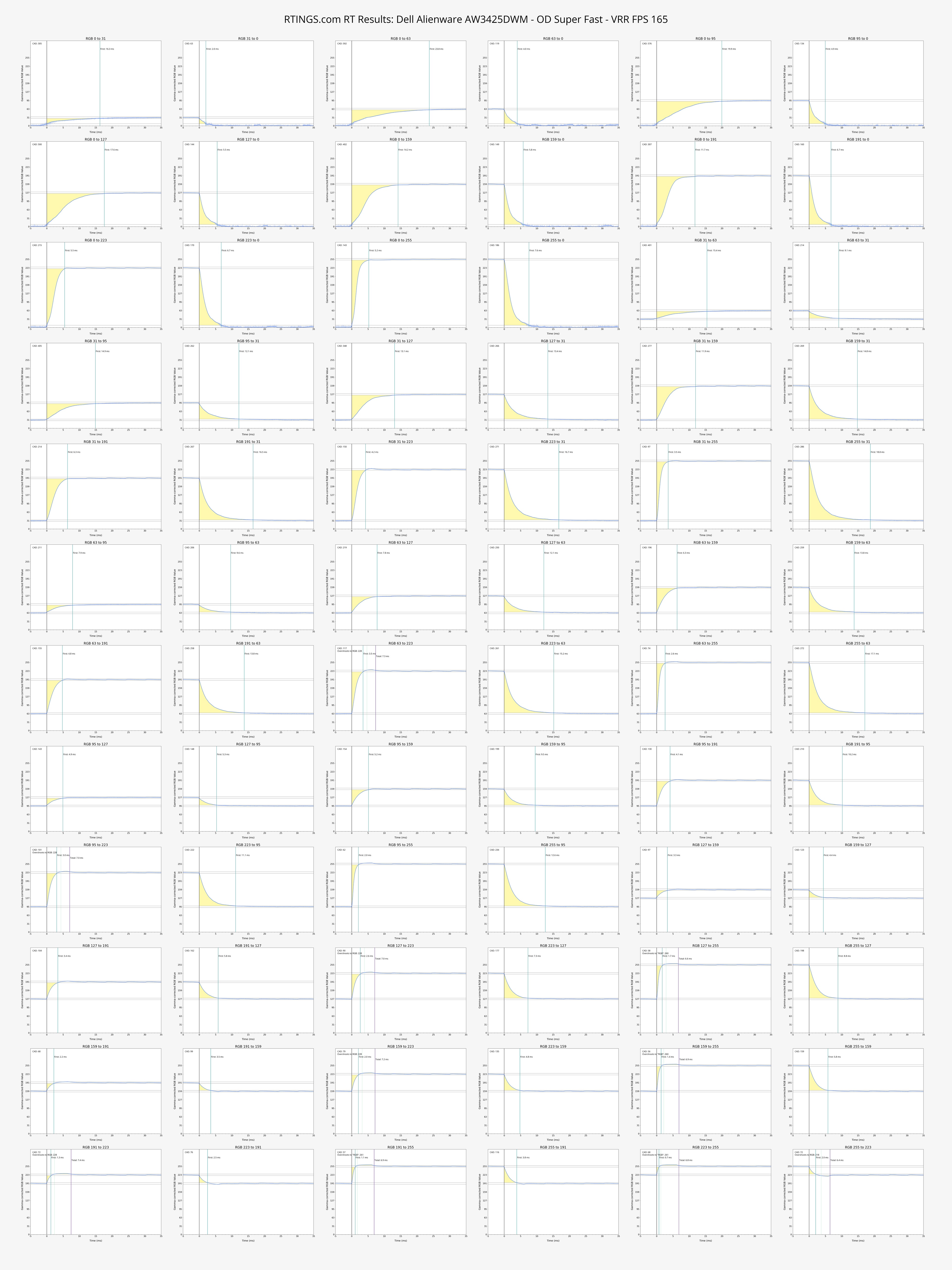The Dell AW3425DWM has good motion handling across its VRR range. The 'Super Fast' Response Time setting is consistent as the refresh rate drops, but it has a slow response time with most transitions, particularly when going from dark to brighter colors, leading to black smearing behind fast-moving objects.