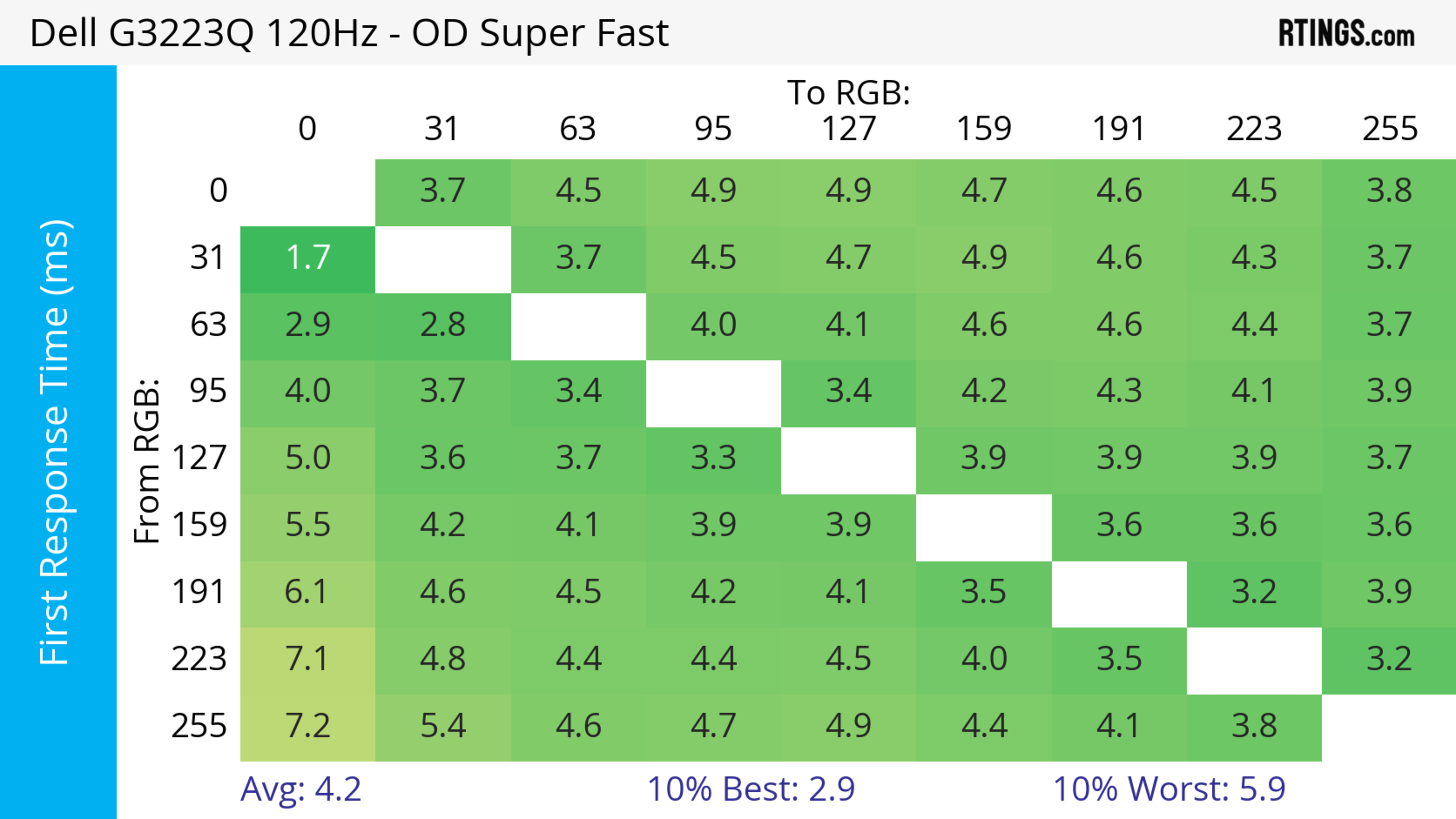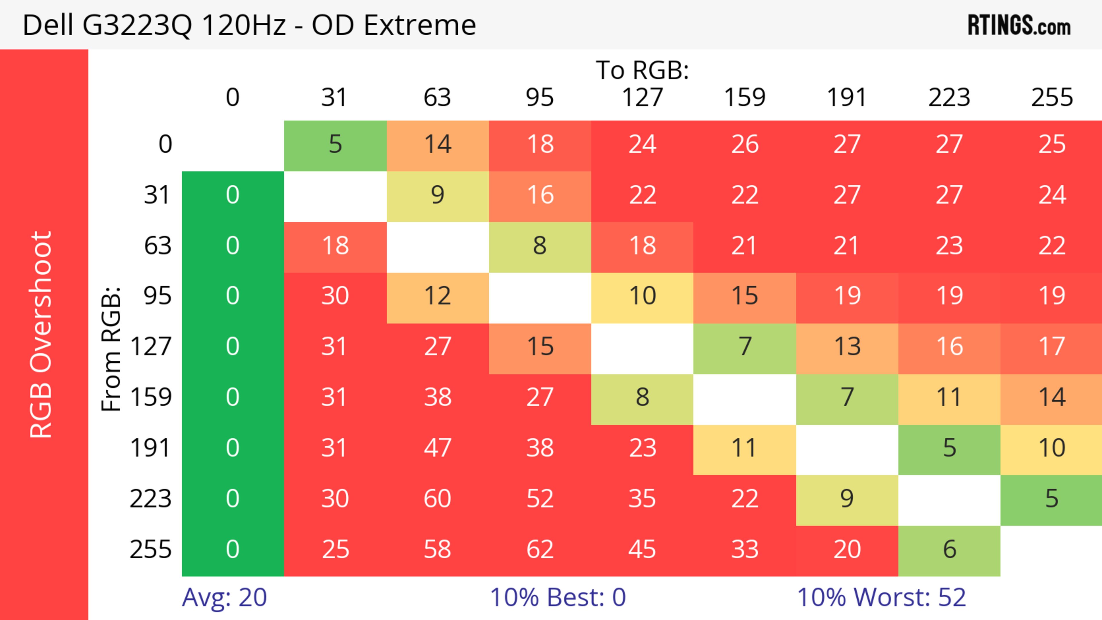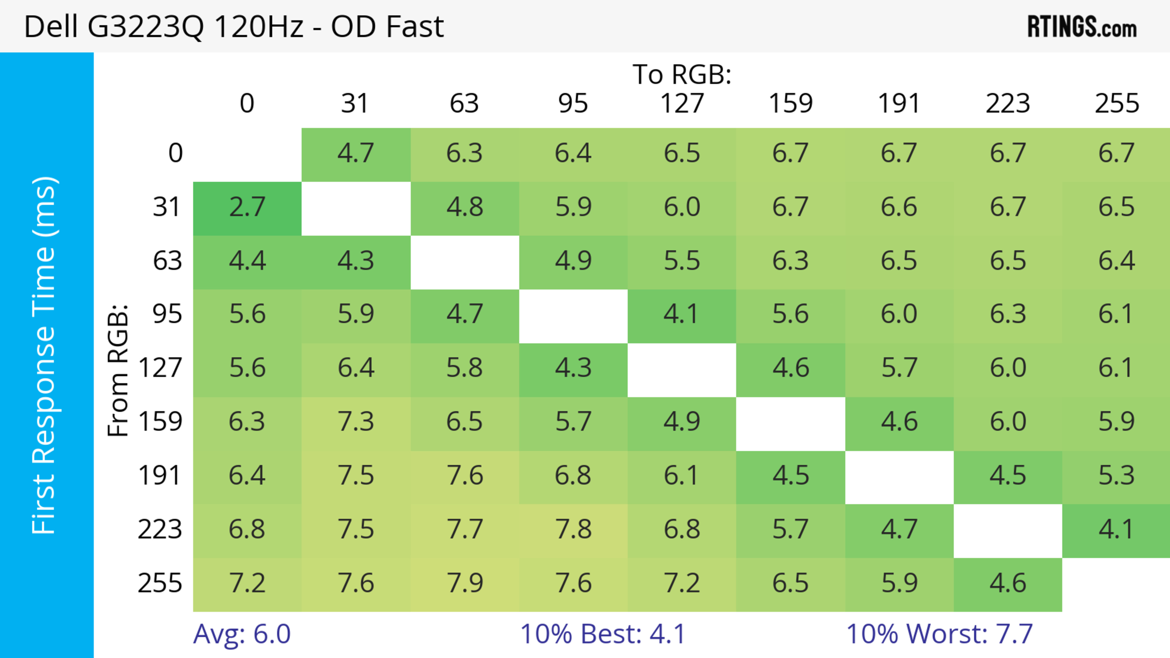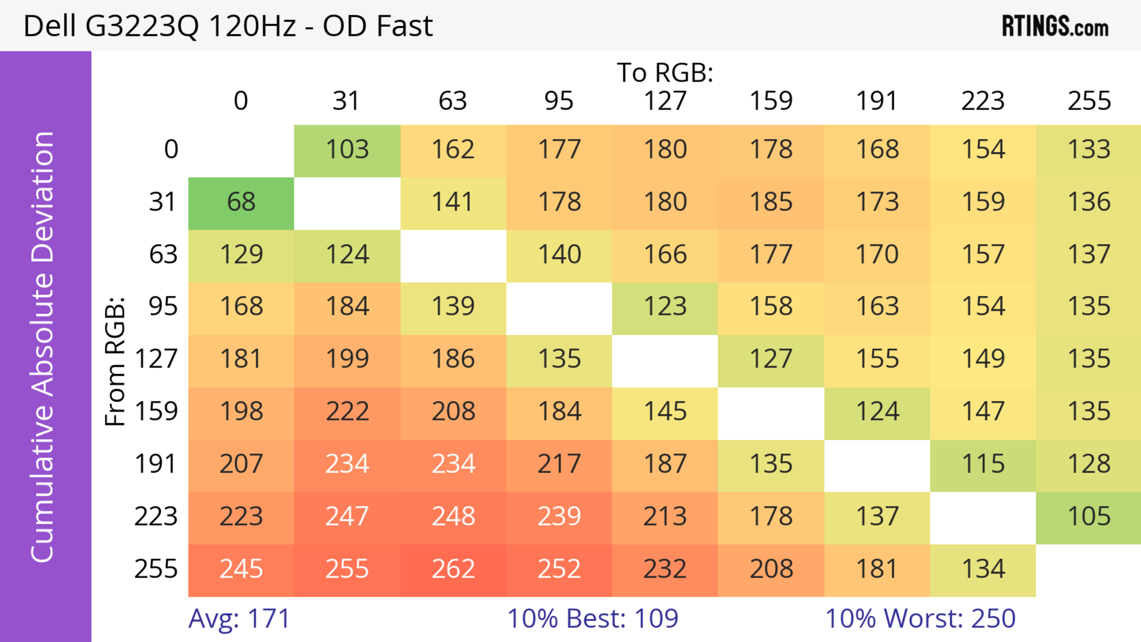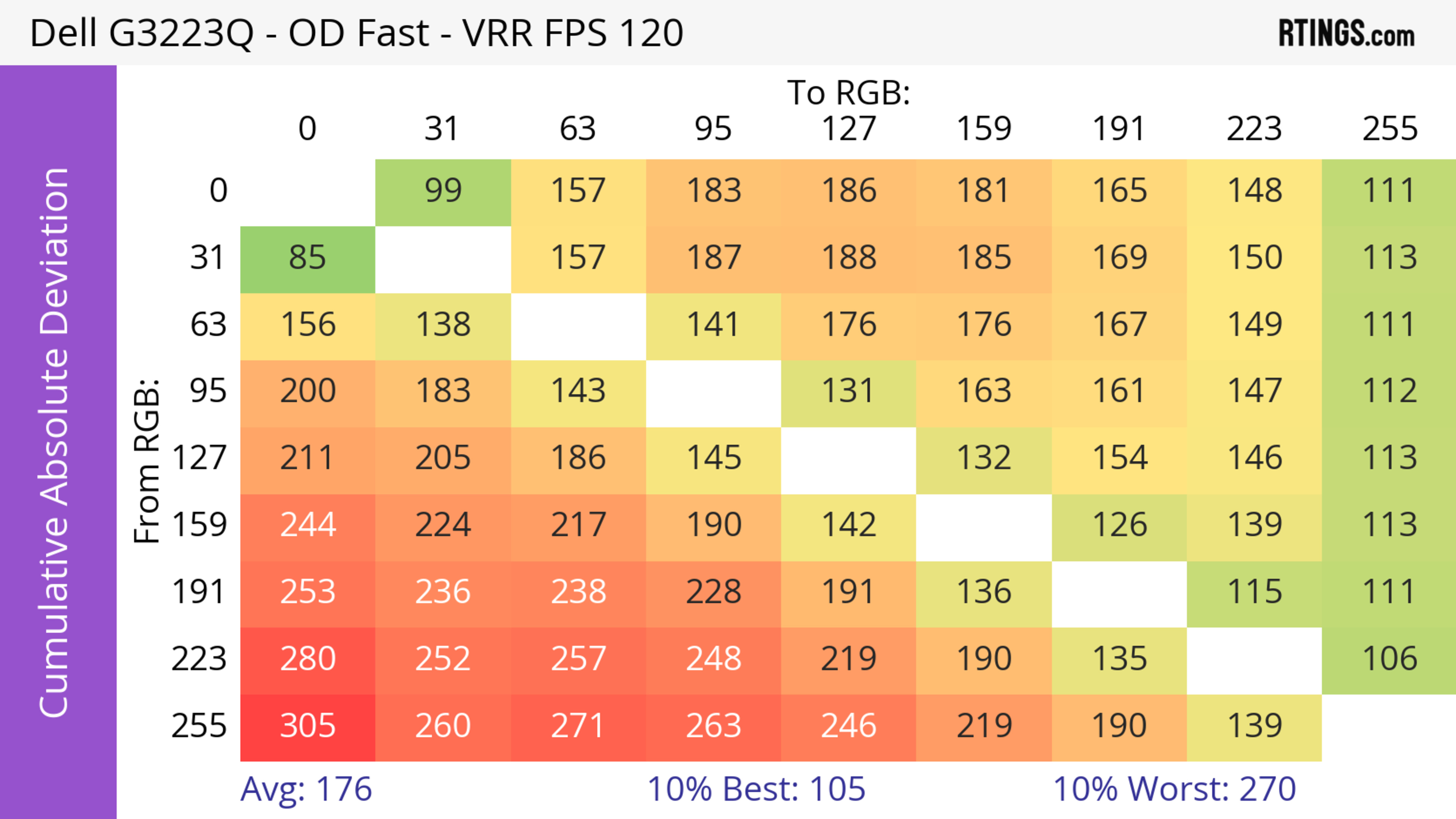 The Dell G3223Q has good CAD at 120Hz. Unlike at its max refresh rate, the recommended overdrive setting is 'Fast' because 'Super Fast' and 'Extreme' have too much overshoot, causing inverse ghosting. This means you may have to change the setting if the frame rate of your game drops or if you change games.