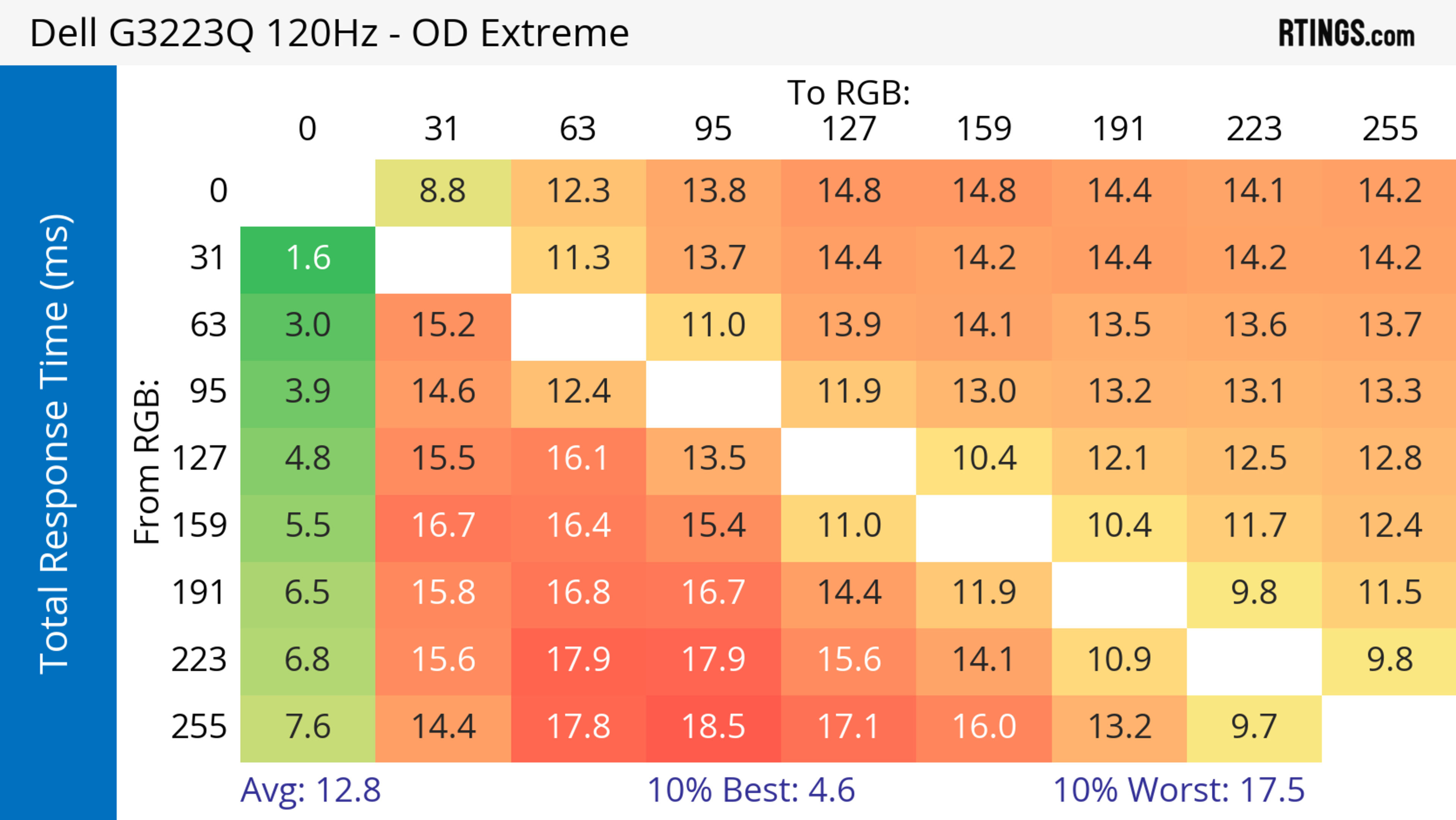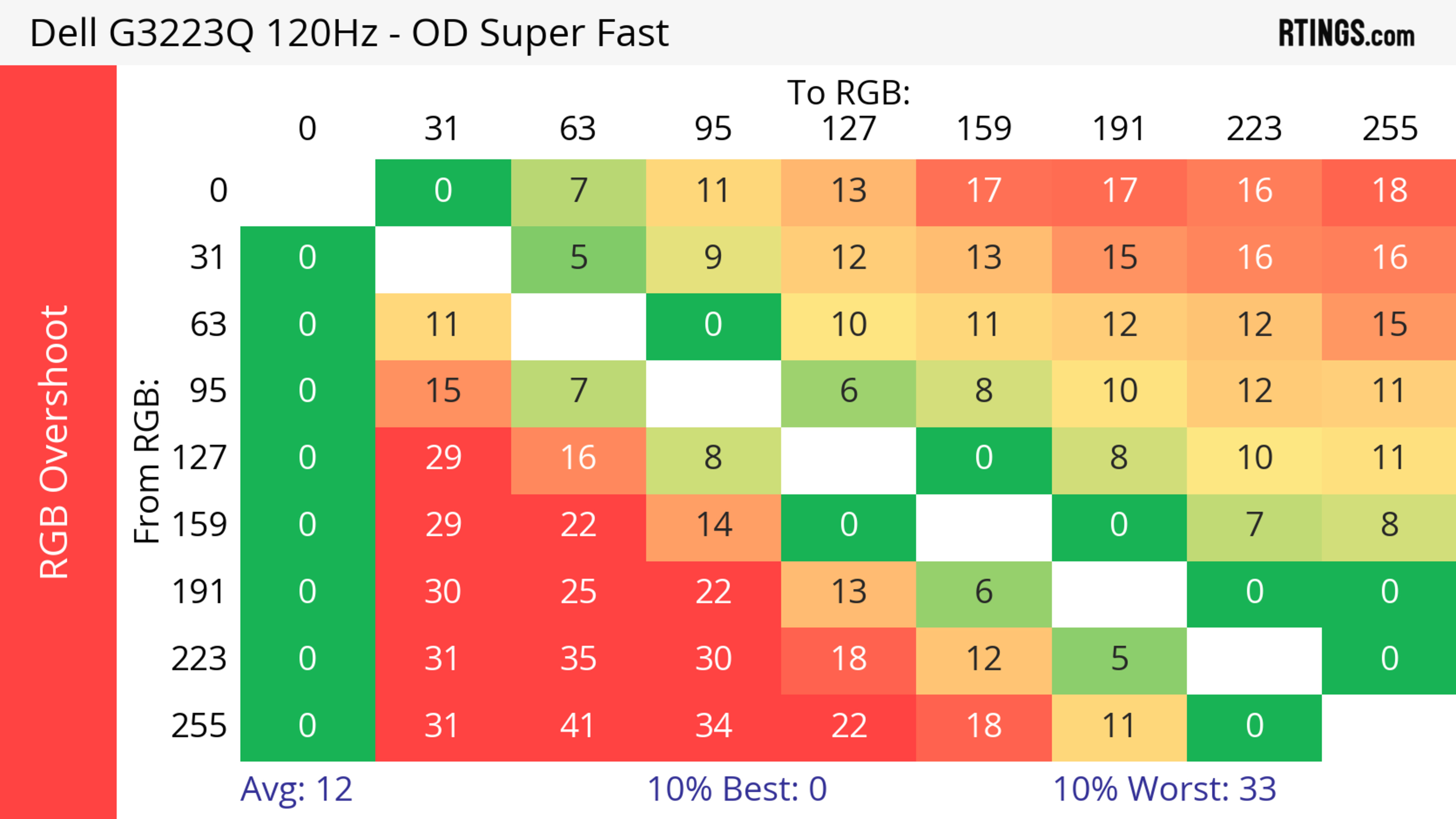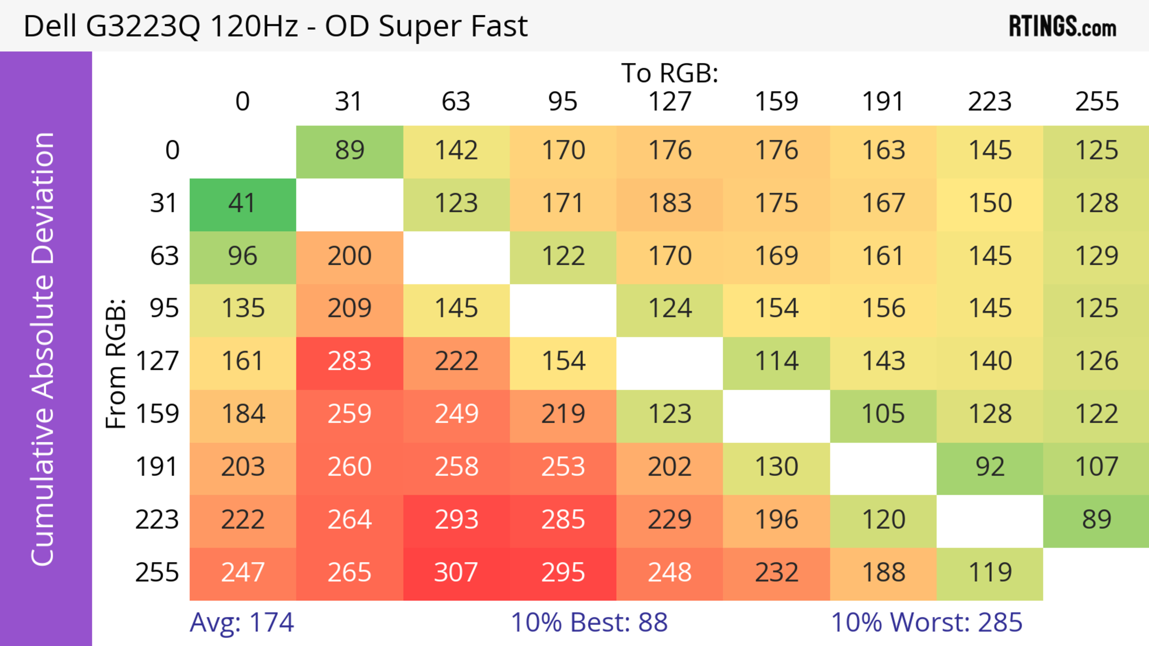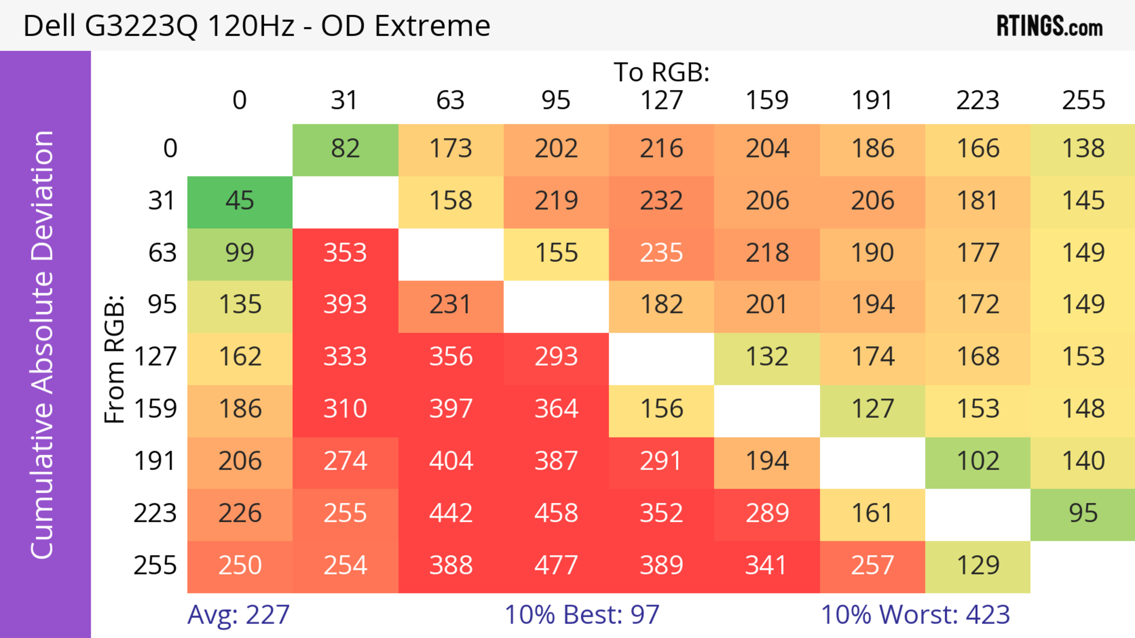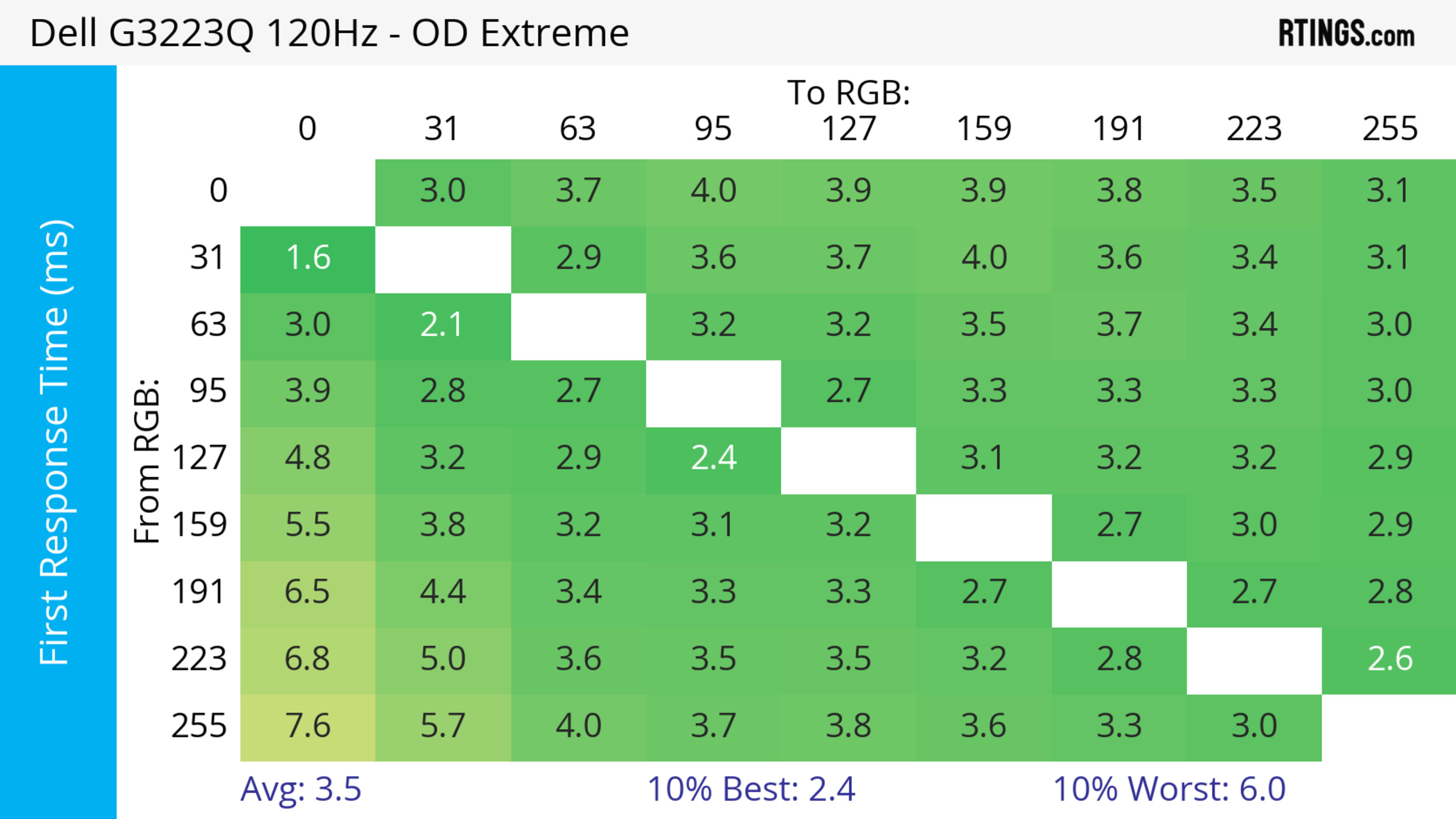 The Dell G3223Q has good CAD at 120Hz. Unlike at its max refresh rate, the recommended overdrive setting is 'Fast' because 'Super Fast' and 'Extreme' have too much overshoot, causing inverse ghosting. This means you may have to change the setting if the frame rate of your game drops or if you change games.