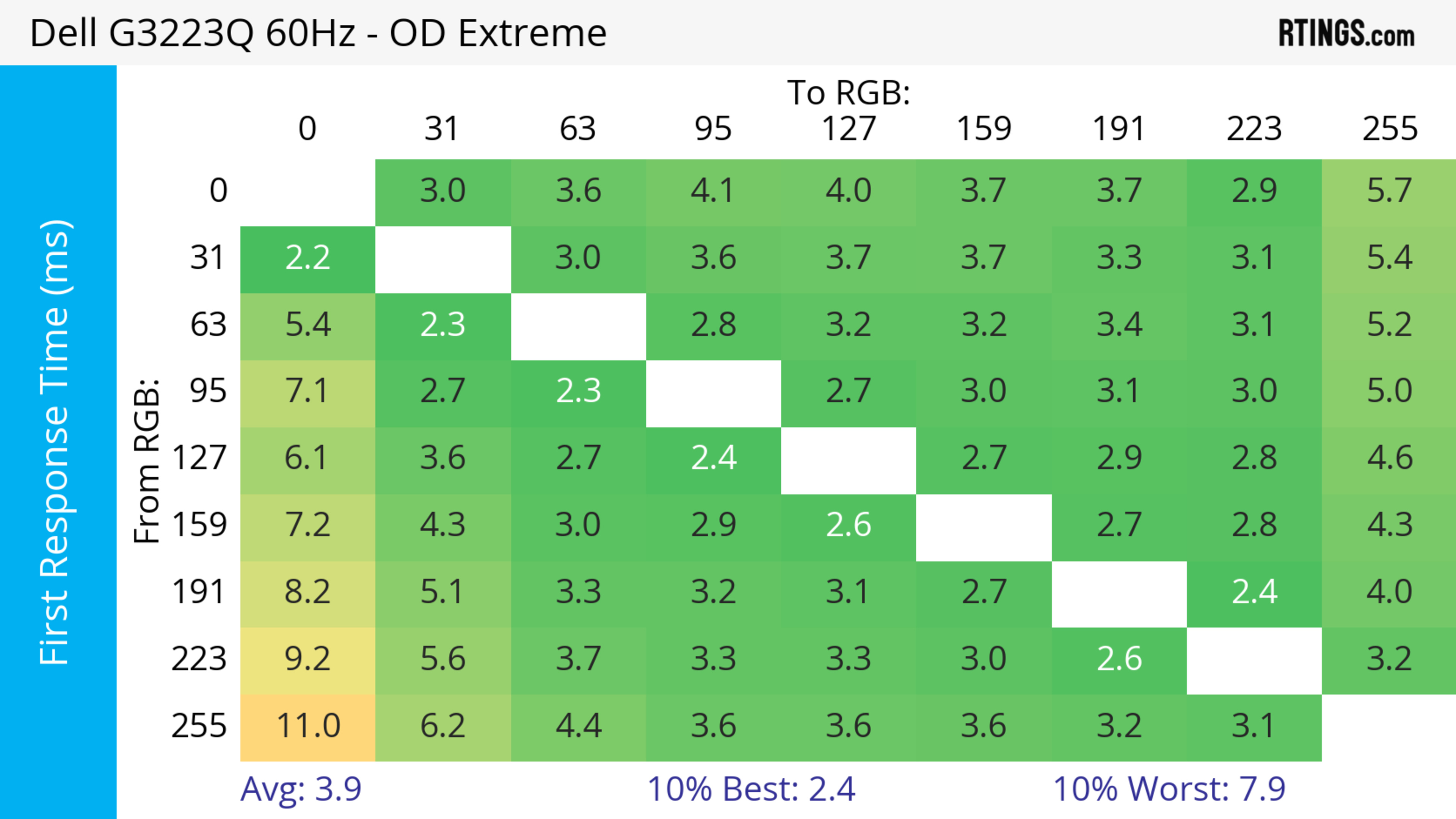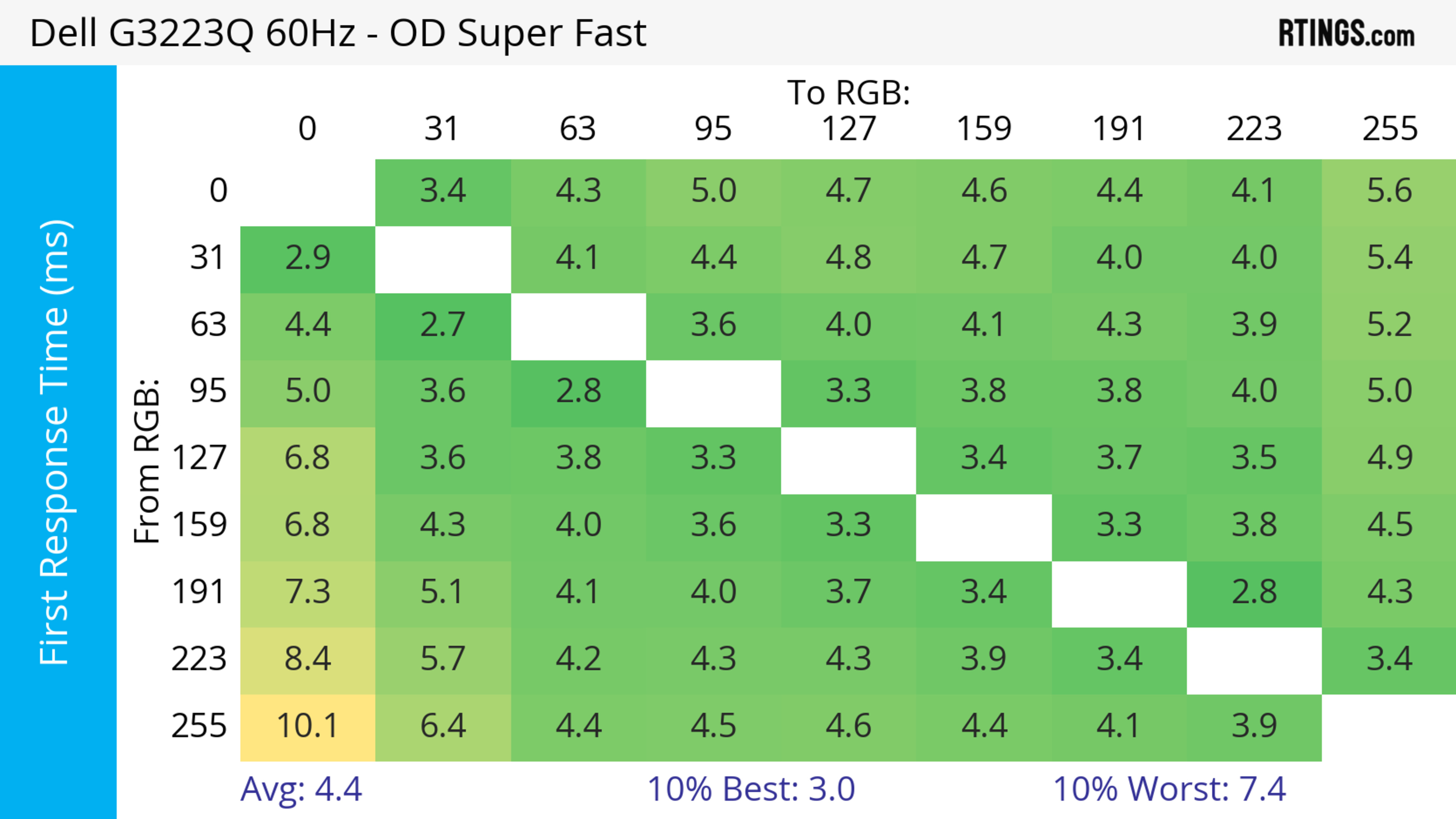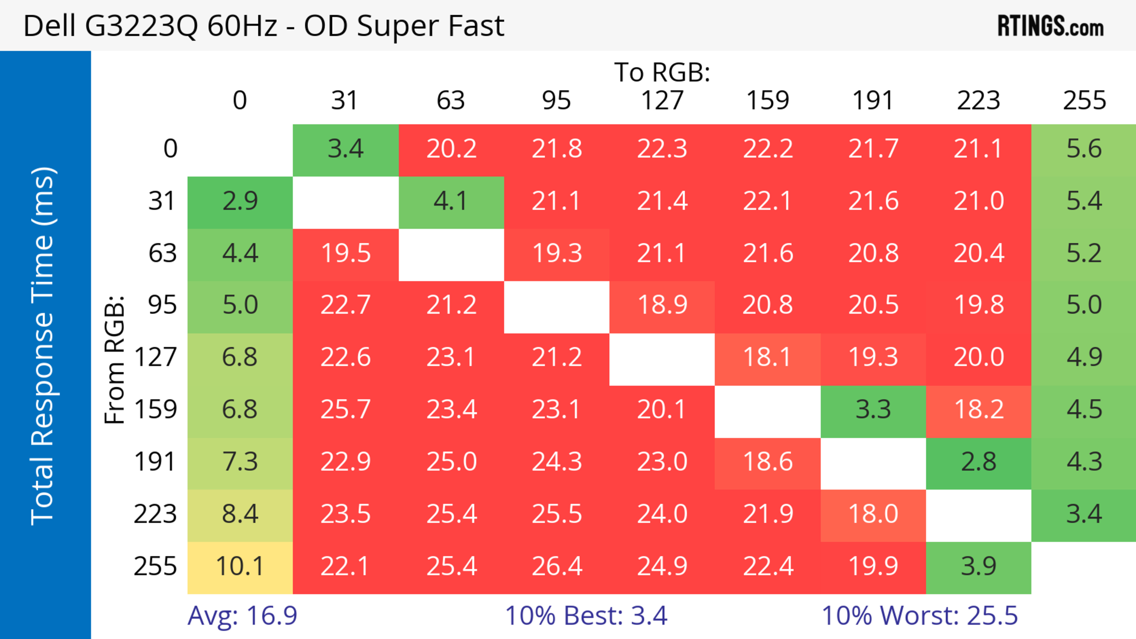 The Dell G3223Q has low input lag for a responsive gaming experience with high-frame rate games. Sadly, it increases a lot more with 60Hz games, and while it's still fine enough for casual console gamers, it's still worse than other monitors at 60Hz.