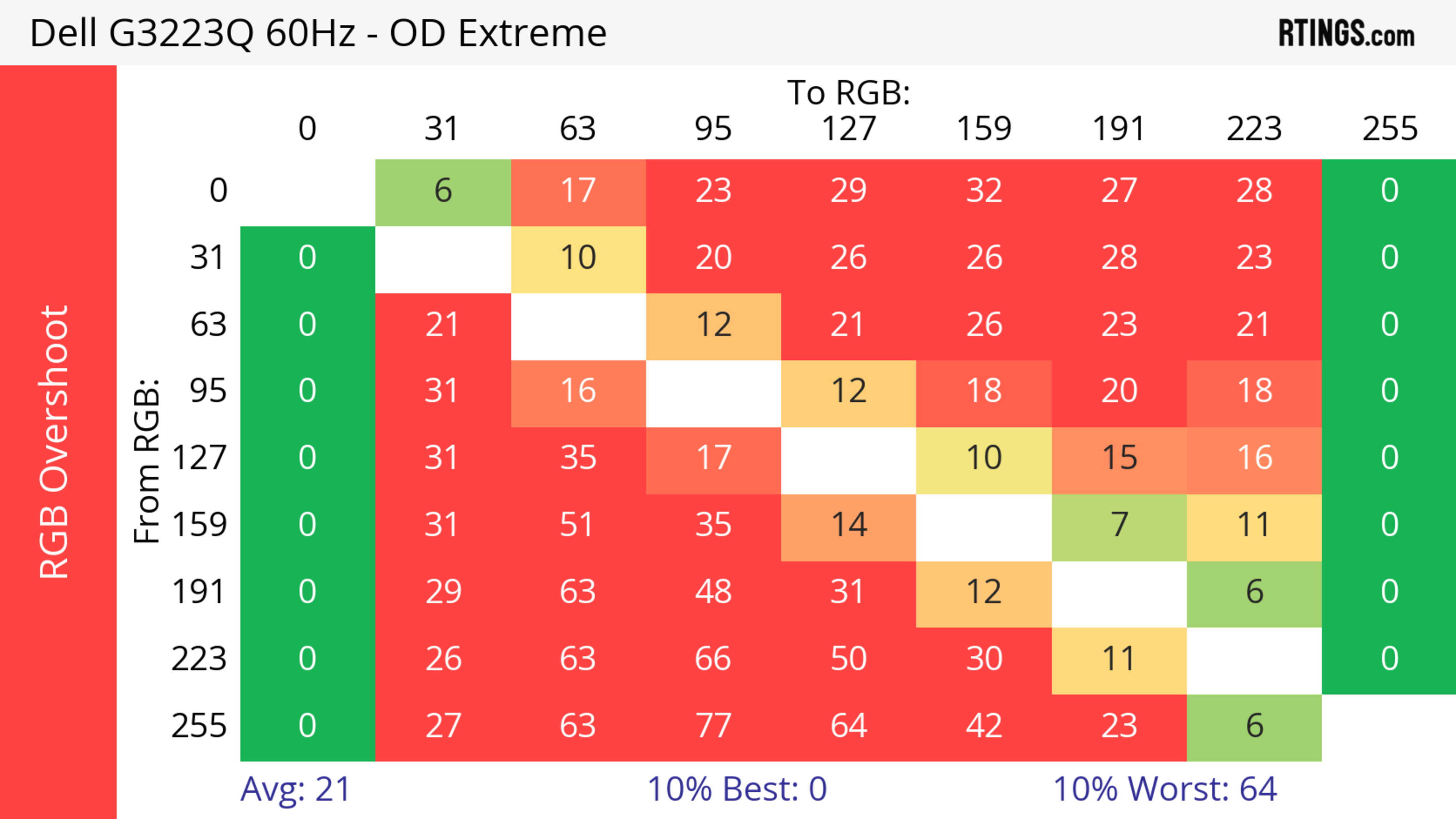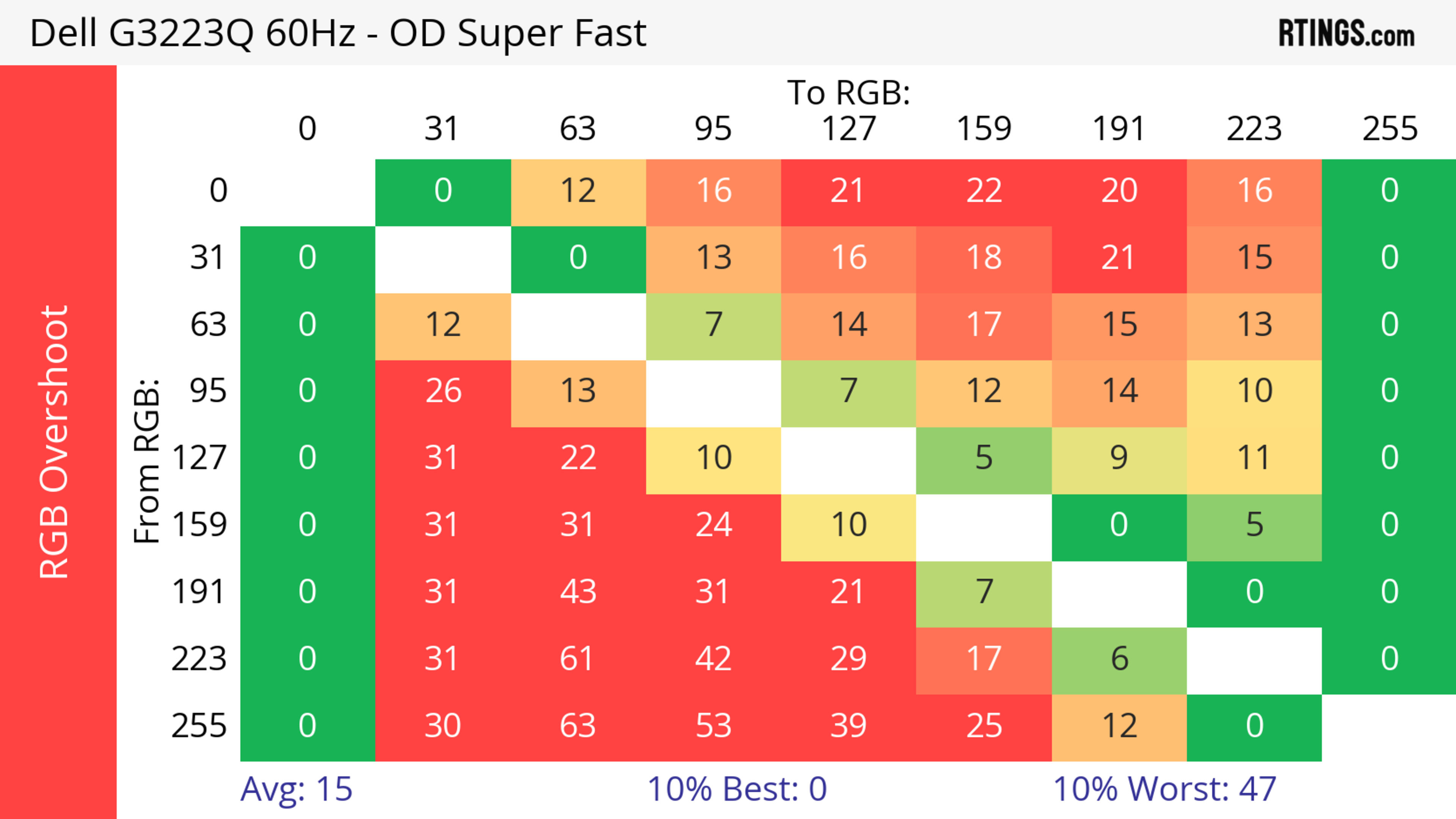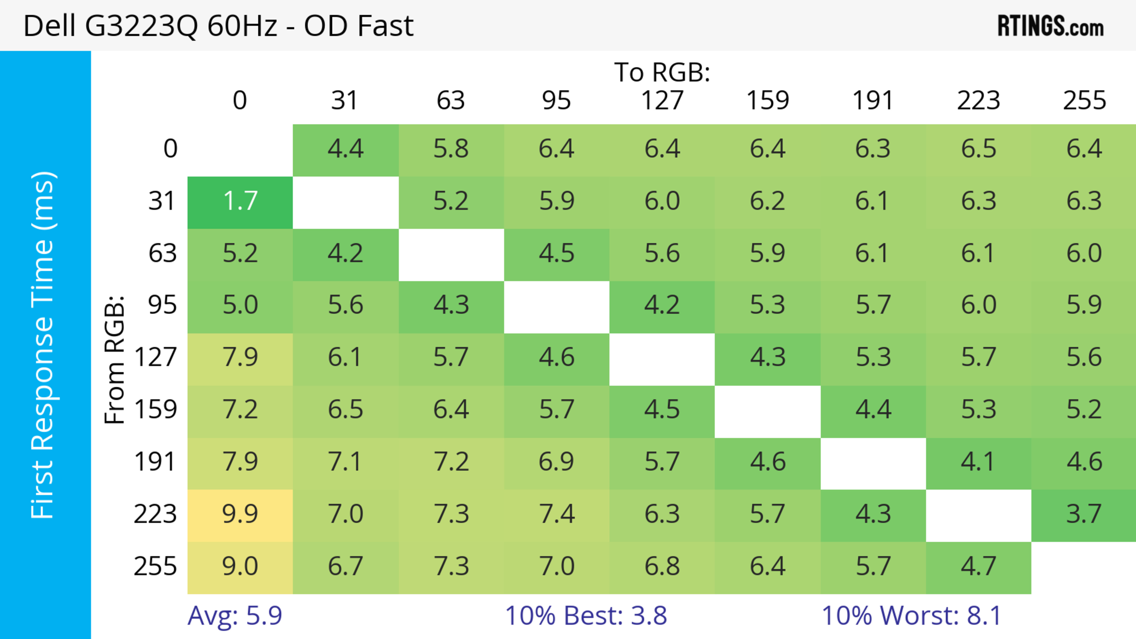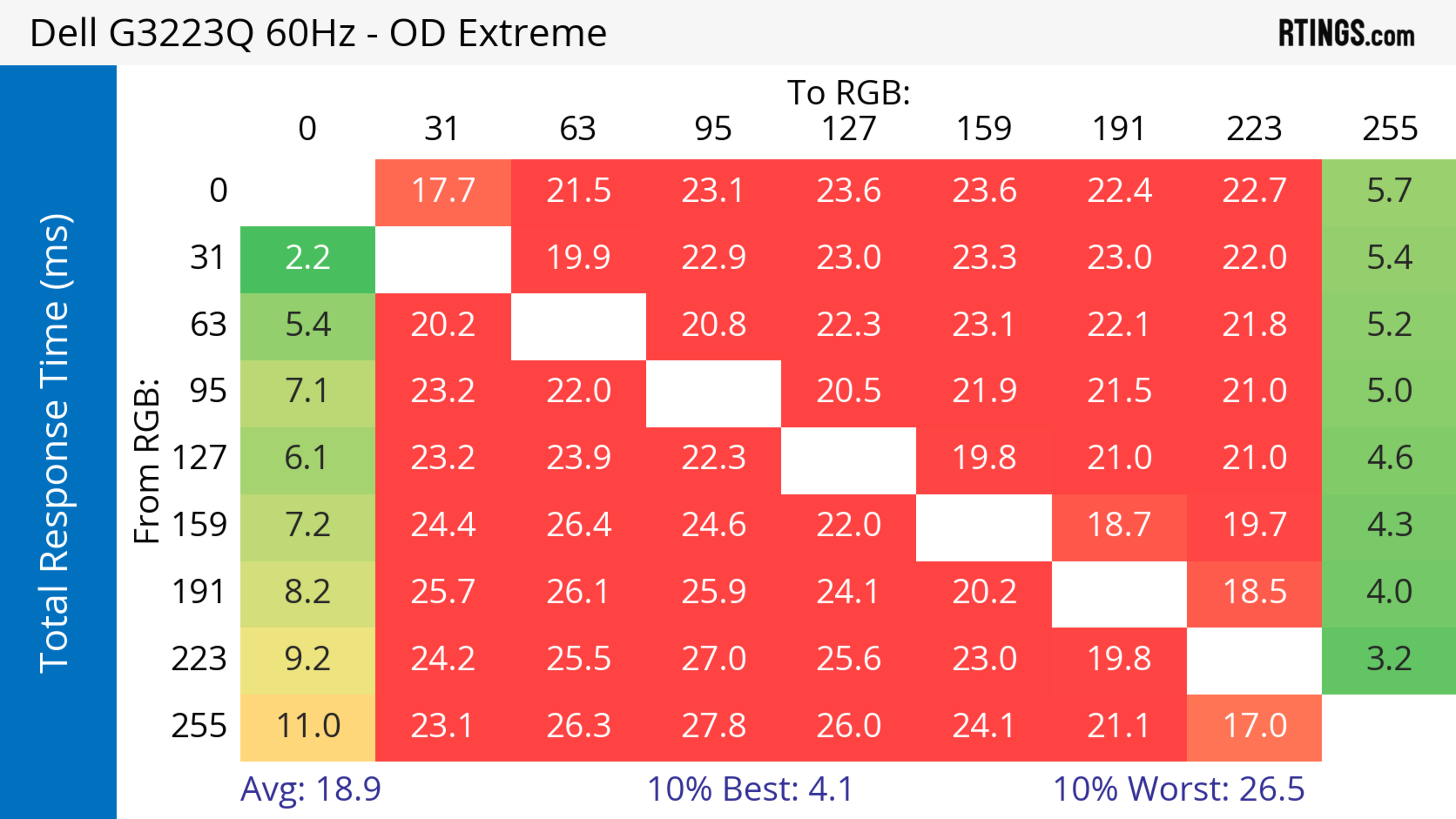 The Dell G3223Q has low input lag for a responsive gaming experience with high-frame rate games. Sadly, it increases a lot more with 60Hz games, and while it's still fine enough for casual console gamers, it's still worse than other monitors at 60Hz.