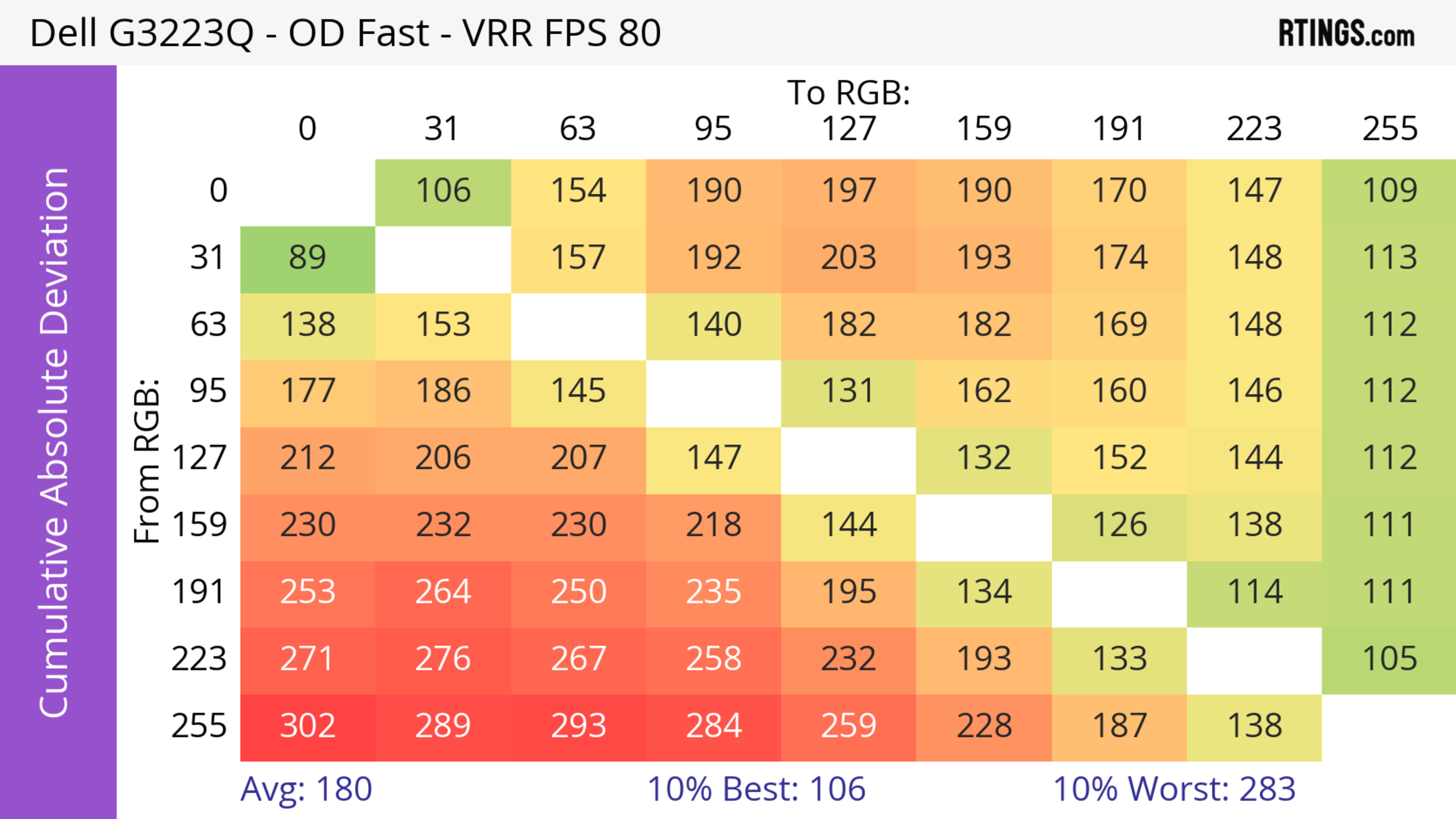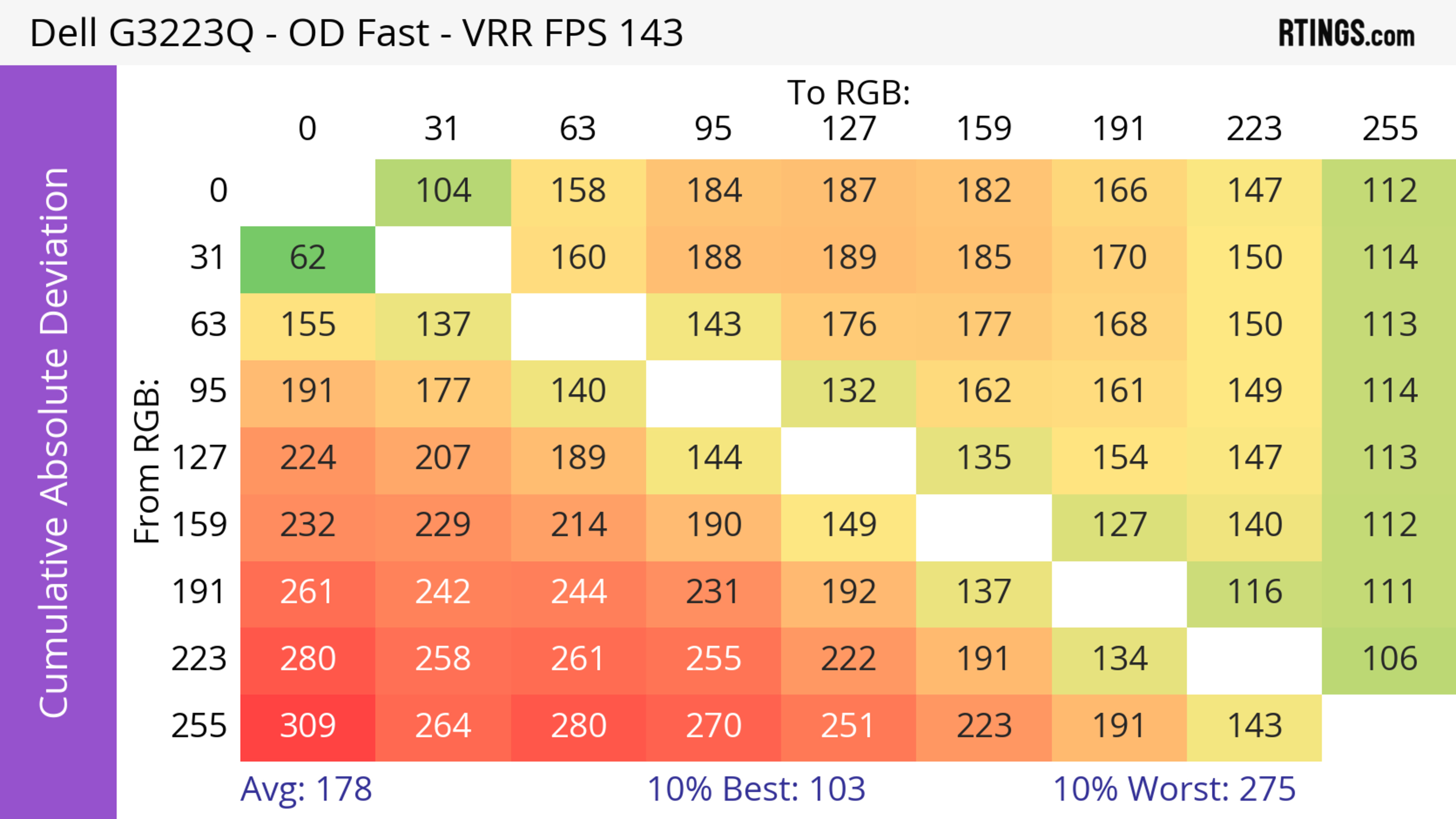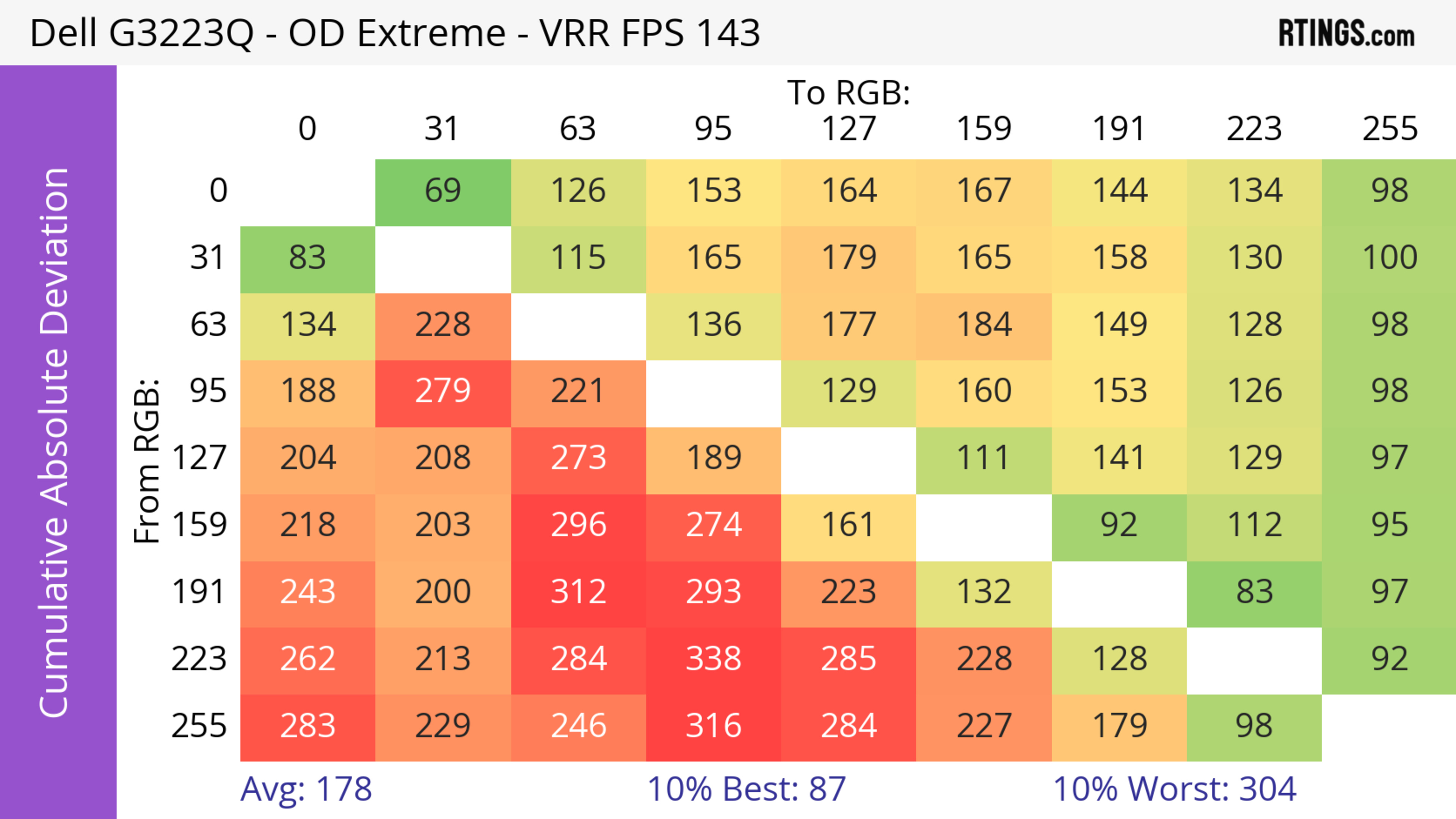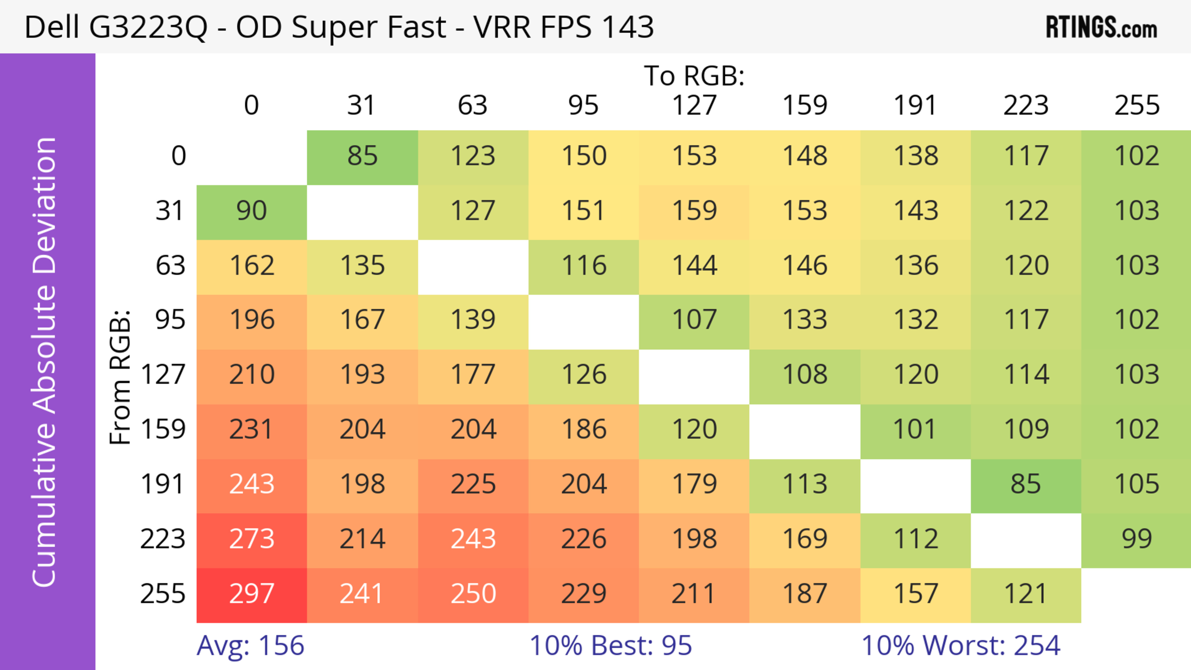The Dell G3223Q has good motion handling across its refresh rate range with VRR enabled. Although the 'Super Fast' Response Time setting has the lowest CAD at the max refresh rate, the 'Fast' setting is consistently the best across the entire range. That said, there's more inverse ghosting at lower refresh rates.