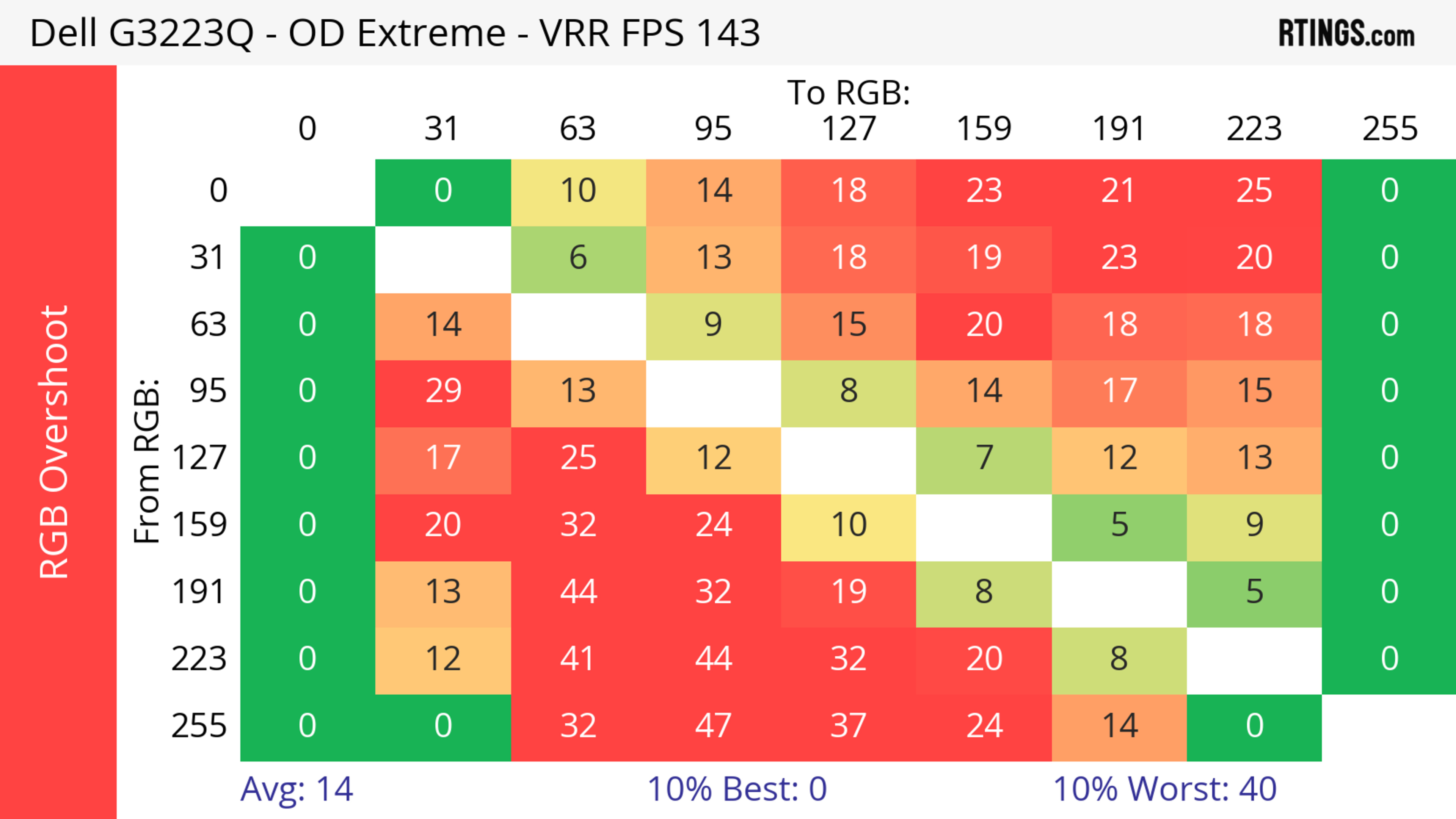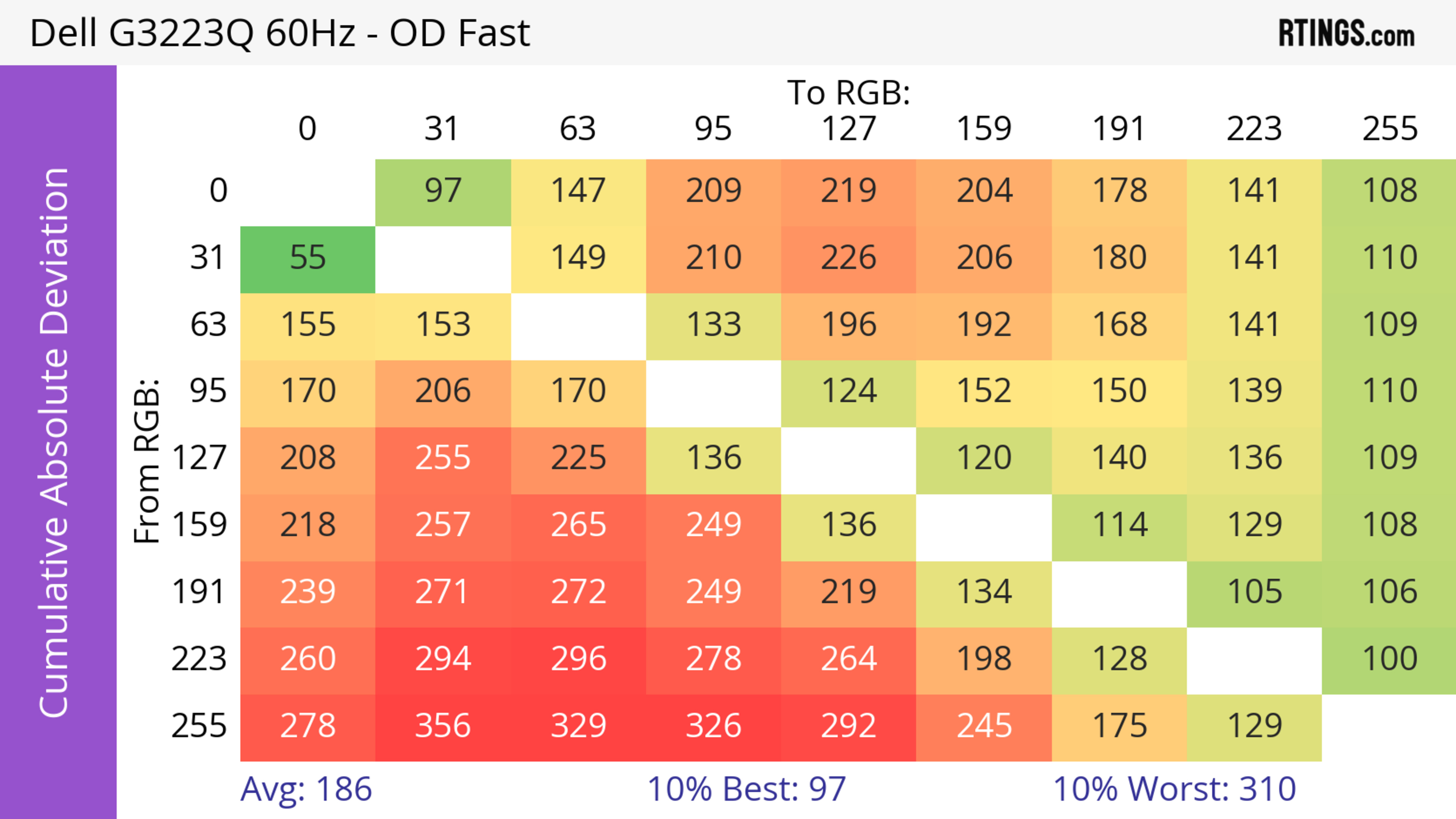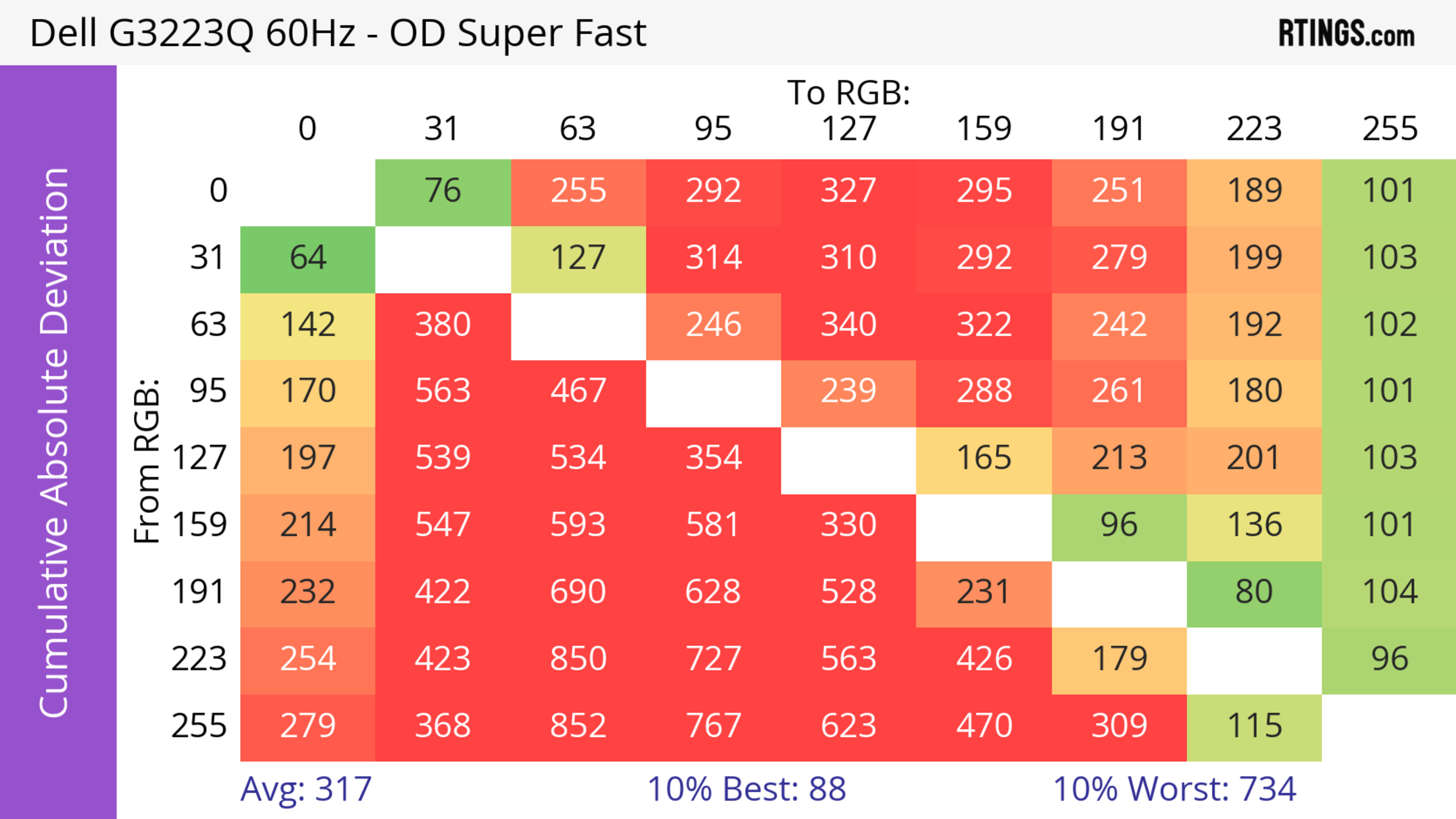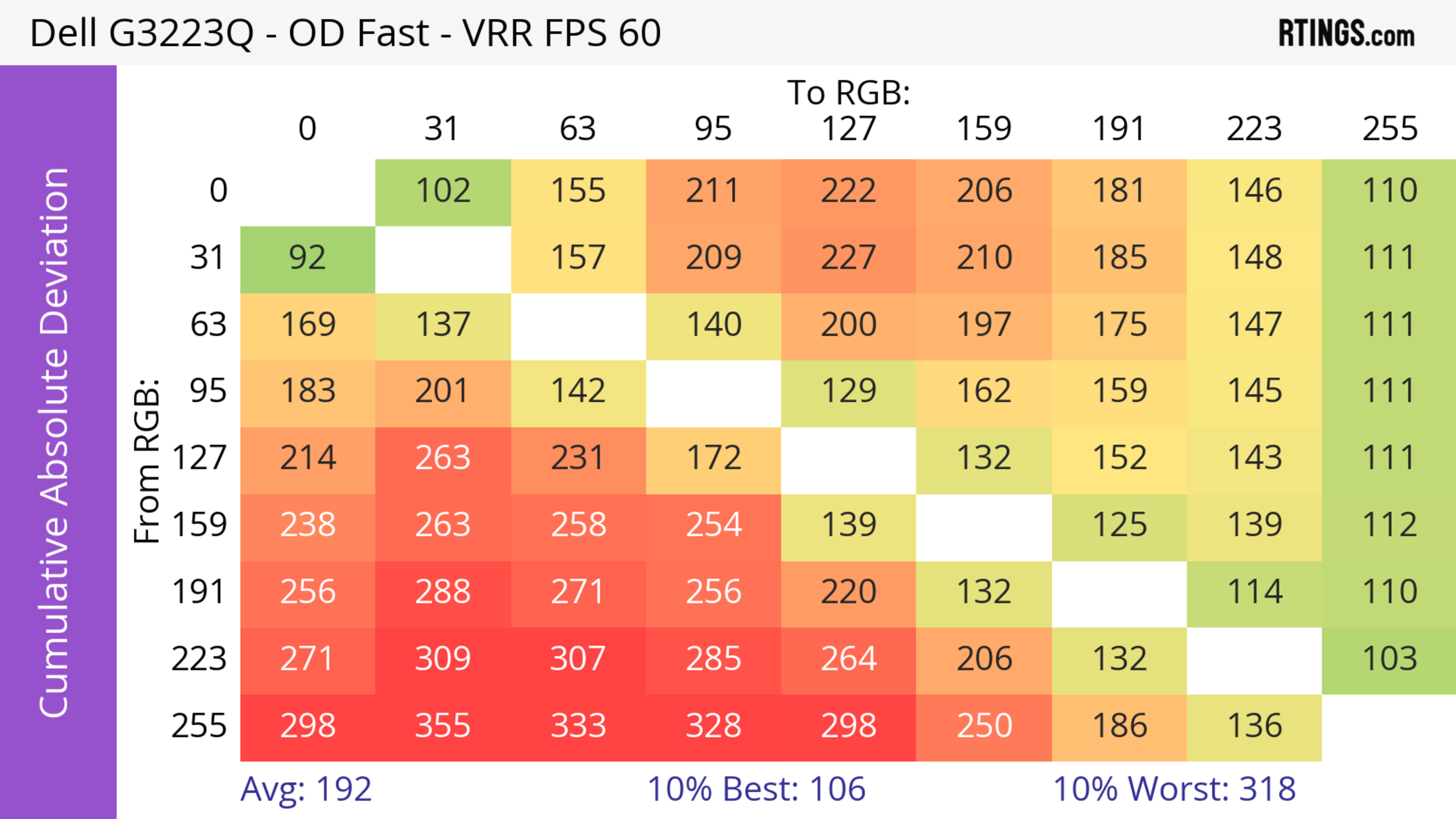The Dell G3223Q has good motion handling across its refresh rate range with VRR enabled. Although the 'Super Fast' Response Time setting has the lowest CAD at the max refresh rate, the 'Fast' setting is consistently the best across the entire range. That said, there's more inverse ghosting at lower refresh rates.
