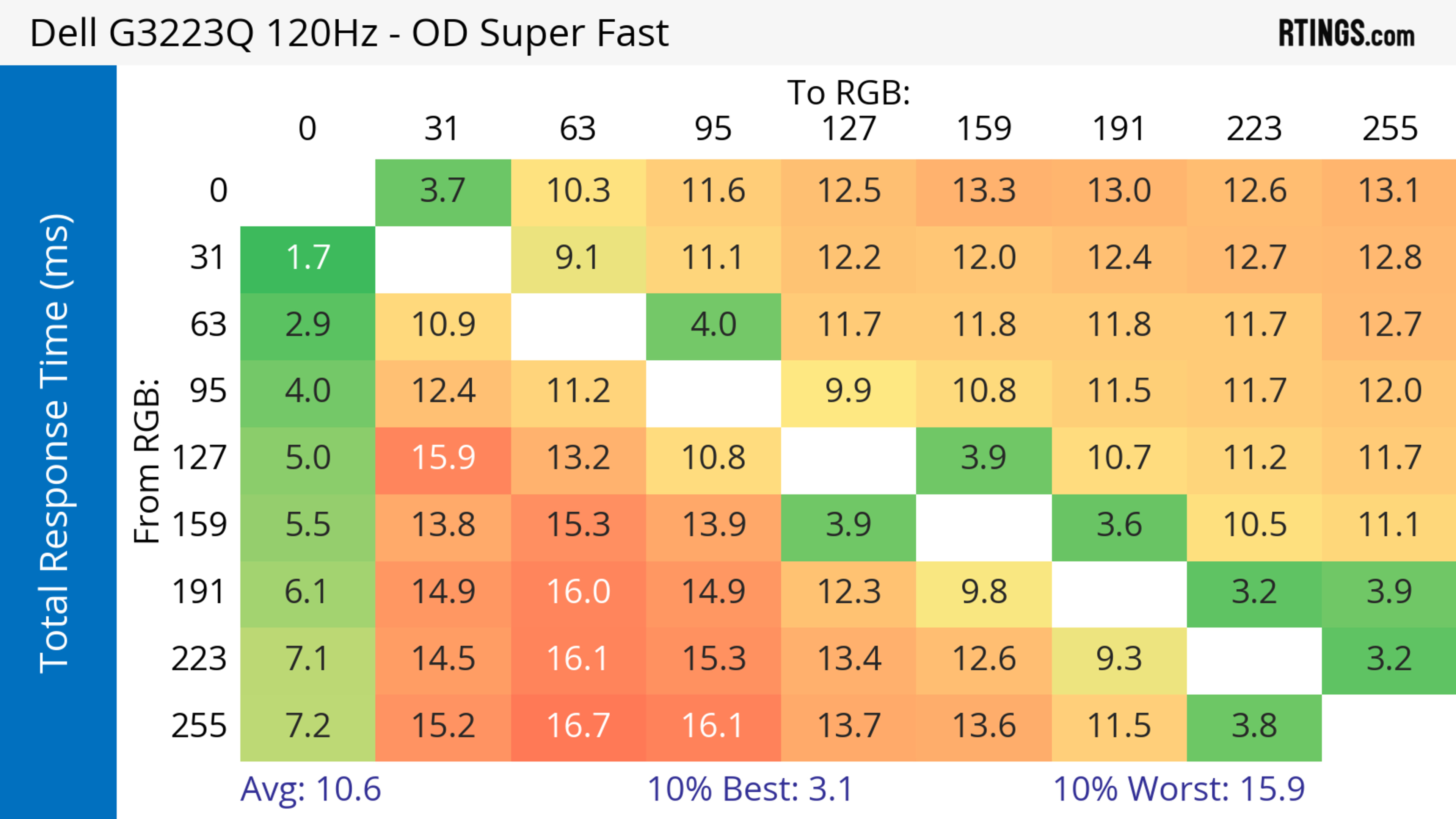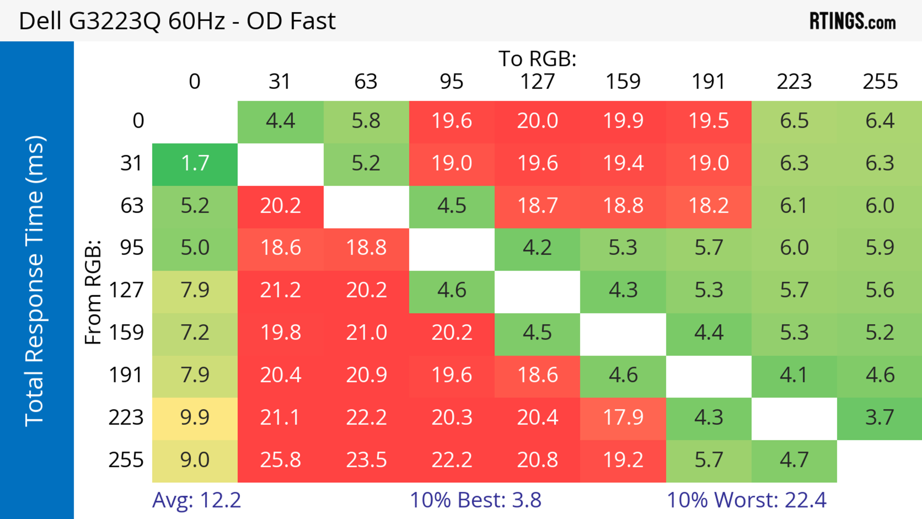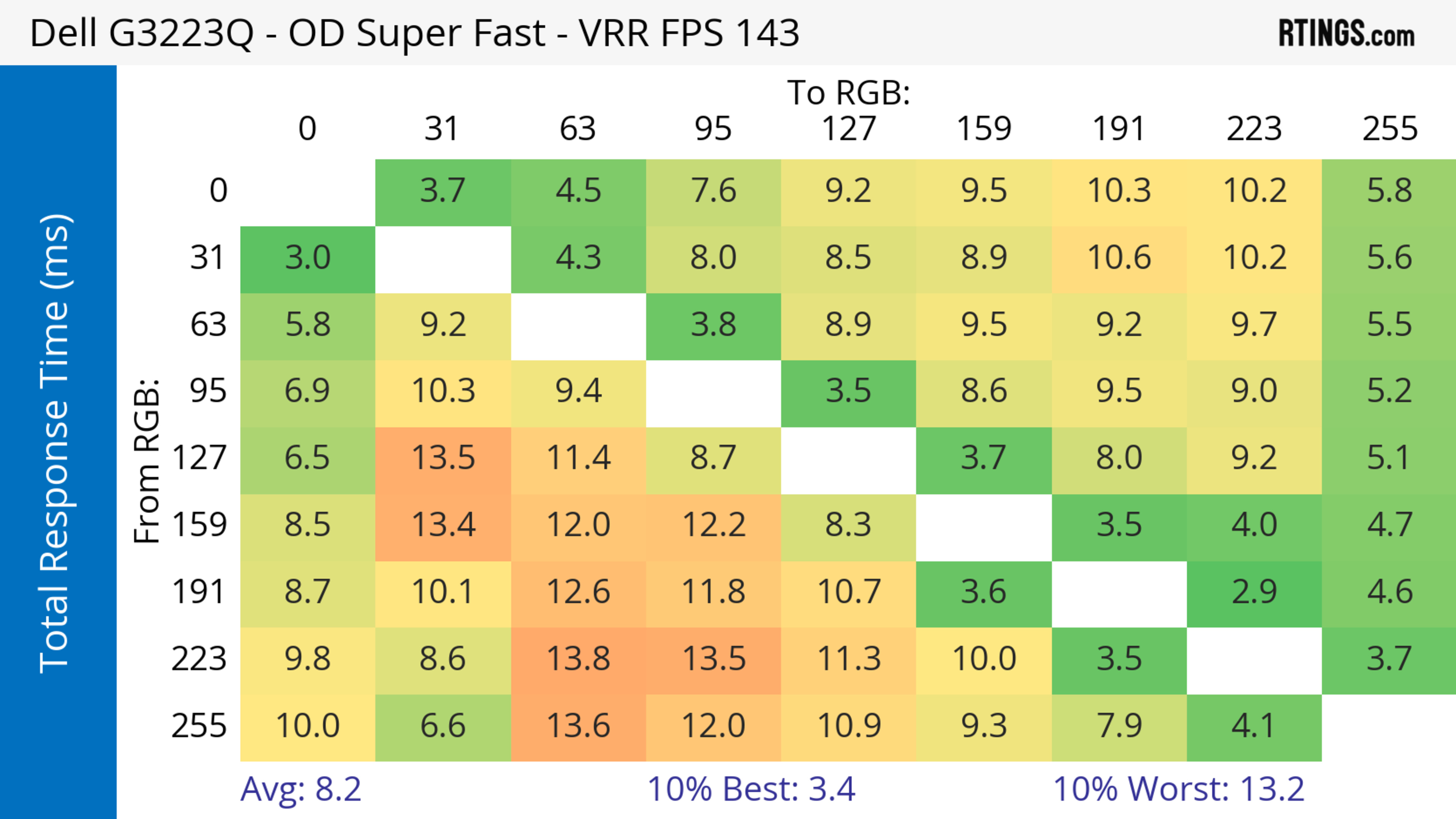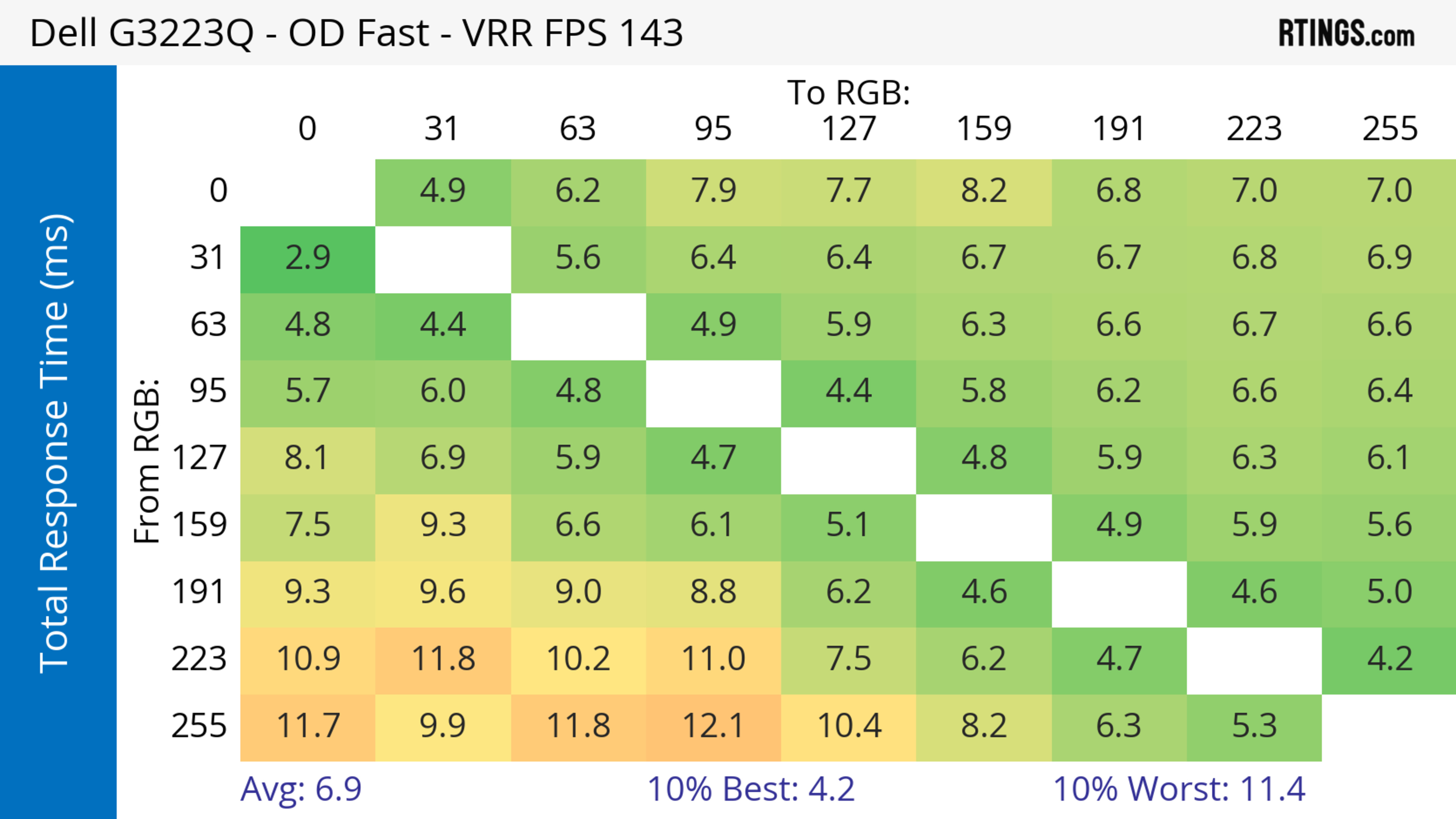The Dell G3223Q has a decent overall response time. It maintains a quick response time across its VRR range, but it isn't fast enough to keep up with fast refresh rates, and there's some motion blur.