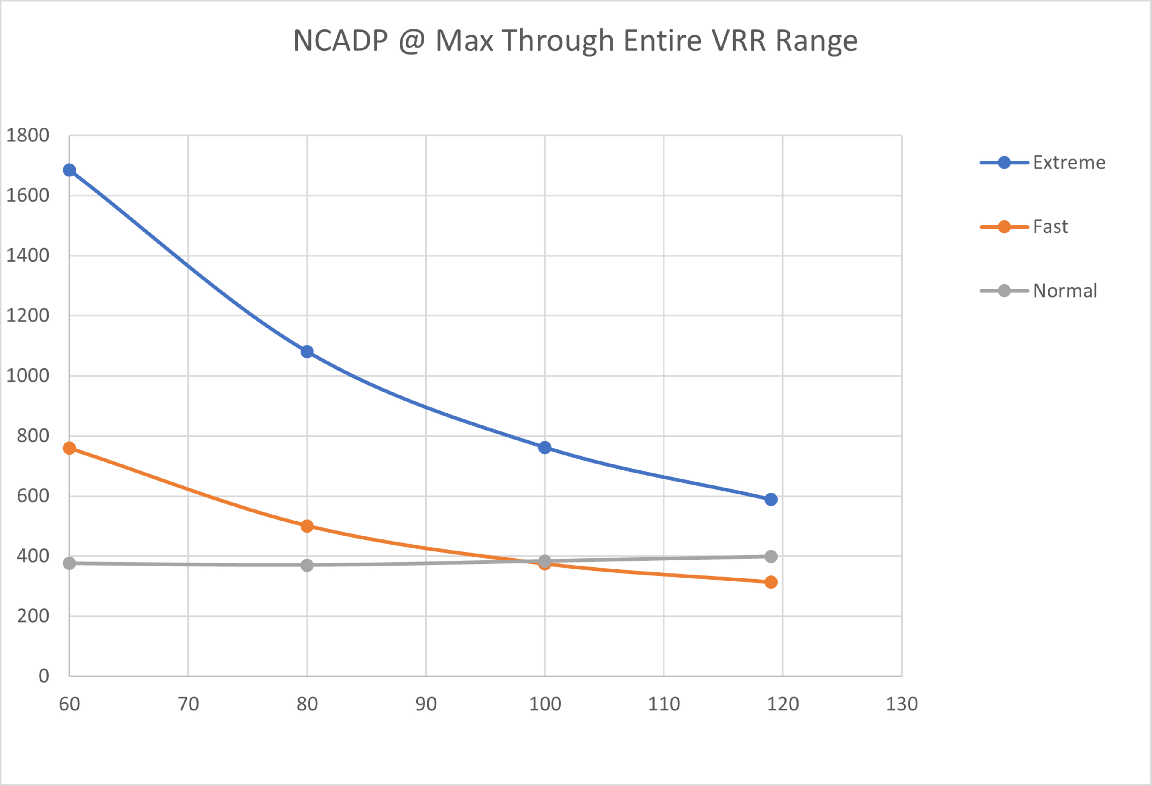 The CAD at 120Hz is poor. Motion is blurry with any of the Response Time settings. Using VRR doesn't impact the motion handling of the 'Fast' and 'Extreme' overdrive settings, which have significant inverse ghosting, but disabling VRR with 'Normal' results in better motion than with it on. That said, even with VRR off, the response time is still slow.