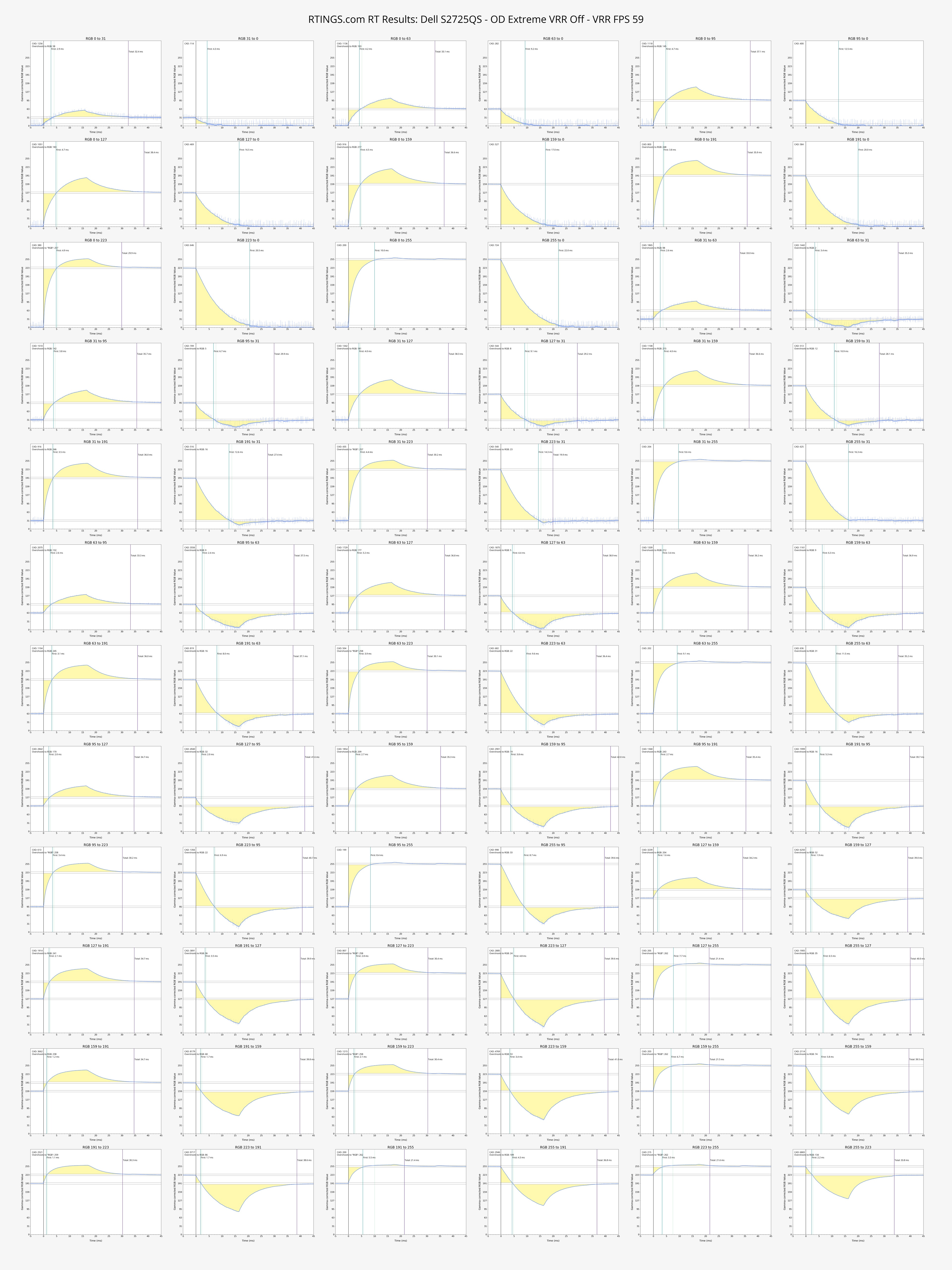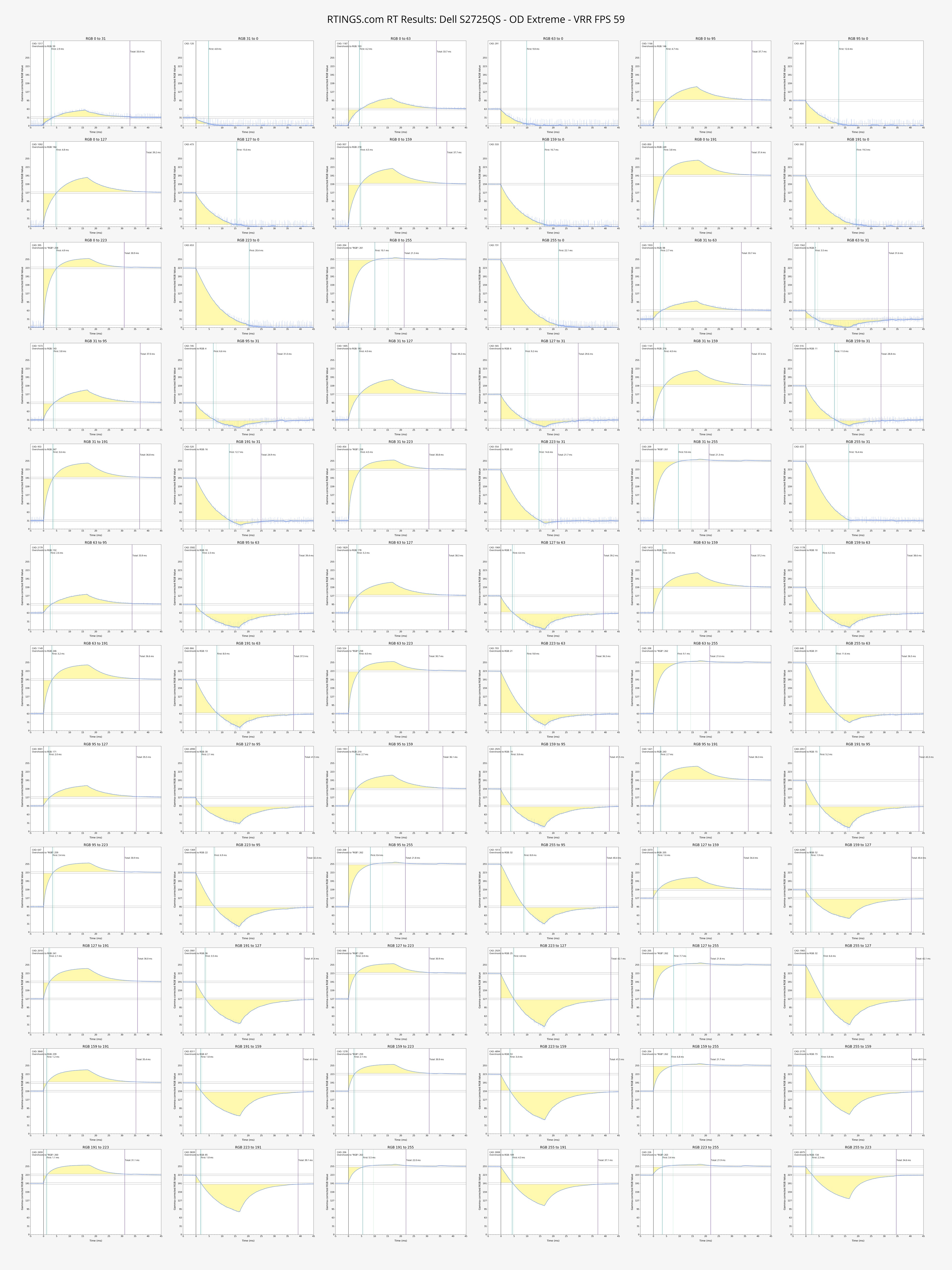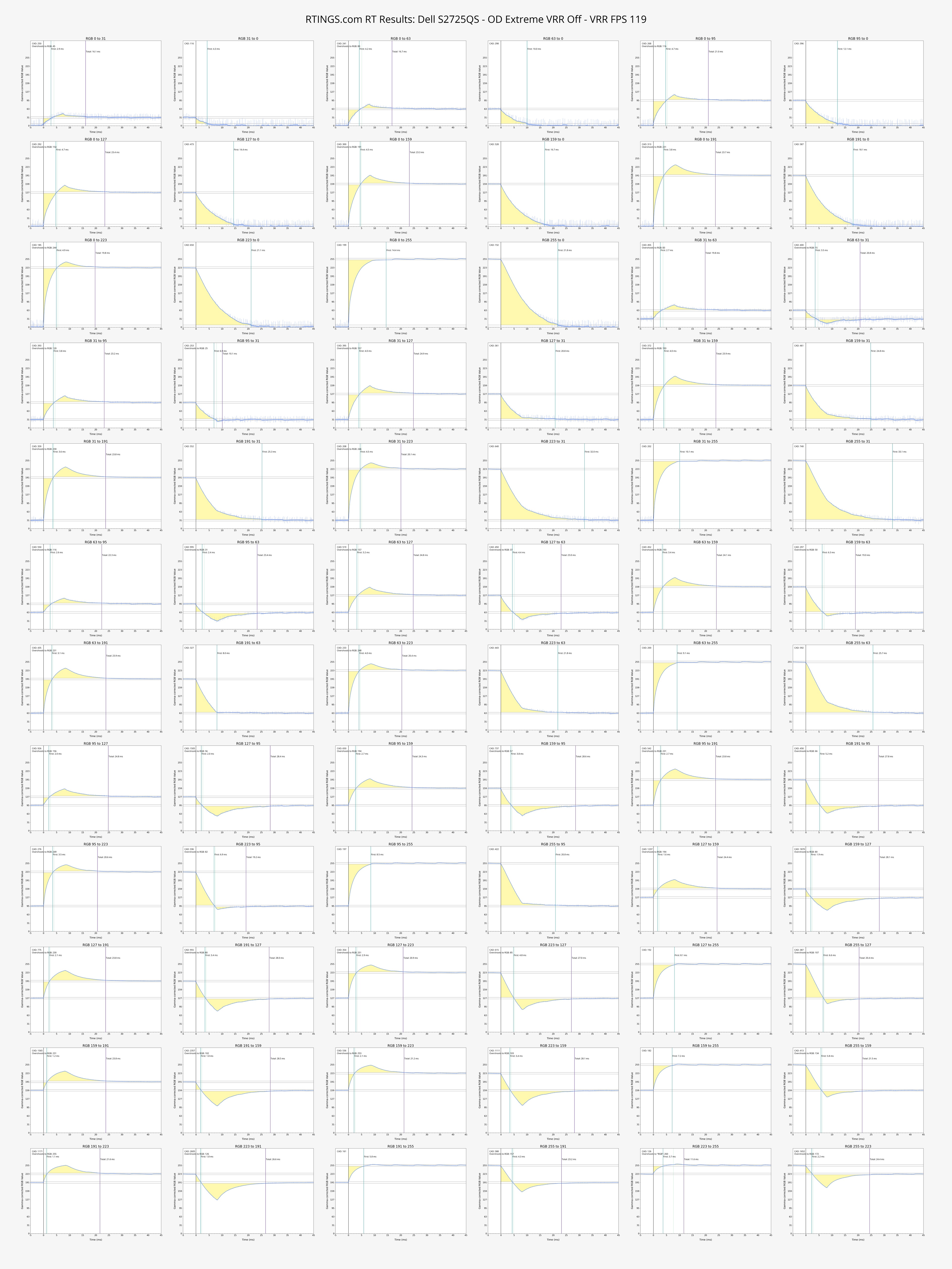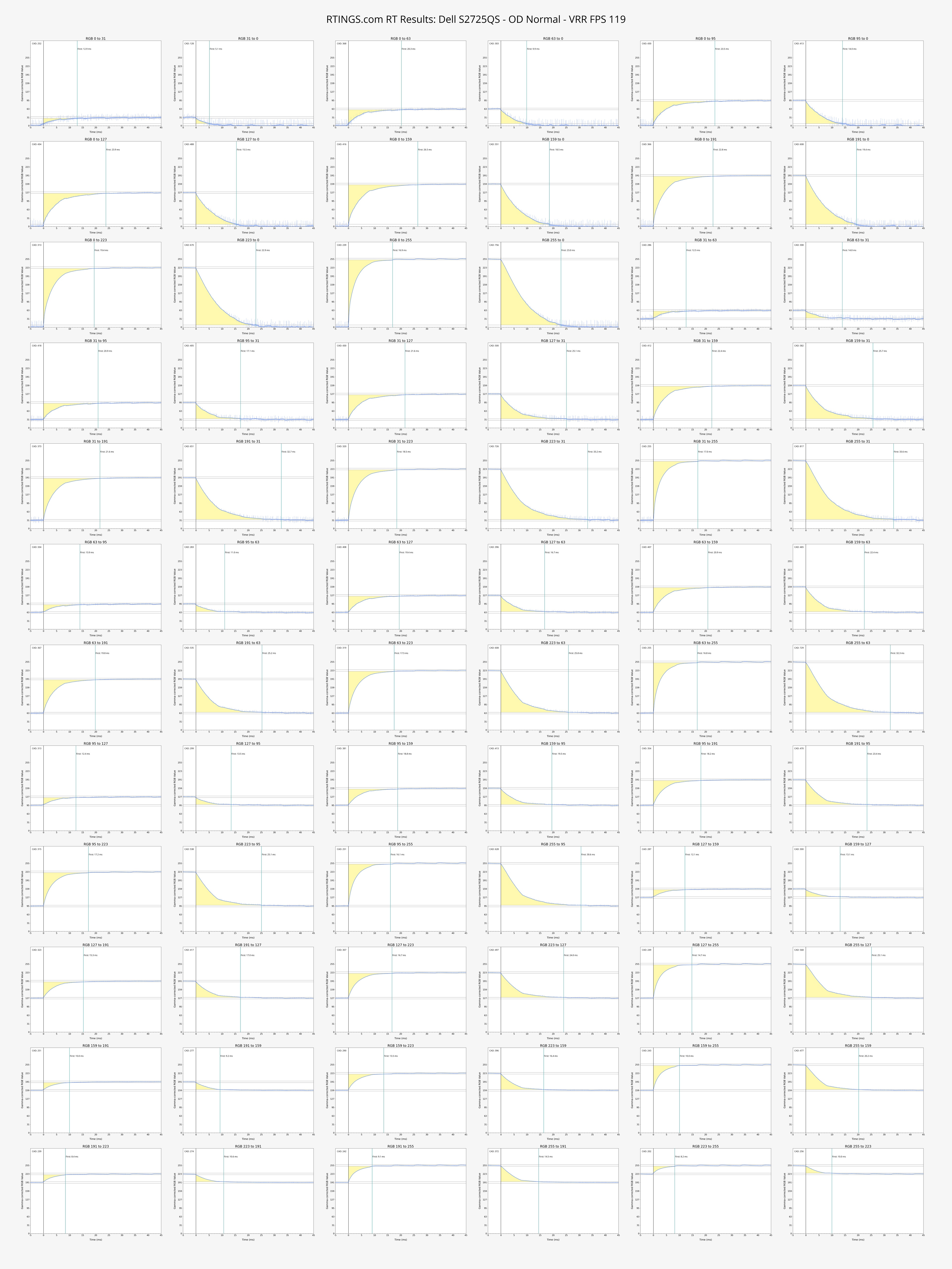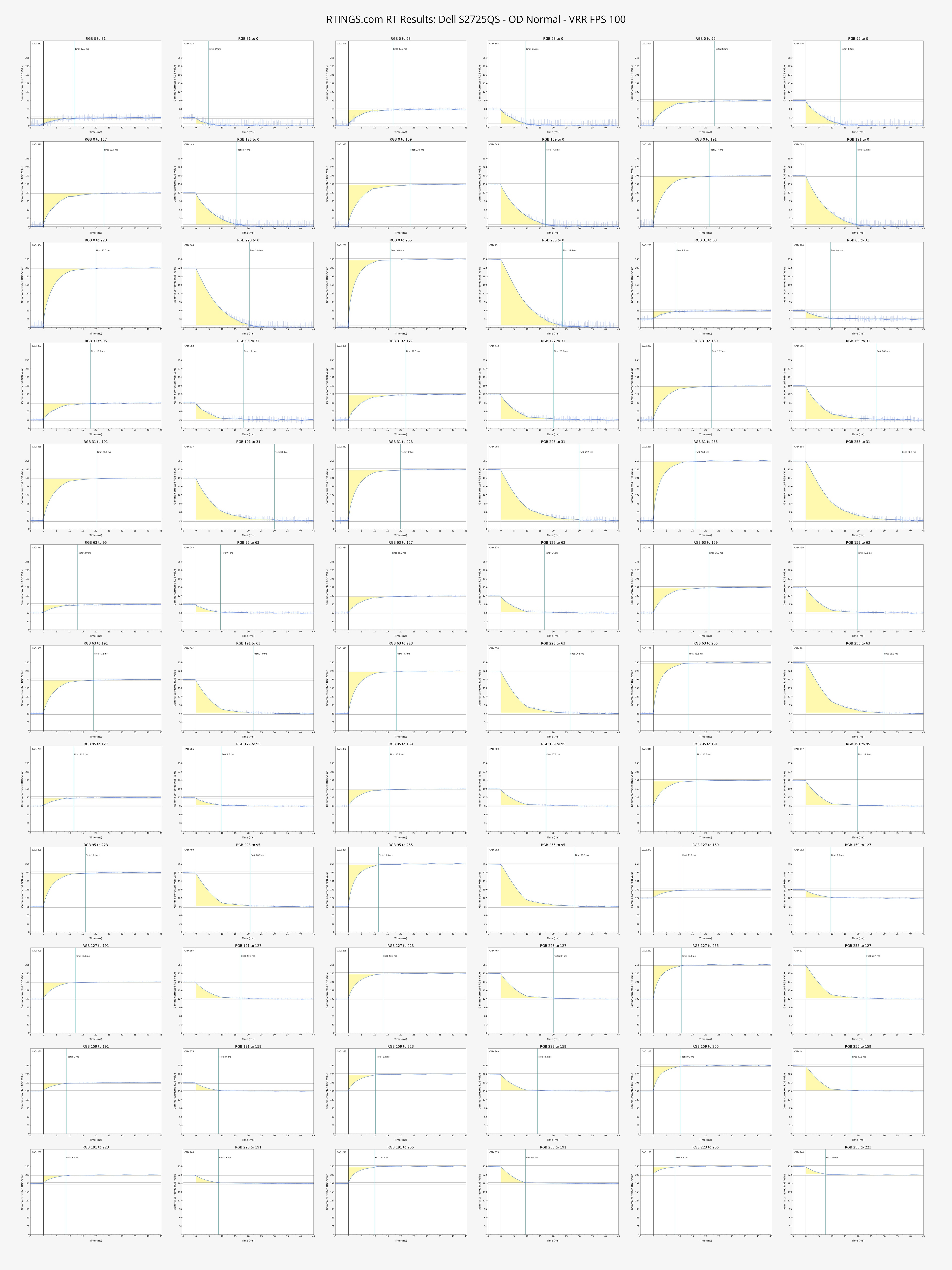 The Dell S2725QS has poor motion handling across its VRR range. There's noticeable and distracting blur with fast-moving objects at any refresh rate. Although the 'Normal' Response Time setting is the most consistent, it still performs poorly, and the other overdrive settings are worse. The 'Fast' and 'Extreme' settings have such high CAD that they pass the limits of the chart, which you can see in an alternative graph.