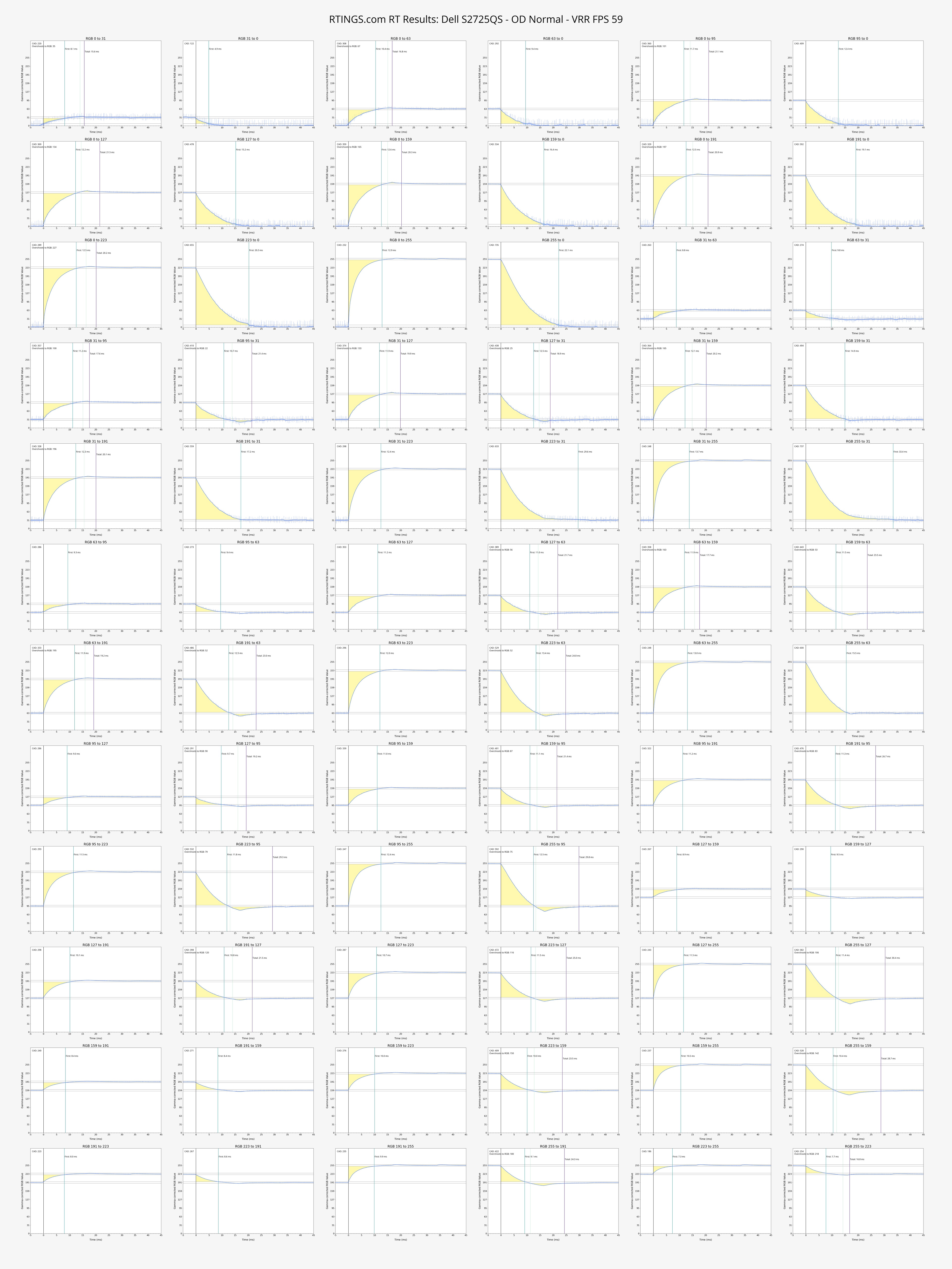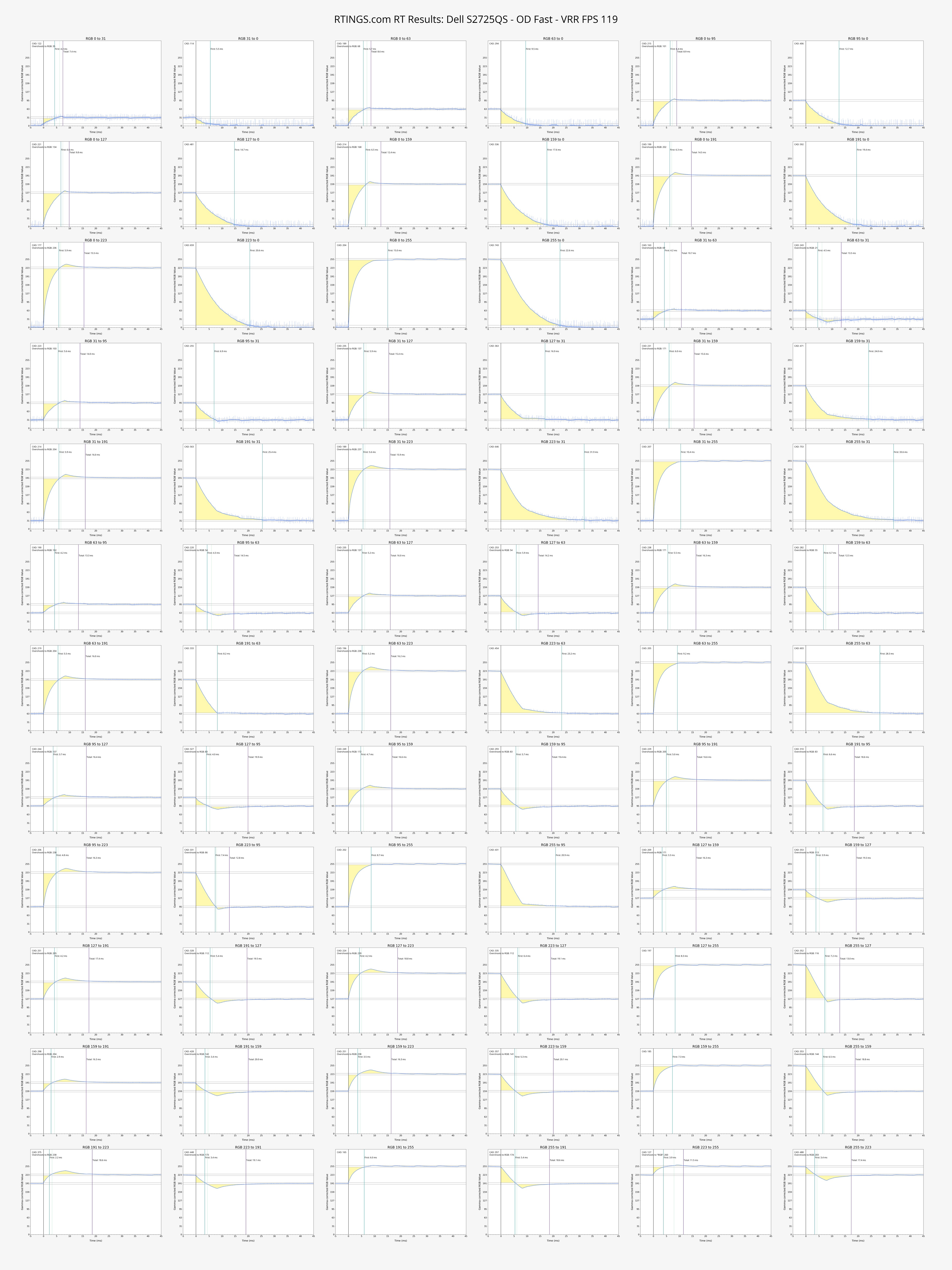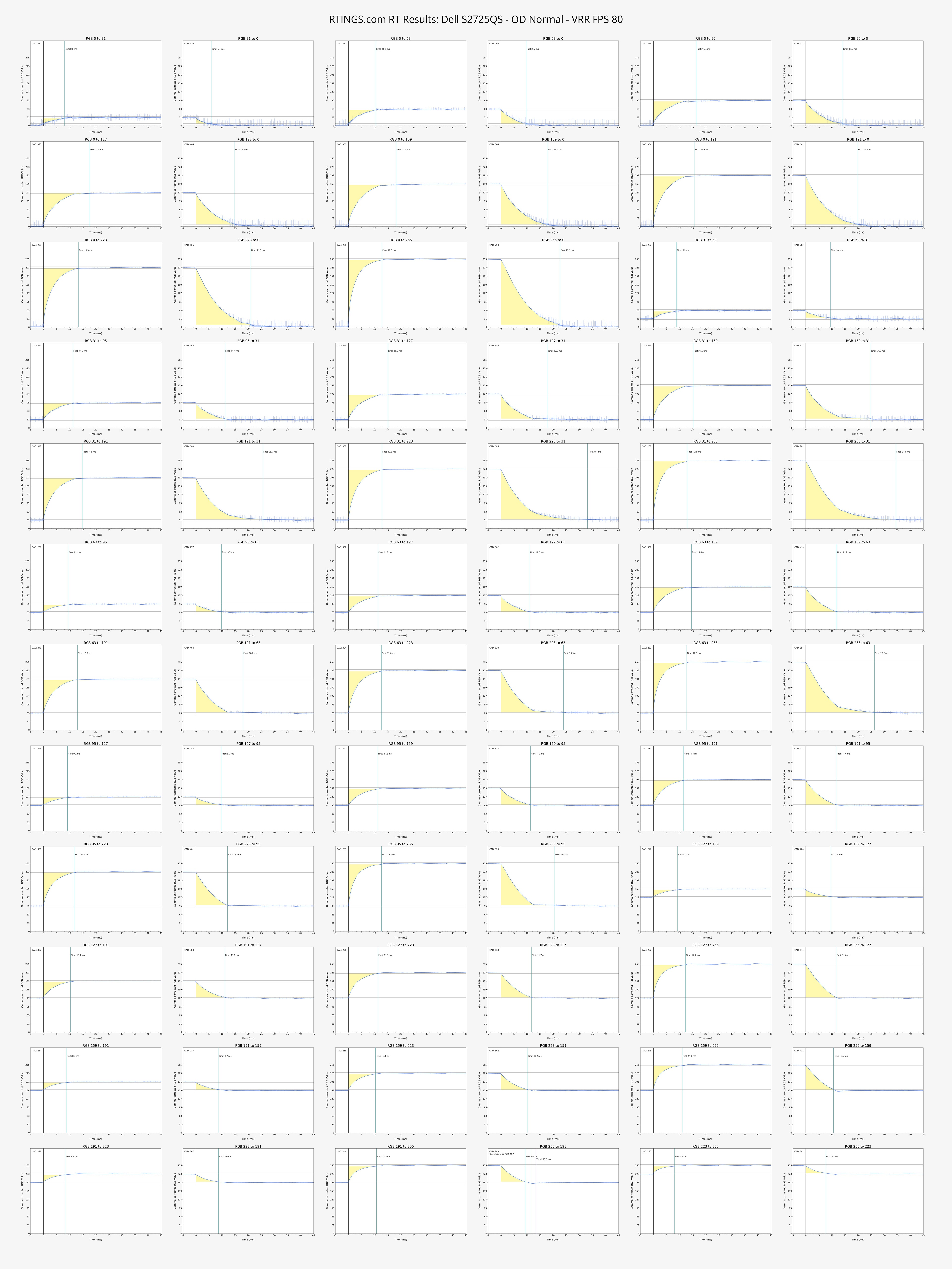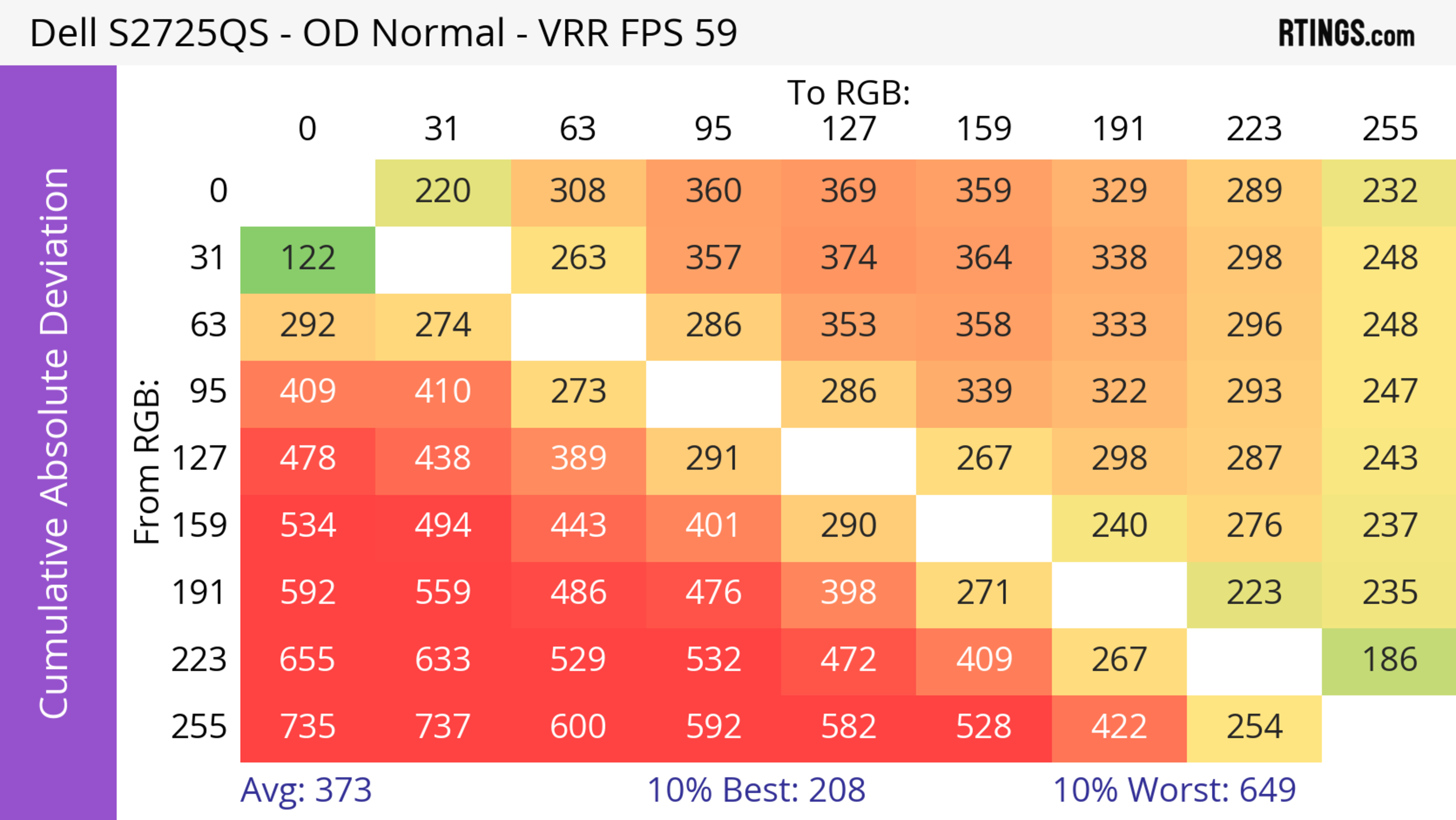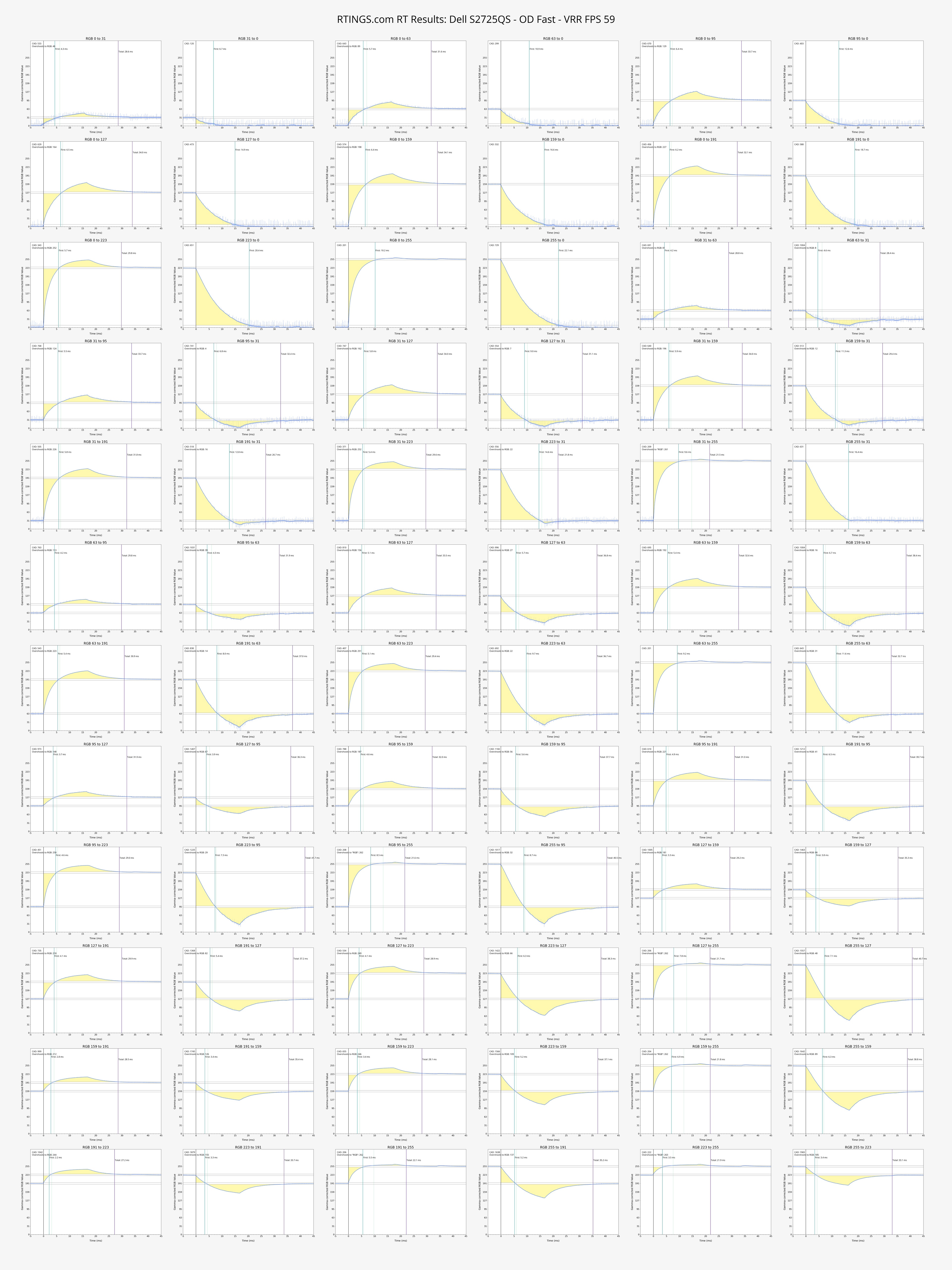The Dell S2725QS has poor motion handling across its VRR range. There's noticeable and distracting blur with fast-moving objects at any refresh rate. Although the 'Normal' Response Time setting is the most consistent, it still performs poorly, and the other overdrive settings are worse. The 'Fast' and 'Extreme' settings have such high CAD that they pass the limits of the chart, which you can see in an alternative graph.