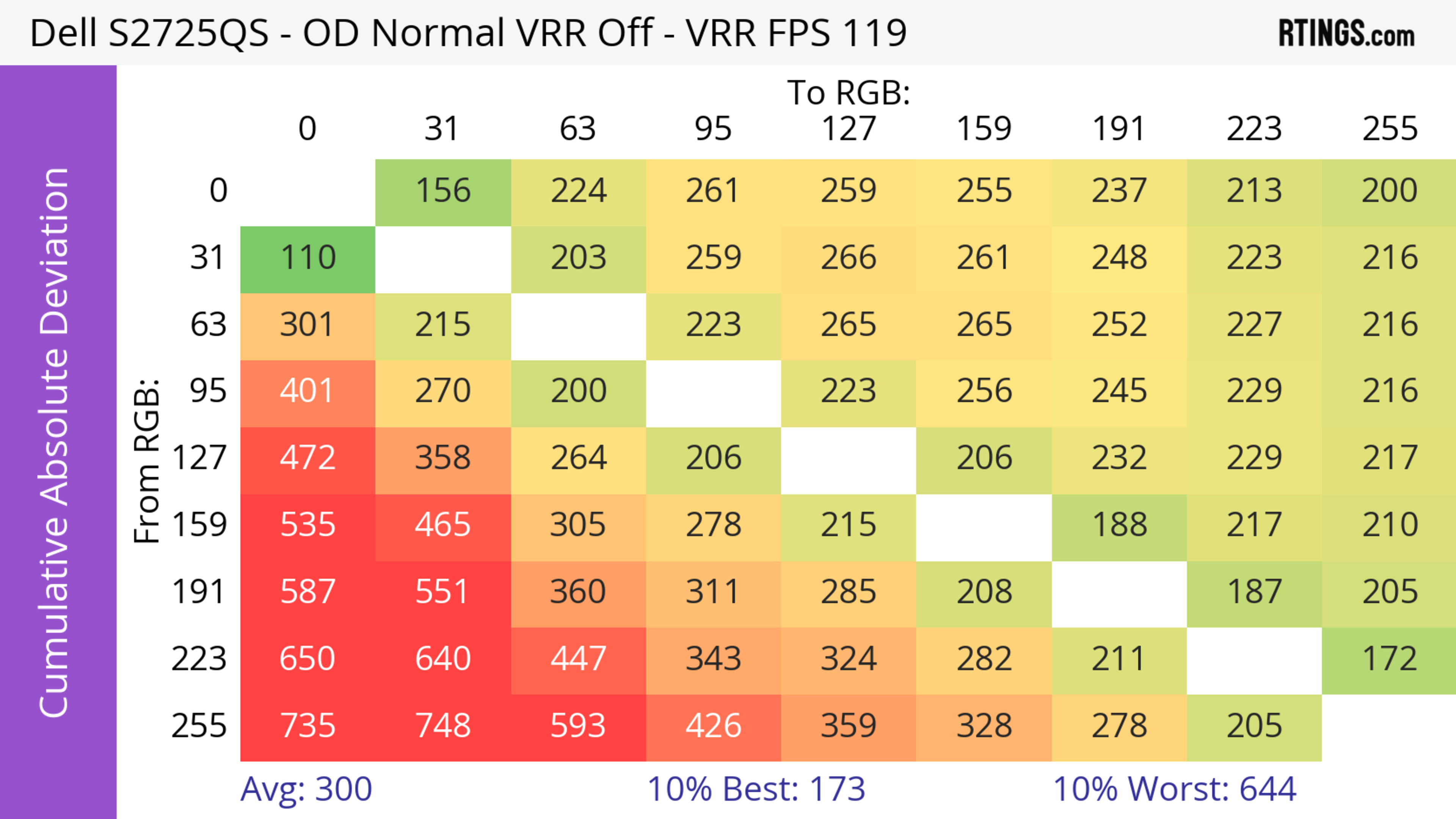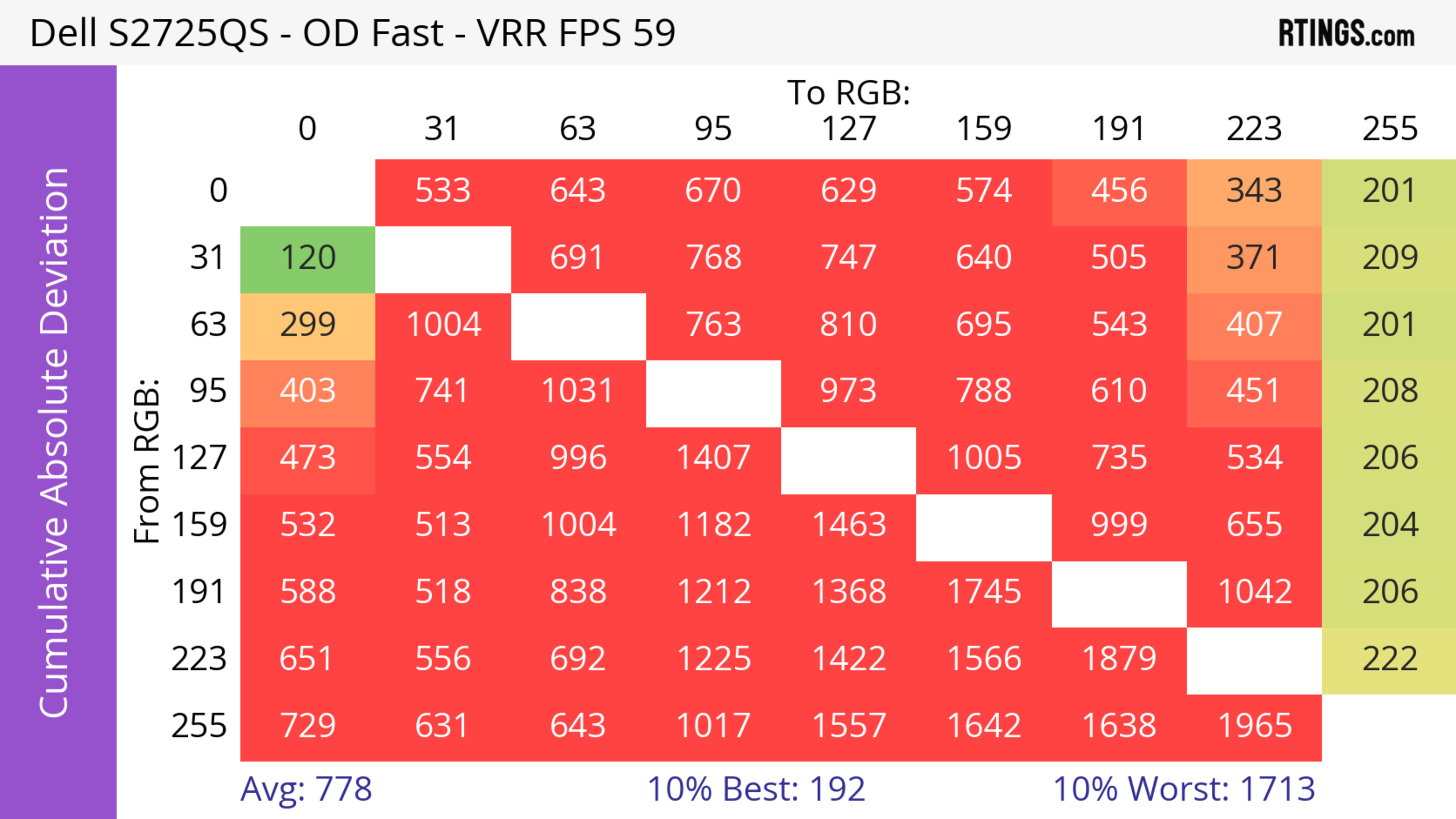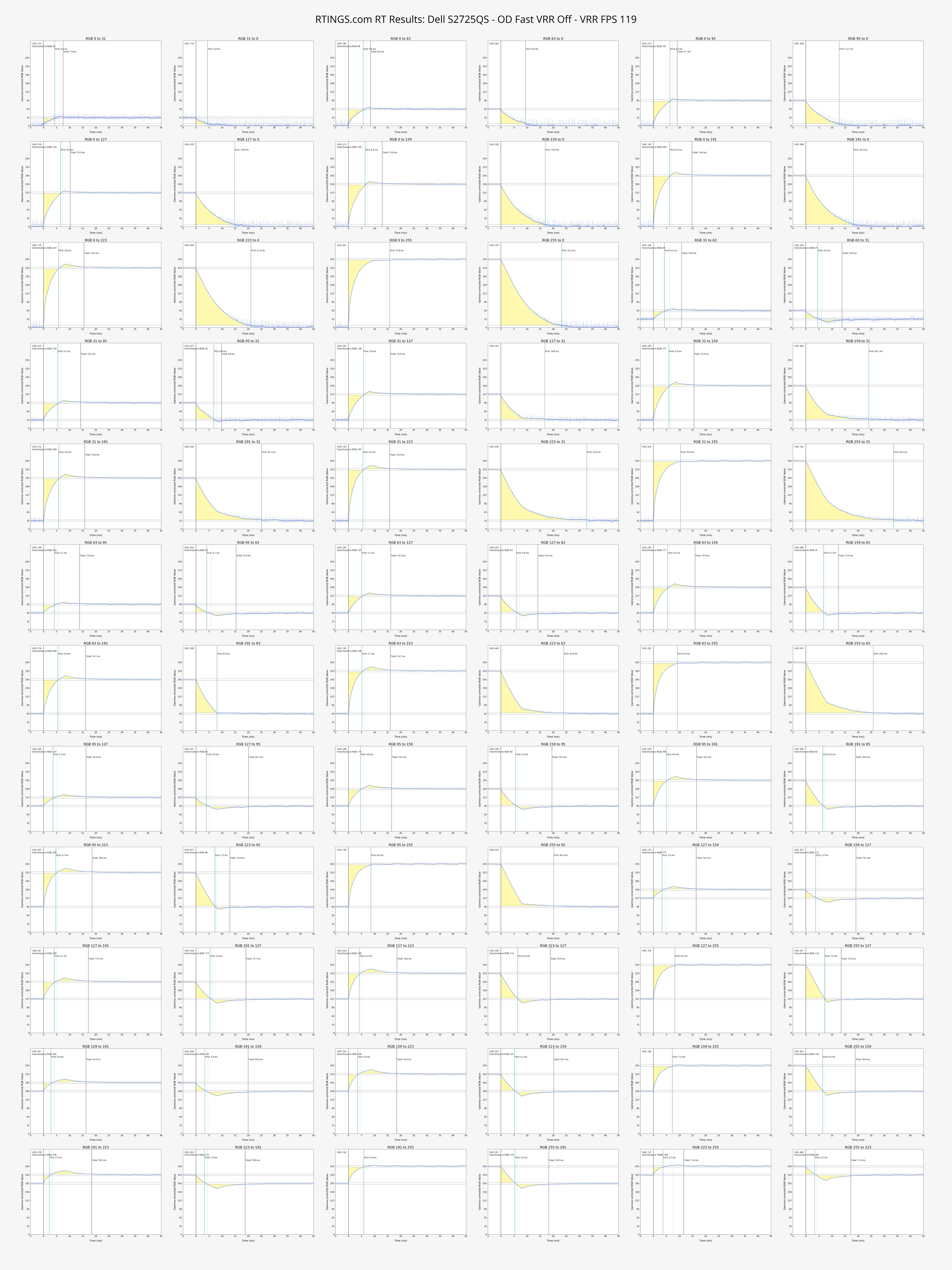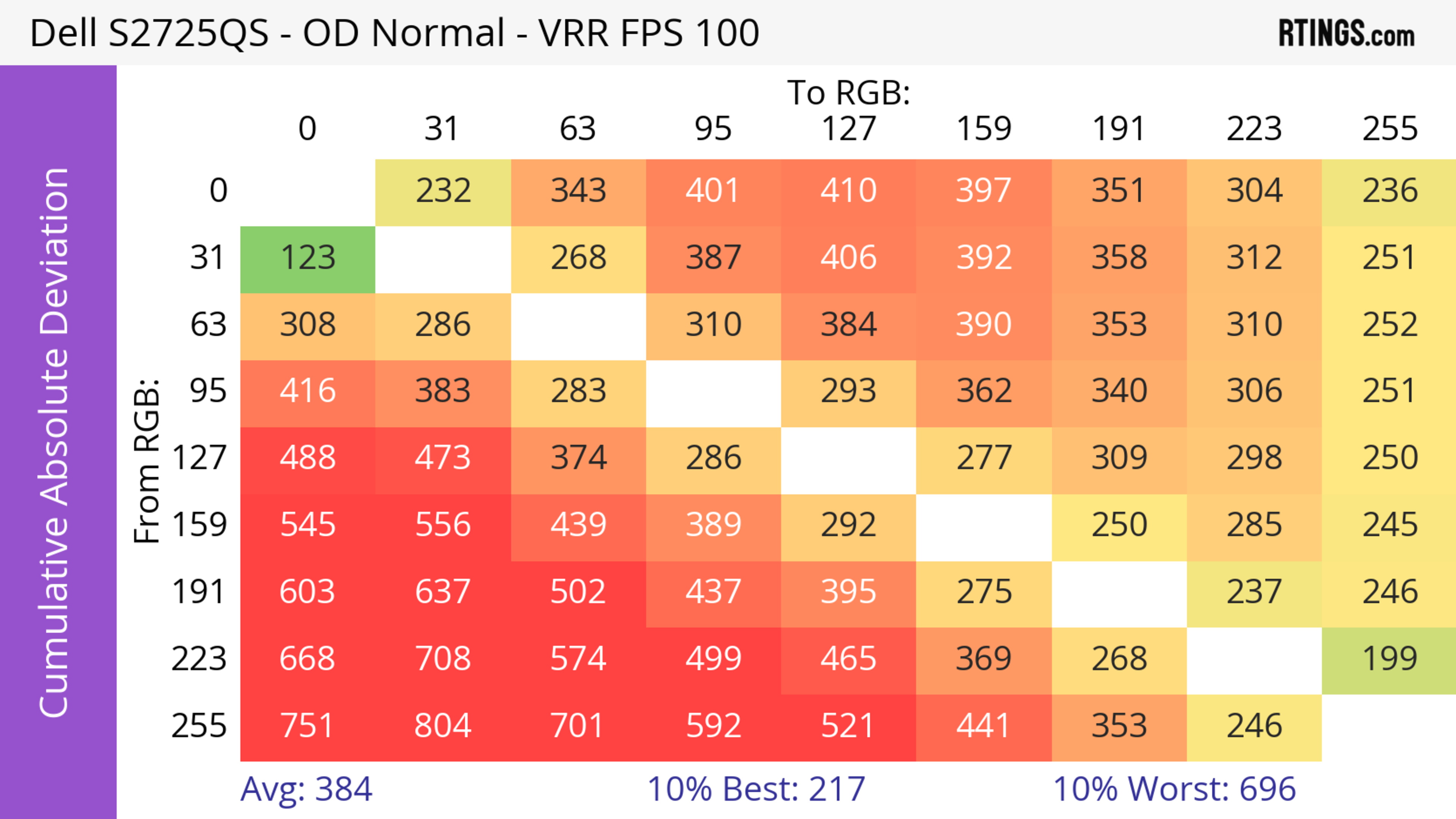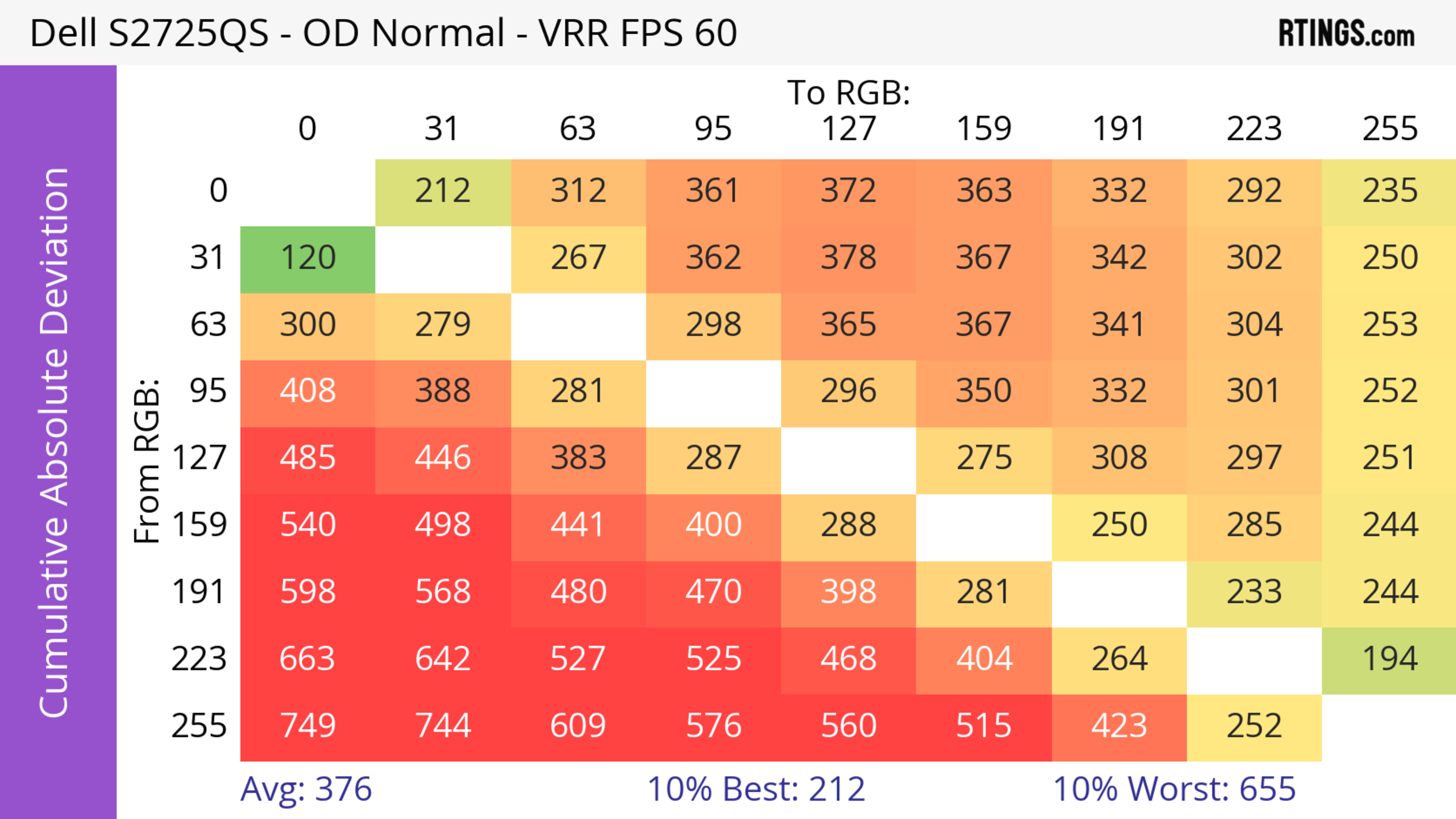 The Dell S2725QS has poor motion handling across its VRR range. There's noticeable and distracting blur with fast-moving objects at any refresh rate. Although the 'Normal' Response Time setting is the most consistent, it still performs poorly, and the other overdrive settings are worse. The 'Fast' and 'Extreme' settings have such high CAD that they pass the limits of the chart, which you can see in an alternative graph.