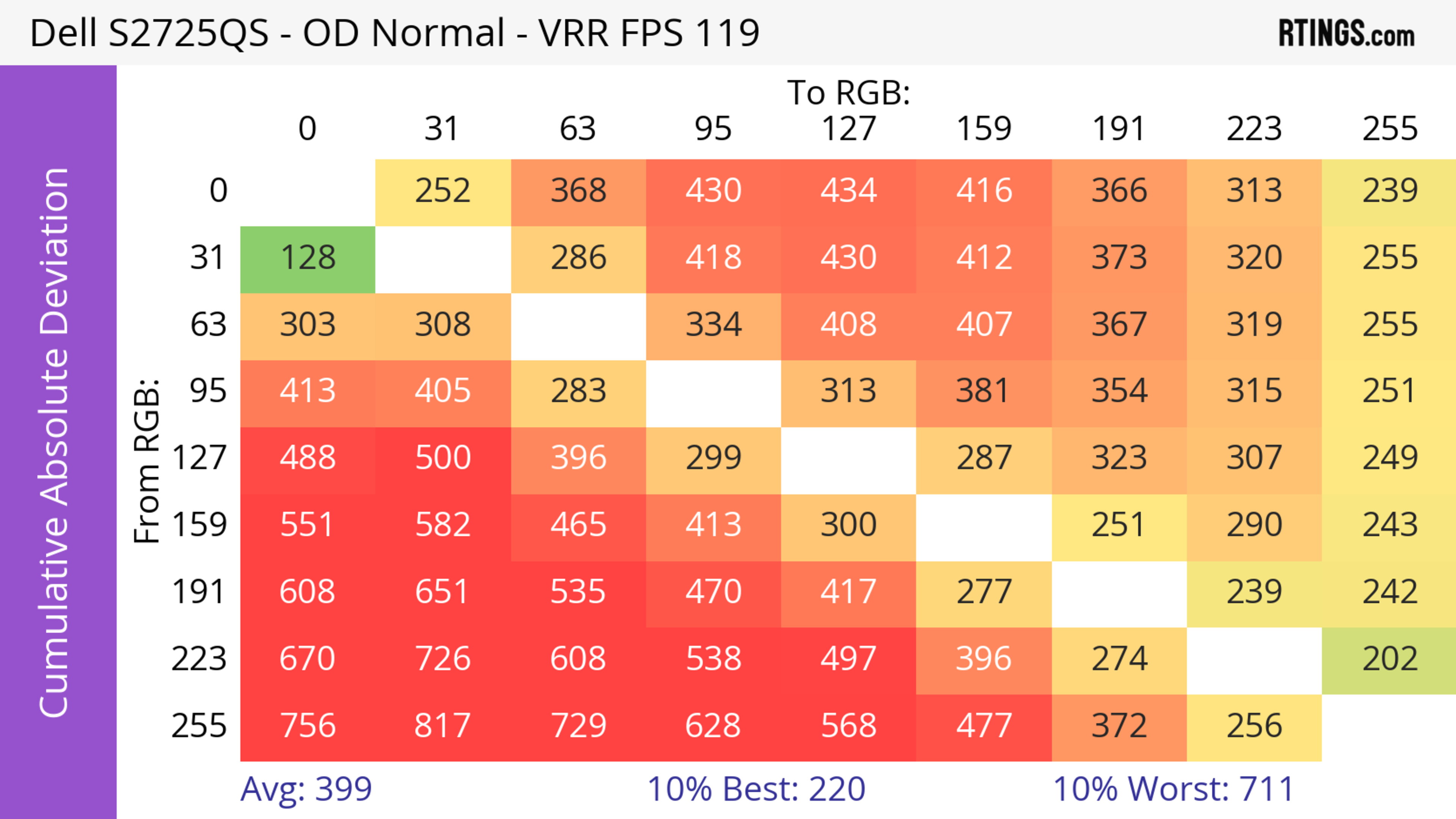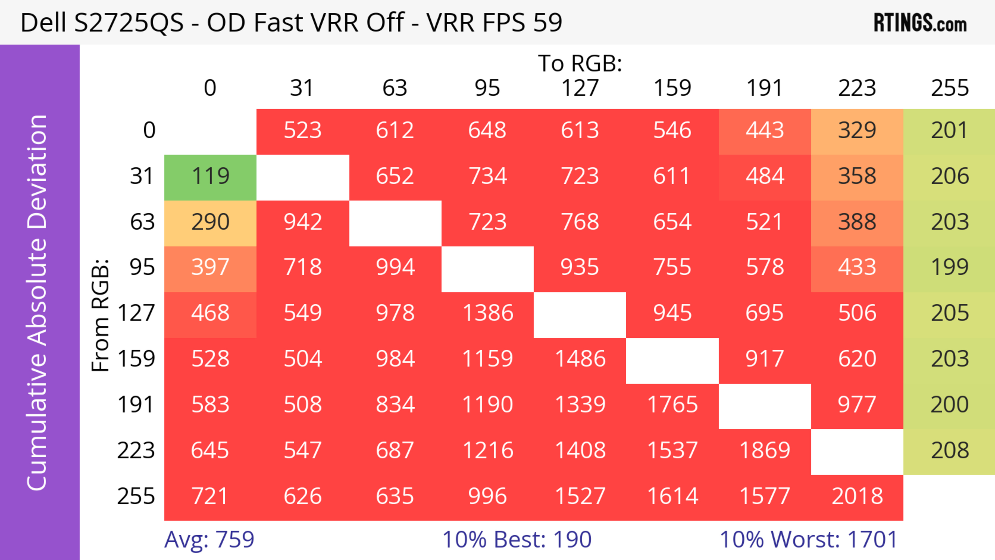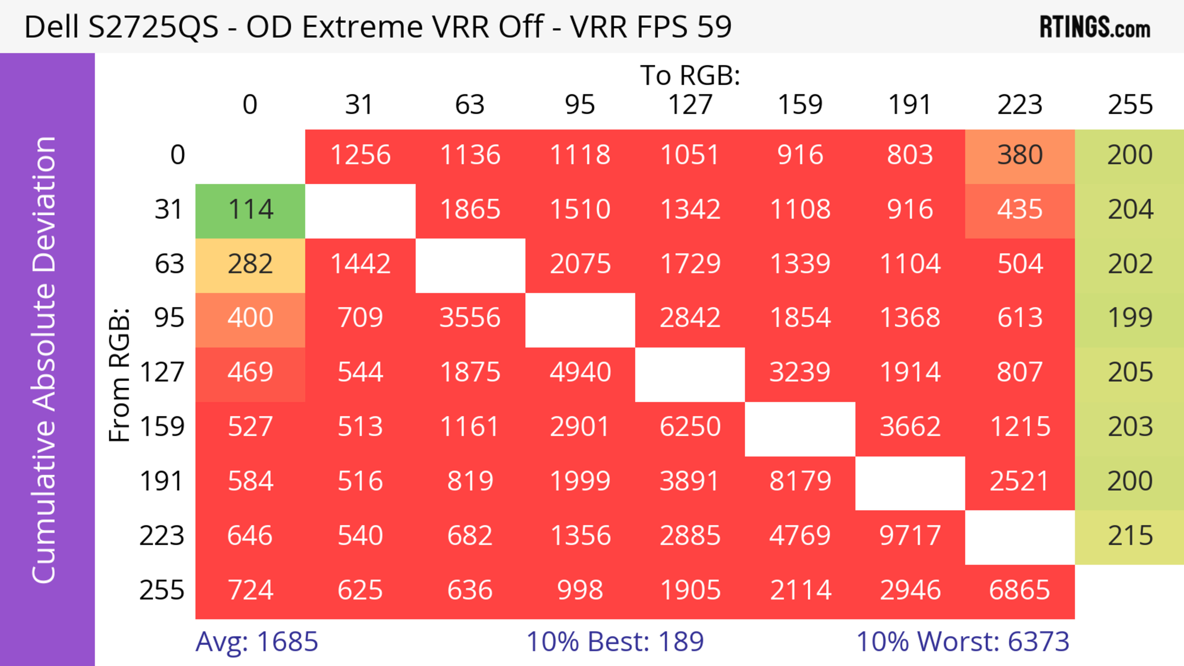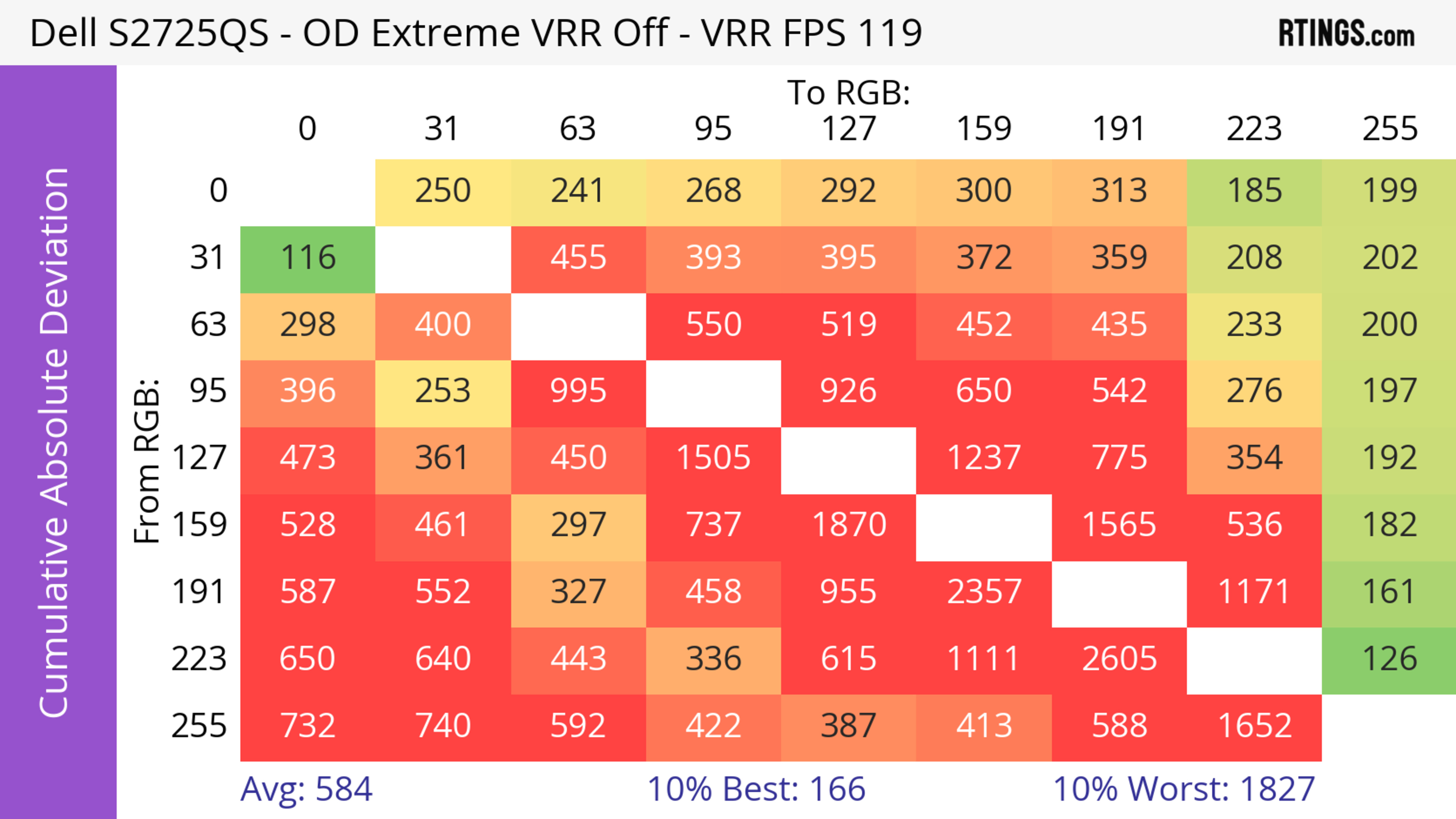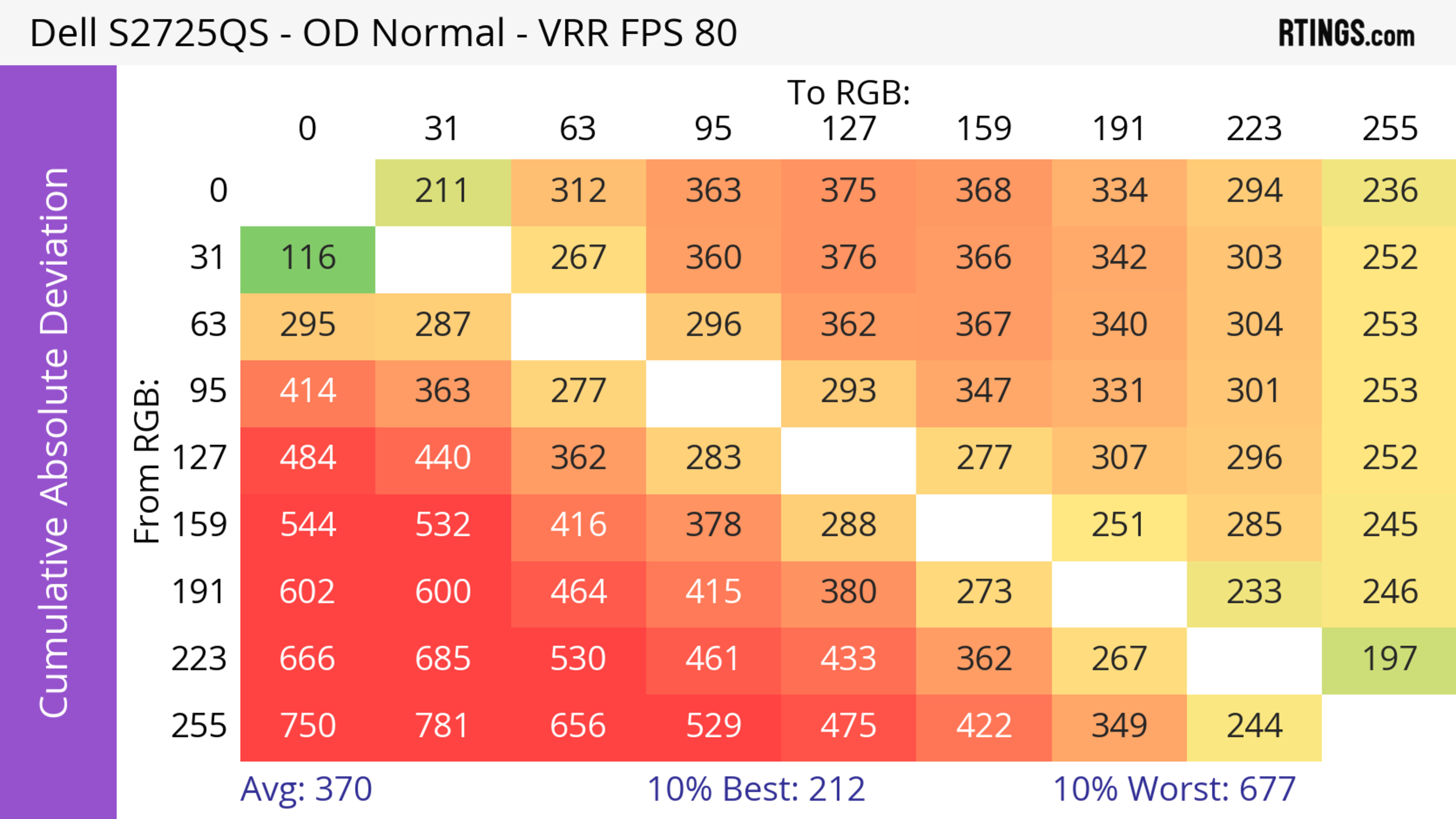 The Dell S2725QS has poor motion handling across its VRR range. There's noticeable and distracting blur with fast-moving objects at any refresh rate. Although the 'Normal' Response Time setting is the most consistent, it still performs poorly, and the other overdrive settings are worse. The 'Fast' and 'Extreme' settings have such high CAD that they pass the limits of the chart, which you can see in an alternative graph.