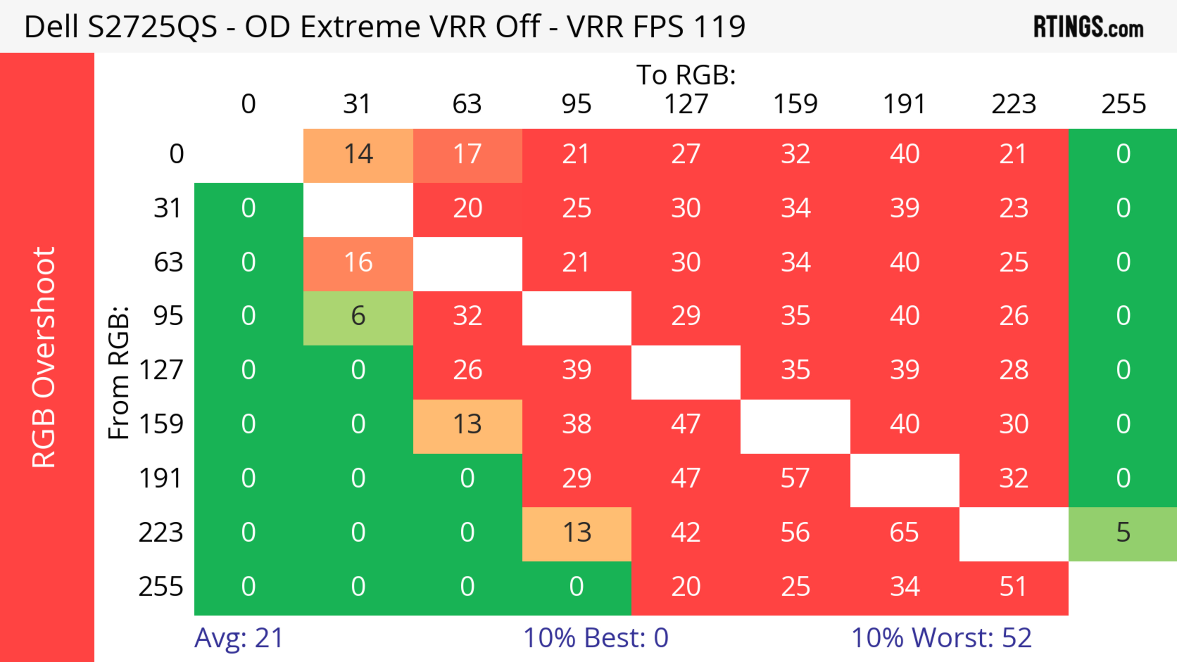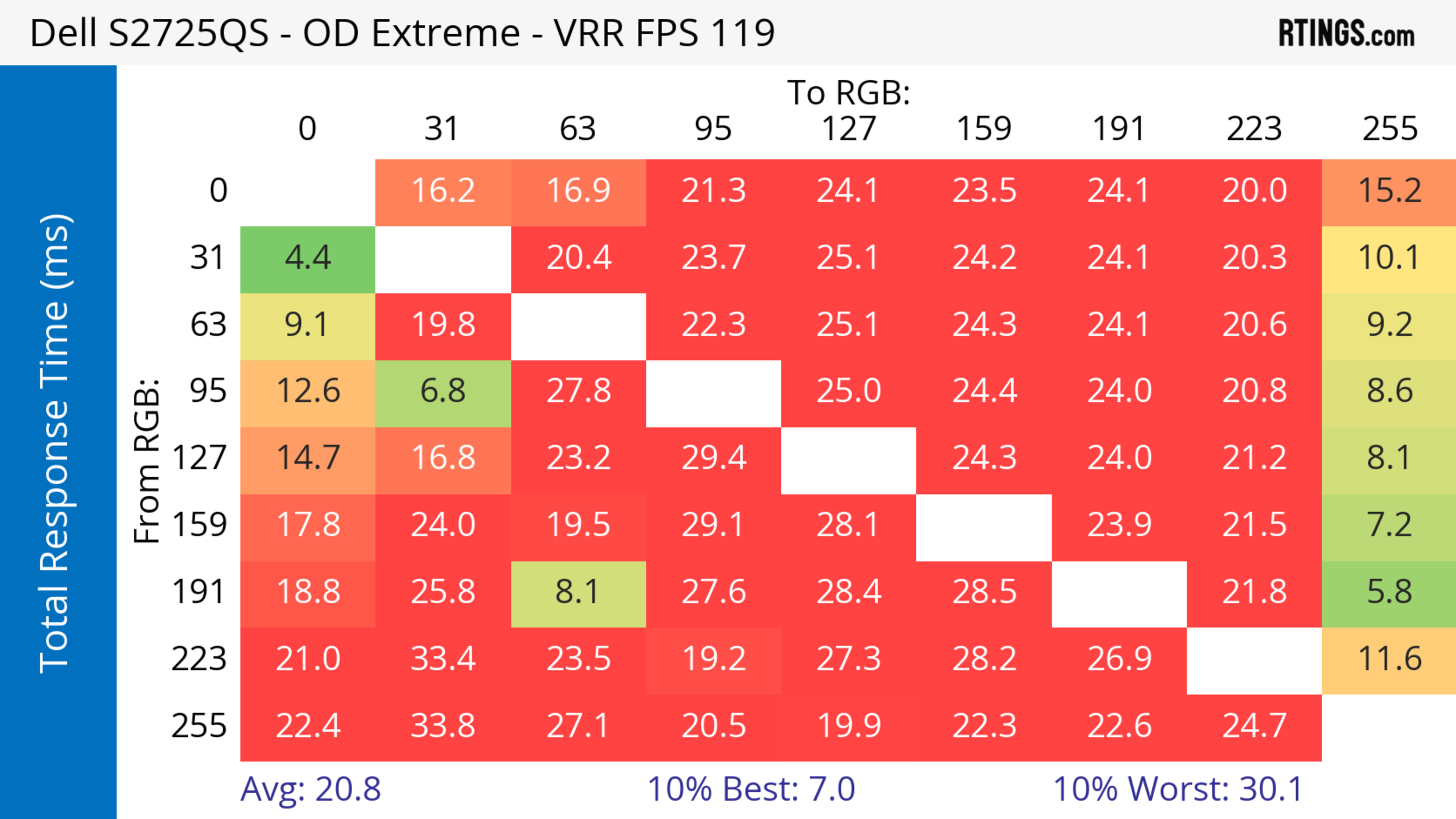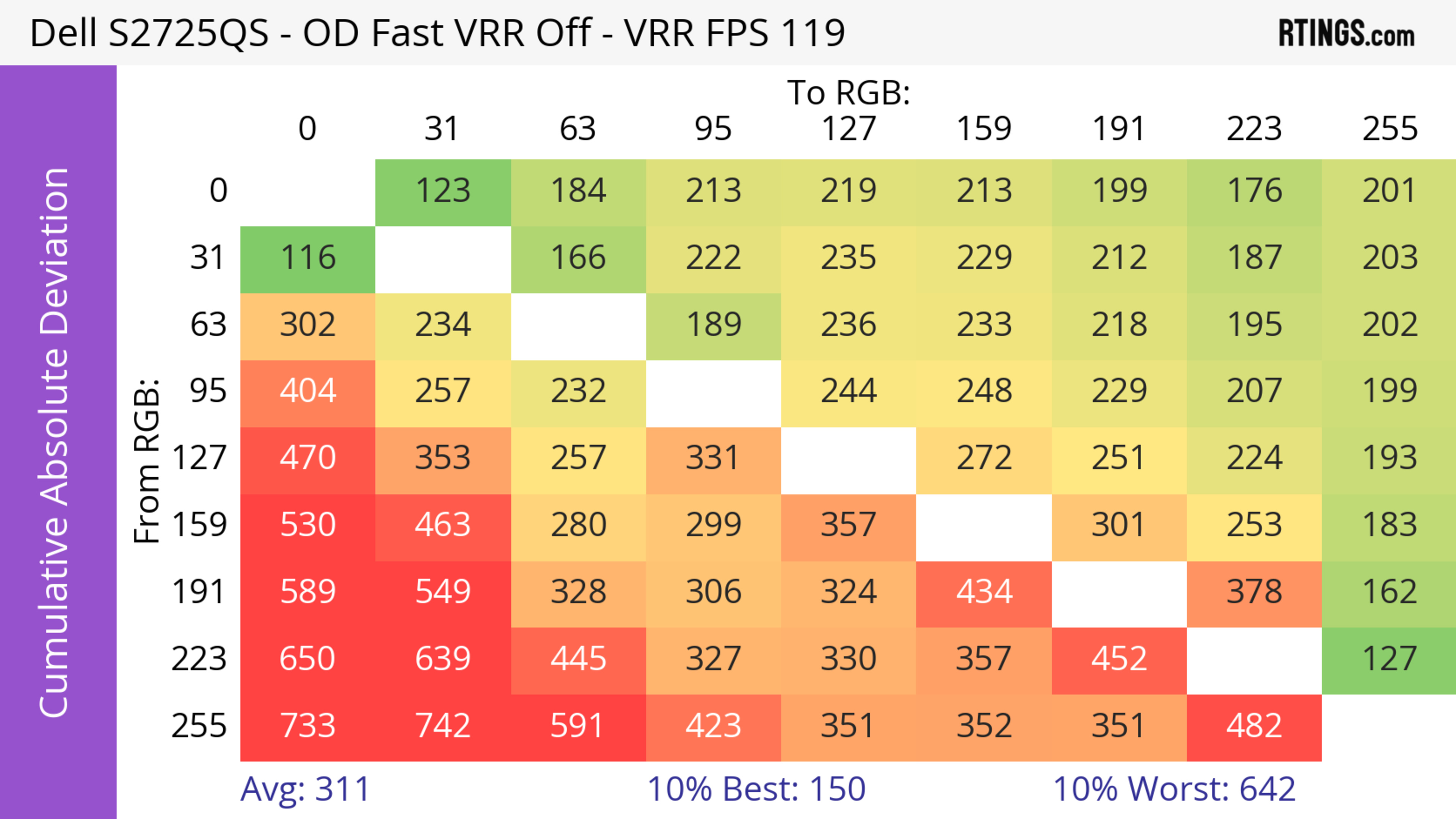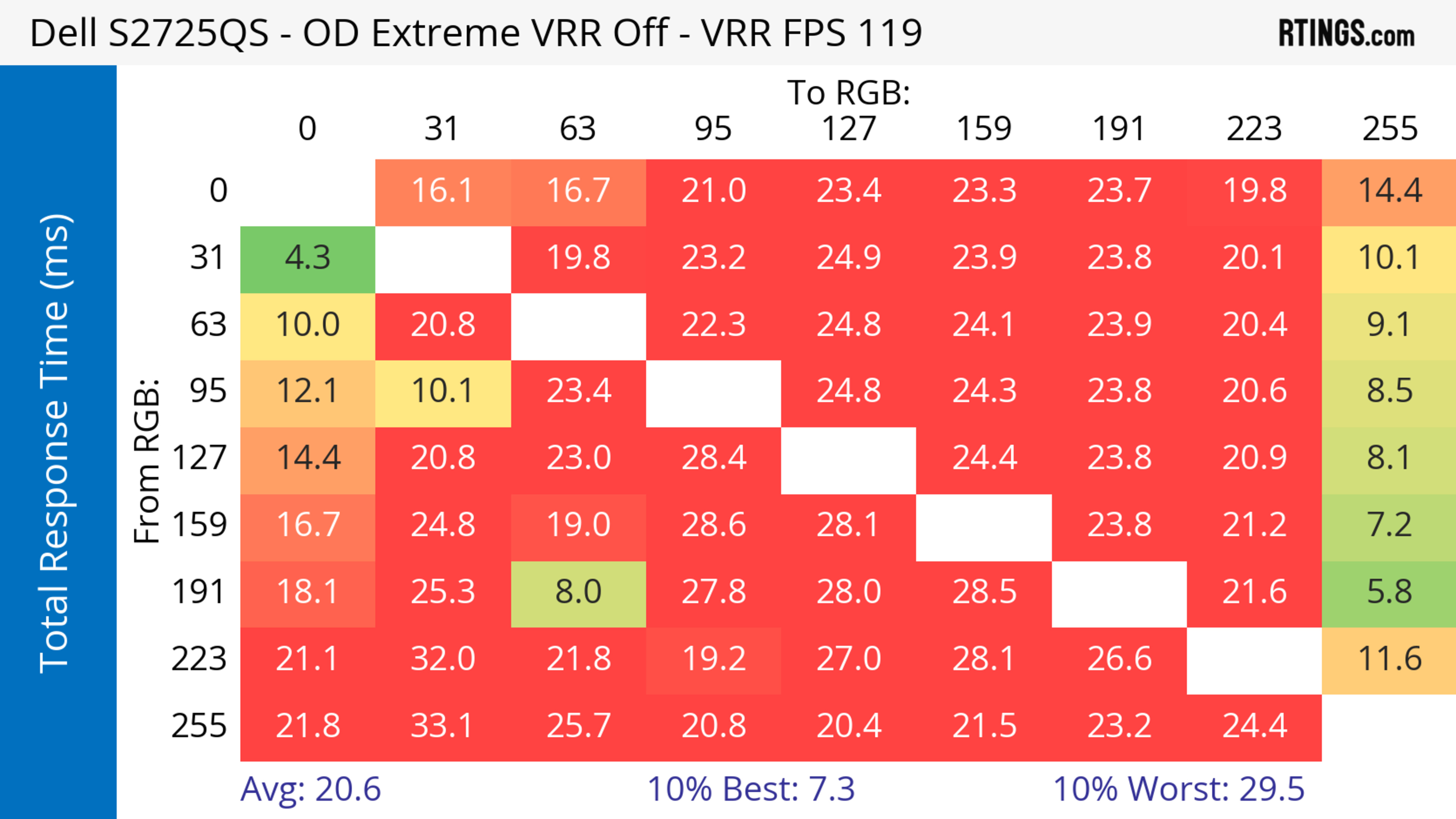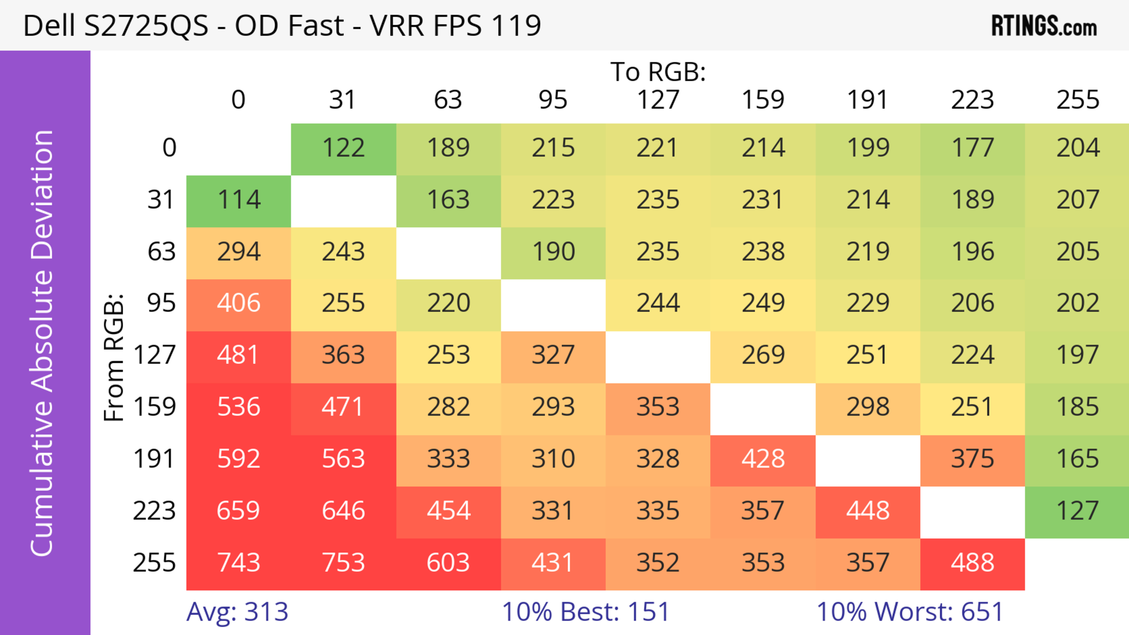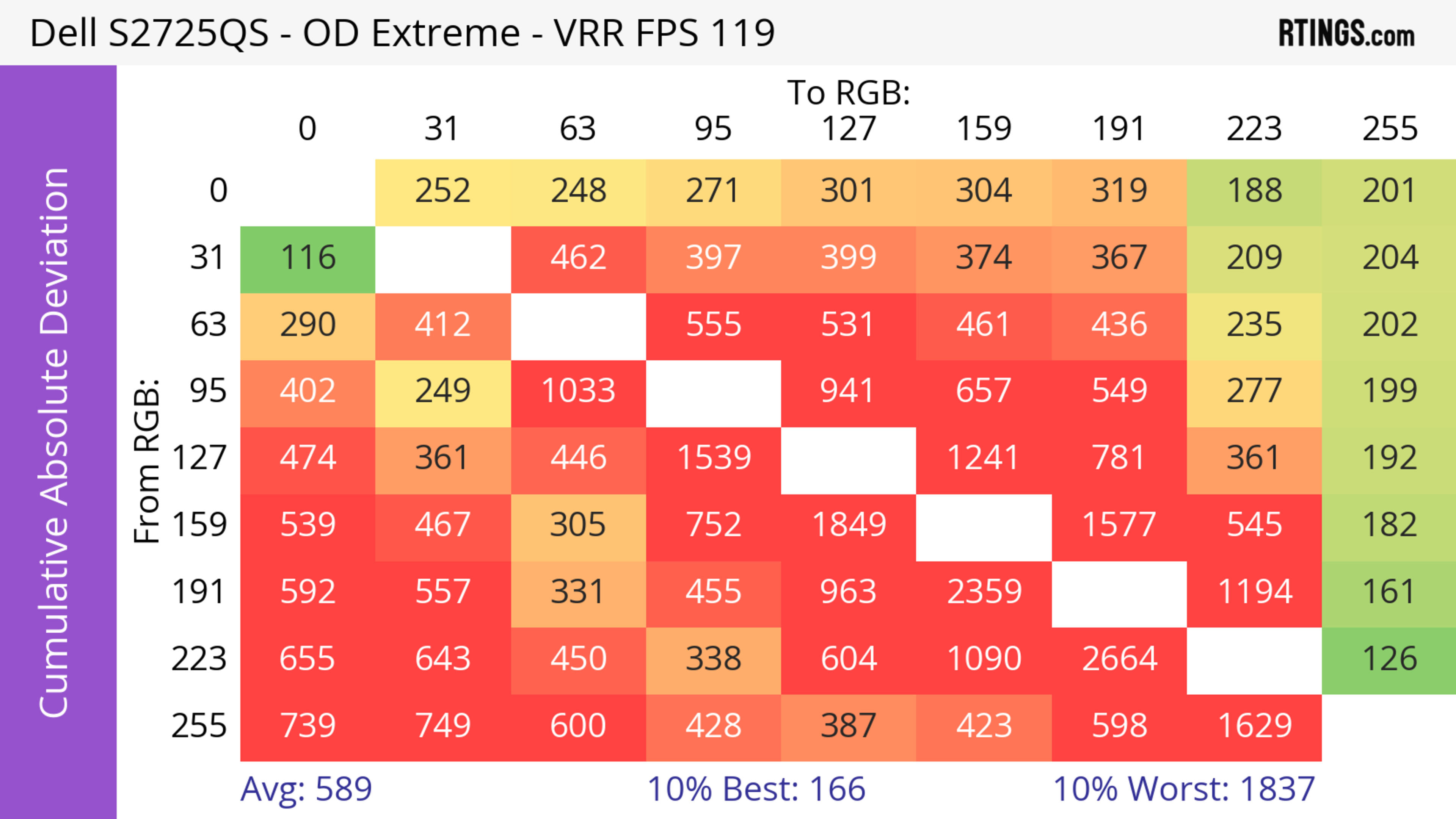 The Dell S2725QS has poor motion handling across its VRR range. There's noticeable and distracting blur with fast-moving objects at any refresh rate. Although the 'Normal' Response Time setting is the most consistent, it still performs poorly, and the other overdrive settings are worse. The 'Fast' and 'Extreme' settings have such high CAD that they pass the limits of the chart, which you can see in an alternative graph.