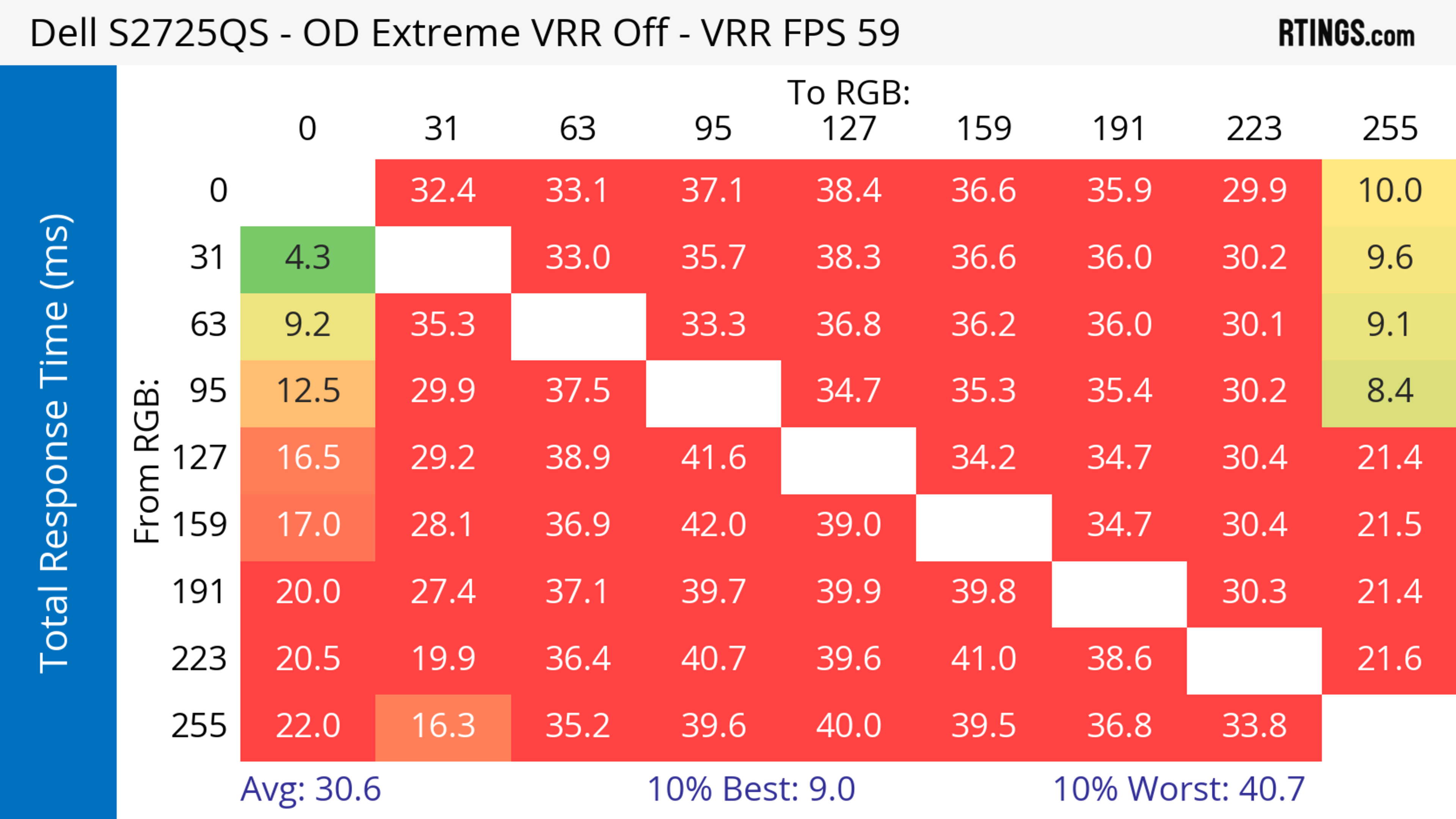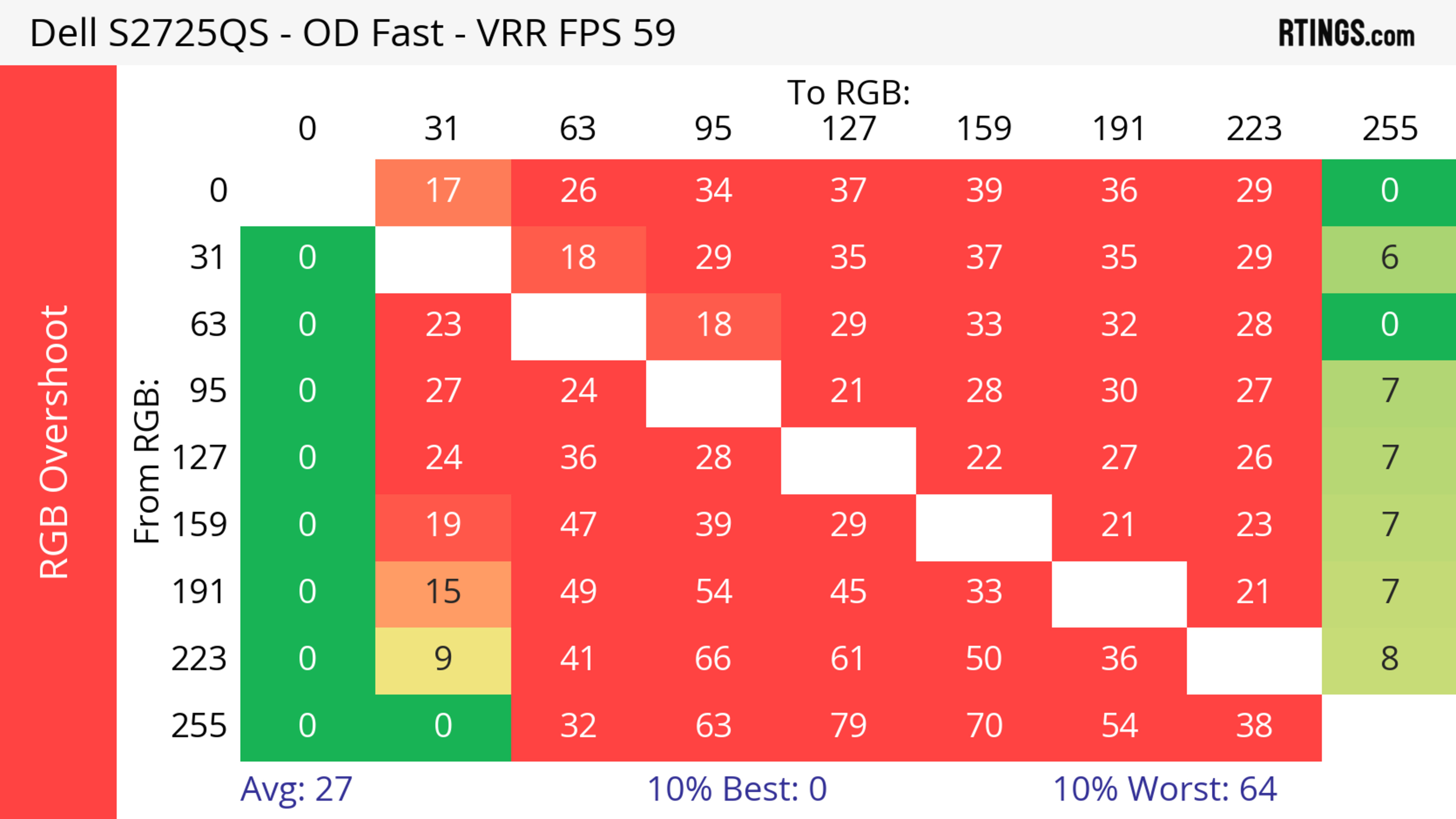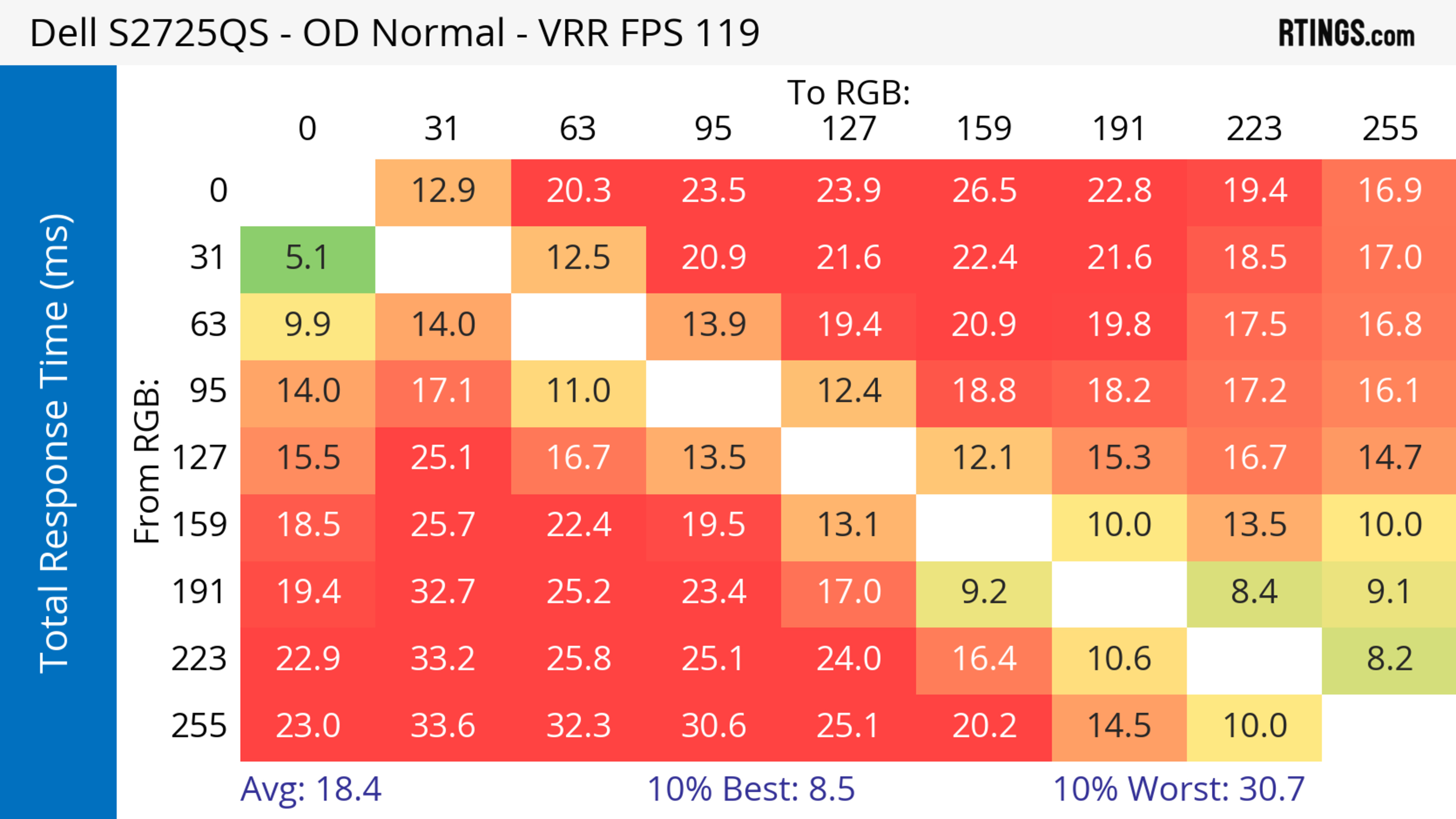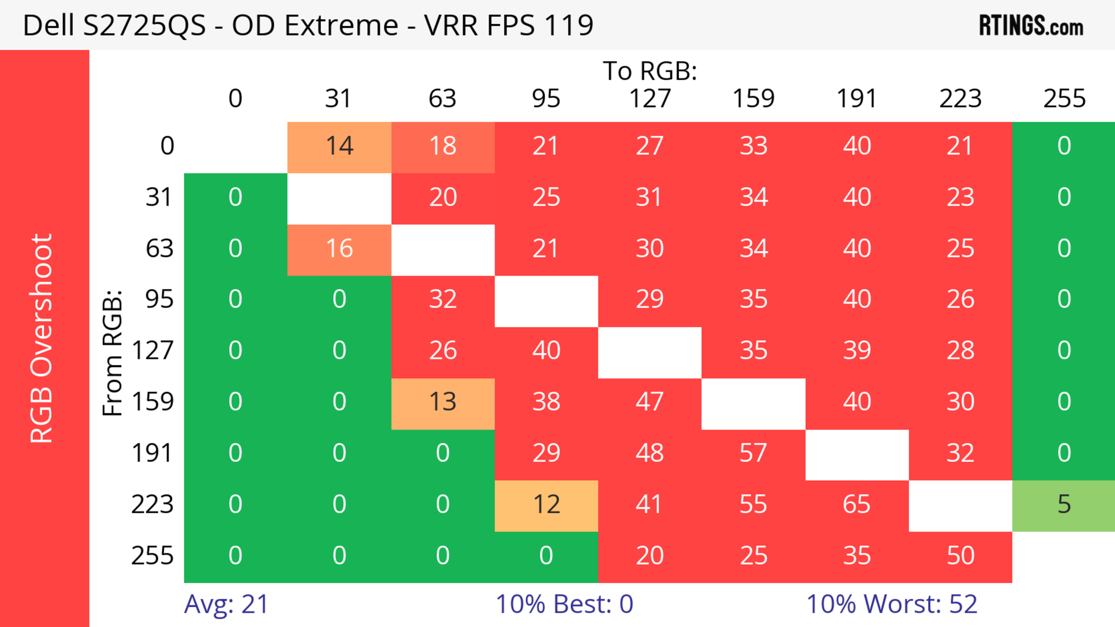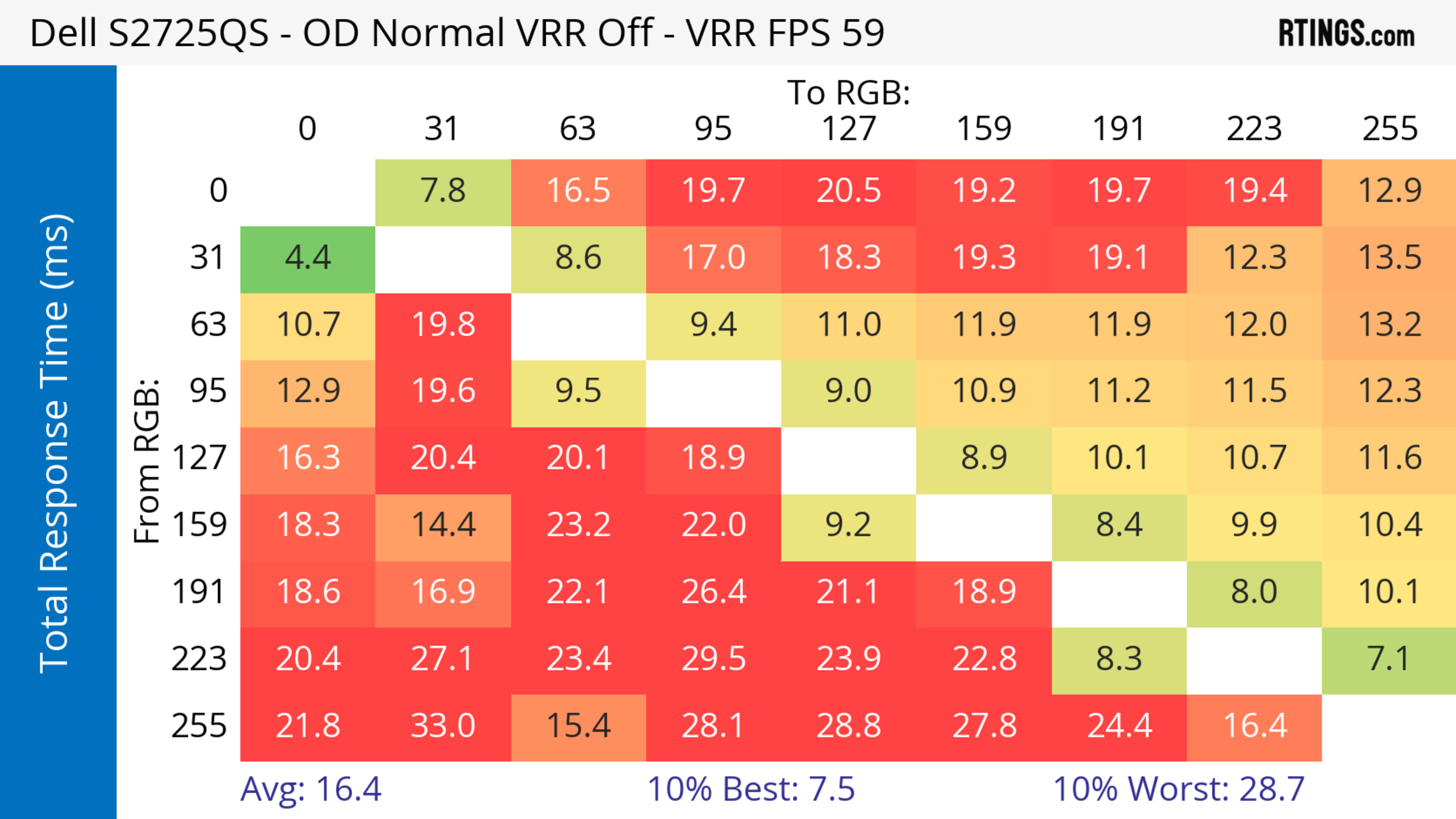 The Dell S2725QS has poor motion handling across its VRR range. There's noticeable and distracting blur with fast-moving objects at any refresh rate. Although the 'Normal' Response Time setting is the most consistent, it still performs poorly, and the other overdrive settings are worse. The 'Fast' and 'Extreme' settings have such high CAD that they pass the limits of the chart, which you can see in an alternative graph.
