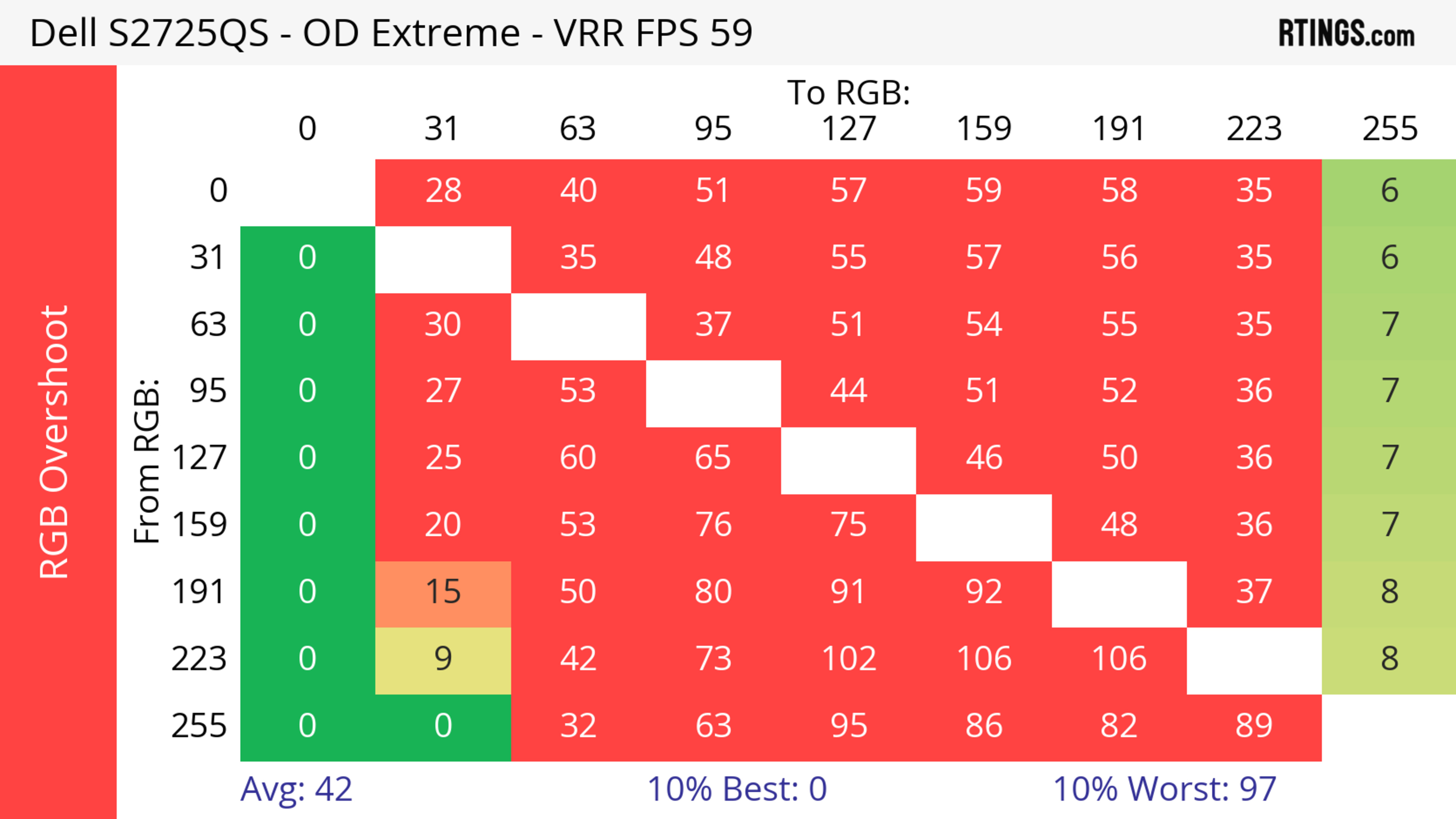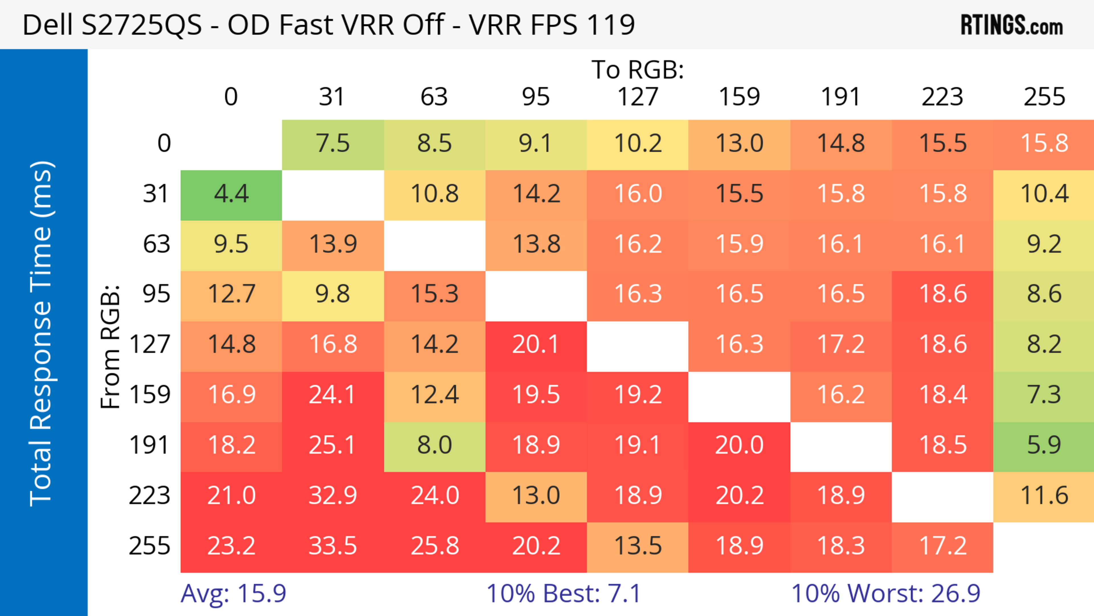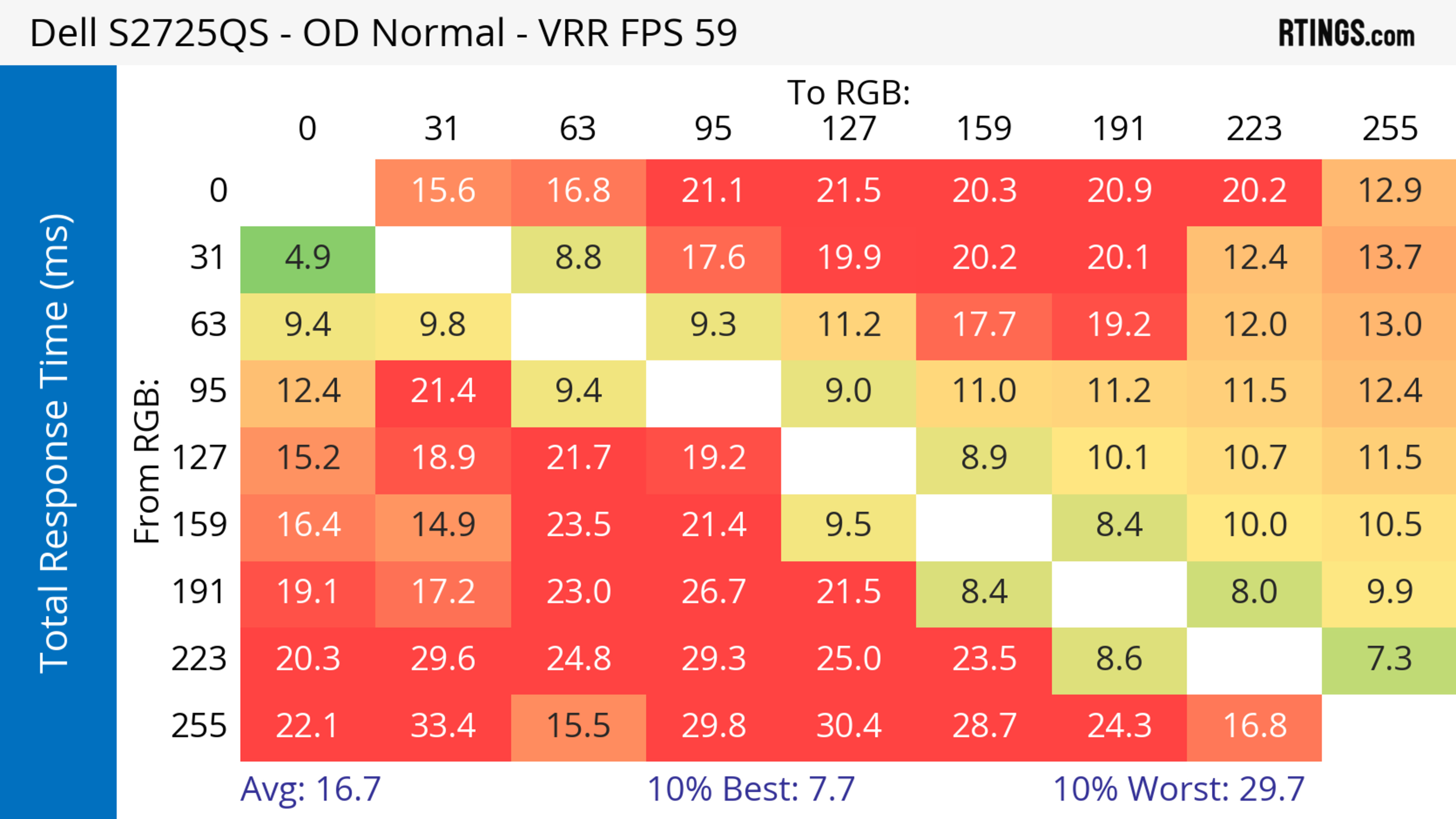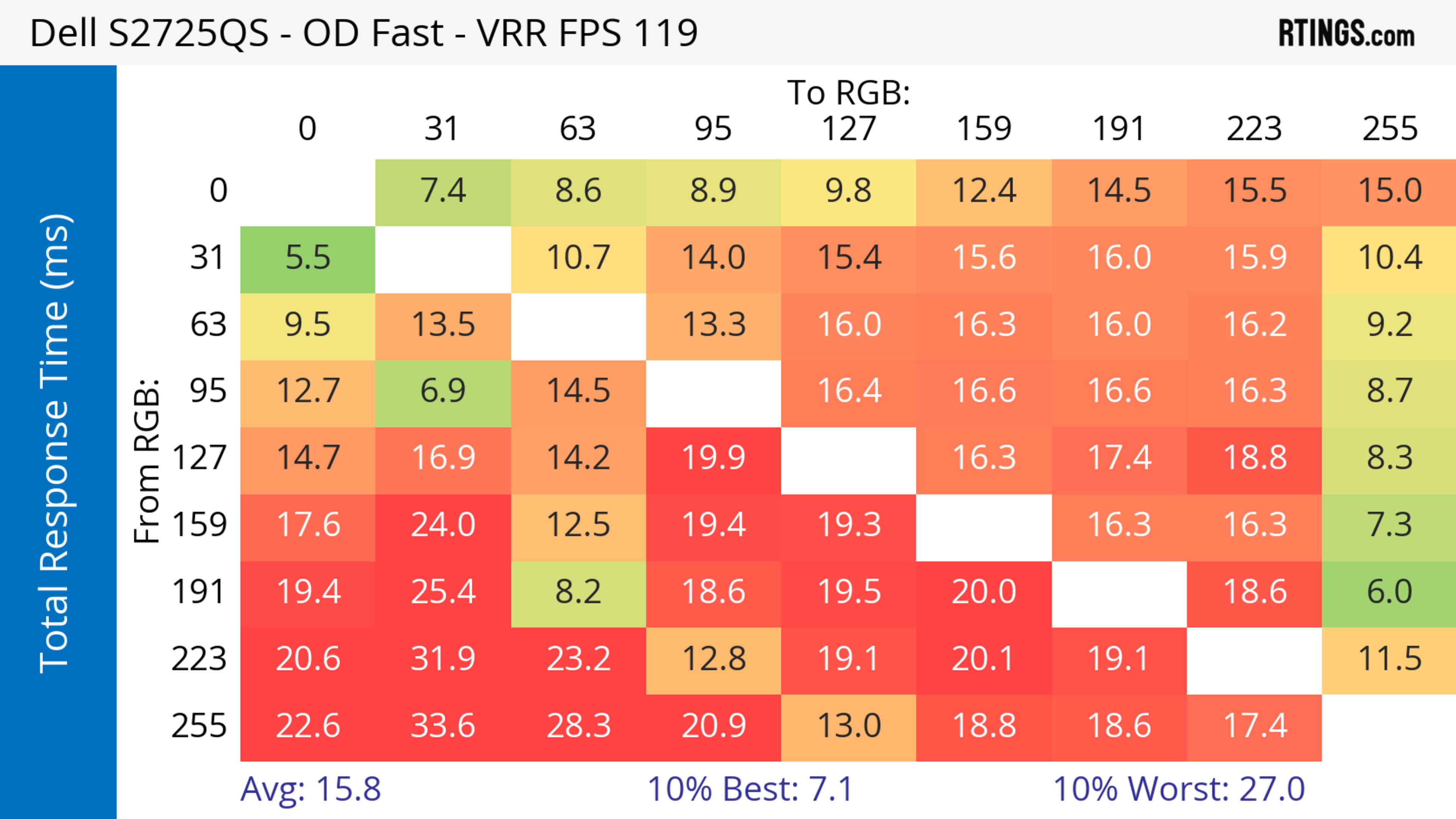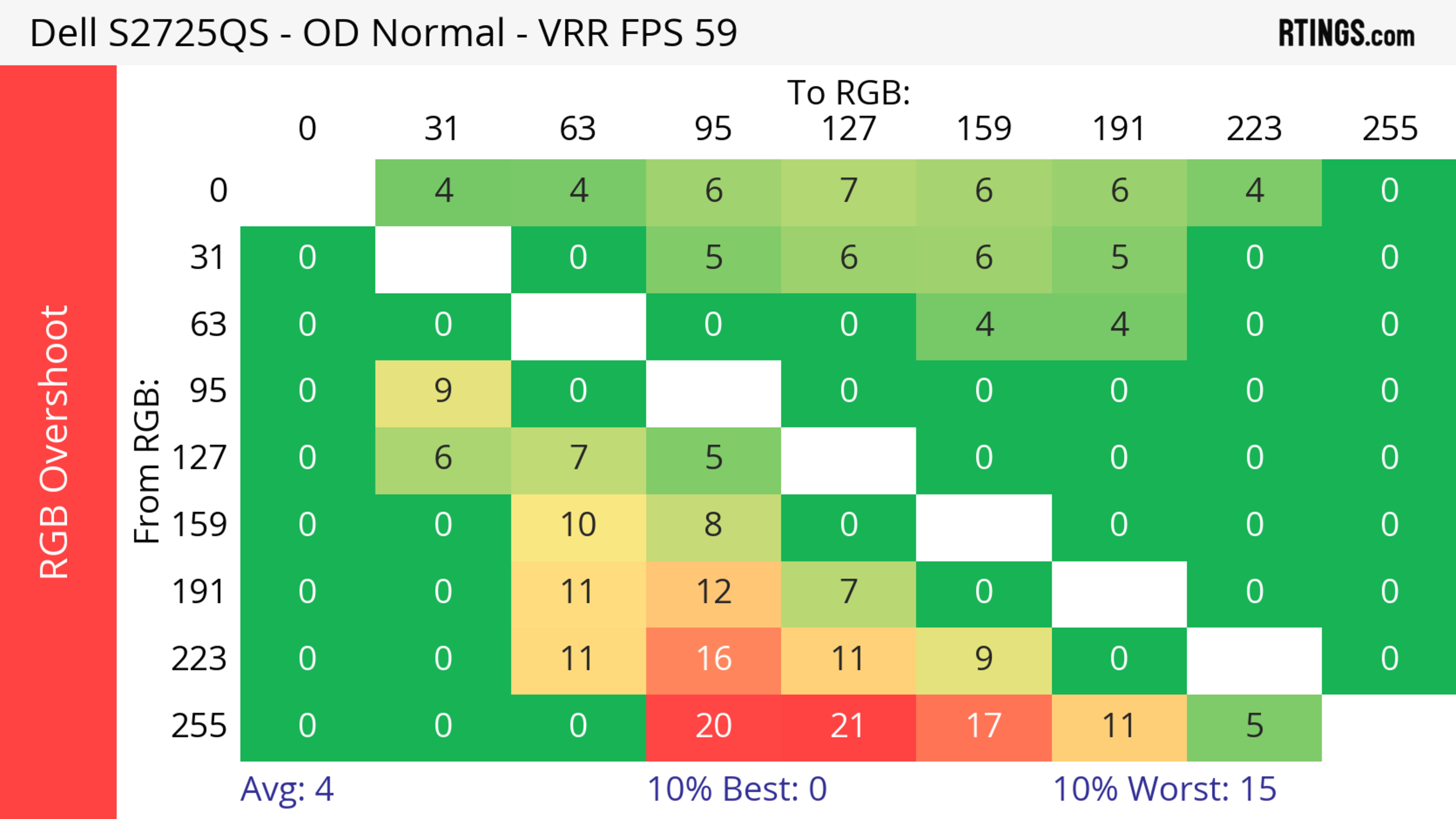 The Dell S2725QS has poor motion handling across its VRR range. There's noticeable and distracting blur with fast-moving objects at any refresh rate. Although the 'Normal' Response Time setting is the most consistent, it still performs poorly, and the other overdrive settings are worse. The 'Fast' and 'Extreme' settings have such high CAD that they pass the limits of the chart, which you can see in an alternative graph.
