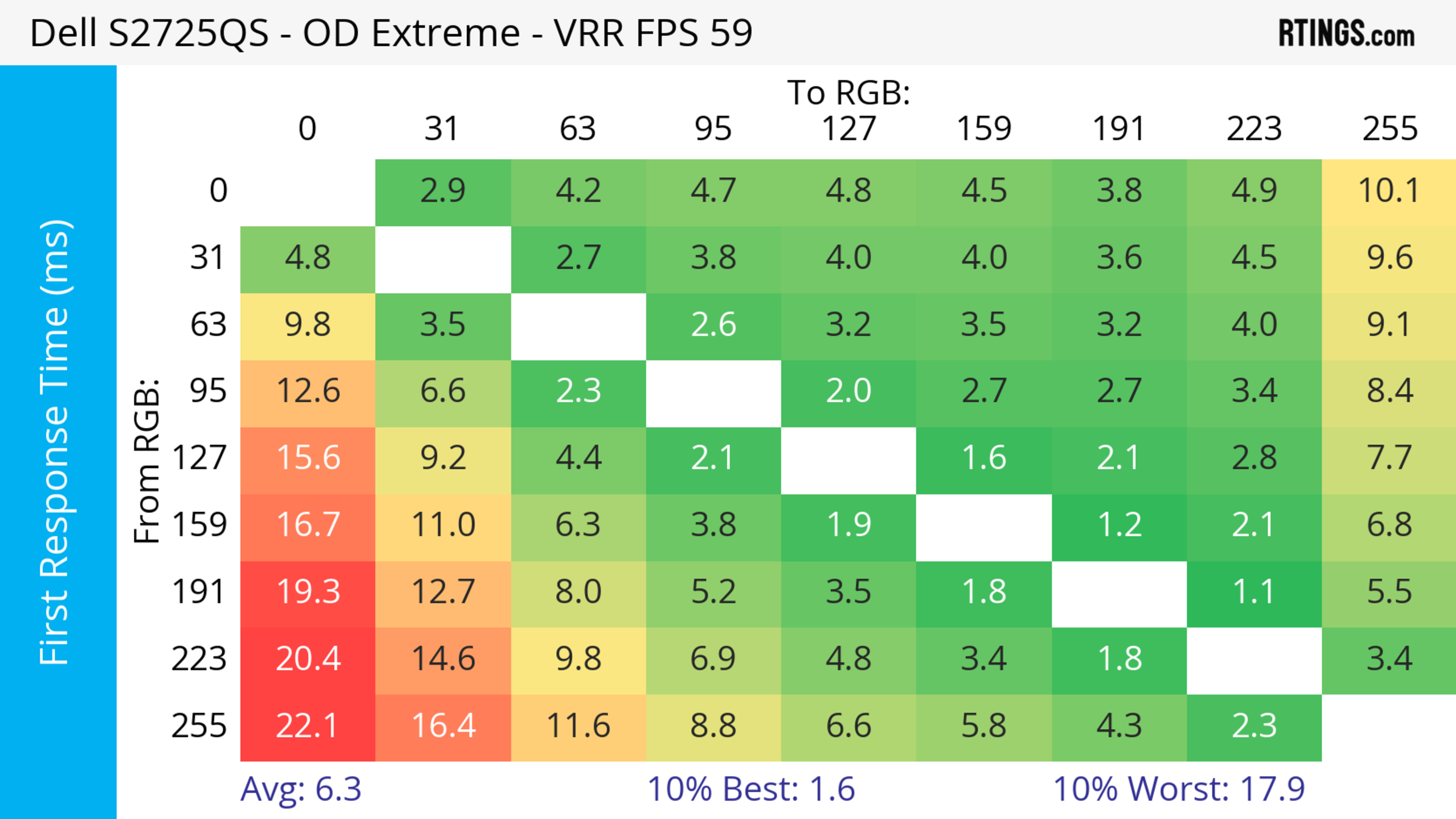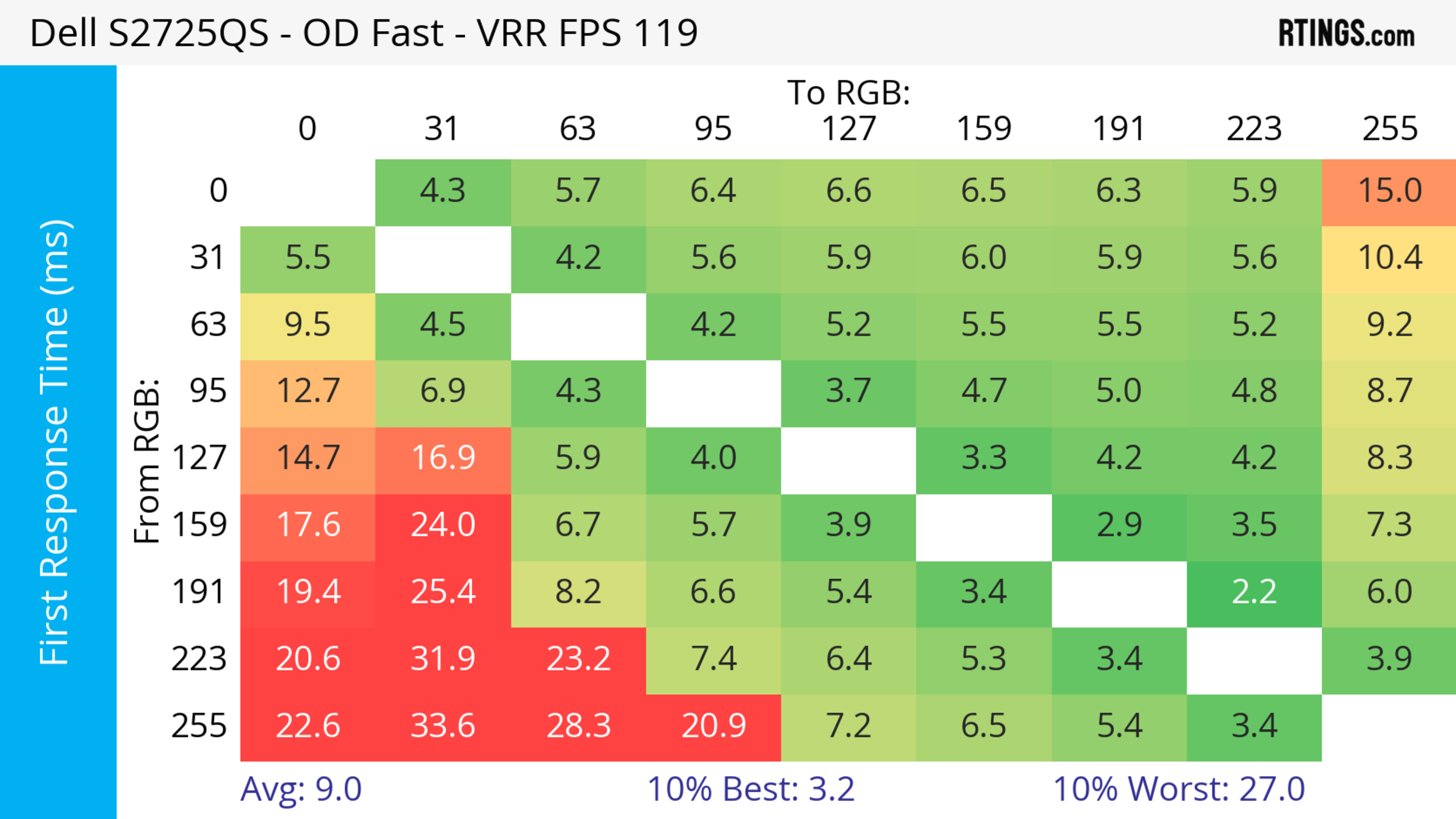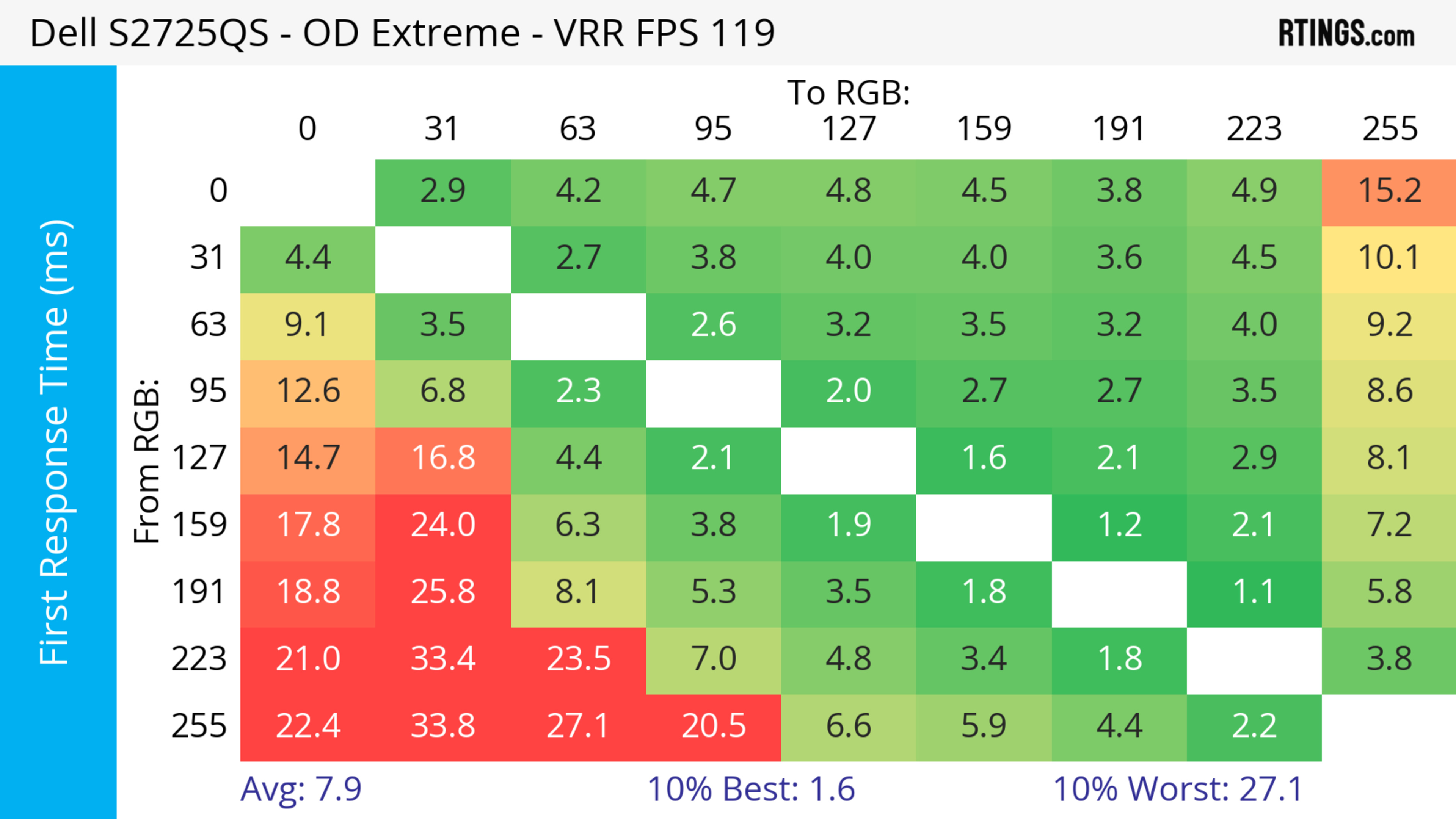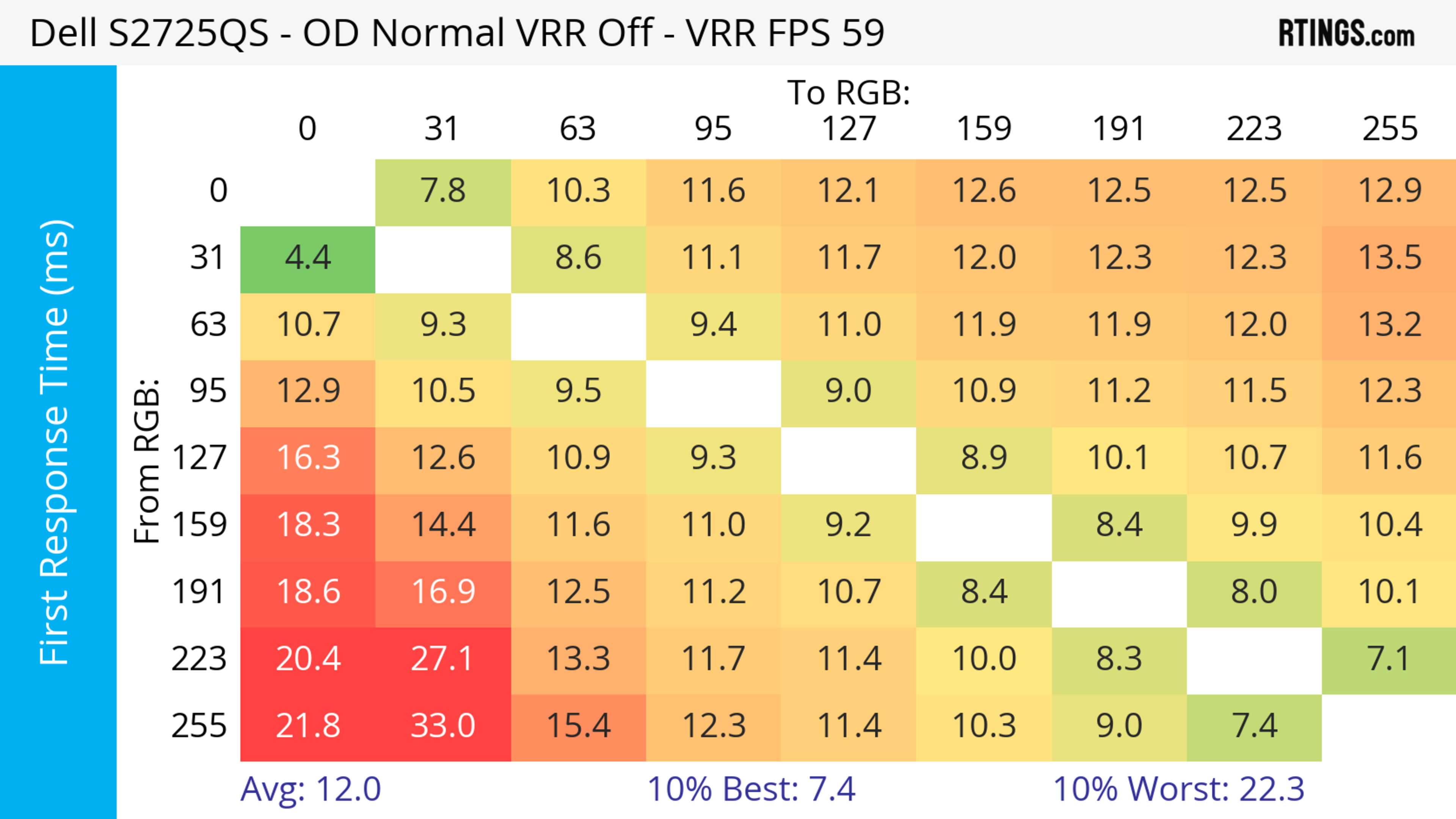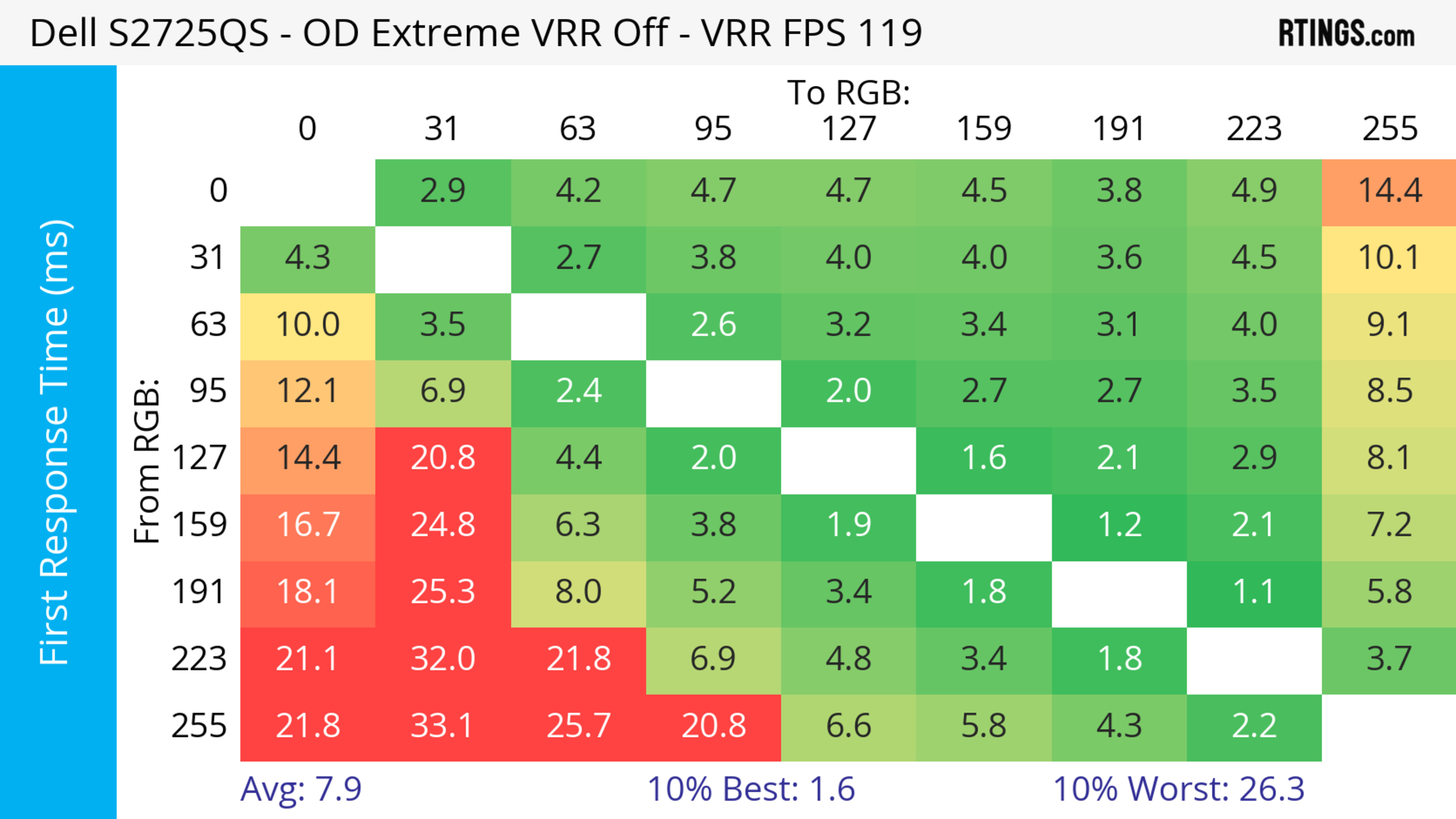The Dell S2725QS has poor motion handling across its VRR range. There's noticeable and distracting blur with fast-moving objects at any refresh rate. Although the 'Normal' Response Time setting is the most consistent, it still performs poorly, and the other overdrive settings are worse. The 'Fast' and 'Extreme' settings have such high CAD that they pass the limits of the chart, which you can see in an alternative graph.
