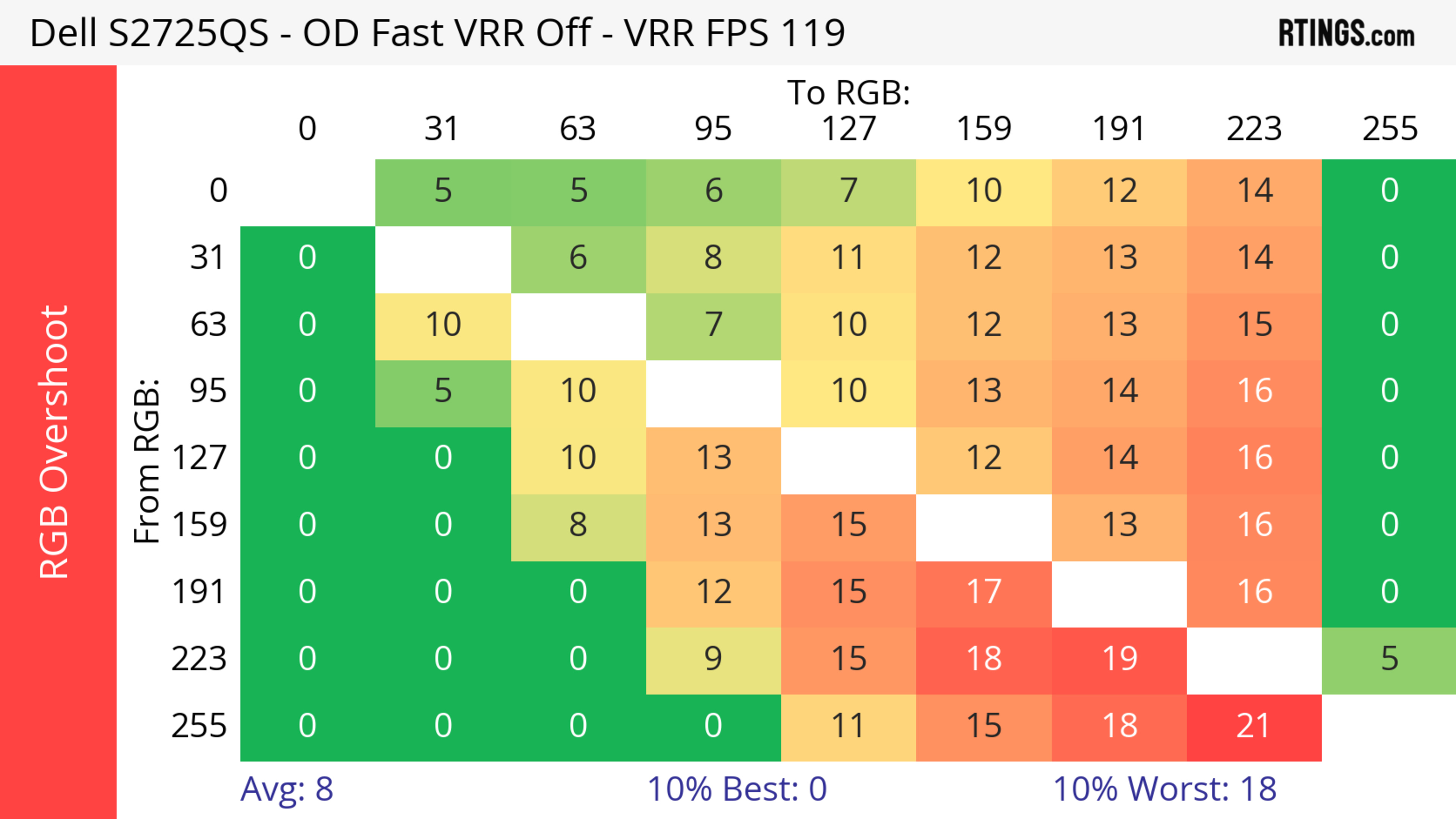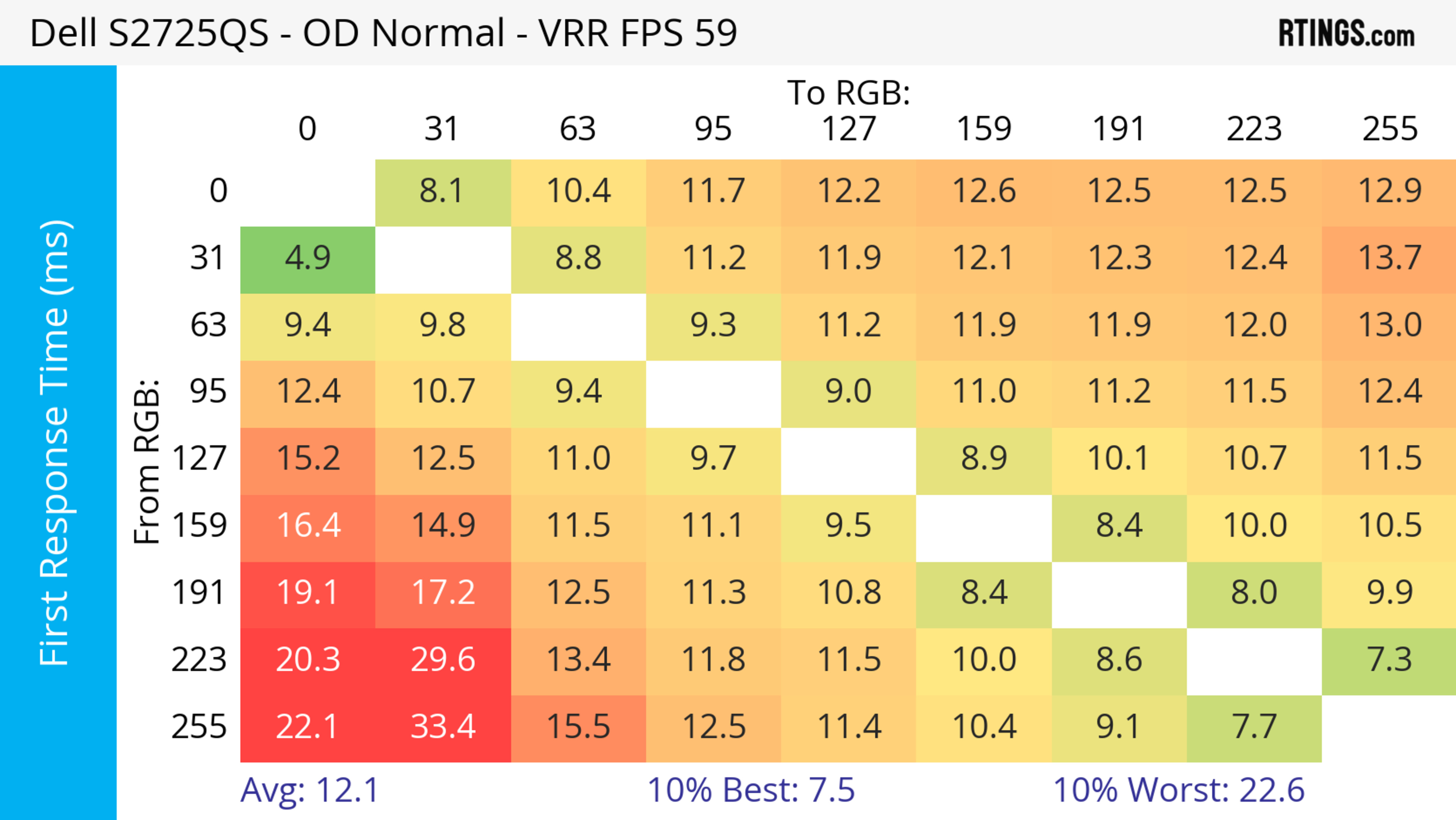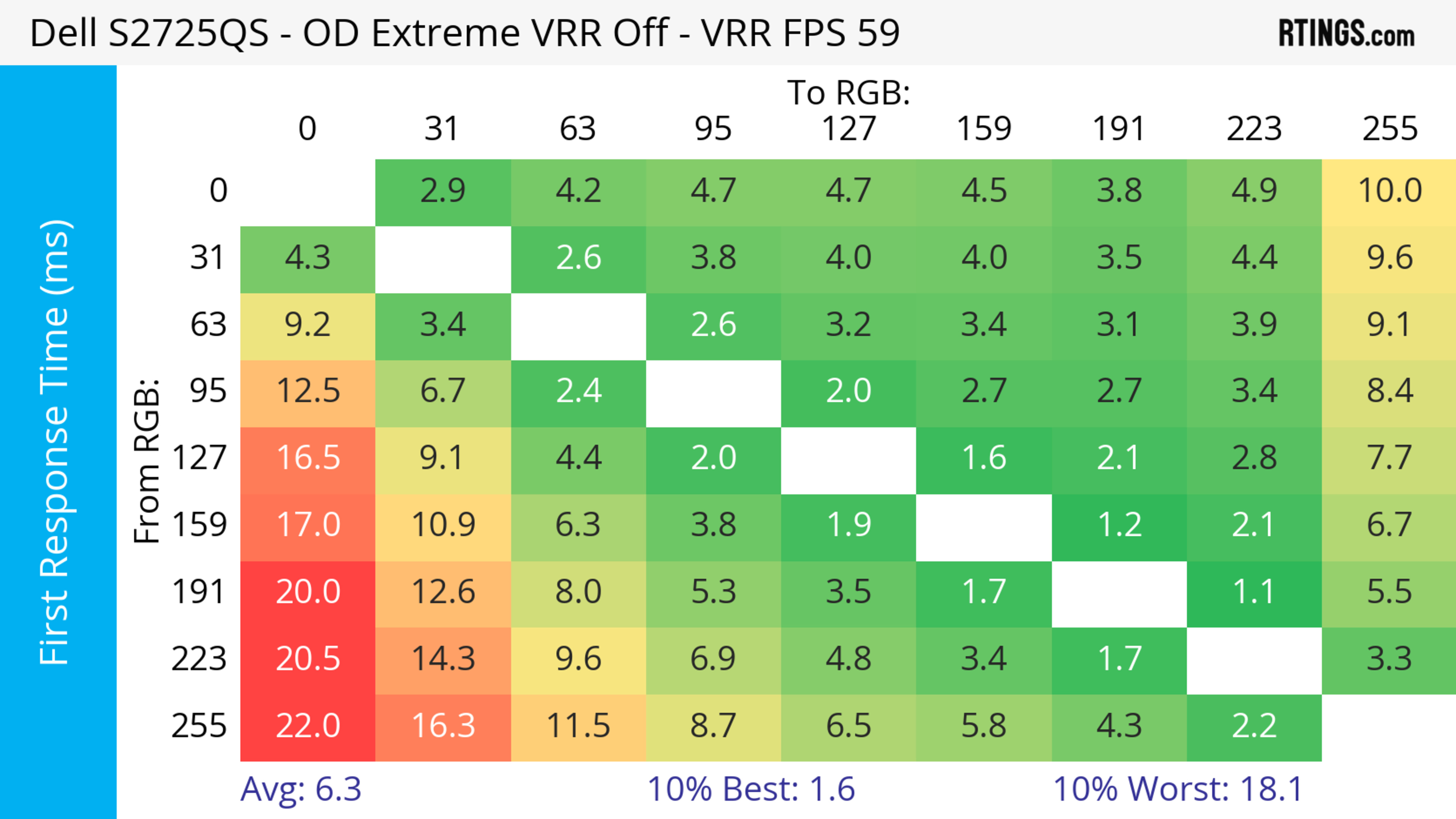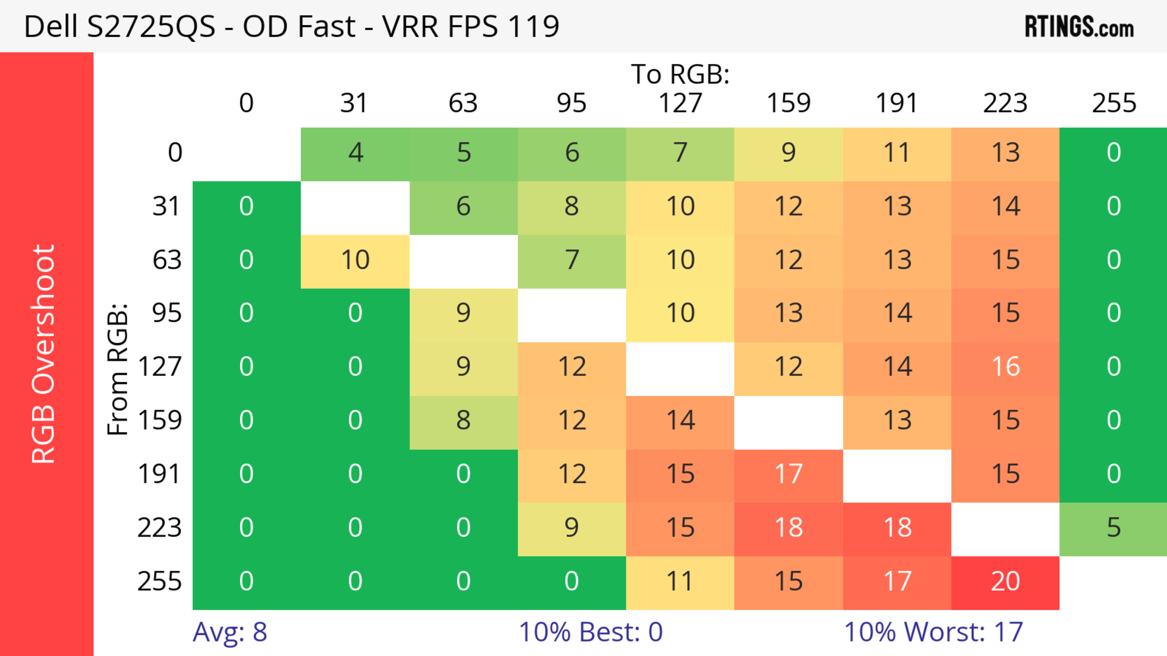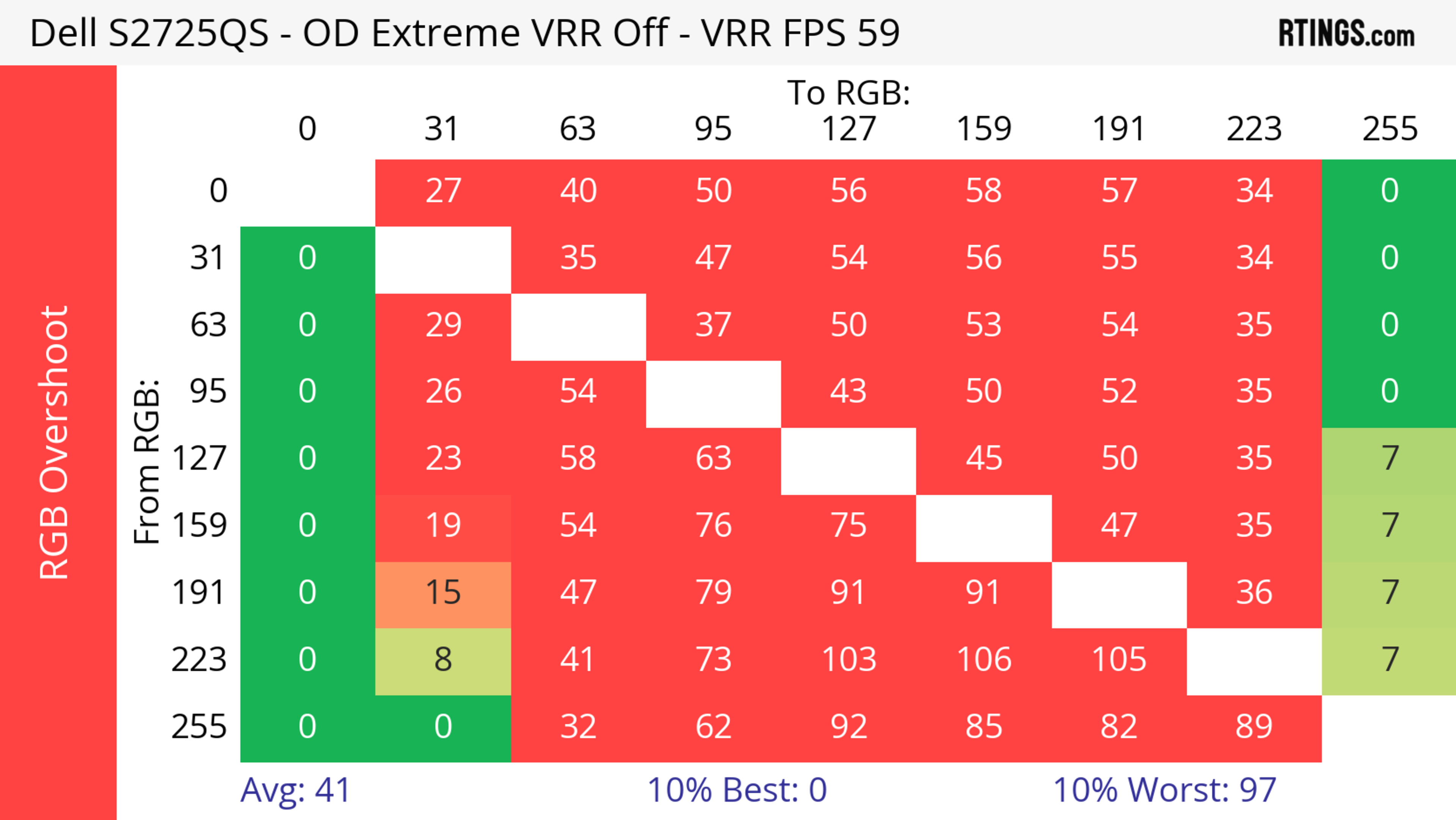 The Dell S2725QS has poor motion handling across its VRR range. There's noticeable and distracting blur with fast-moving objects at any refresh rate. Although the 'Normal' Response Time setting is the most consistent, it still performs poorly, and the other overdrive settings are worse. The 'Fast' and 'Extreme' settings have such high CAD that they pass the limits of the chart, which you can see in an alternative graph.