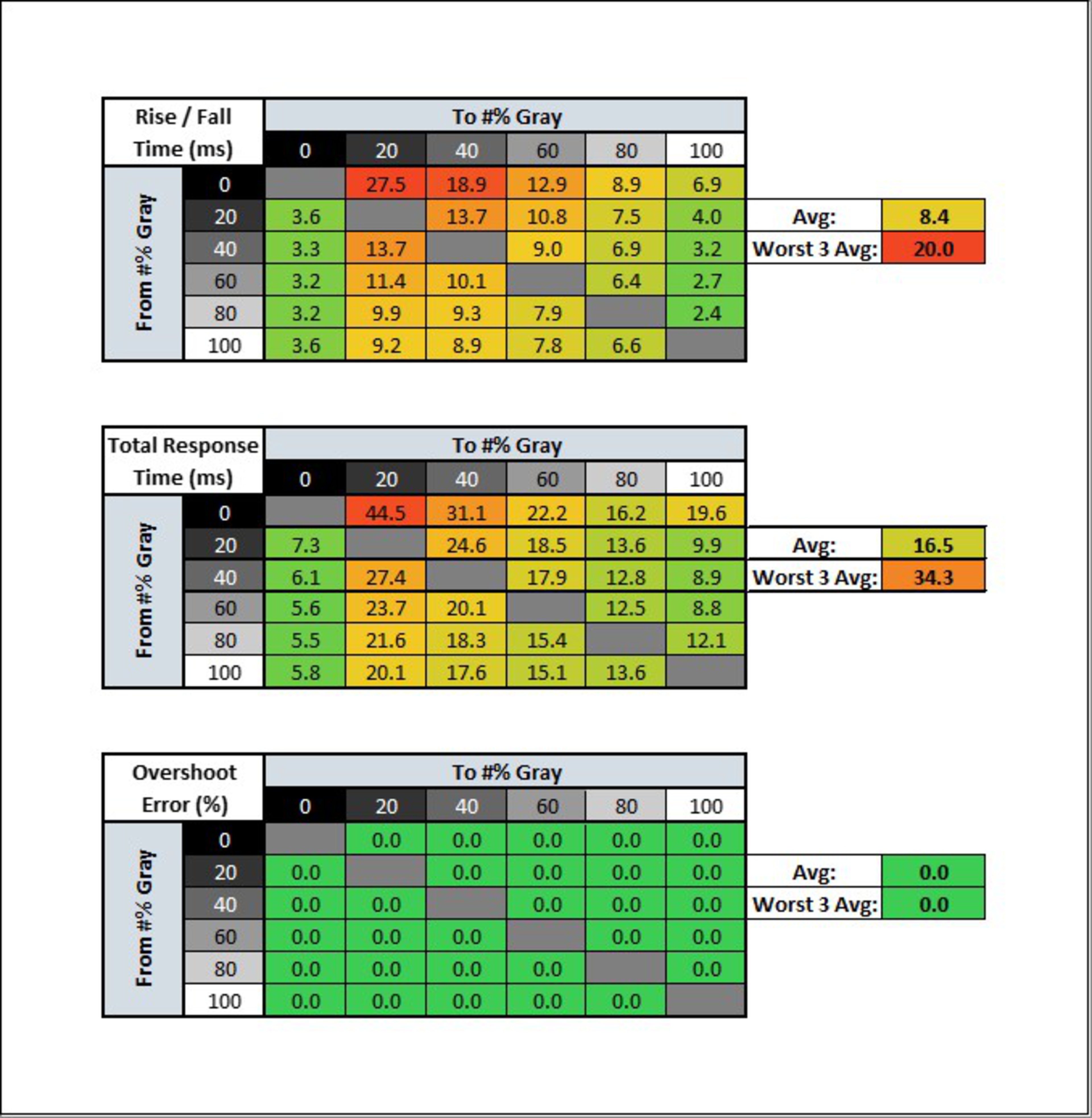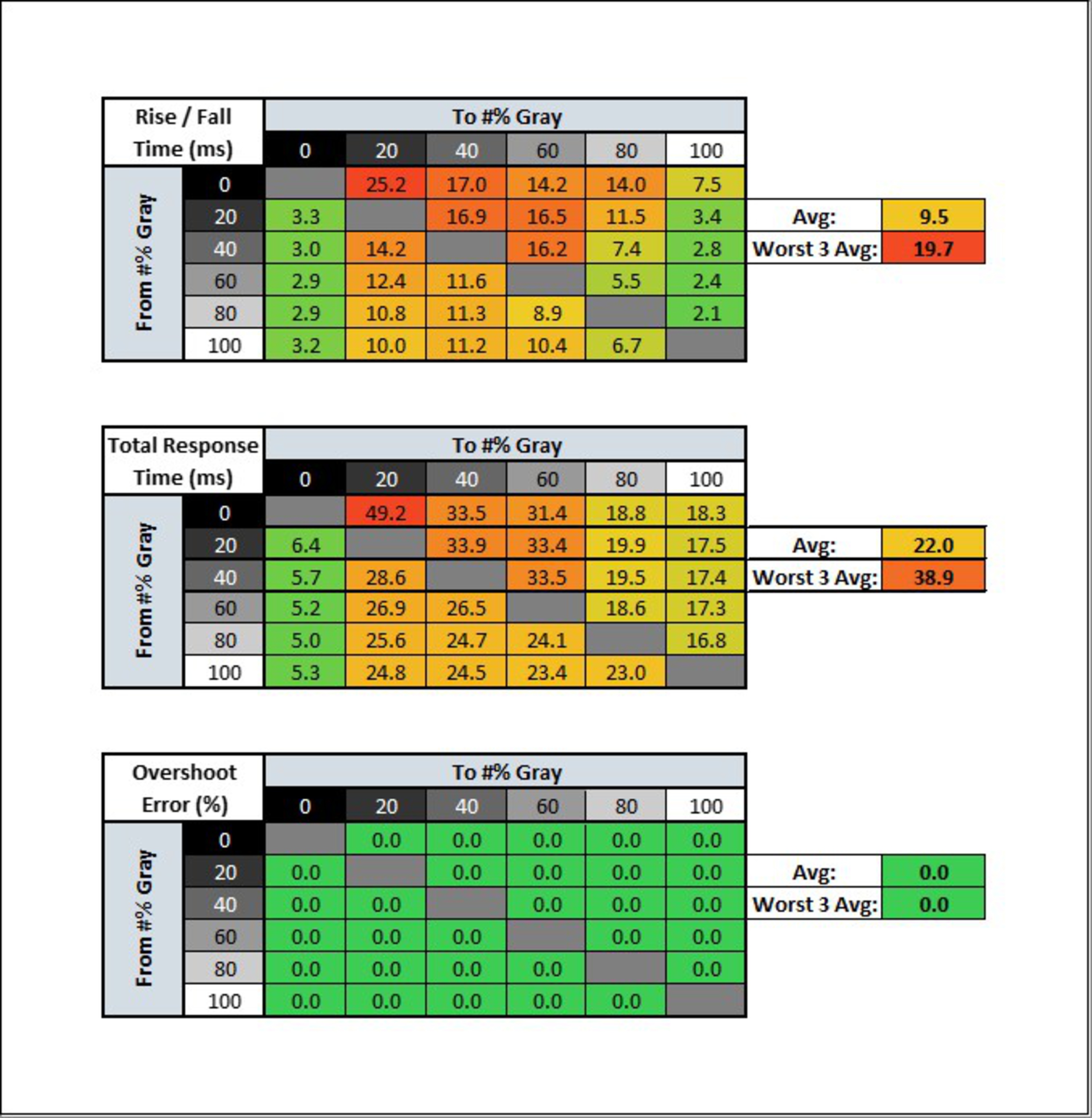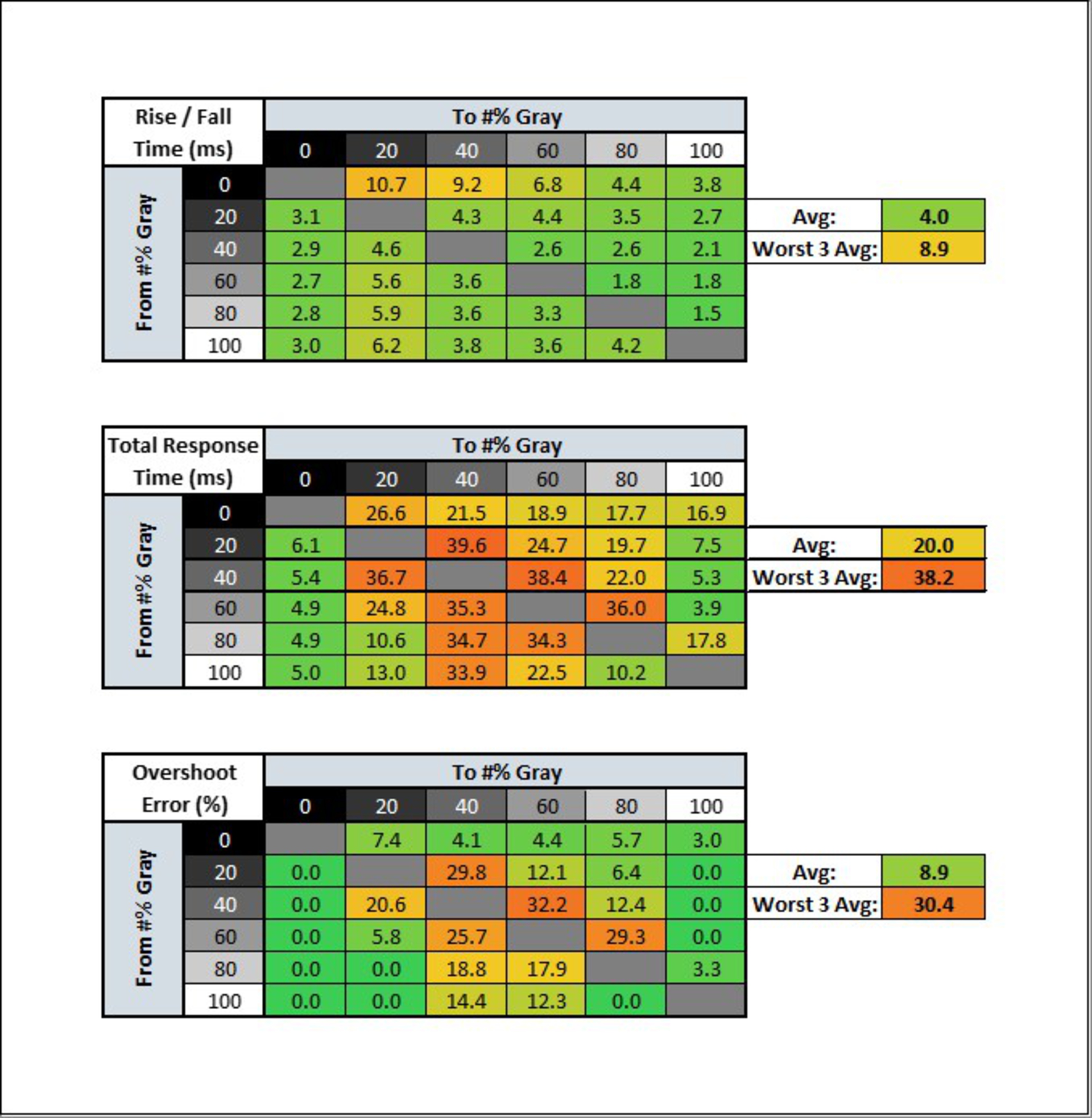 | Overdrive Setting - VRR Disabled | Response Time Chart | Response Time Tables | Motion Blur Photo |