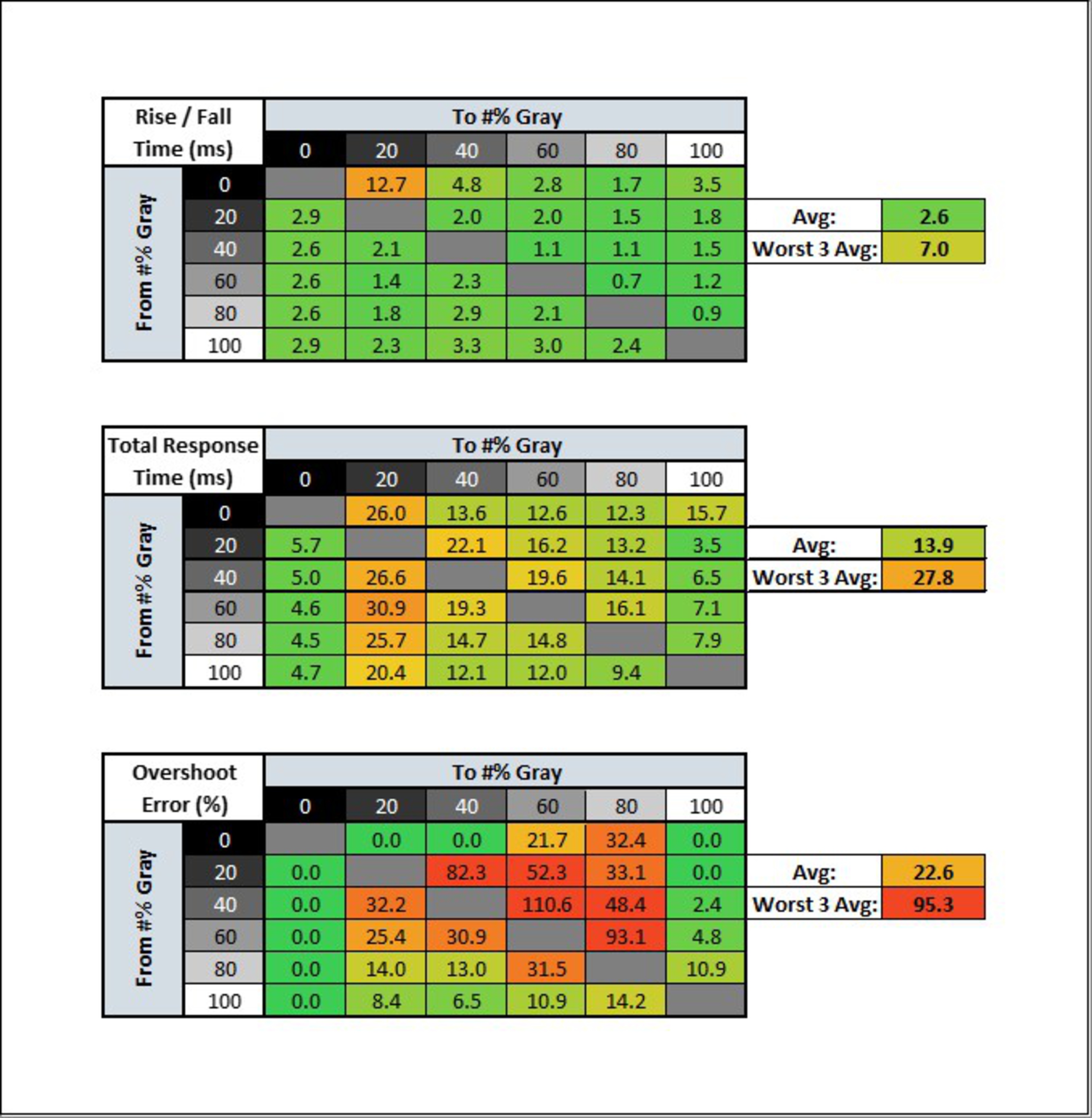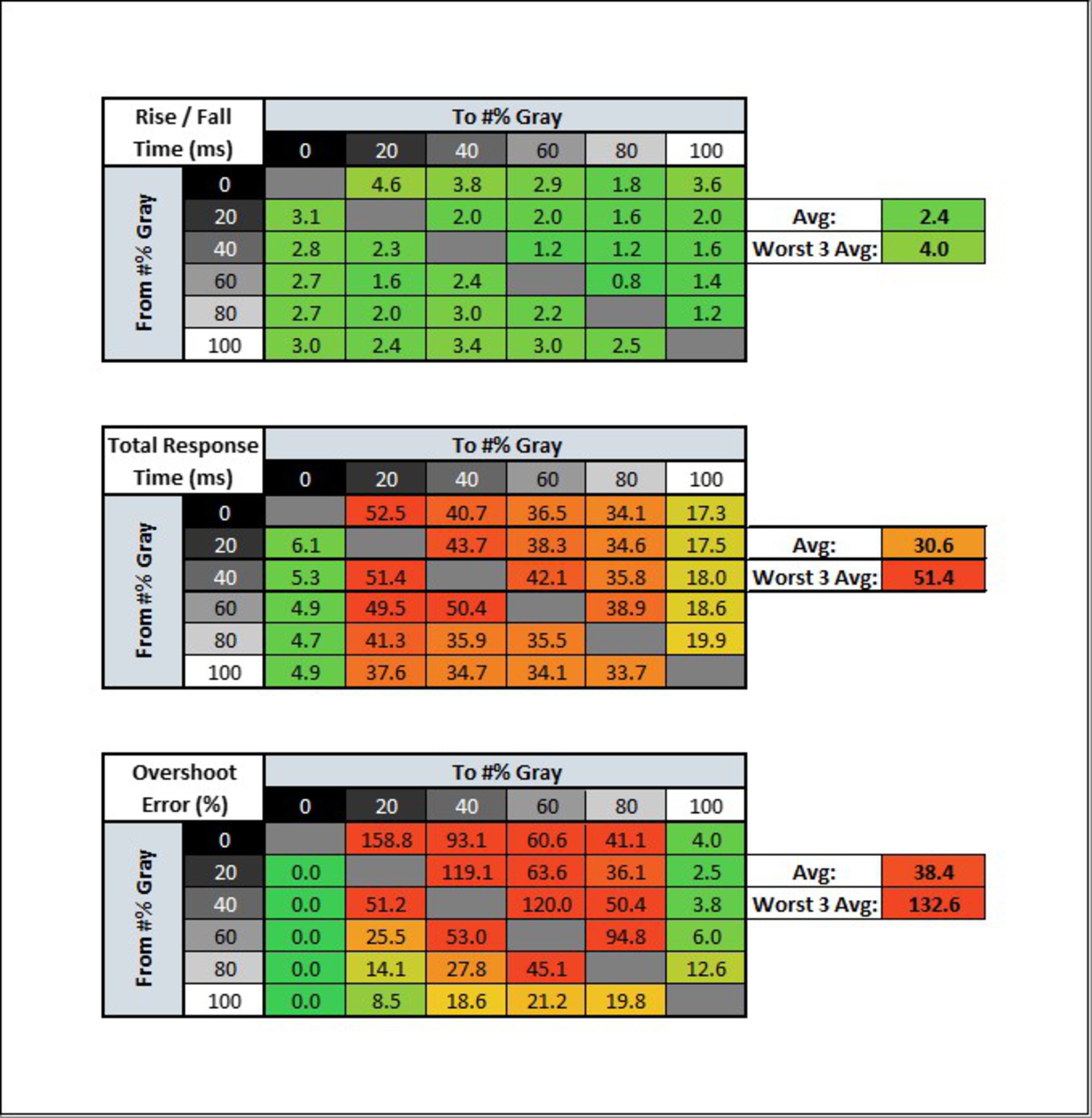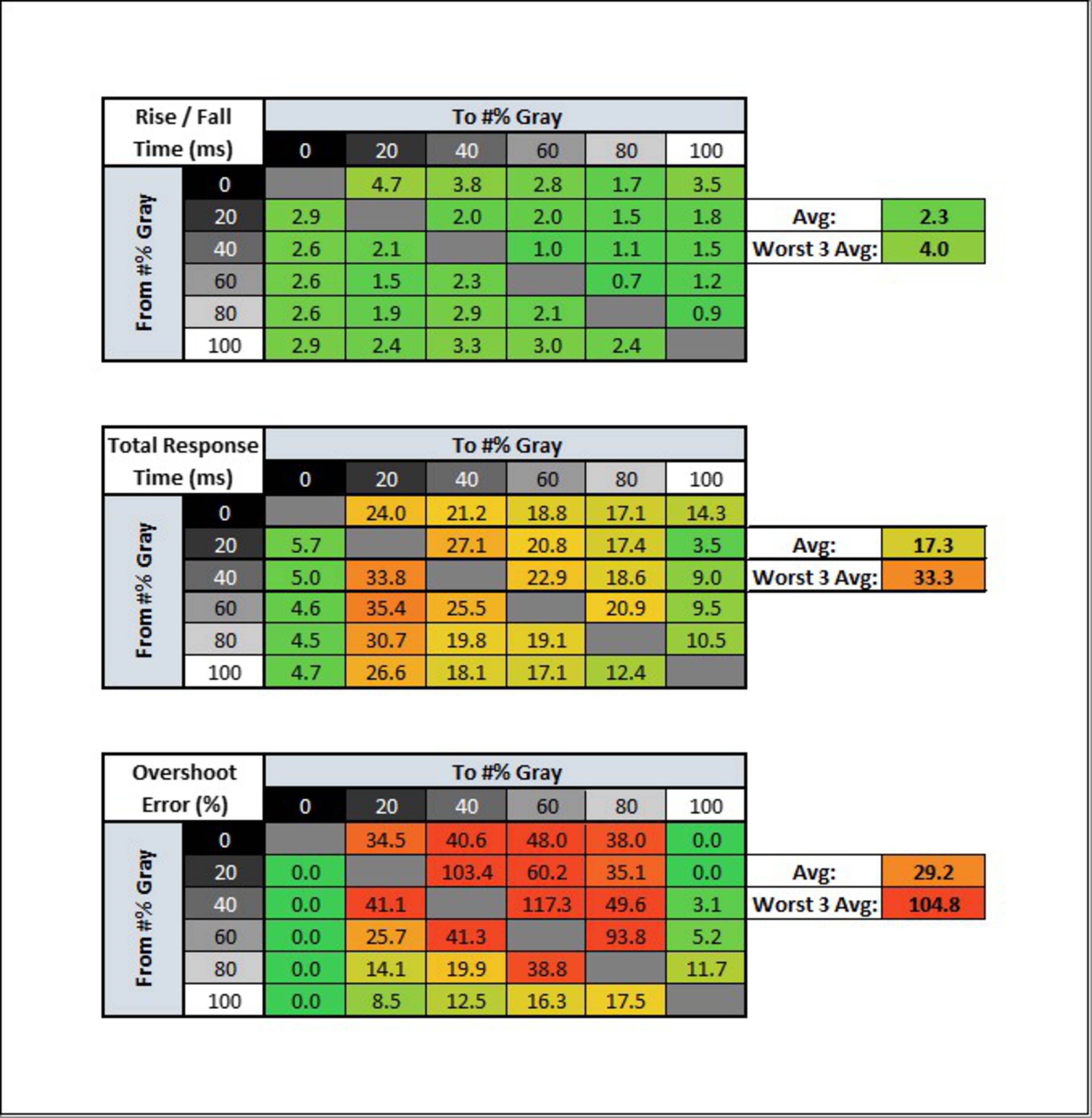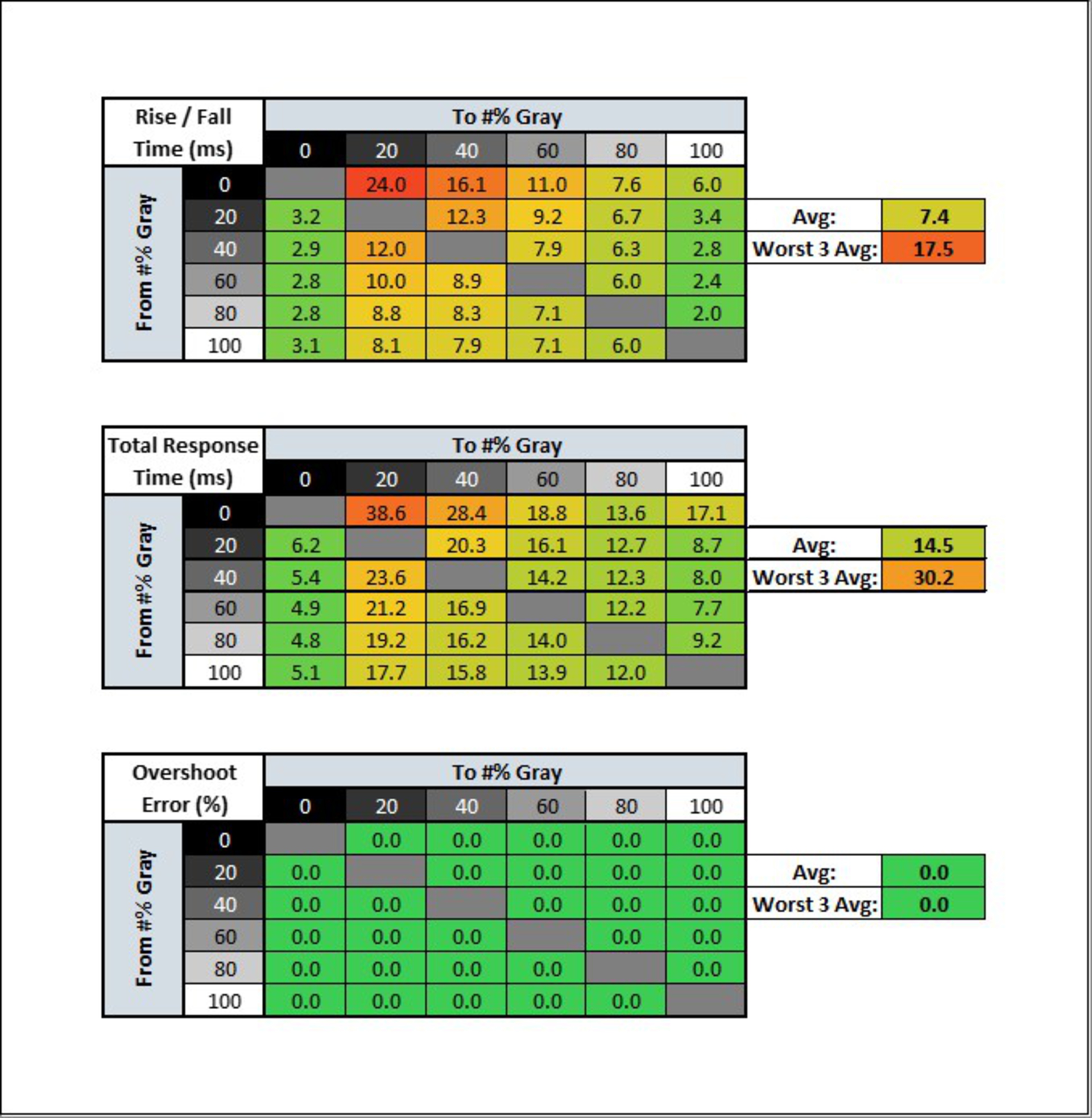 | Overdrive Setting - VRR Disabled | Response Time Chart | Response Time Tables | Motion Blur Photo |