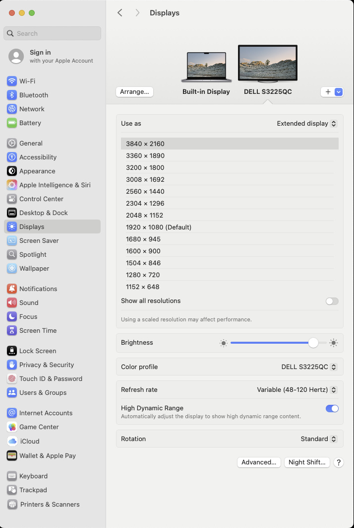 The Dell S3225QC works well with macOS, without any obvious issues. If you're using a MacBook, the 'Desktop,' 'Custom Color HDR,' and 'DisplayHDR True Black' Smart HDR modes look the most accurate compared to the MacBook display. That said, with a USB-C connection, HDR looks undersaturated and SDR looks closer to the laptop's screen. This isn't the case over HDMI, as HDR and SDR content appear as intended.