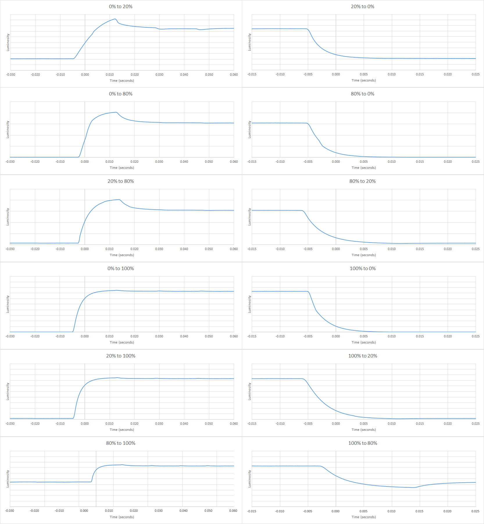 The backlight is dimmed without using any PWM flickering, which is great and produces smooth motion. Unfortunately, there is no option to add flicker using black frame insertion, which would reduce blur further. This isn't that bad though, as many people find 60Hz flicker distracting.