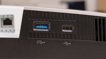 There are two USB-C ports. The one on the bottom edge can only be used for charging up to 15W, while the other supports Thunderbolt 3 with up to 90W power delivery. It's also worth noting that the included USB-B cable has a lower bandwidth than the USB port on the monitor. The port is listed as 10 Gbps while the cable is 5 Gbps, meaning your data speeds will be limited if you choose to use the included cable. There's also an Ethernet port, which is pretty rare. This port works as a pass-through for enterprise users. It can only be used on the primary USB upstream connection, but supports both the USB-A and USB-C upstream ports. If you need the higher bandwidth provided by Thunderbolt 4, check out the LG 40WP95C-W instead.