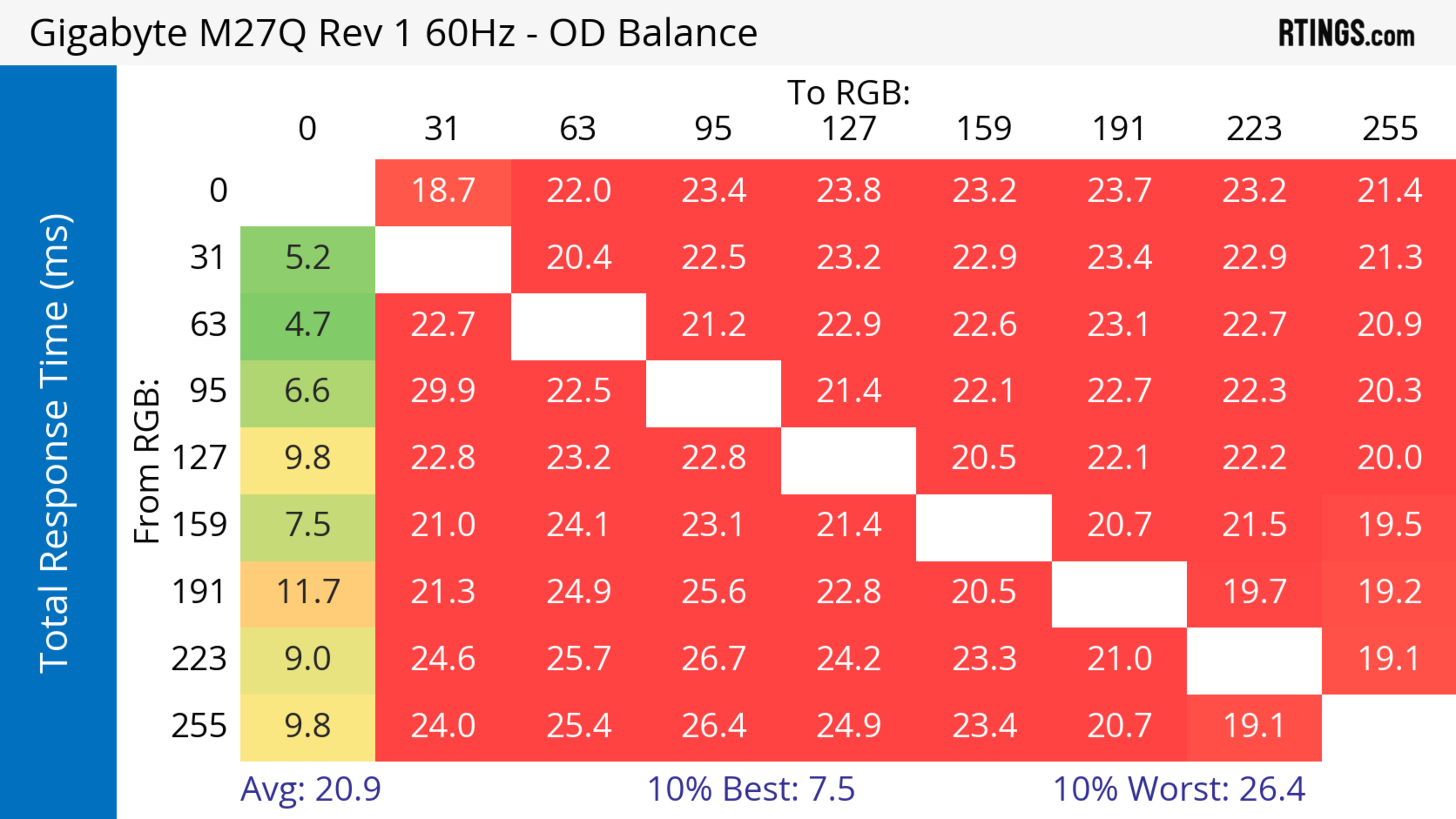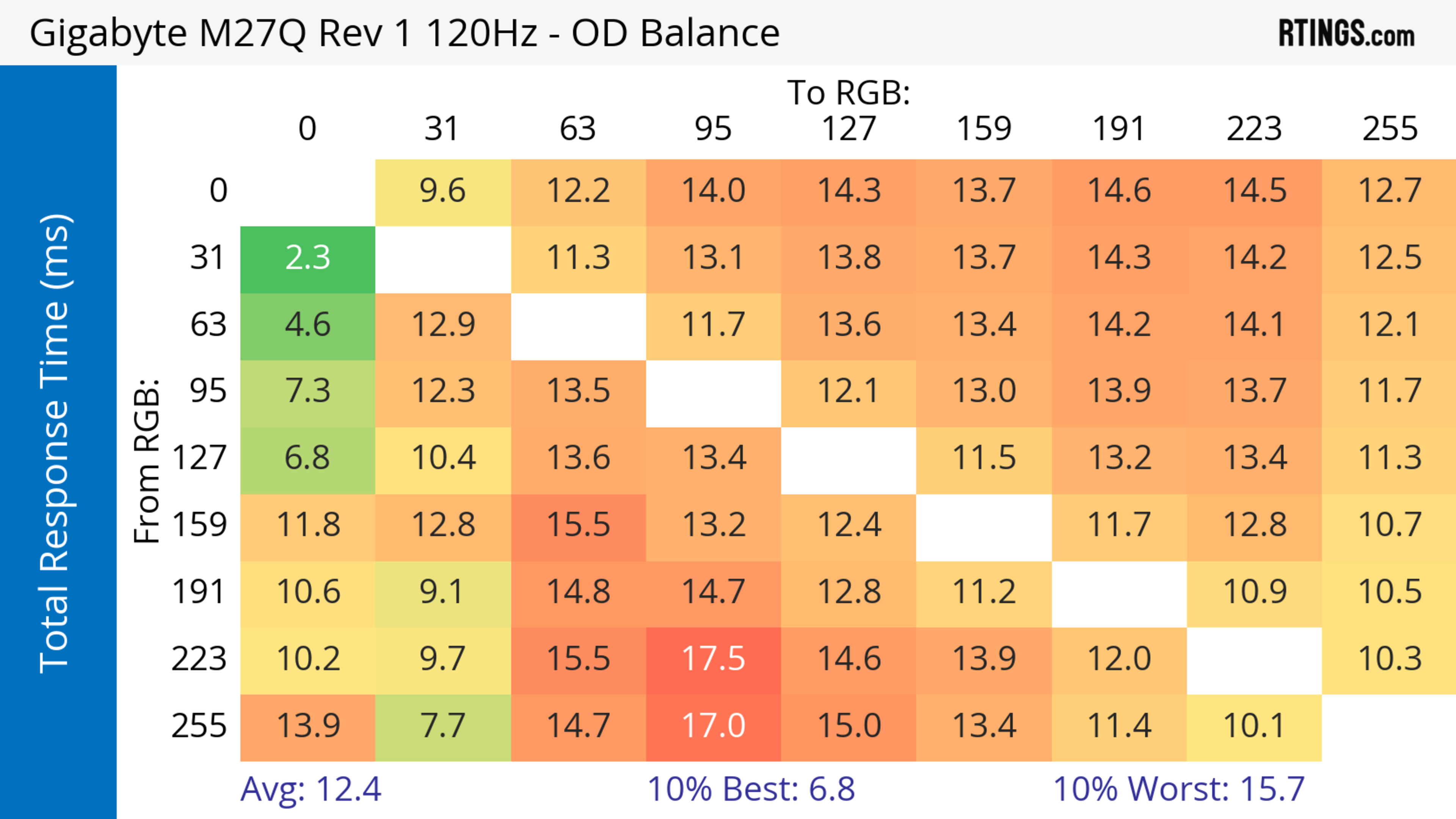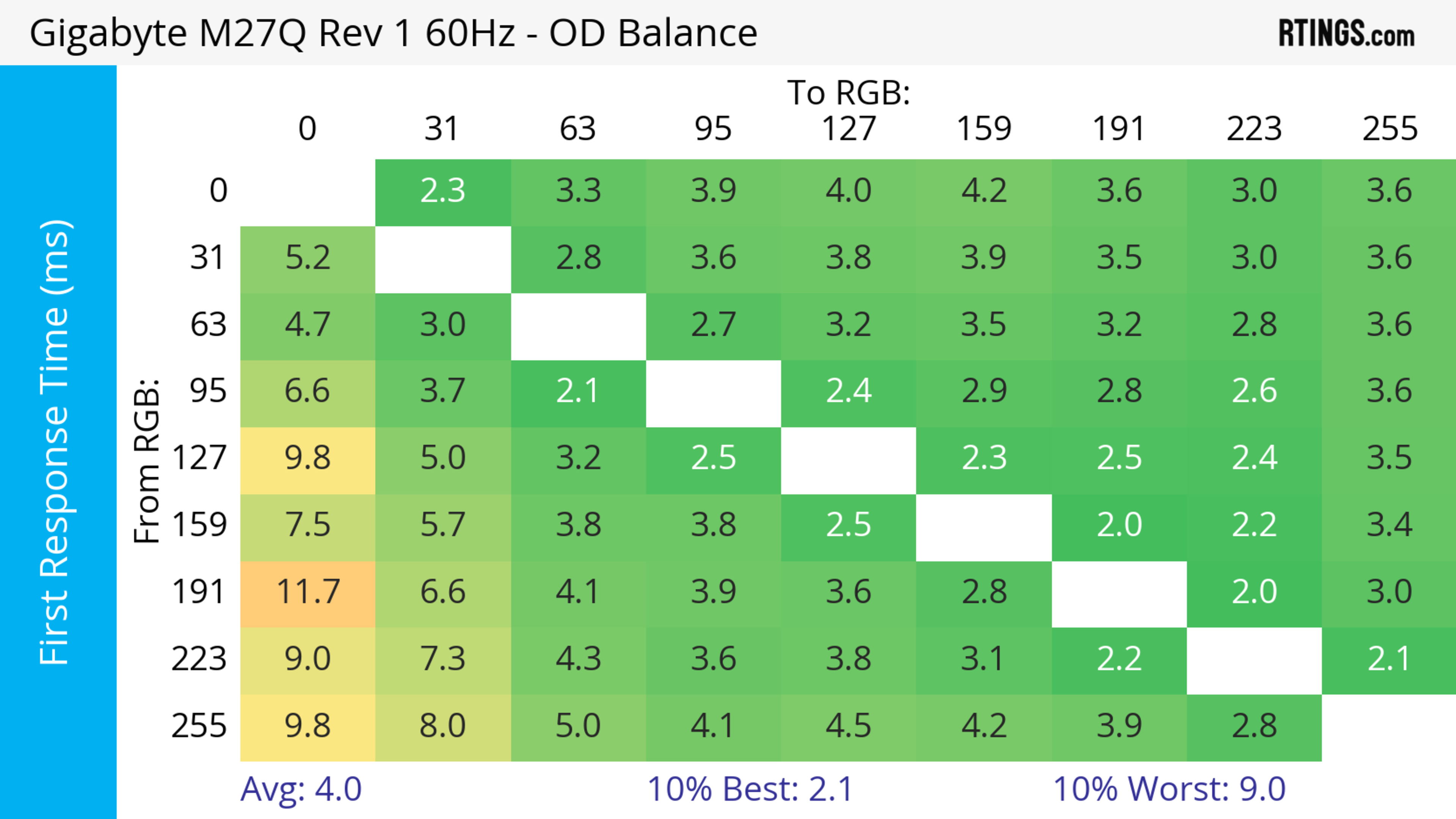 This monitor is the original version of the M27Q, which has a BGR subpixel layout and is different than the newer Gigabyte M27Q (rev. 2.0), which has an RGB subpixel layout. It's unclear which version you'll get when buying from retailers, as they don't specify if it's Rev. 1.0 or Rev. 2.0. The two versions have slightly different designs on the boxes they come with. You can see the box we got with Rev. 1.0 here and the one with Rev. 2.0 here. The biggest difference is that Rev. 1.0 is labeled as '170Hz' on the box, while Rev. 2.0 is labeled as '165Hz,' but each has a max refresh rate of 170Hz. That said, the second version is more available with most retailers.