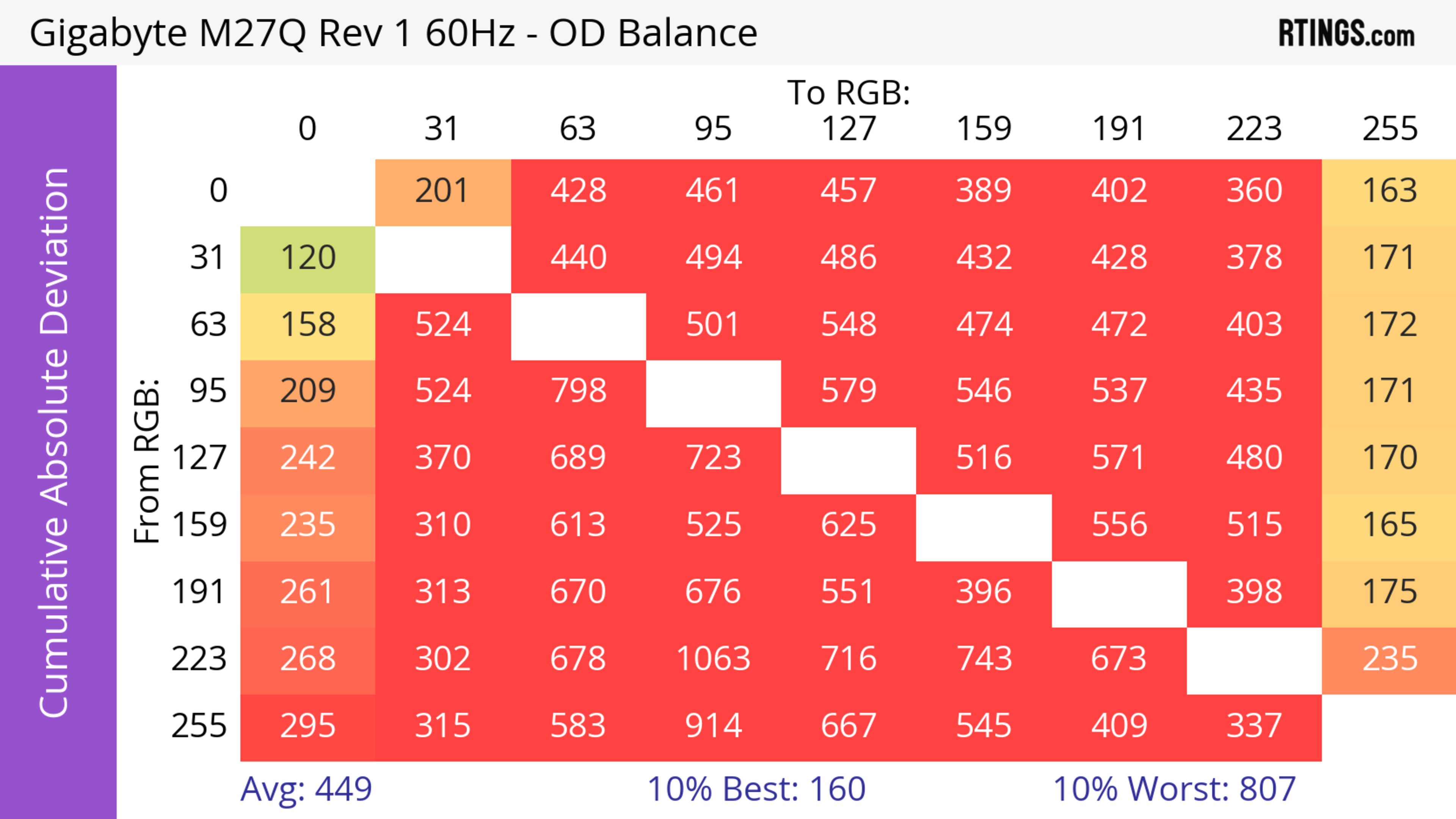 The Giabyte M27Q has decent motion handling across its refresh rate range, but there's still some motion blur with fast-moving objects. The 'Picture Quality' Overdrive setting performs consistently the best, while the other settings get much worse at lower refresh rates. The 'Smart OD' setting acts as a variable overdrive where it's meant to change the overdrive based on the refresh rate, but it performs like 'Balance'.