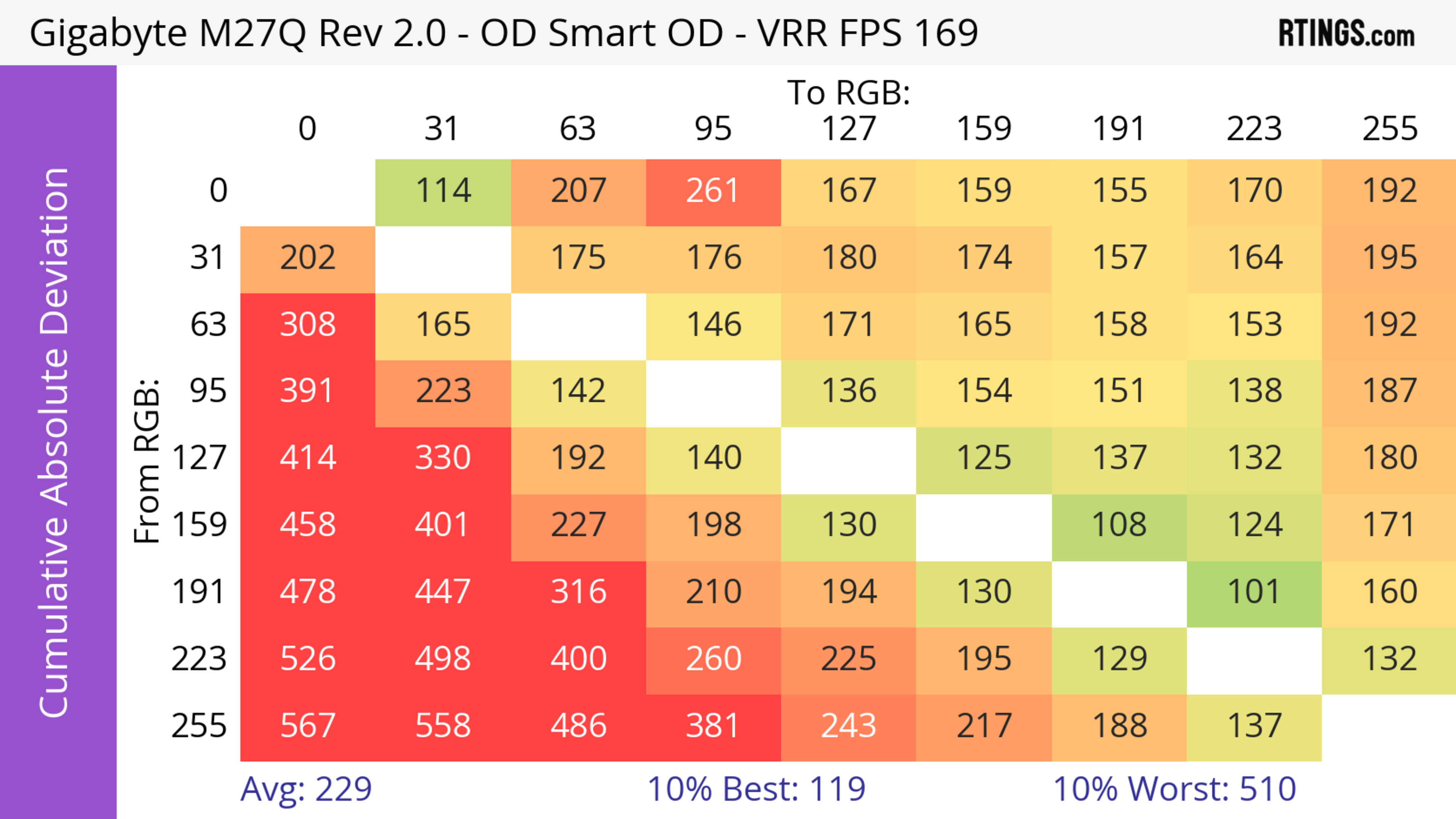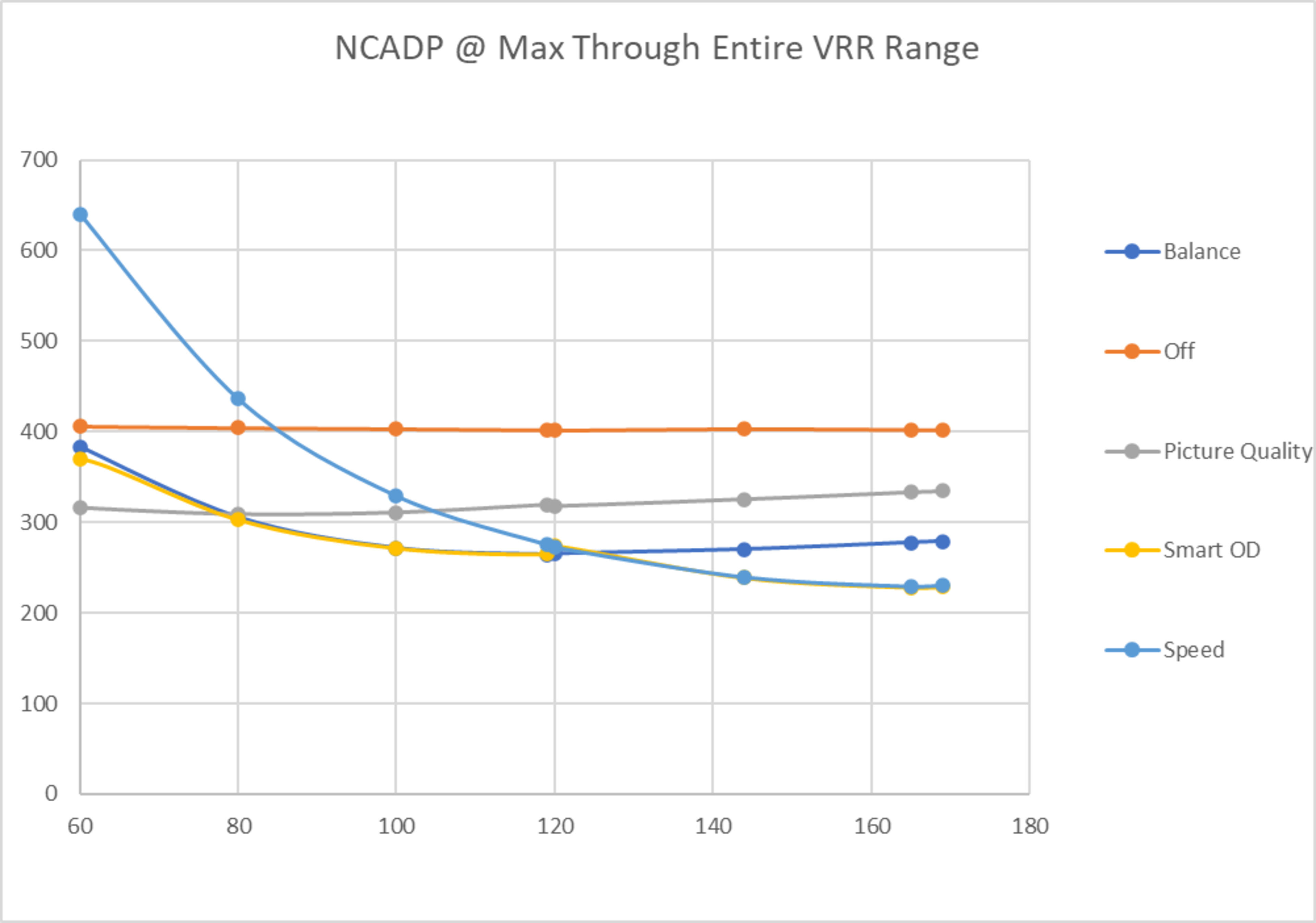 This monitor has okay motion handling across its VRR range. The recommended 'Smart OD' overdrive settings acts as a variable overdrive setting, so it changes its behavior based on the refresh rate. Because of that, 'Smart OD' performs like the 'Speed' overdrive setting at high refresh rates, and it's more similar to 'Balance' below 120 fps. That said, motion still looks blurry with any of the overdrive settings, and some of them have such high CAD that they pass the limits of the chart. You can see an alternative chart here.