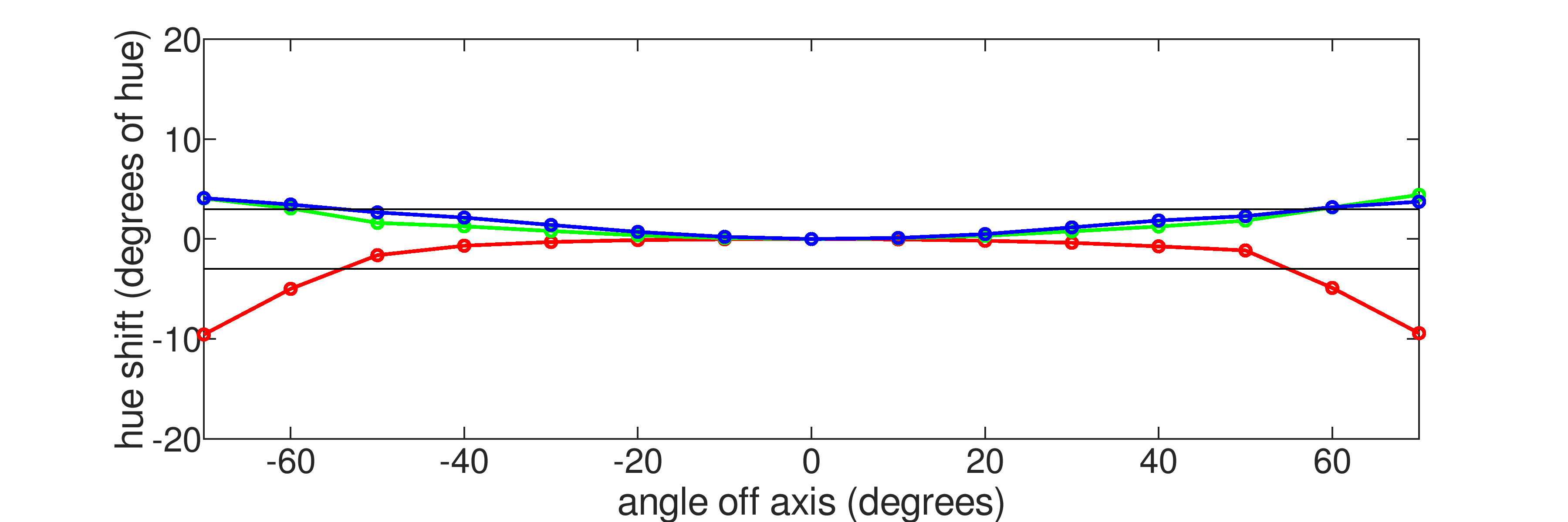 The HP 27f has decent horizontal viewing angles, typical for IPS monitors. Colors remain accurate up to about 40°, and then they rapidly oversaturate. The brightness drops gradually as you move away from the center but remains within acceptable limits up to 47°, and the black levels remain accurate at any viewing angle.