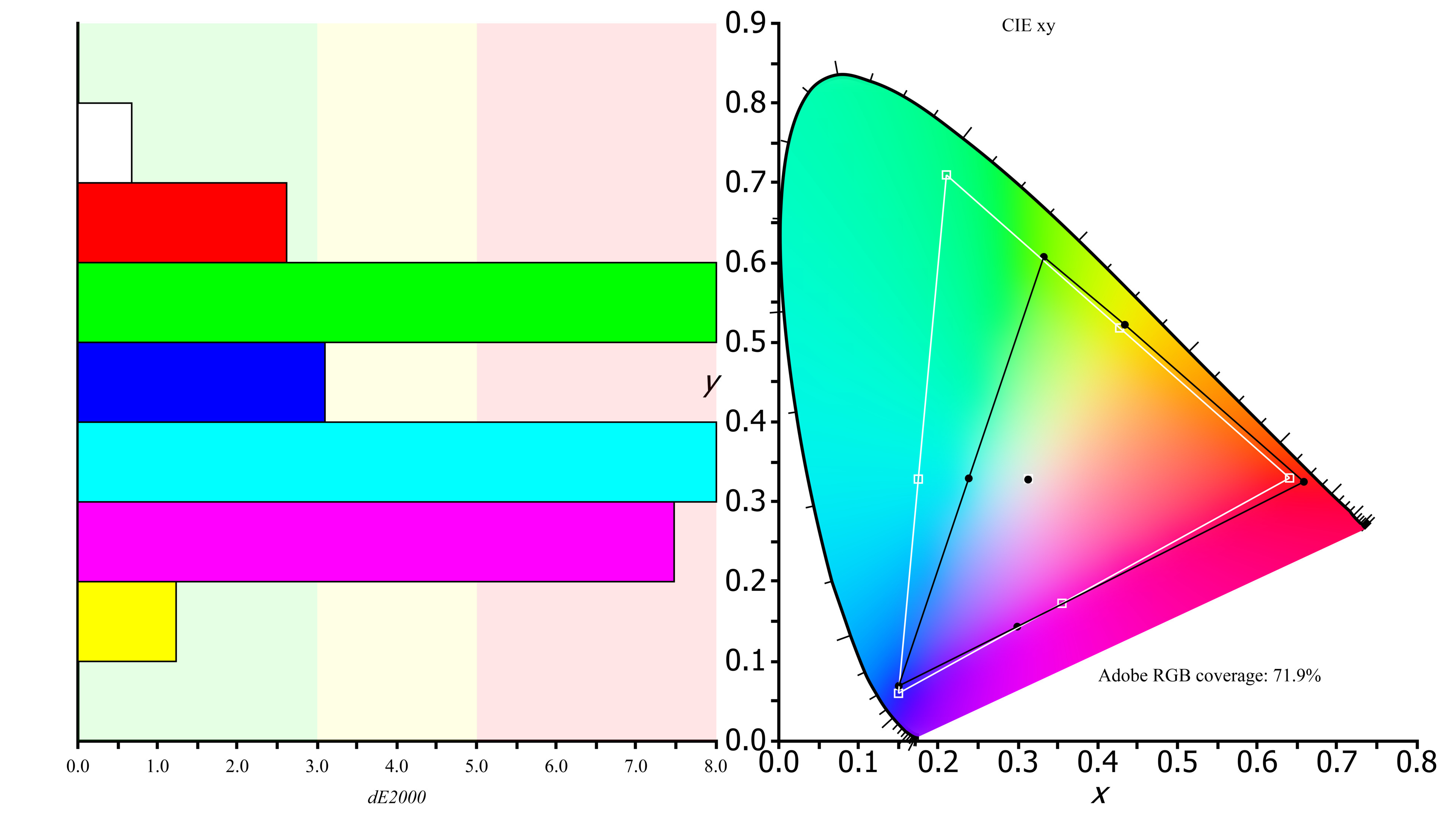 In the wider Adobe RGB color space, it has good color volume. Like with s.RGB, it is limited by the mediocre contrast ratio, so it can't produce deep, dark colors very well.