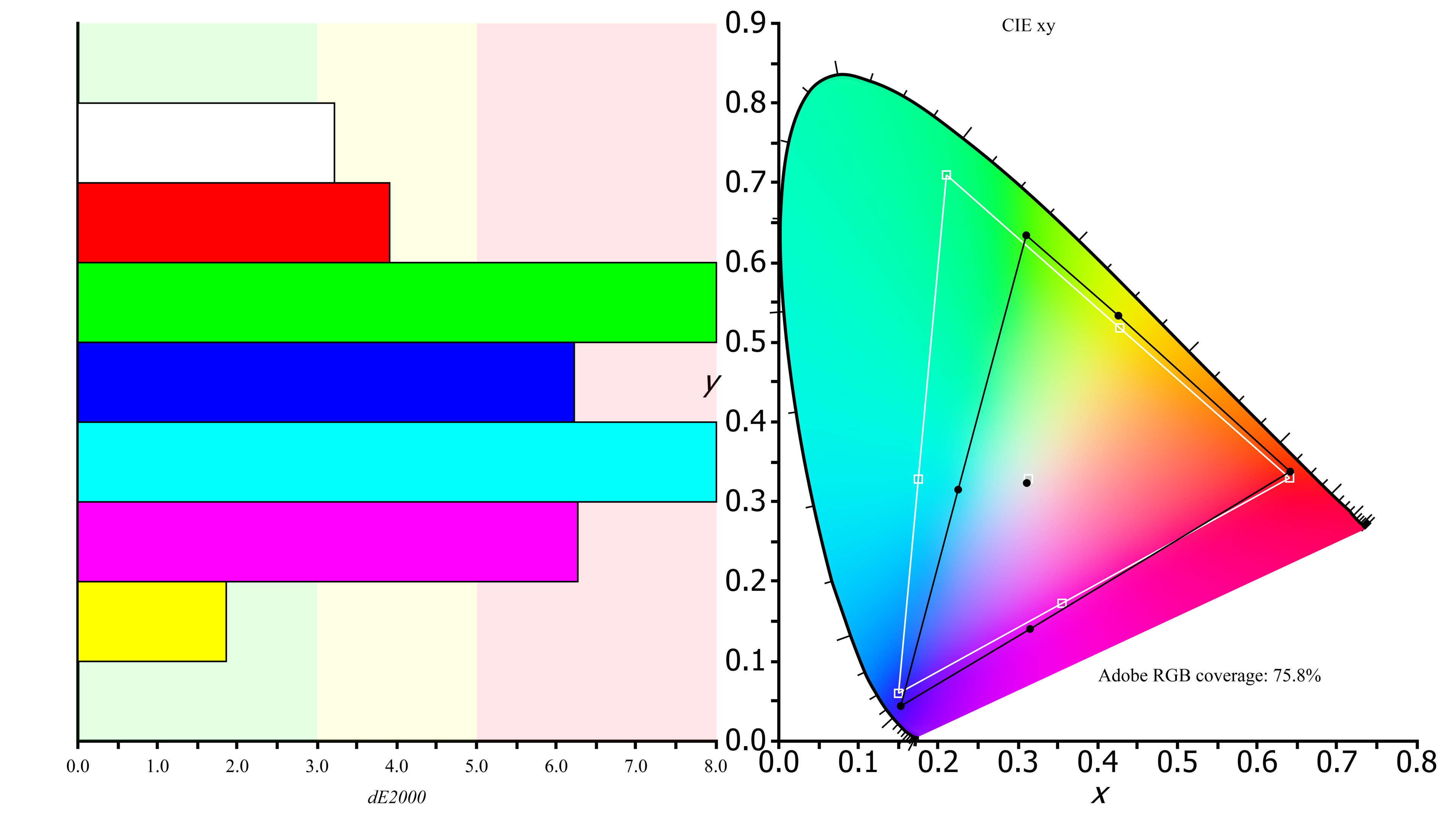 Excellent coverage of the s.RGB color volume mainly due to the excellent color gamut. On the contrary, the coverage of the Adobe RGB color volume that is used in the publishing media is not enough for those professionals out there.