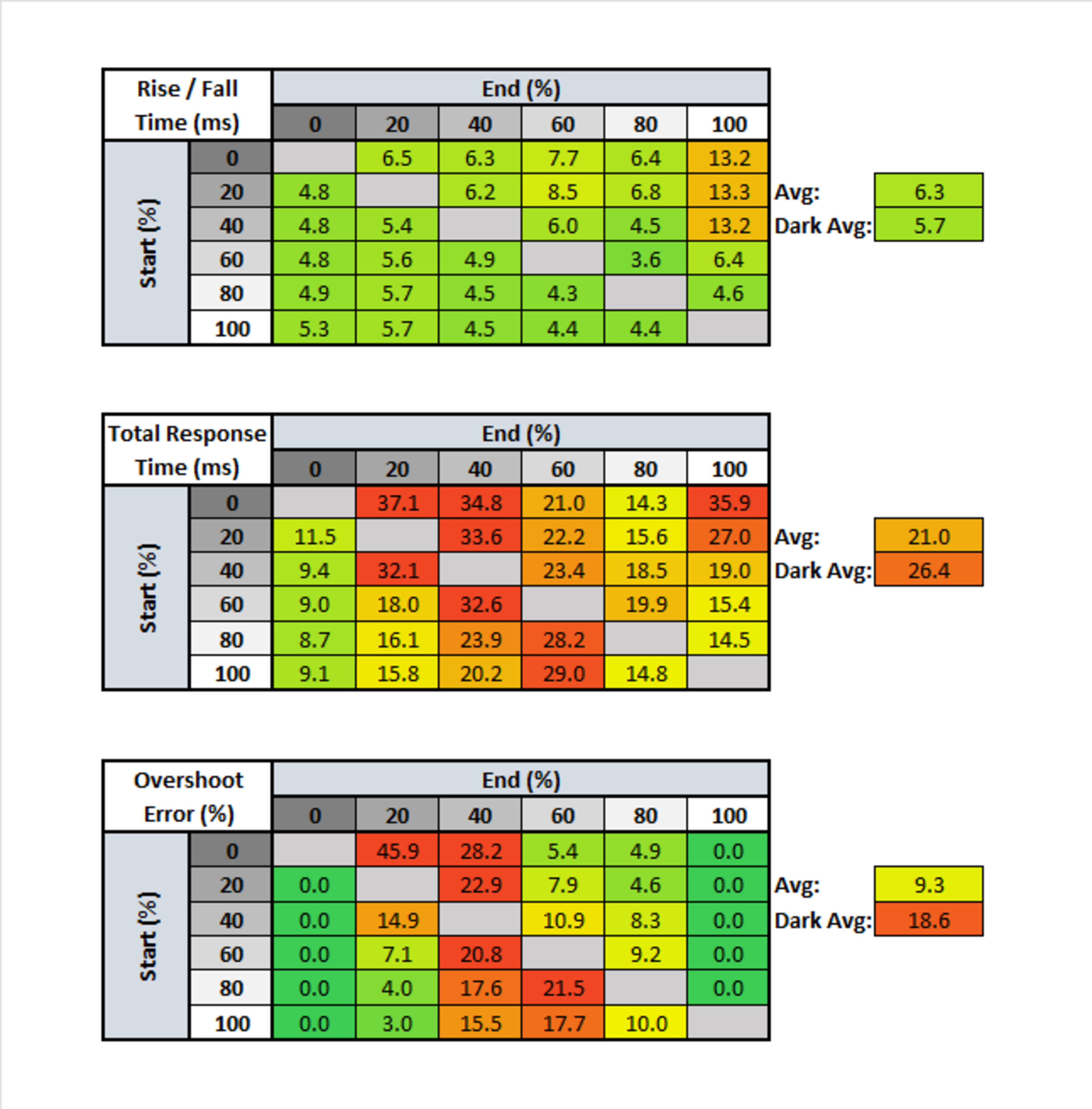 The response time at 60Hz is just alright. The rise/fall time is about the same as the max refresh rate, but there's significantly more overshoot in most transitions, resulting in more inverse ghosting and a much slower total response time. Again, we recommend the 'Off' Over Drive setting, as there's way too much overshoot in any other mode.