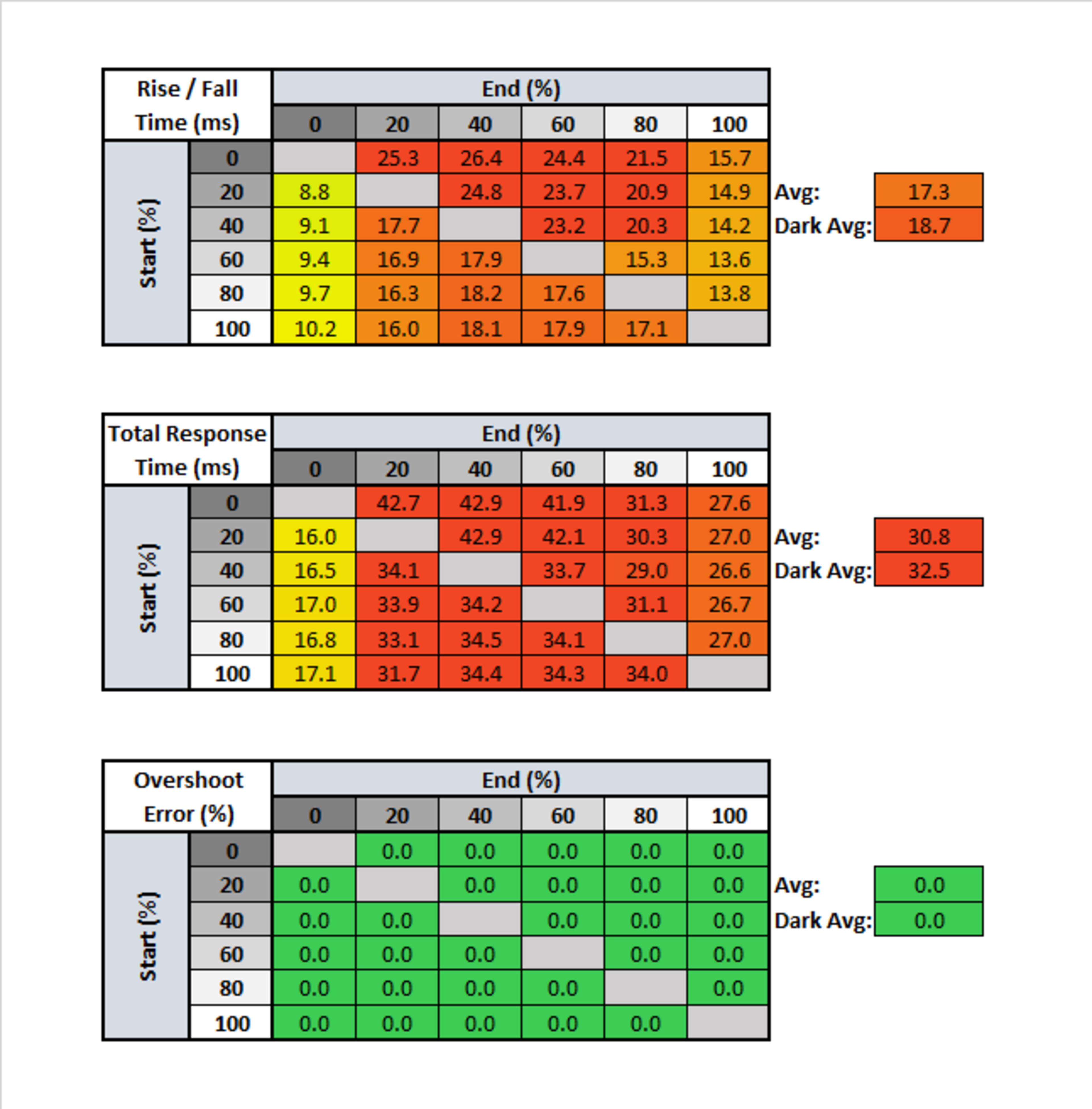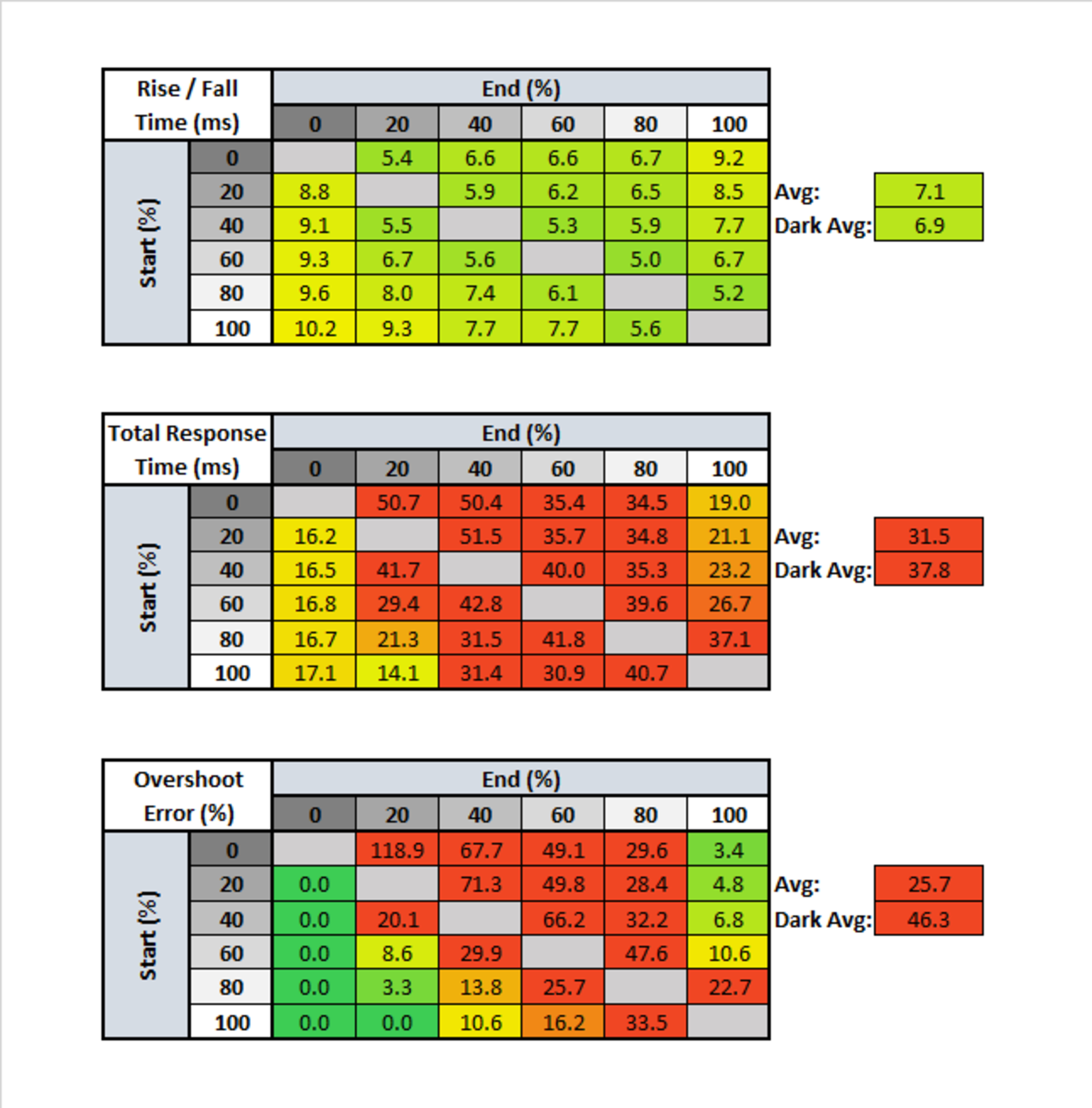 | Overdrive Setting | Response Time Chart | Response Time Tables | Motion Blur Photo |