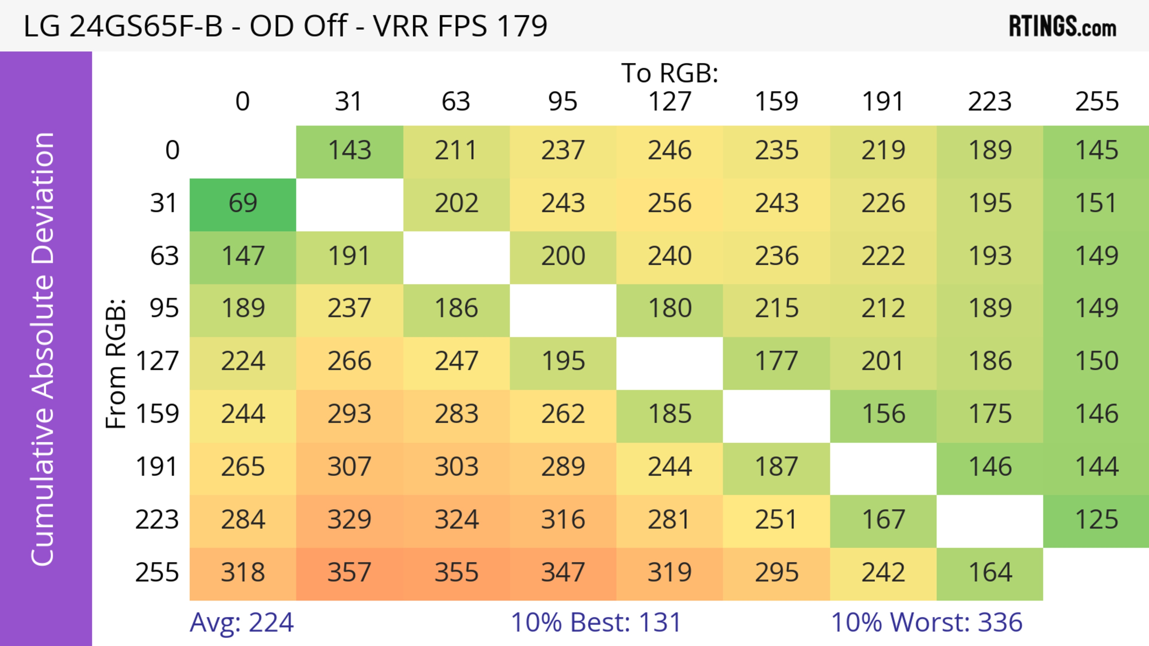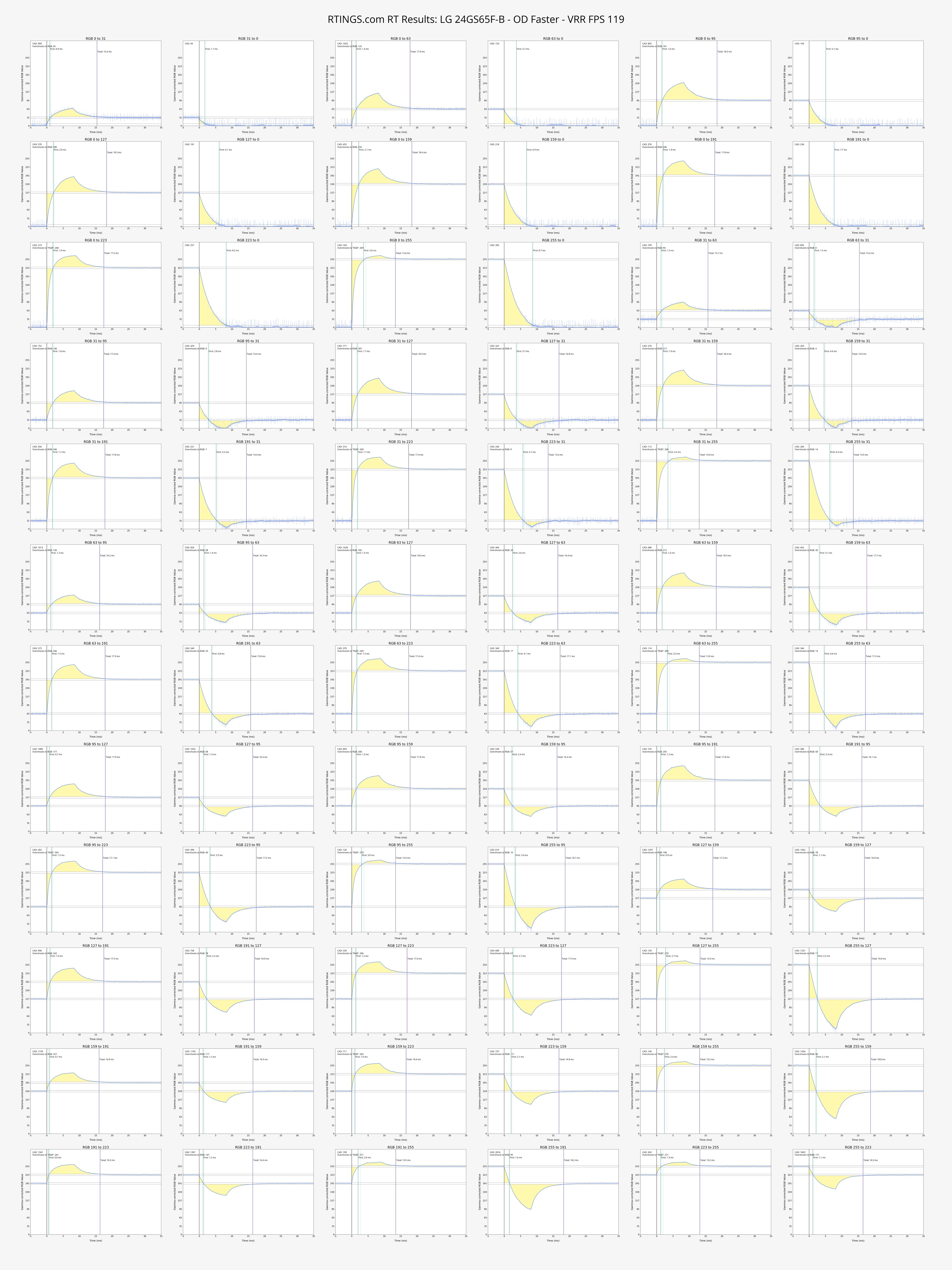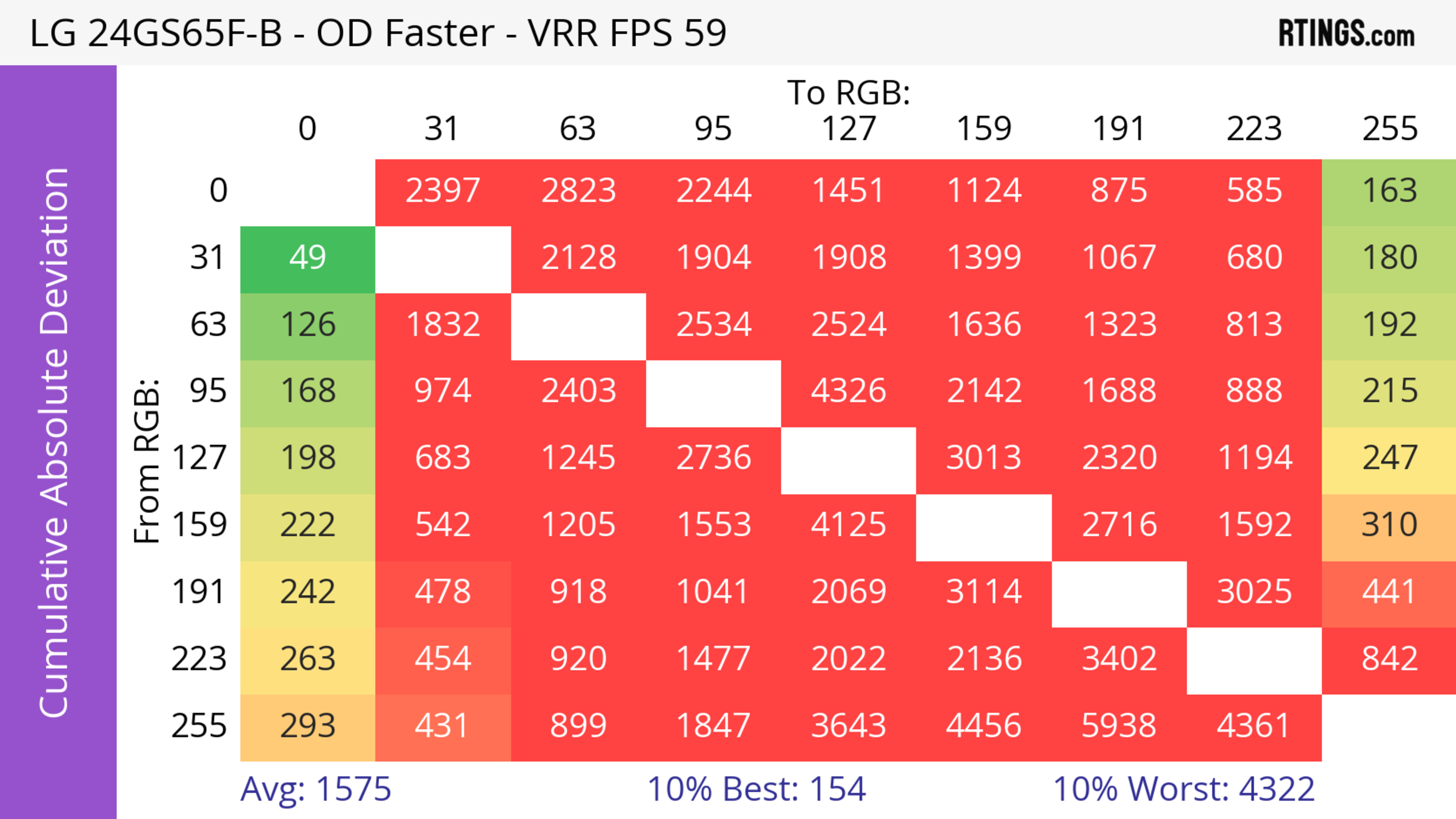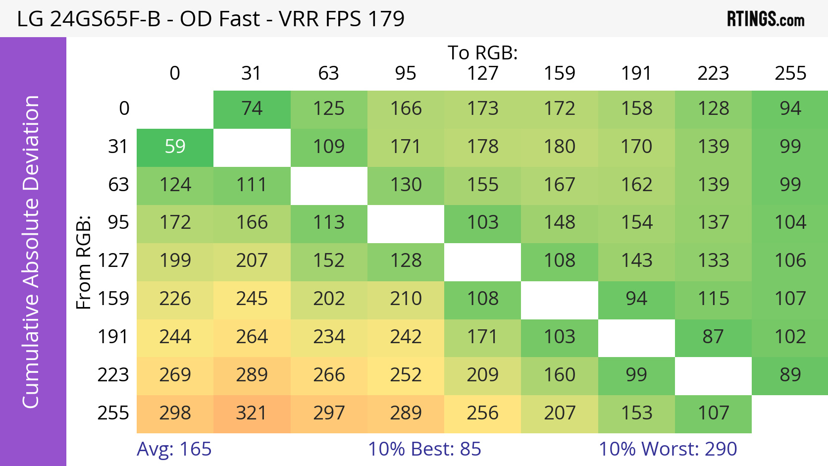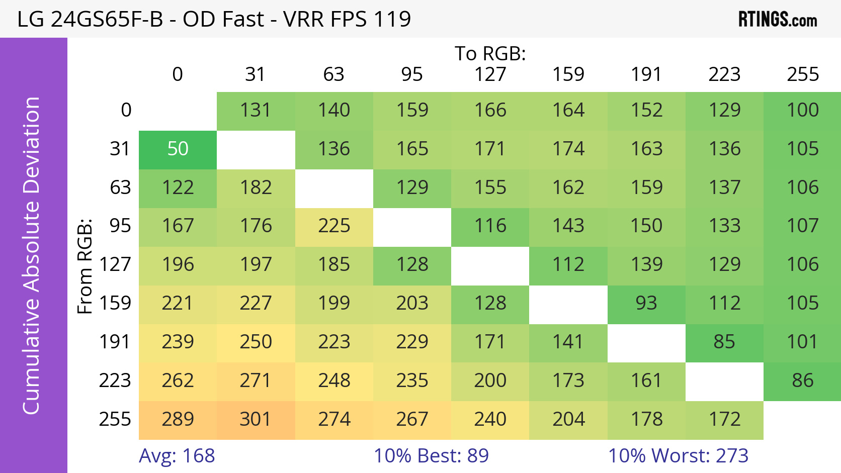 The LG 24GS65F-B has good motion handling across its VRR range. The 'Fast' Response Time setting performs the best at most refresh rates, with only a bit of blur, but it has more inverse ghosting than 'Normal' and 'Off' at low refresh rates. The 'Faster' setting has such high CAD that it passes the limits of our chart, which you can see in an alternative graph.