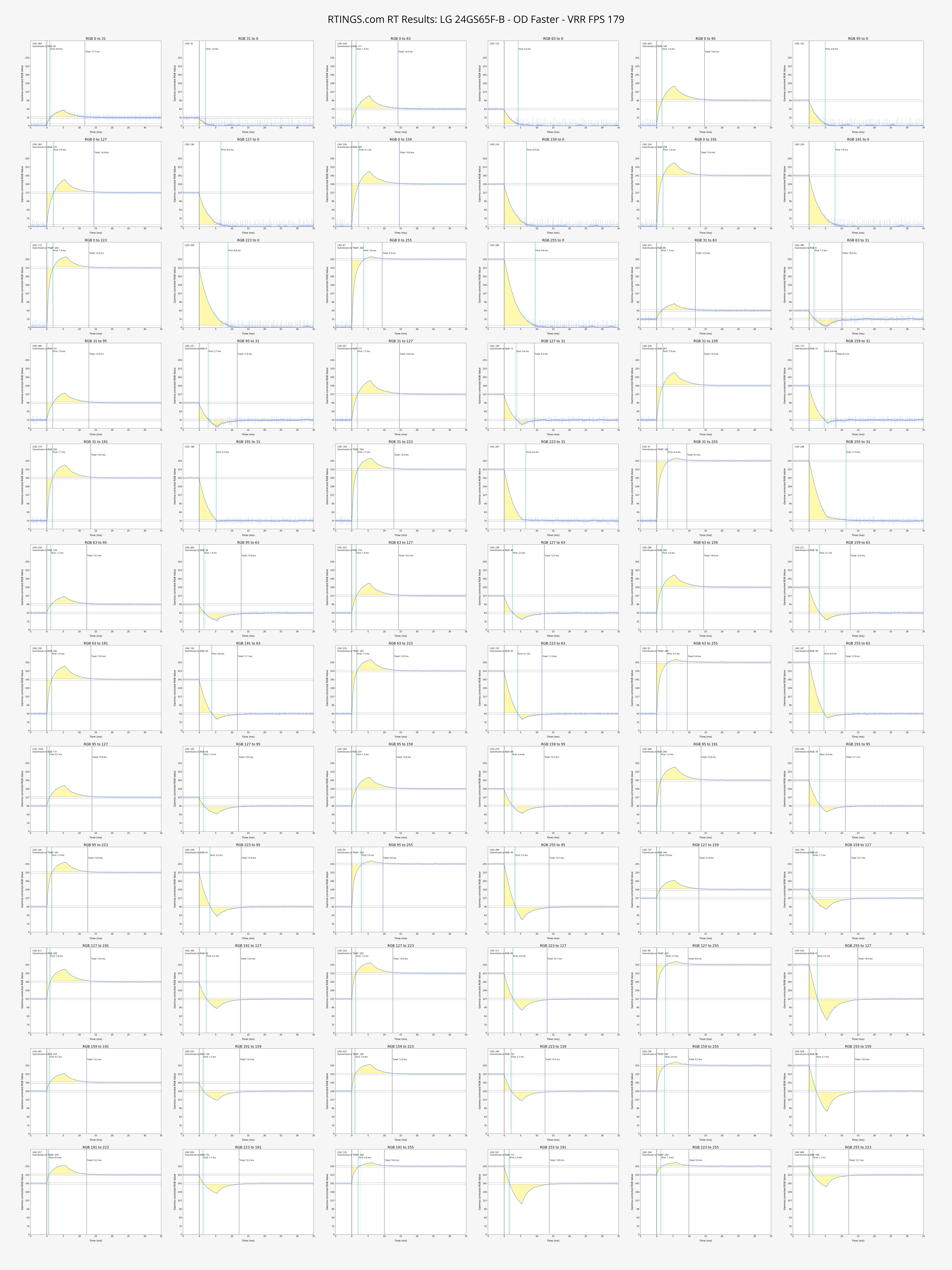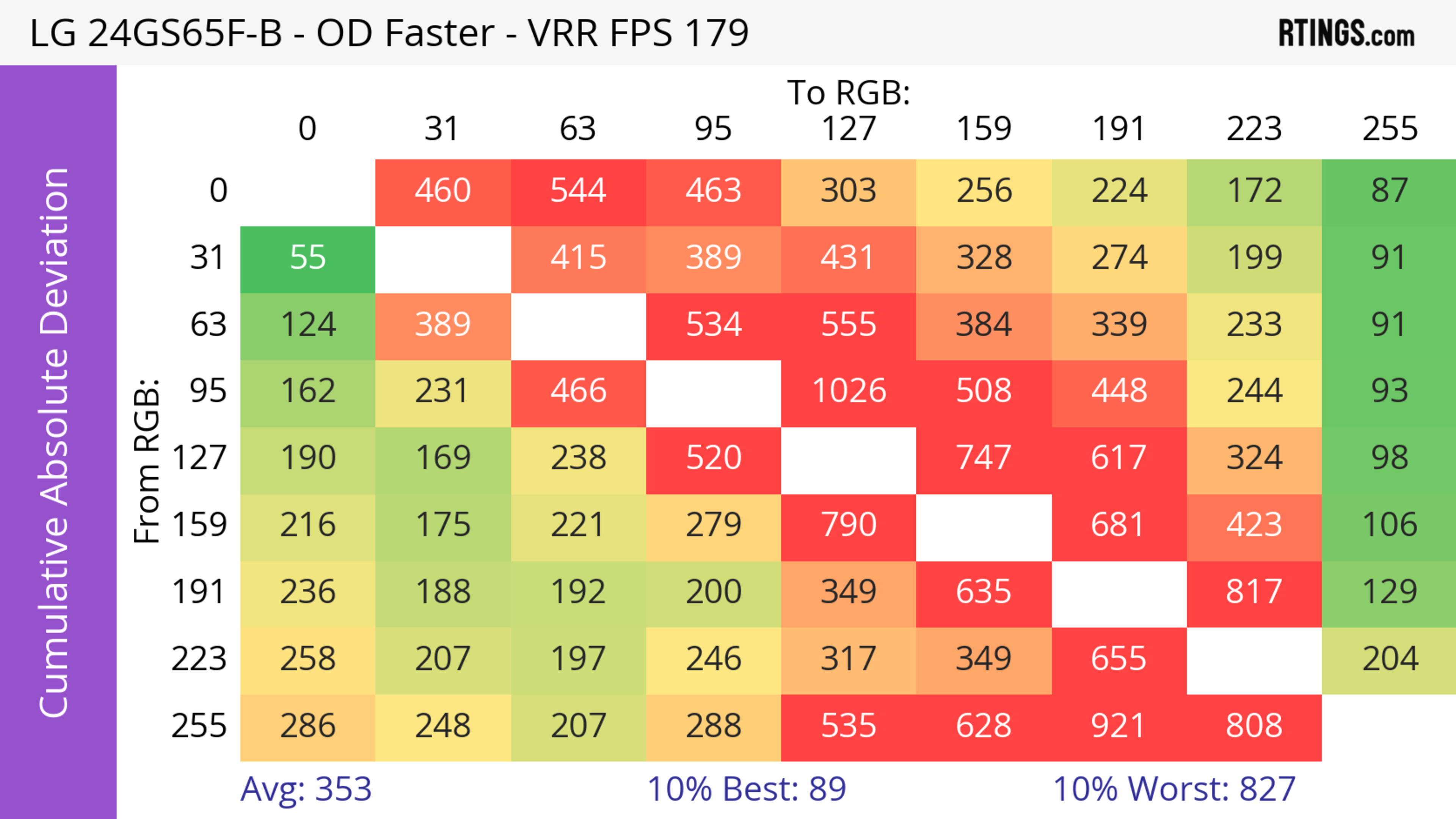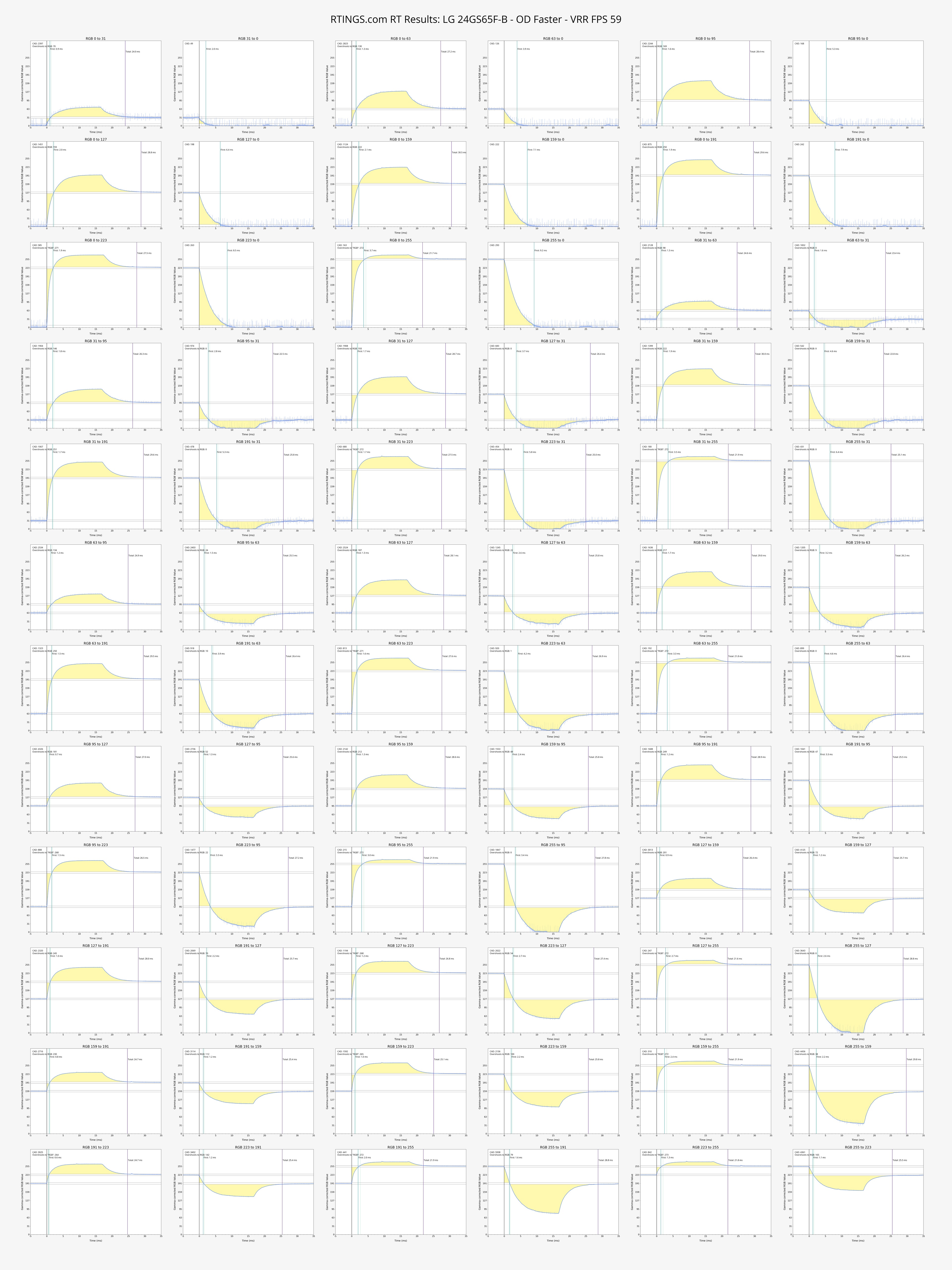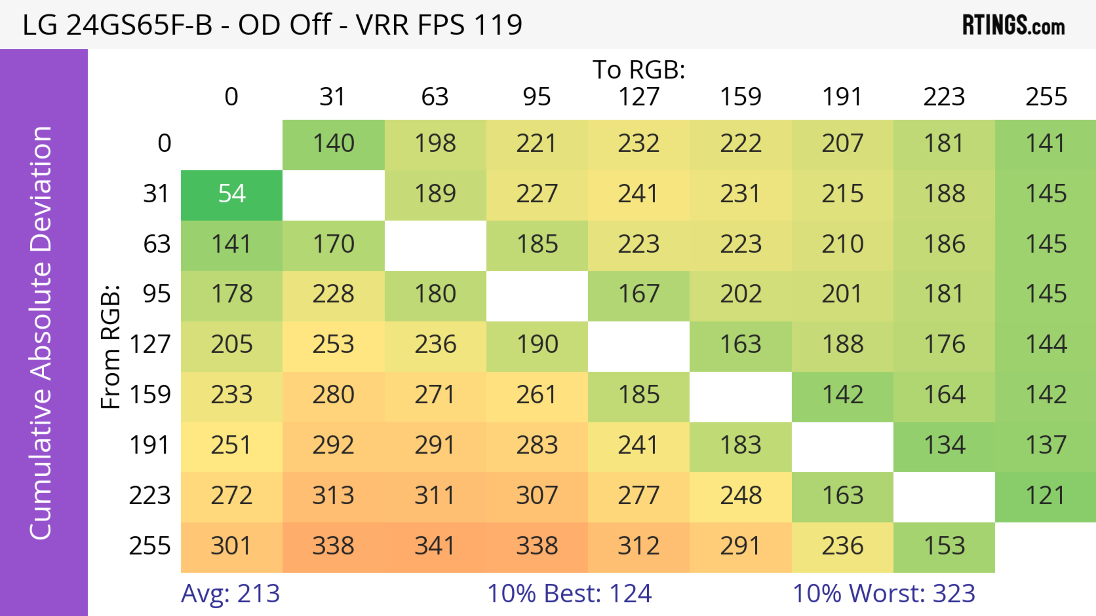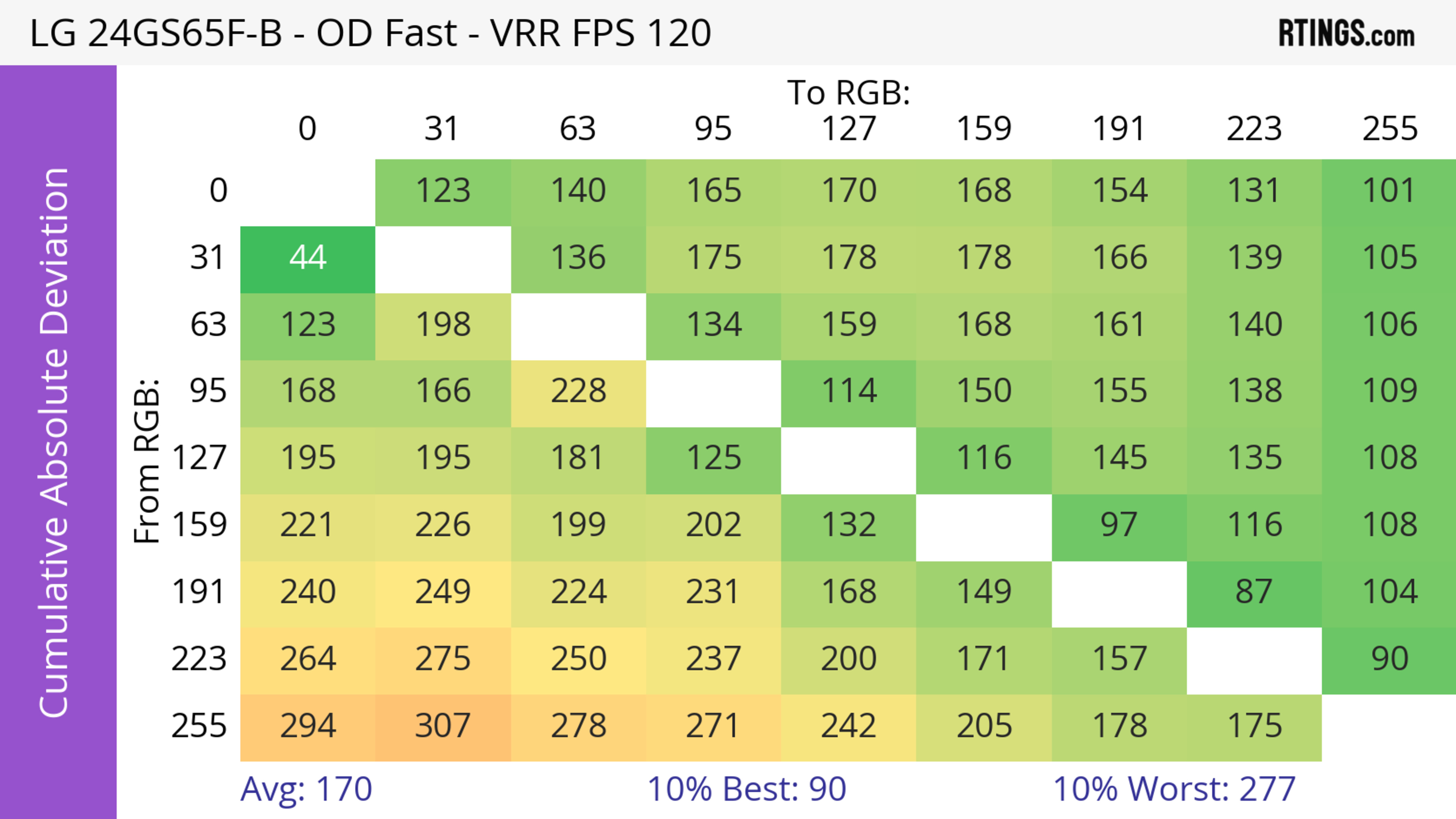 The LG 24GS65F-B has good motion handling across its VRR range. The 'Fast' Response Time setting performs the best at most refresh rates, with only a bit of blur, but it has more inverse ghosting than 'Normal' and 'Off' at low refresh rates. The 'Faster' setting has such high CAD that it passes the limits of our chart, which you can see in an alternative graph.