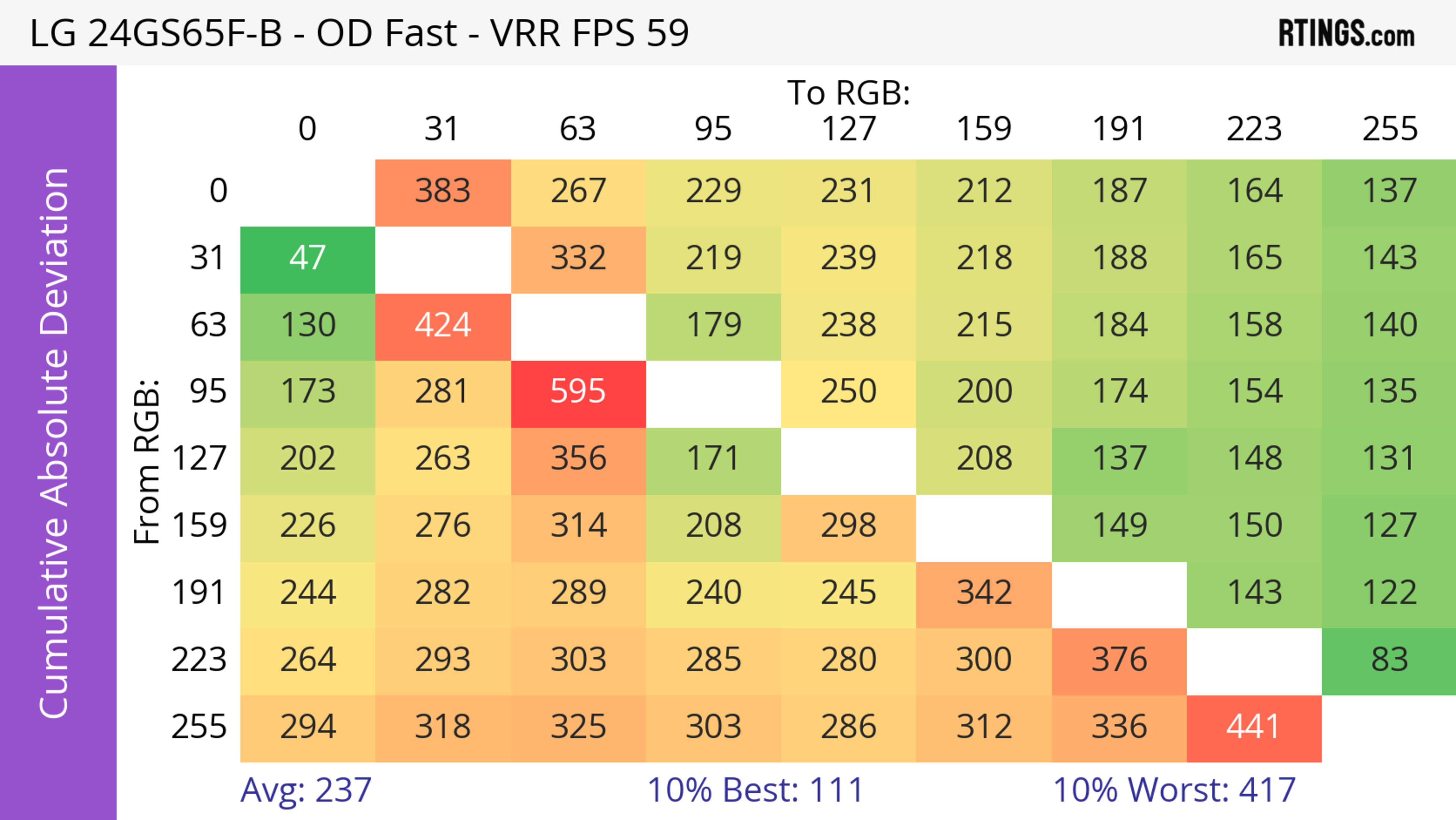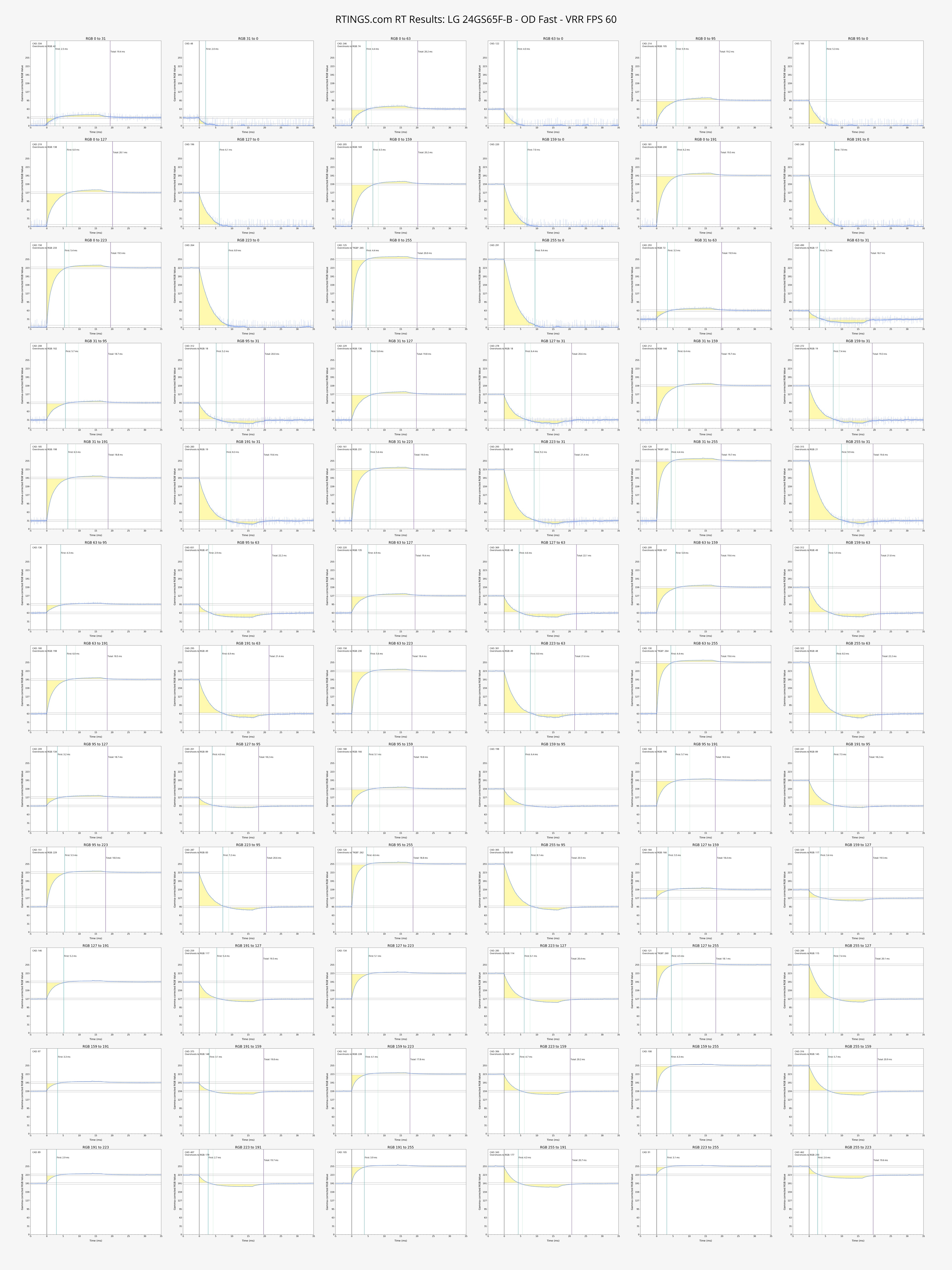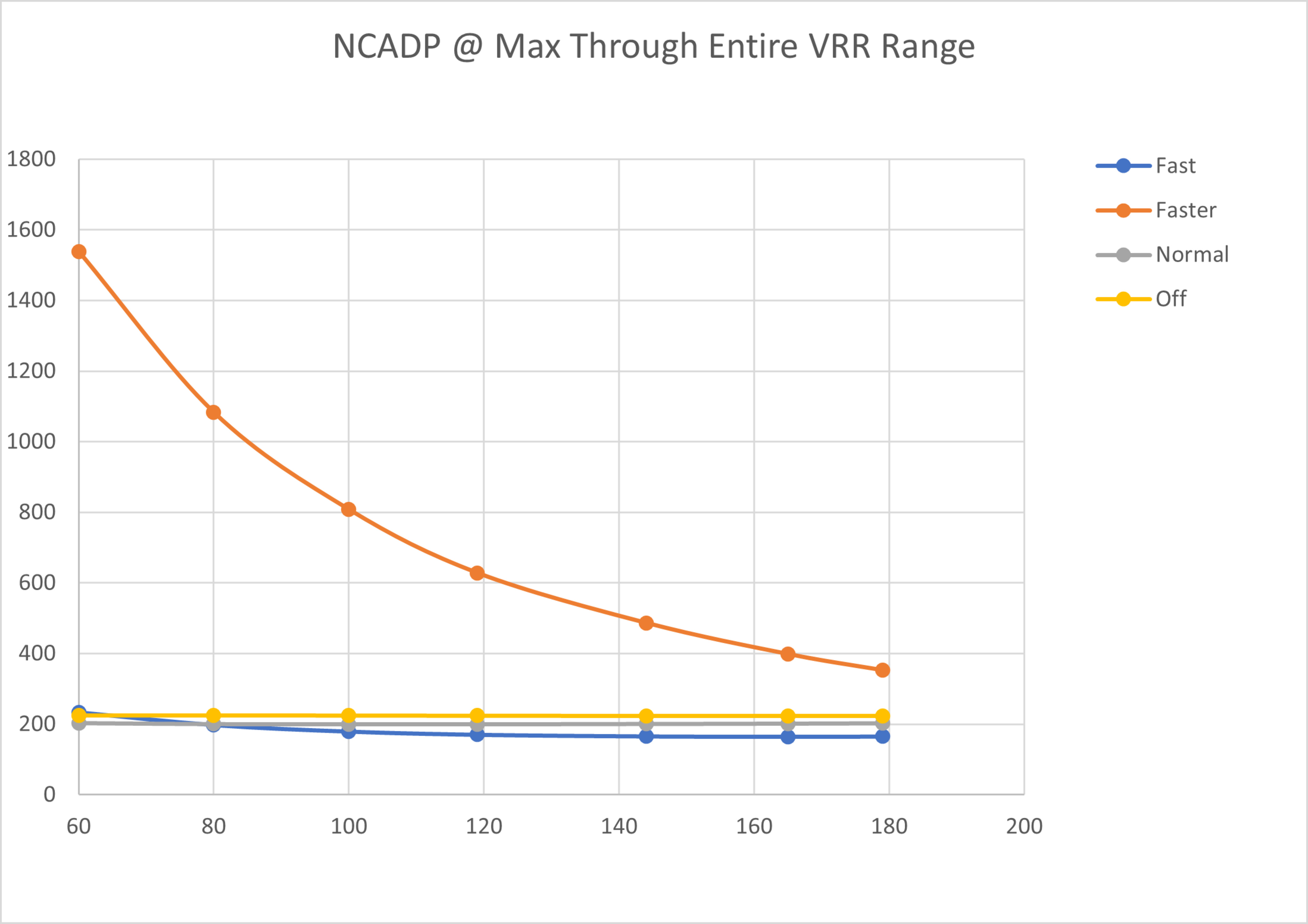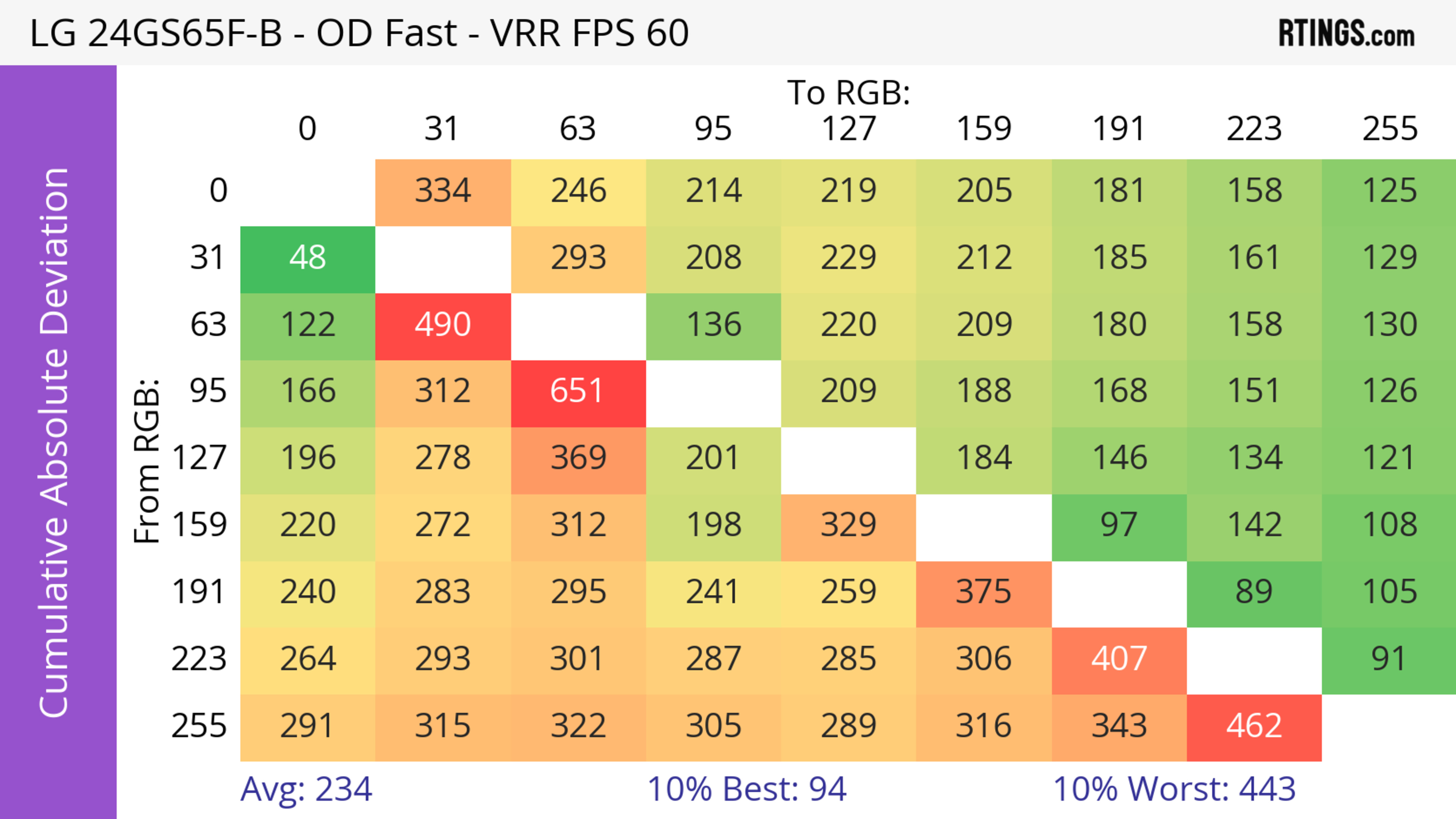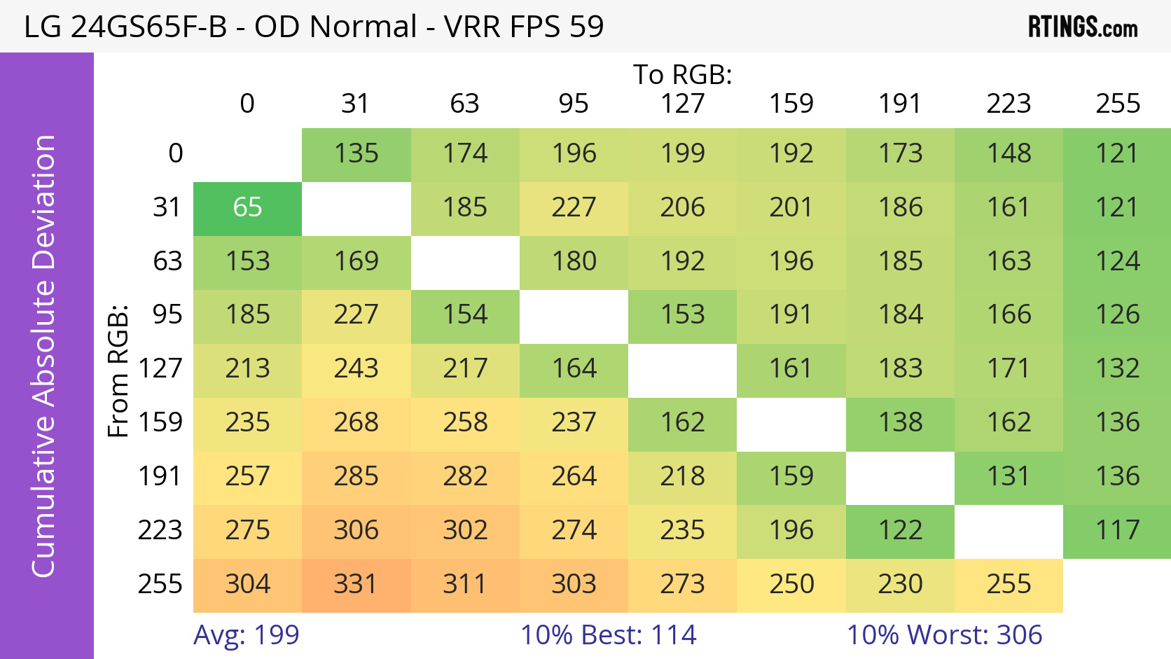 The LG 24GS65F-B has good motion handling across its VRR range. The 'Fast' Response Time setting performs the best at most refresh rates, with only a bit of blur, but it has more inverse ghosting than 'Normal' and 'Off' at low refresh rates. The 'Faster' setting has such high CAD that it passes the limits of our chart, which you can see in an alternative graph.