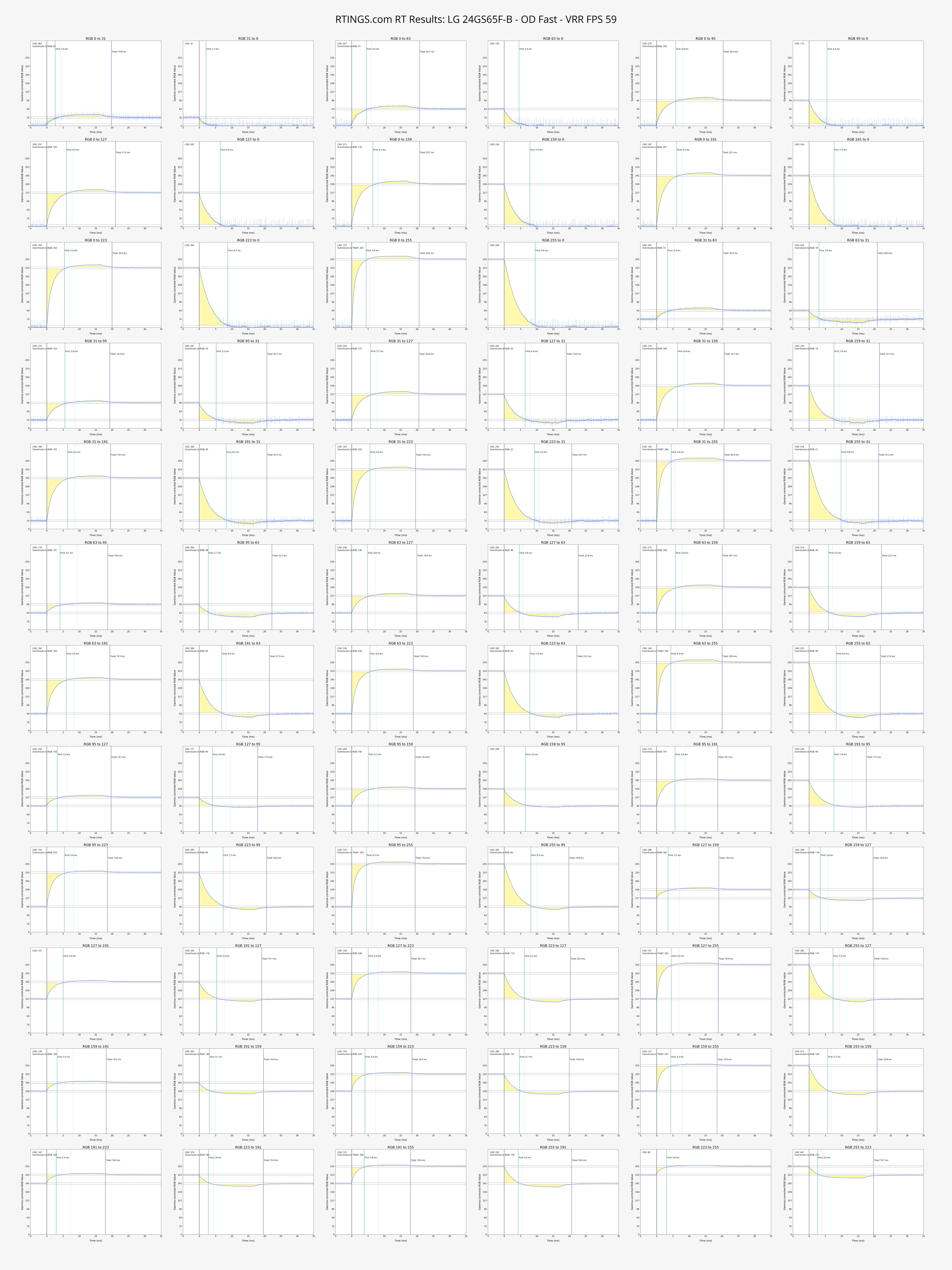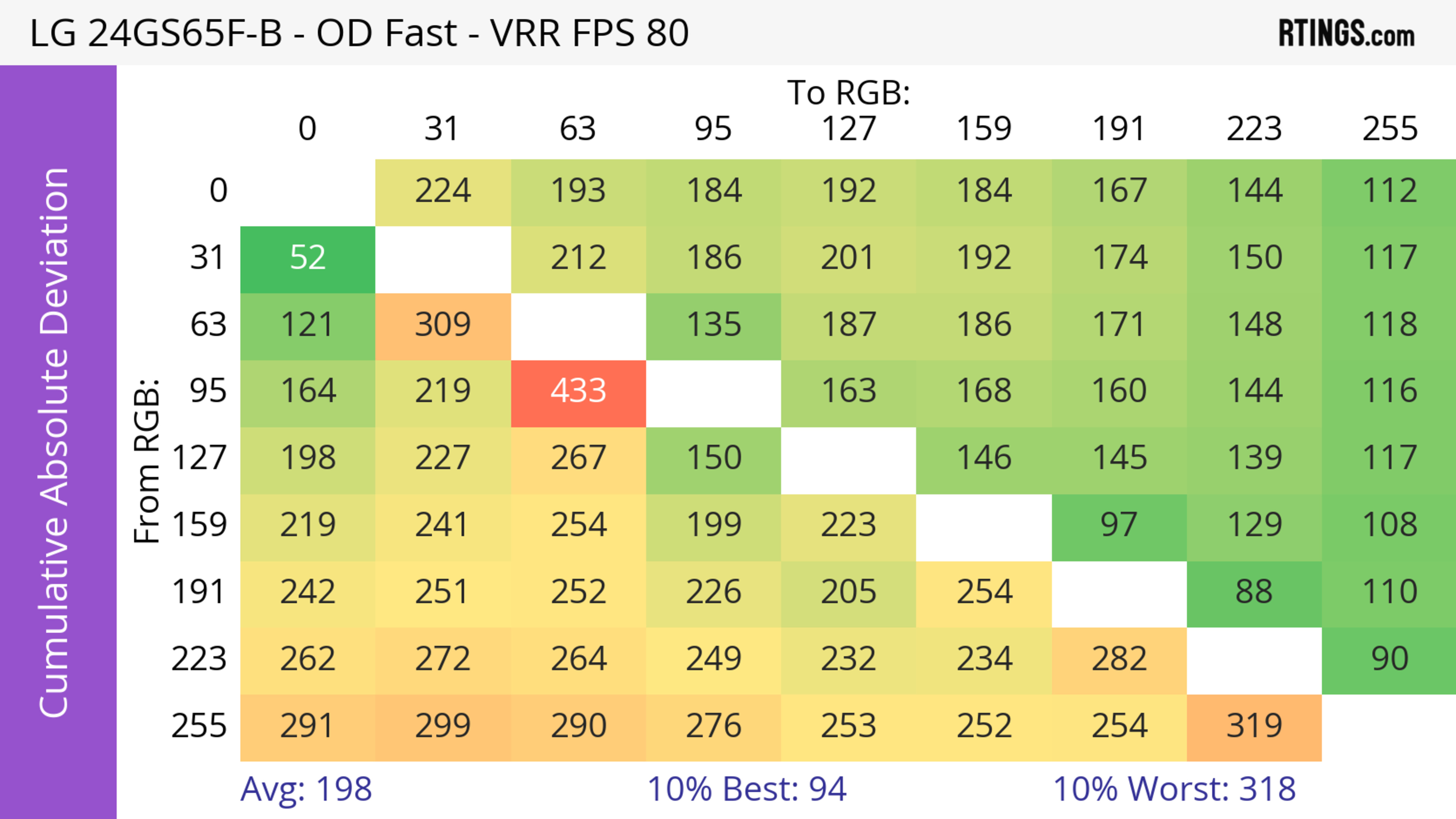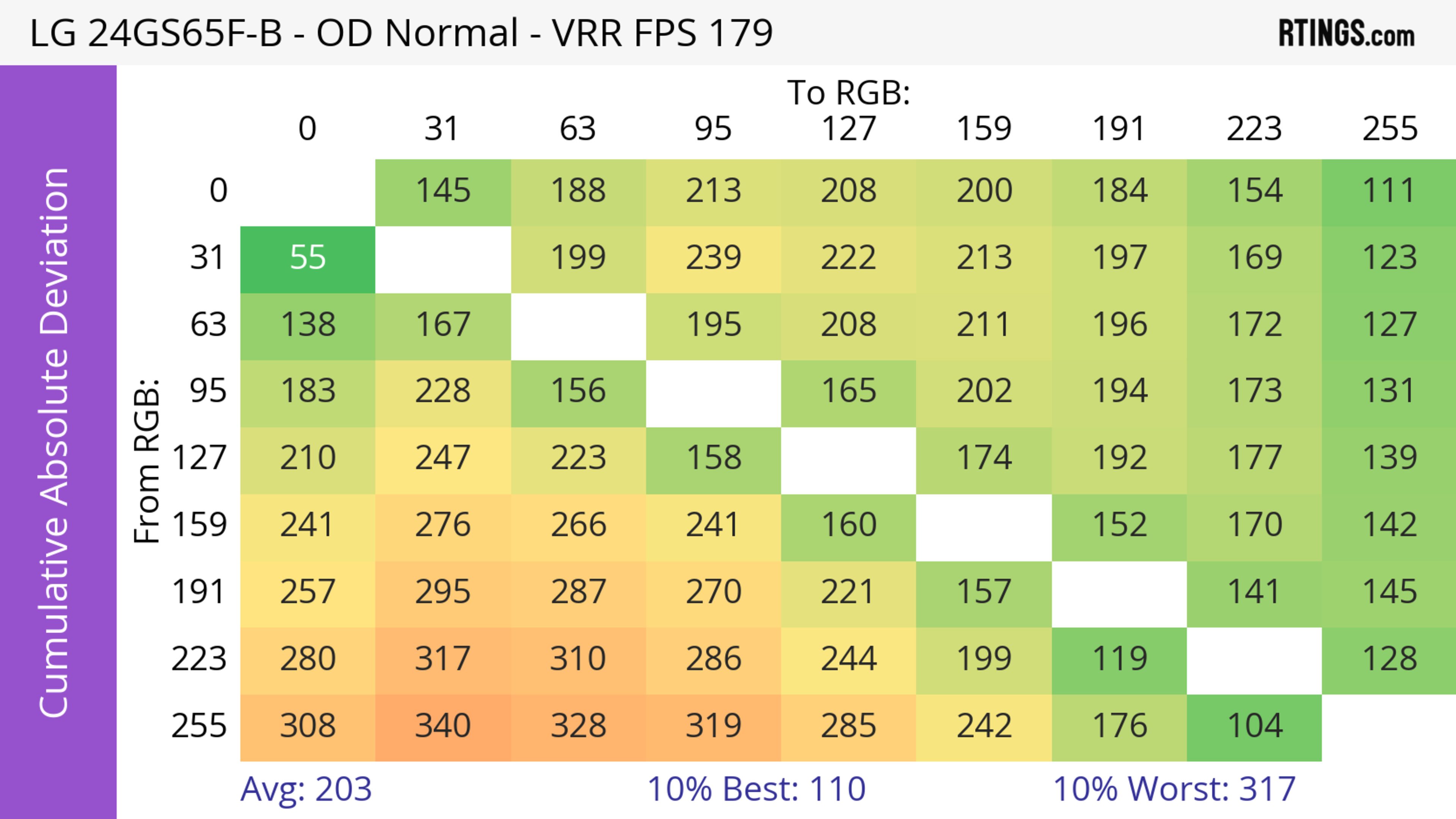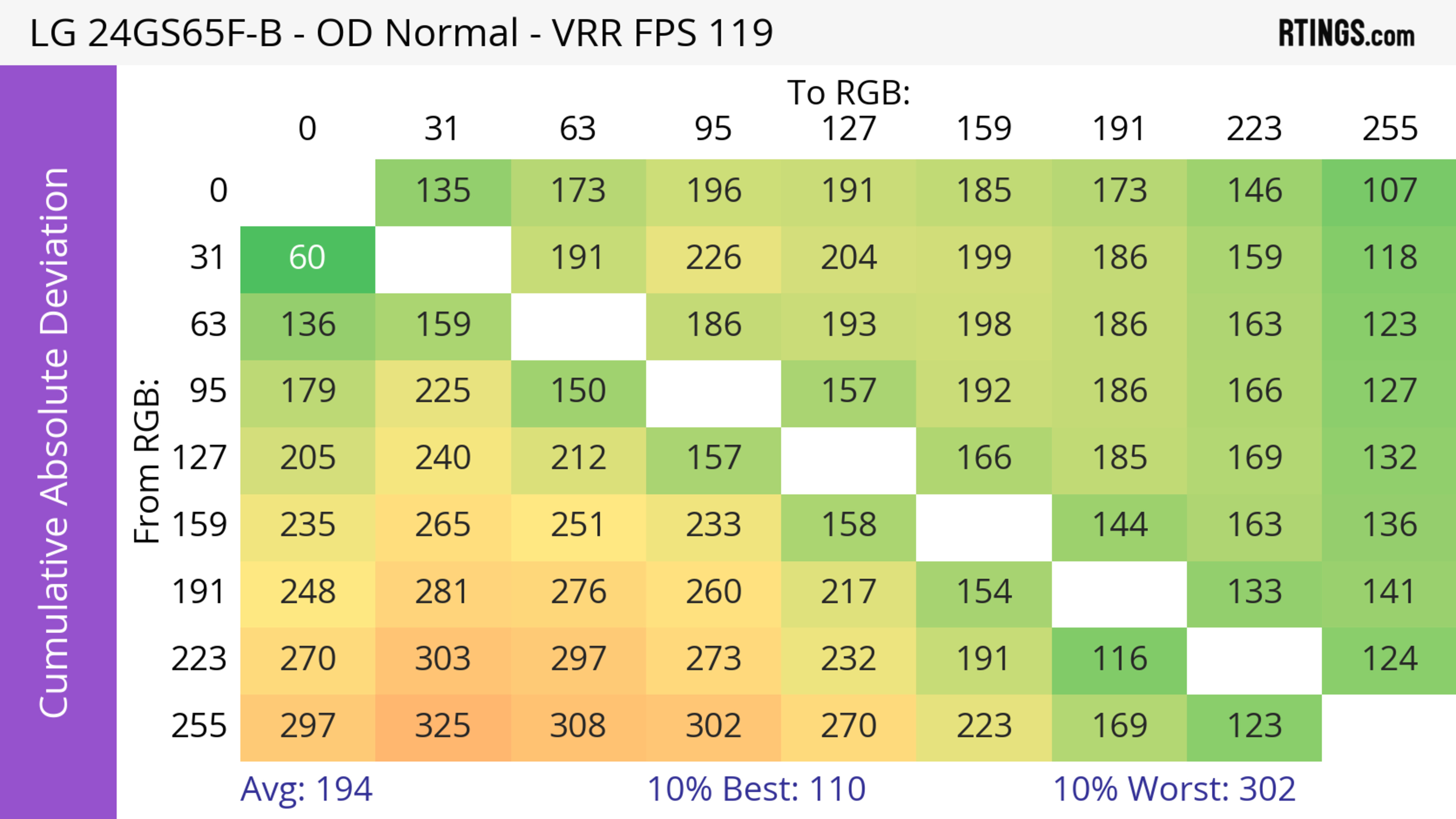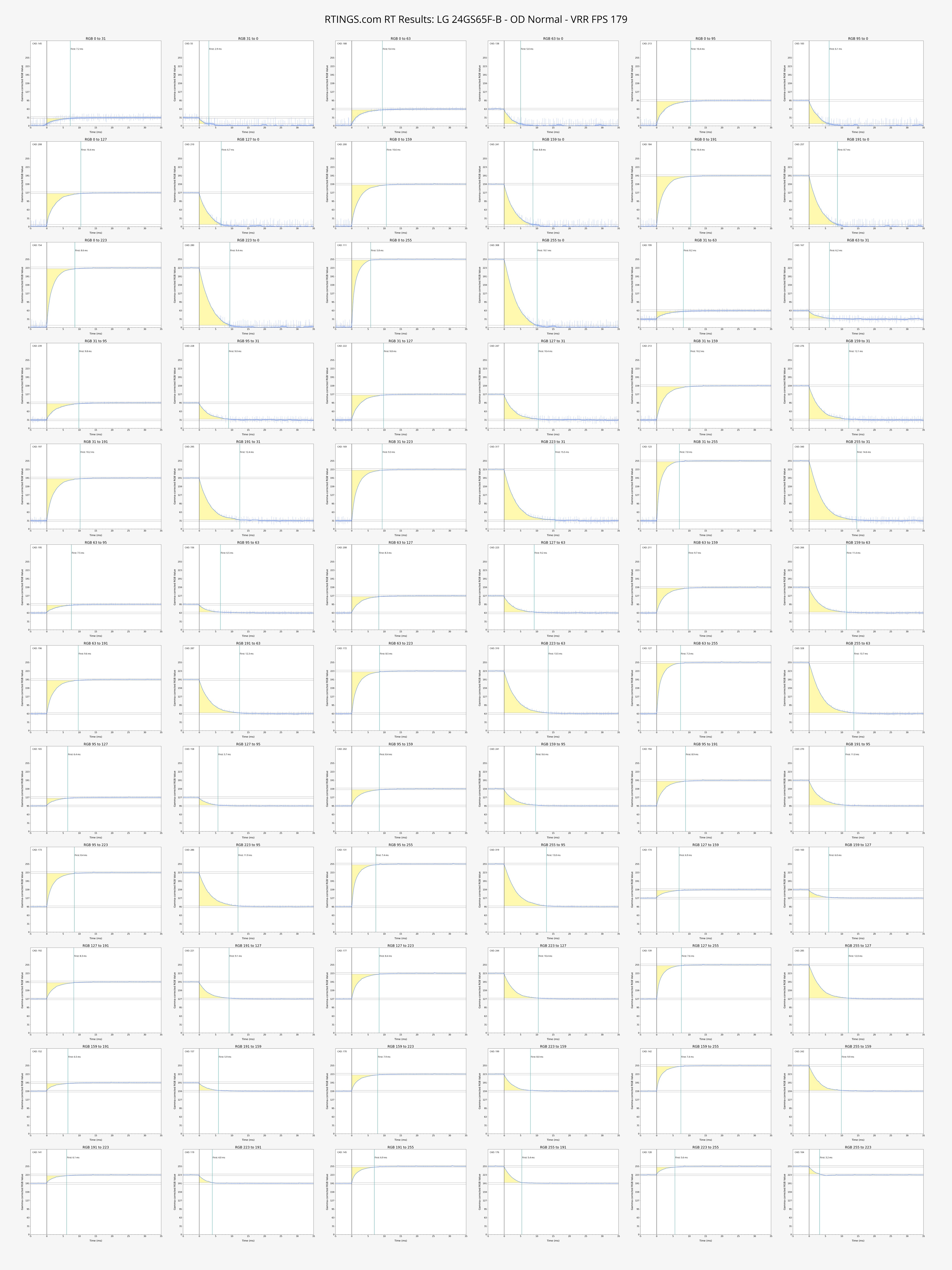 The LG 24GS65F-B has good motion handling across its VRR range. The 'Fast' Response Time setting performs the best at most refresh rates, with only a bit of blur, but it has more inverse ghosting than 'Normal' and 'Off' at low refresh rates. The 'Faster' setting has such high CAD that it passes the limits of our chart, which you can see in an alternative graph.