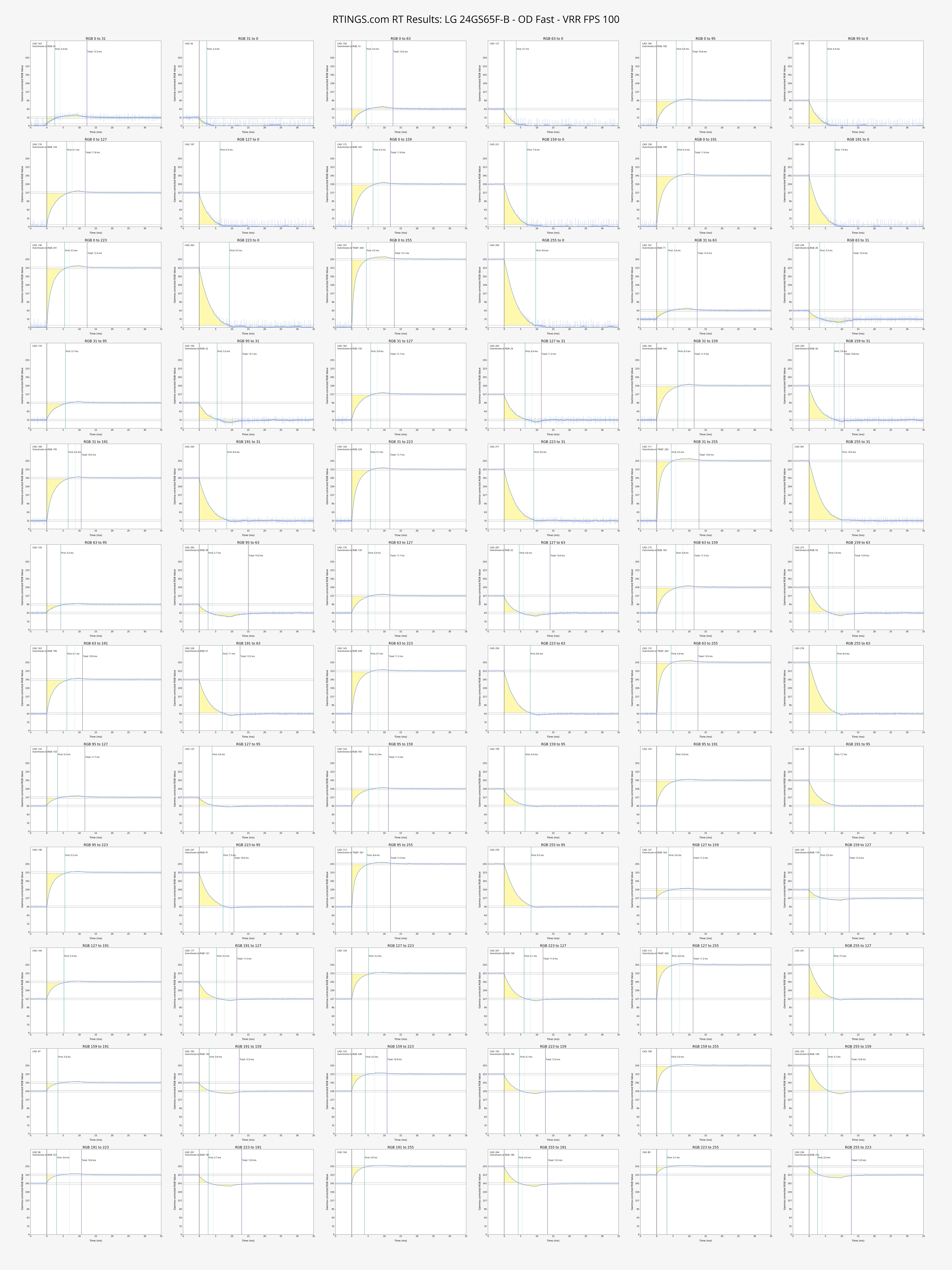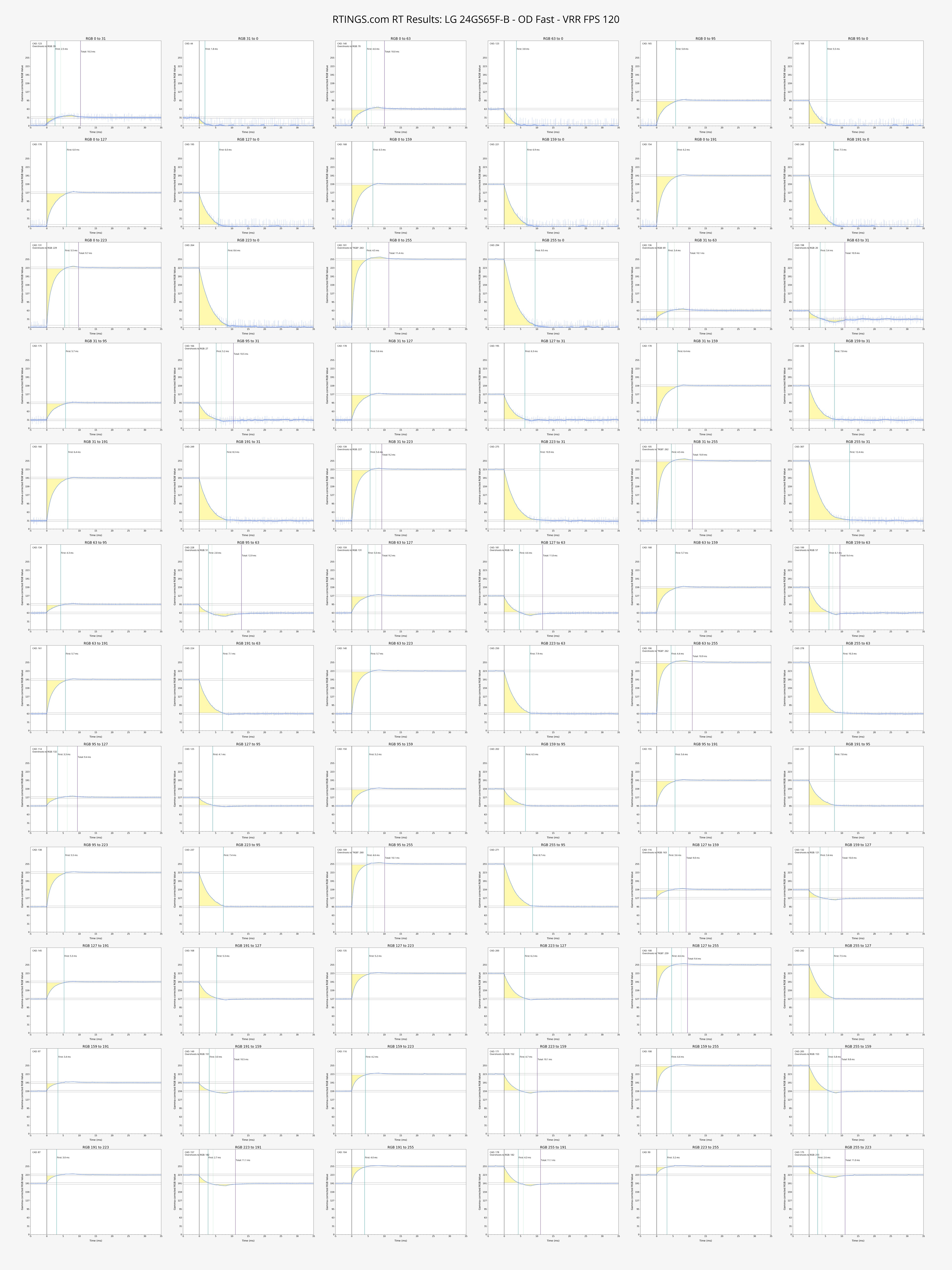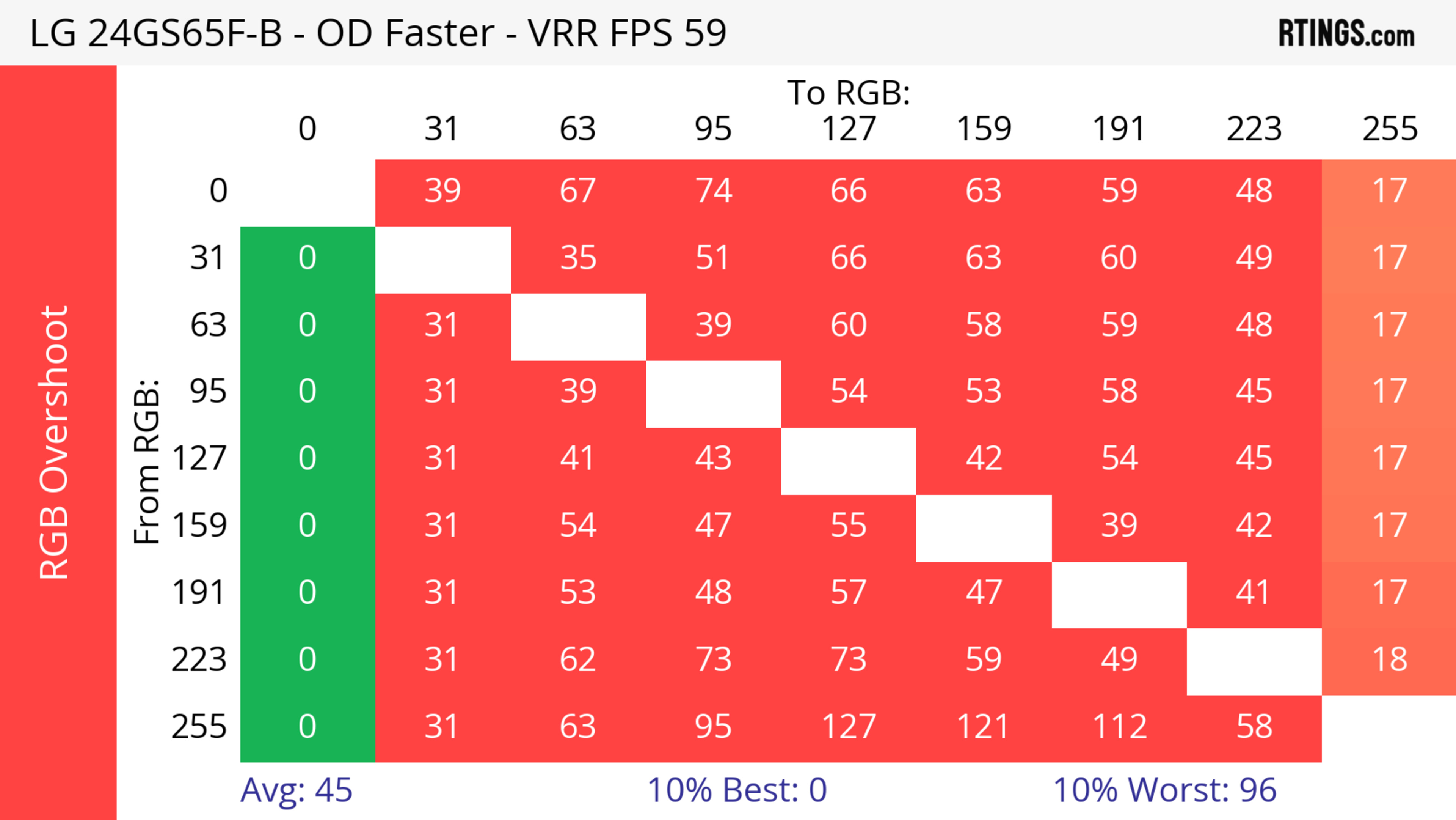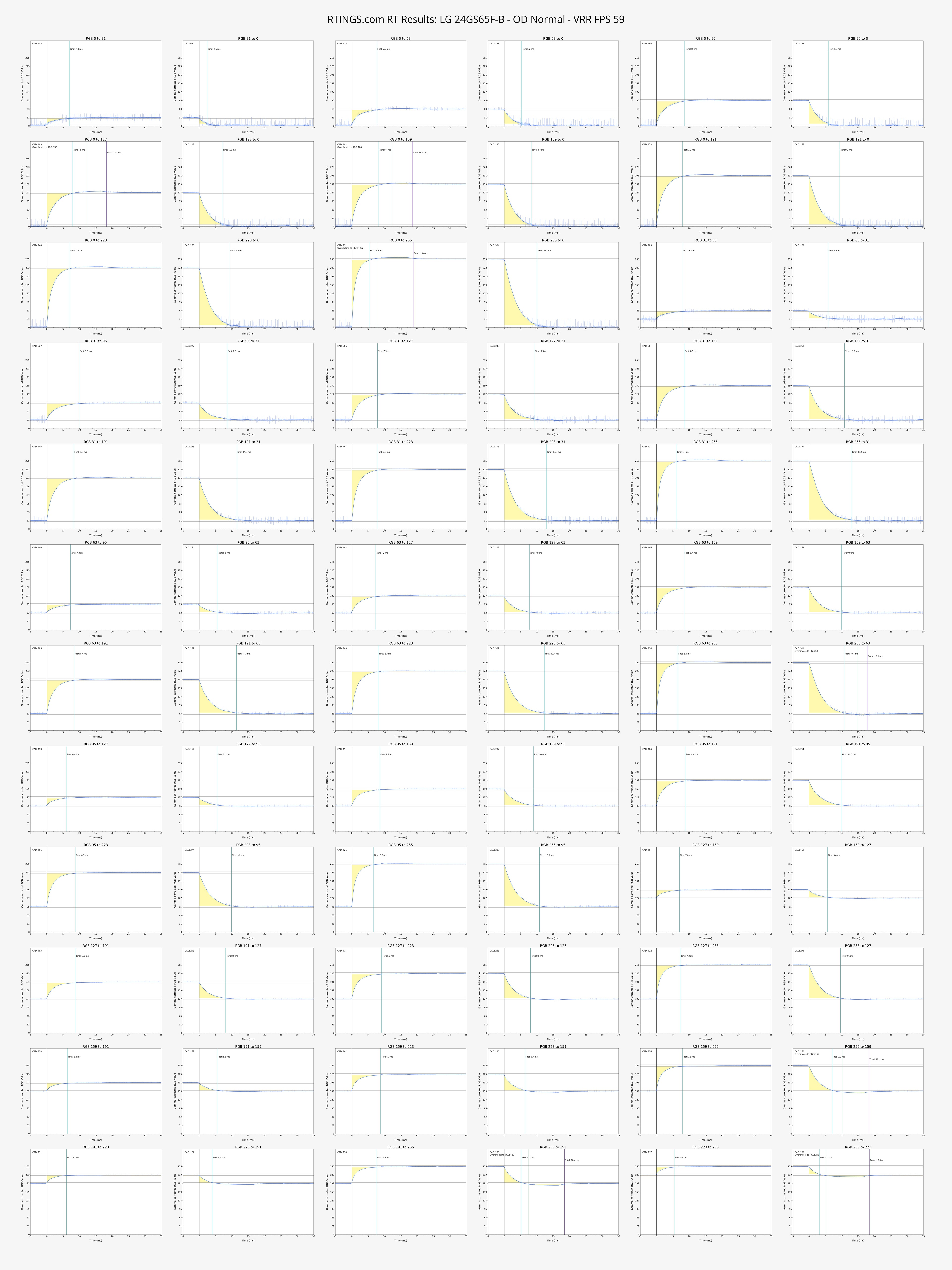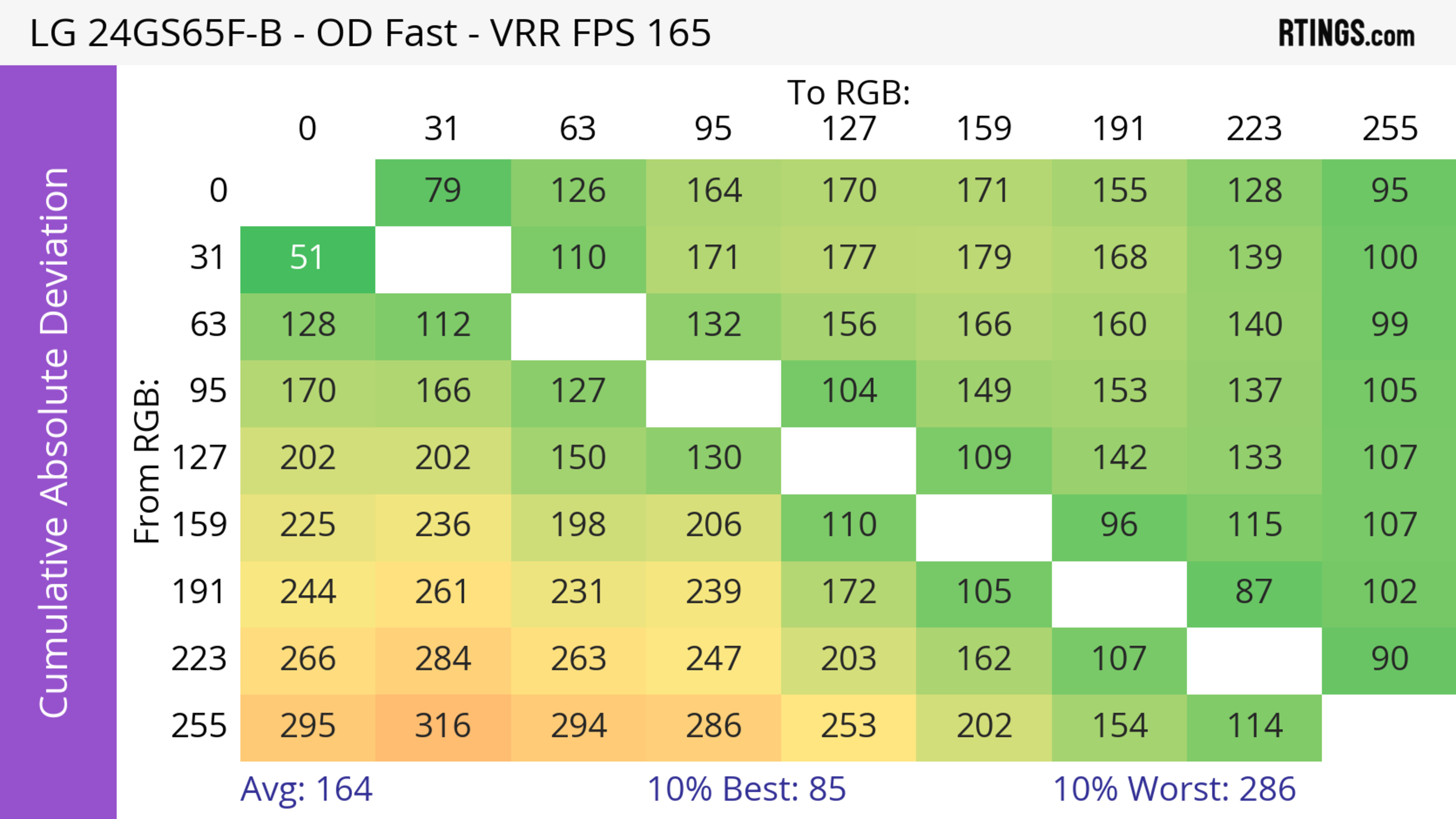 The LG 24GS65F-B has good motion handling across its VRR range. The 'Fast' Response Time setting performs the best at most refresh rates, with only a bit of blur, but it has more inverse ghosting than 'Normal' and 'Off' at low refresh rates. The 'Faster' setting has such high CAD that it passes the limits of our chart, which you can see in an alternative graph.