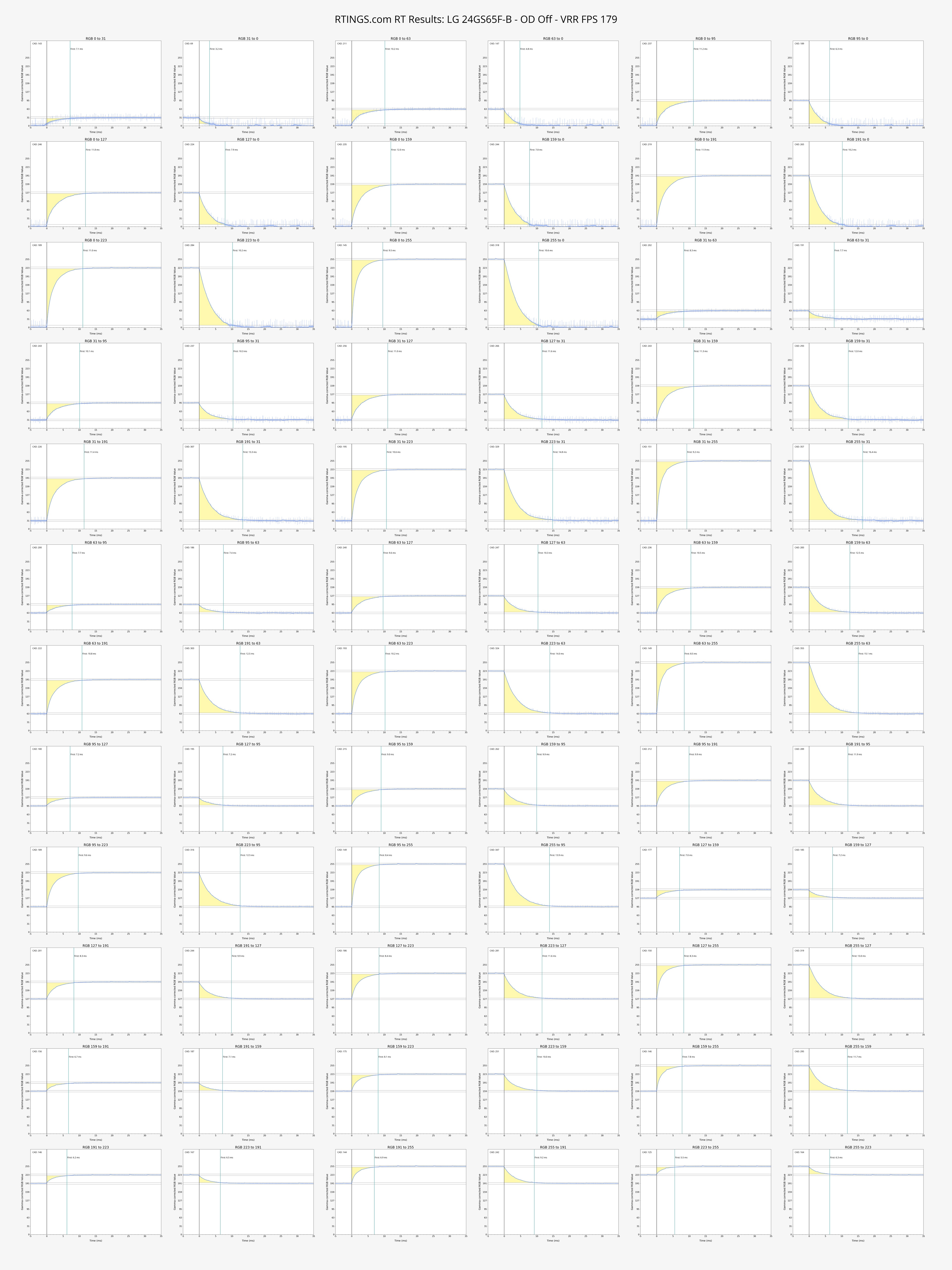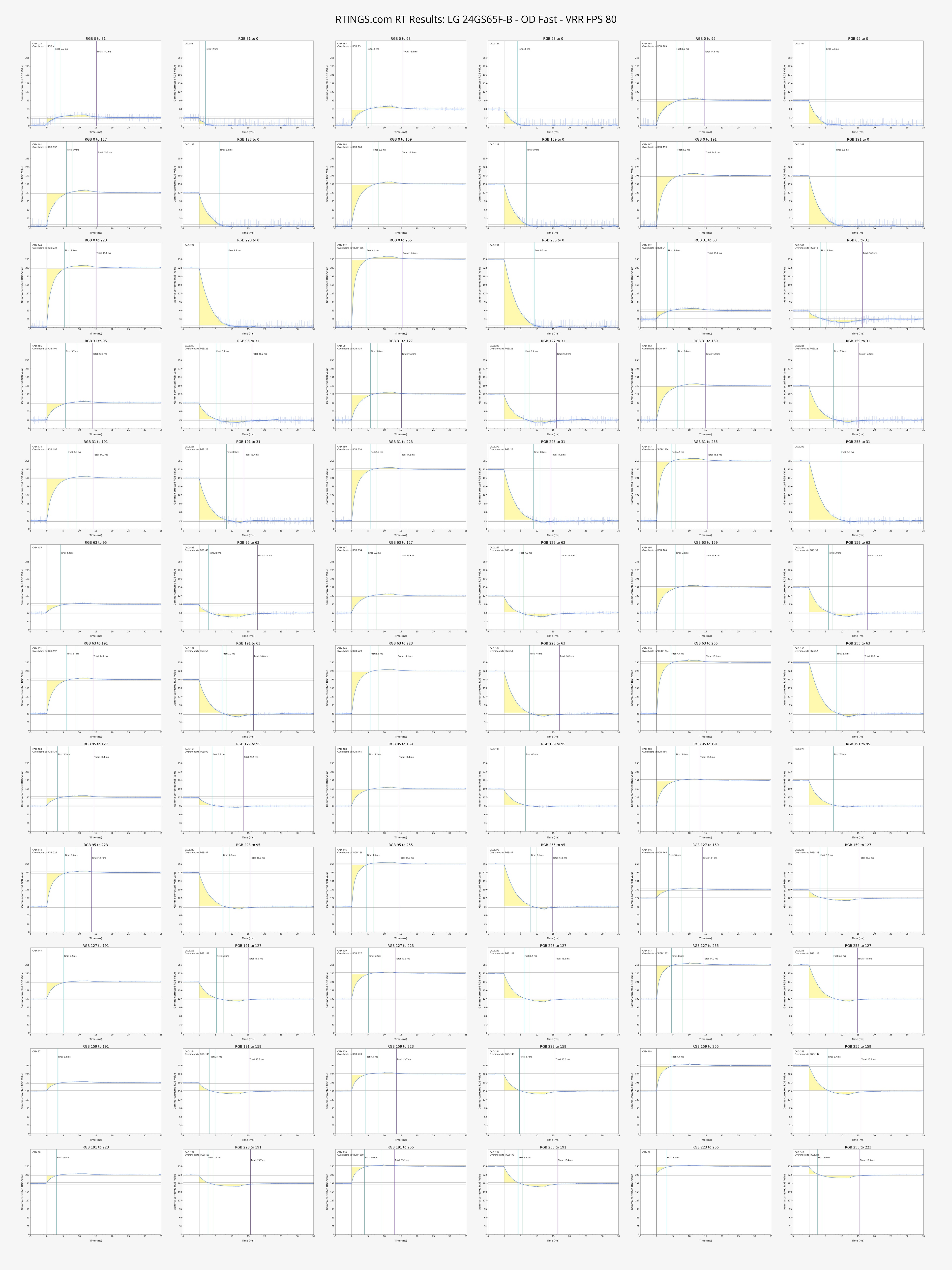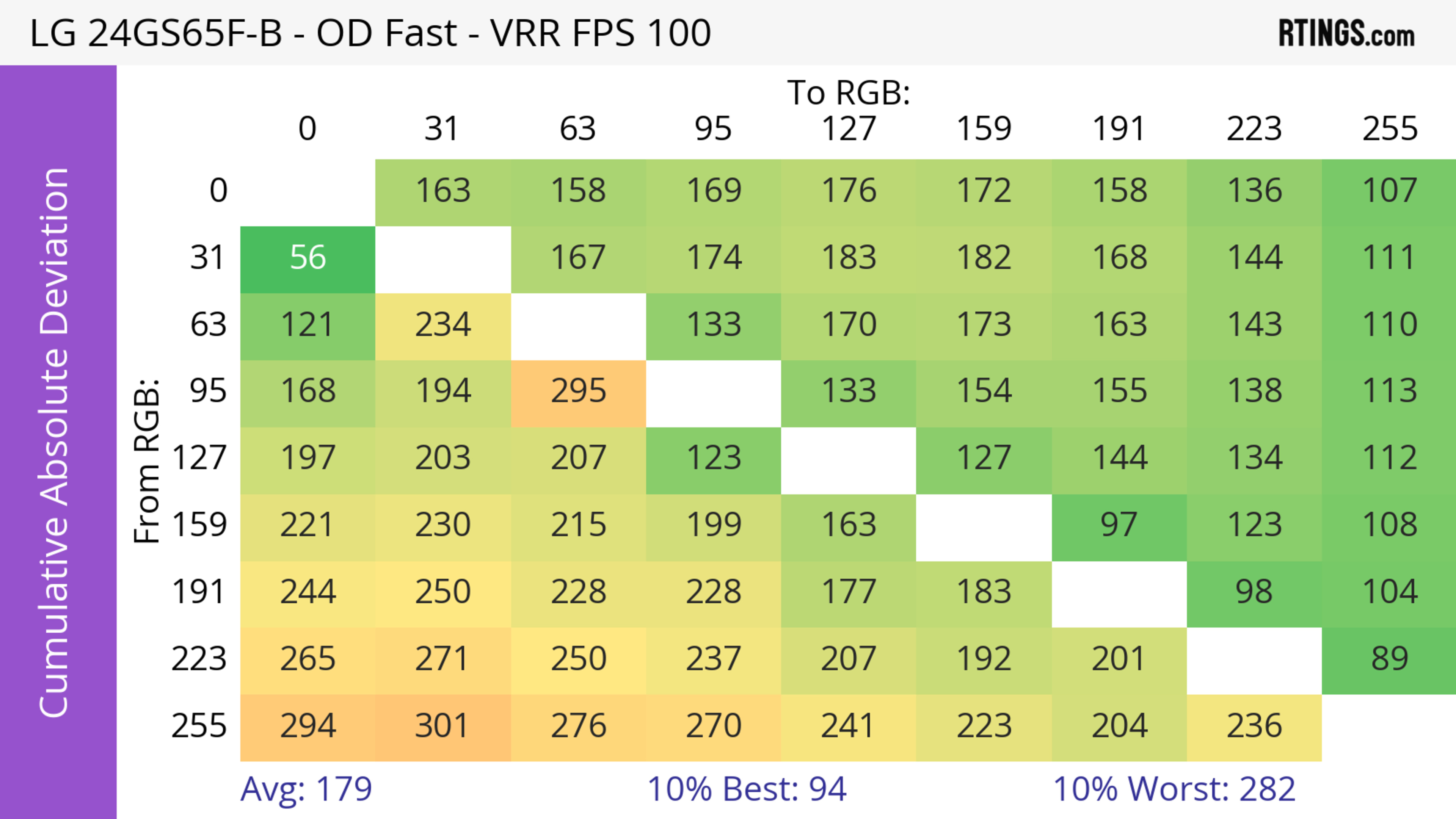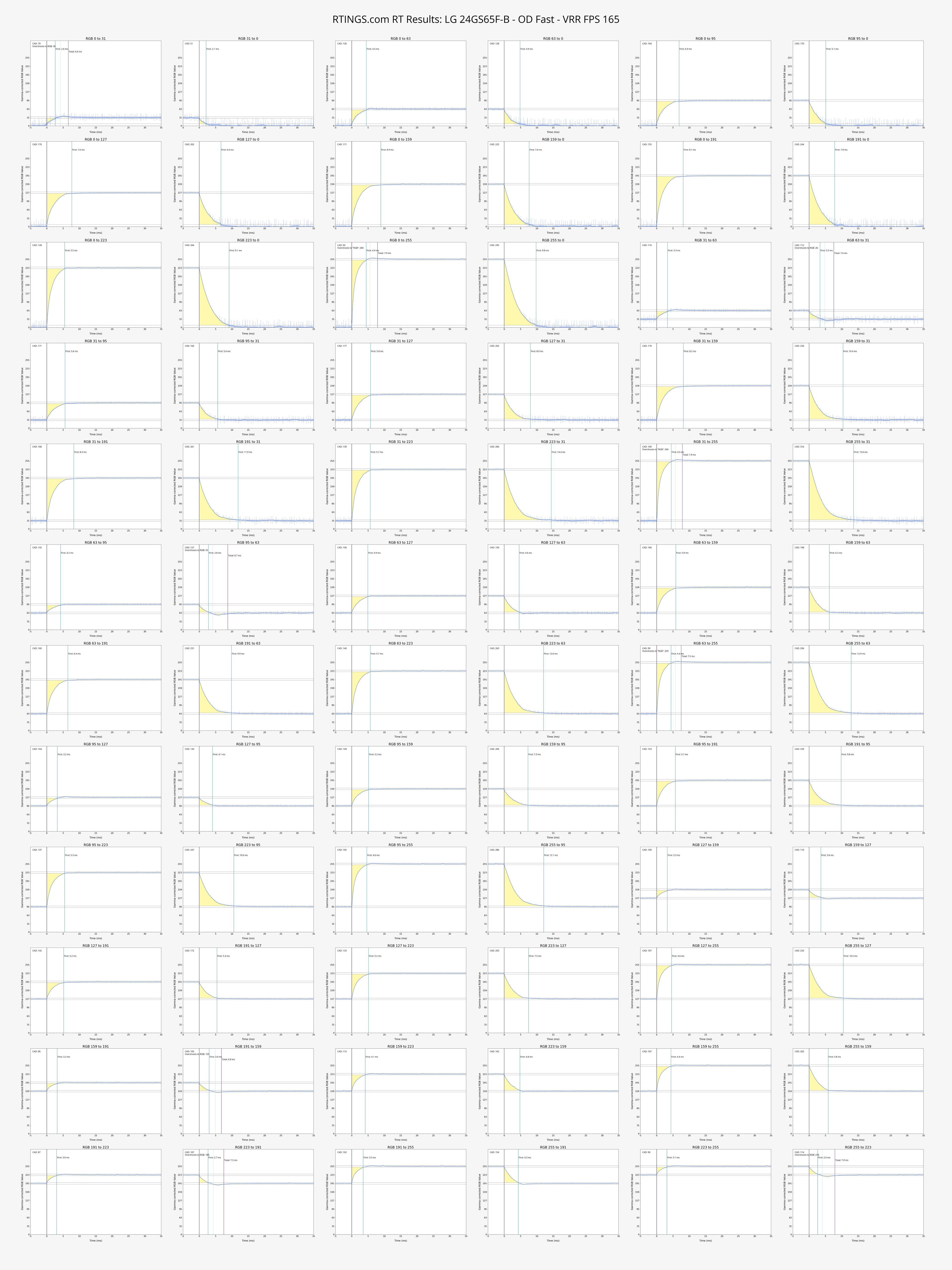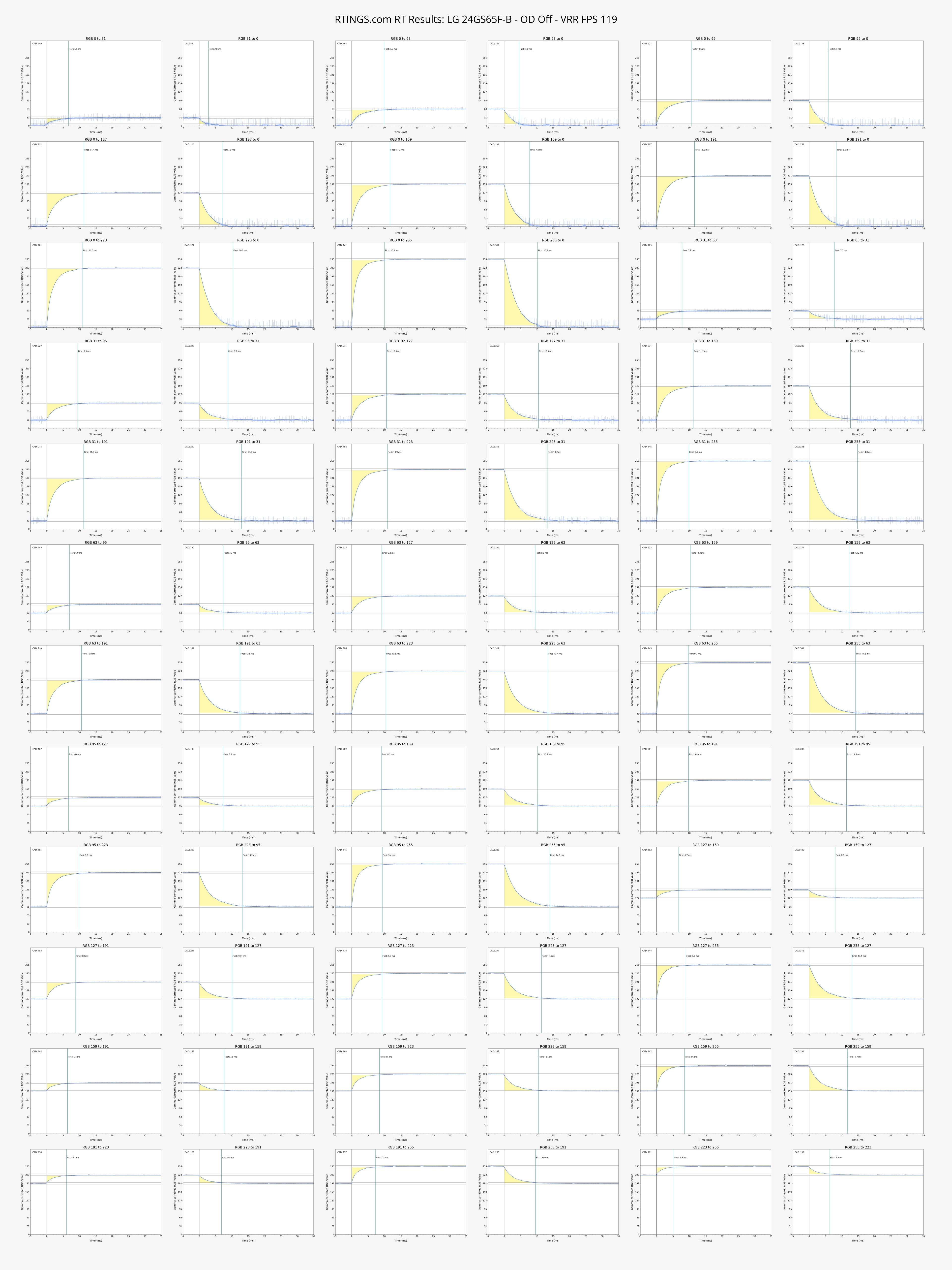 The LG 24GS65F-B has good motion handling across its VRR range. The 'Fast' Response Time setting performs the best at most refresh rates, with only a bit of blur, but it has more inverse ghosting than 'Normal' and 'Off' at low refresh rates. The 'Faster' setting has such high CAD that it passes the limits of our chart, which you can see in an alternative graph.
