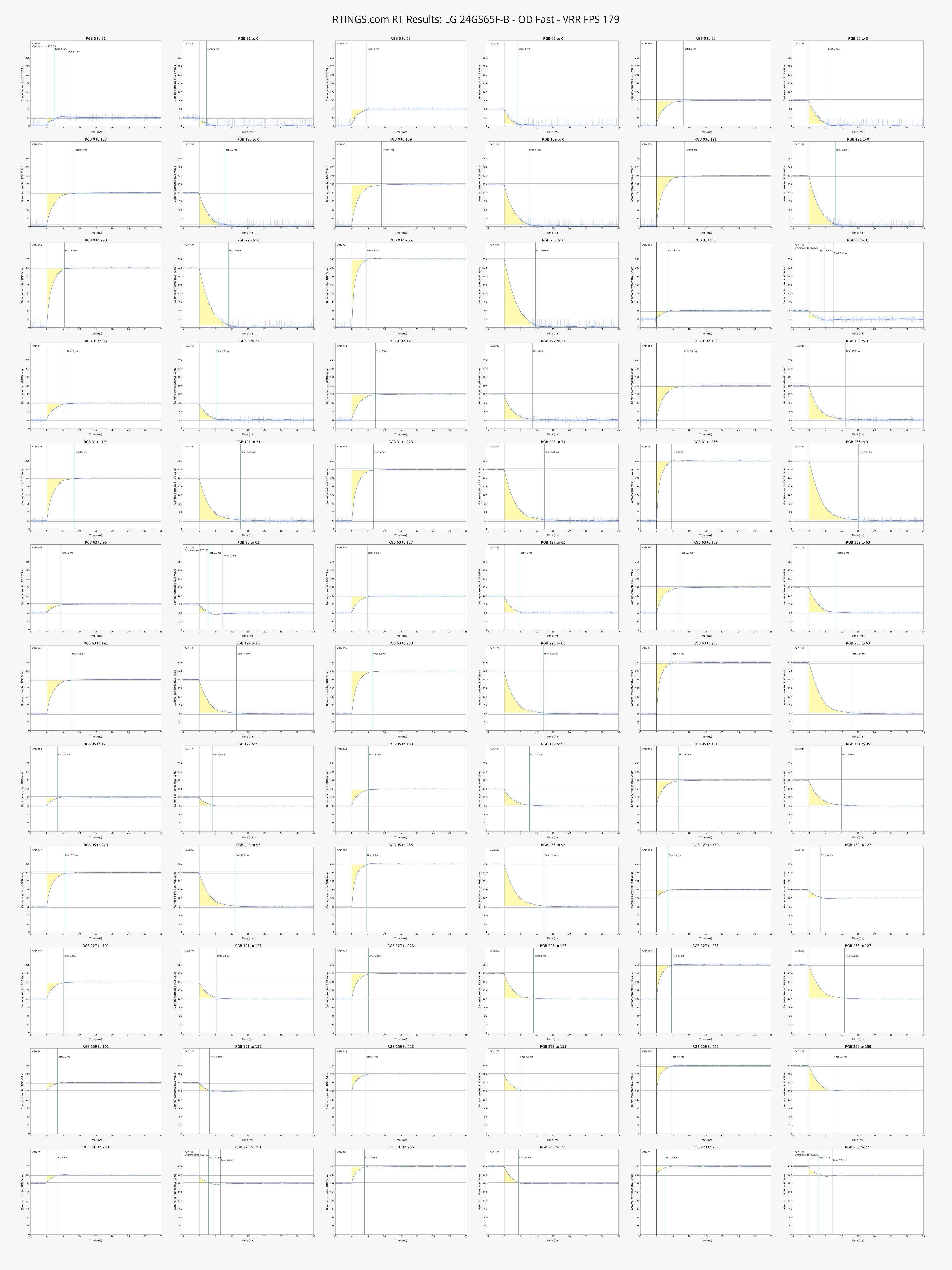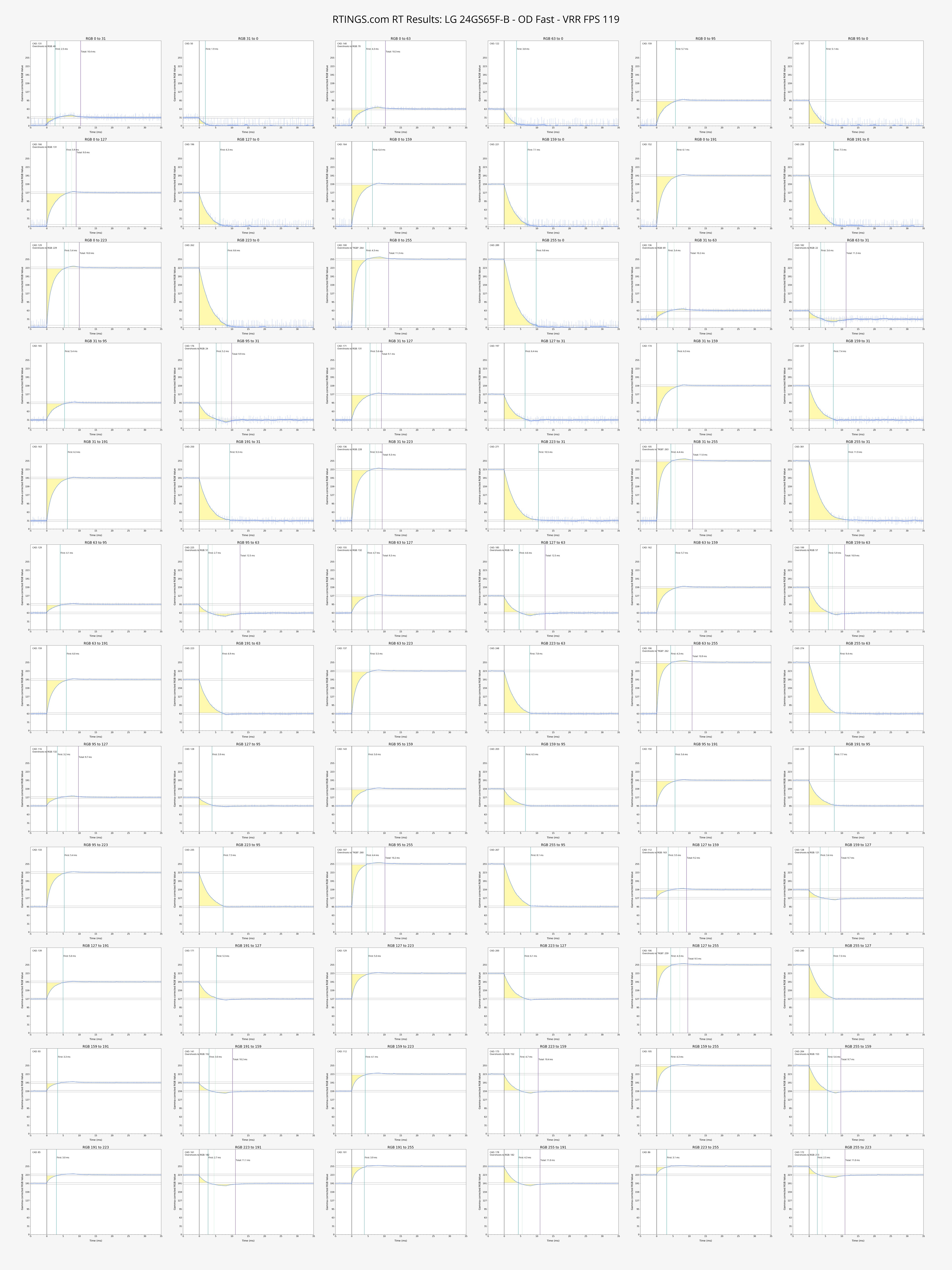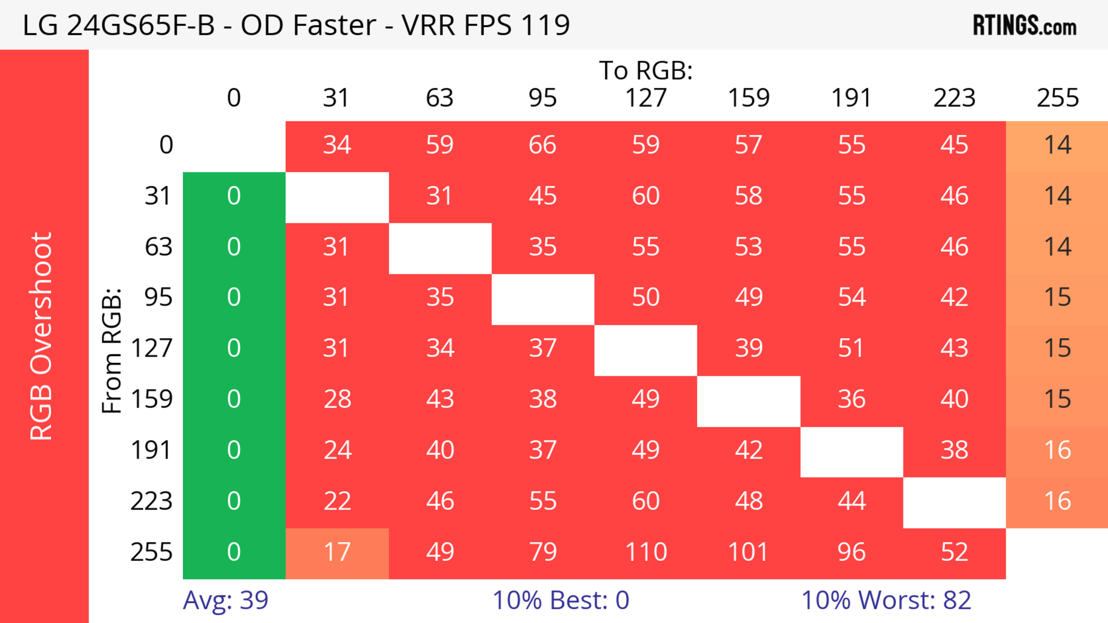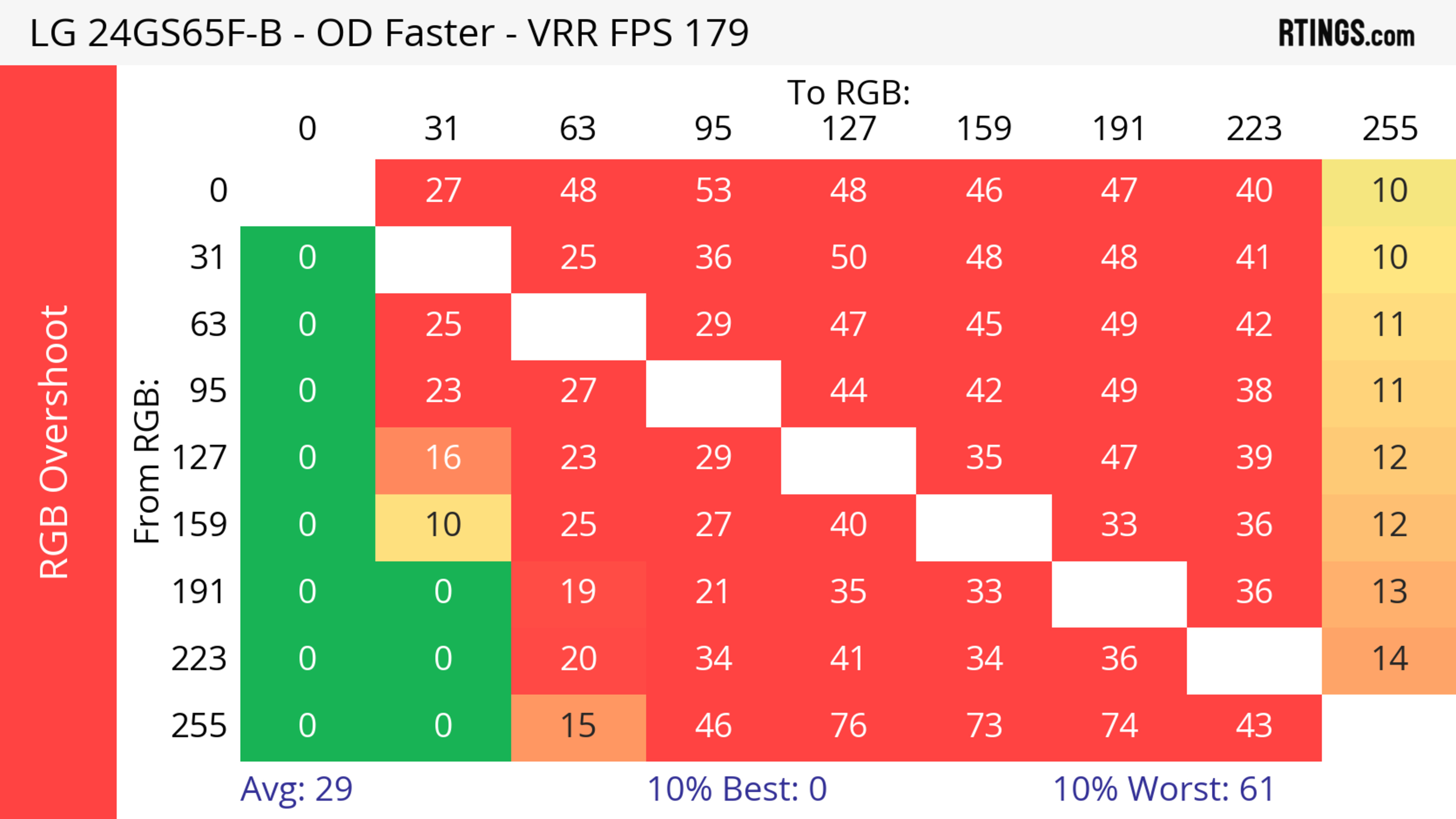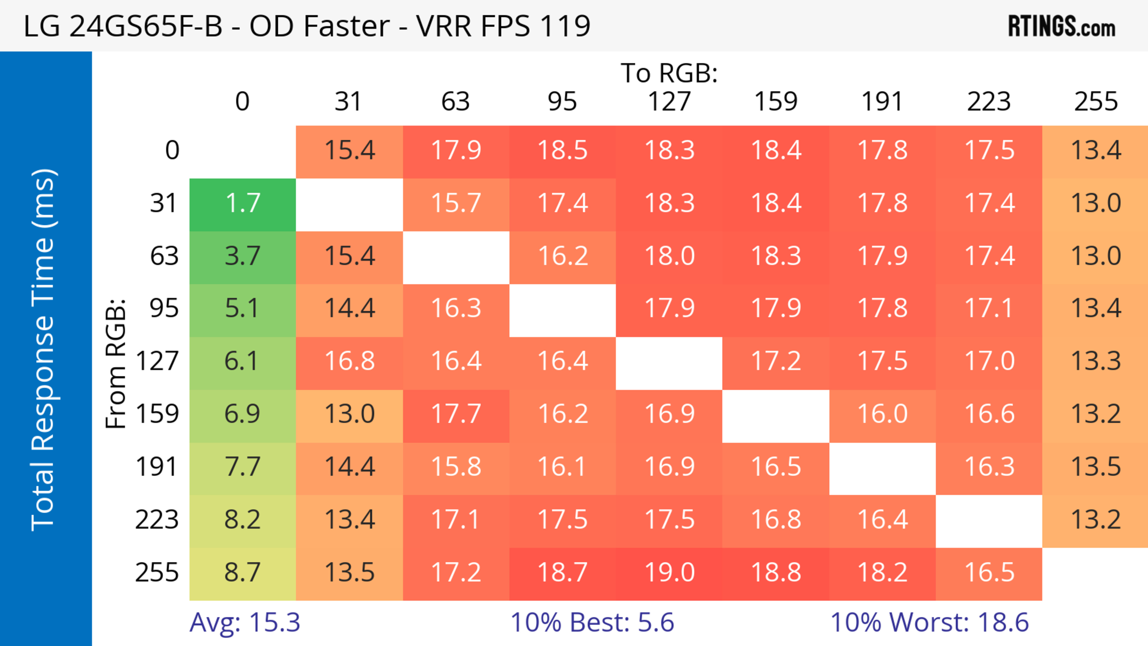The LG 24GS65F-B has good motion handling across its VRR range. The 'Fast' Response Time setting performs the best at most refresh rates, with only a bit of blur, but it has more inverse ghosting than 'Normal' and 'Off' at low refresh rates. The 'Faster' setting has such high CAD that it passes the limits of our chart, which you can see in an alternative graph.