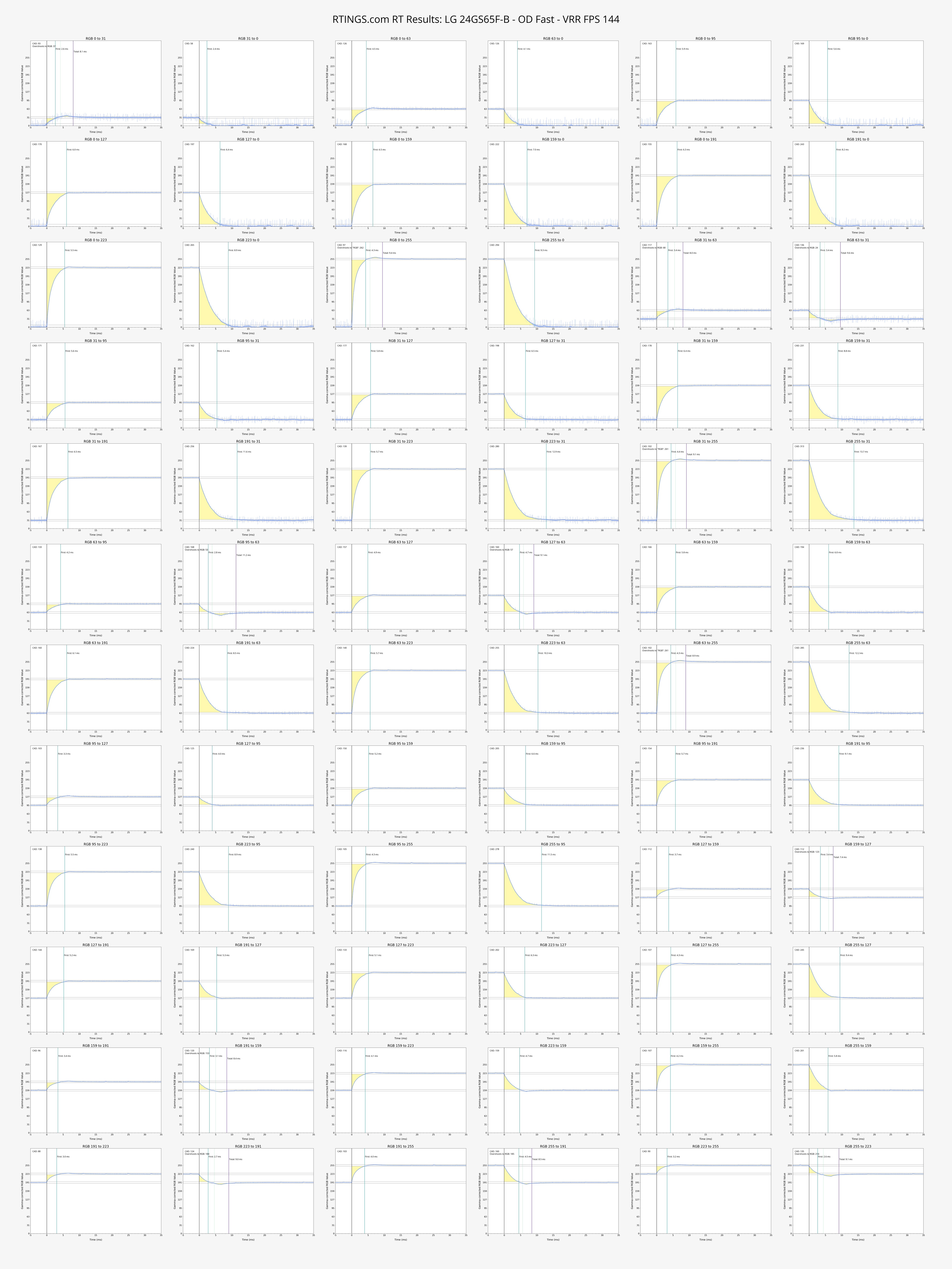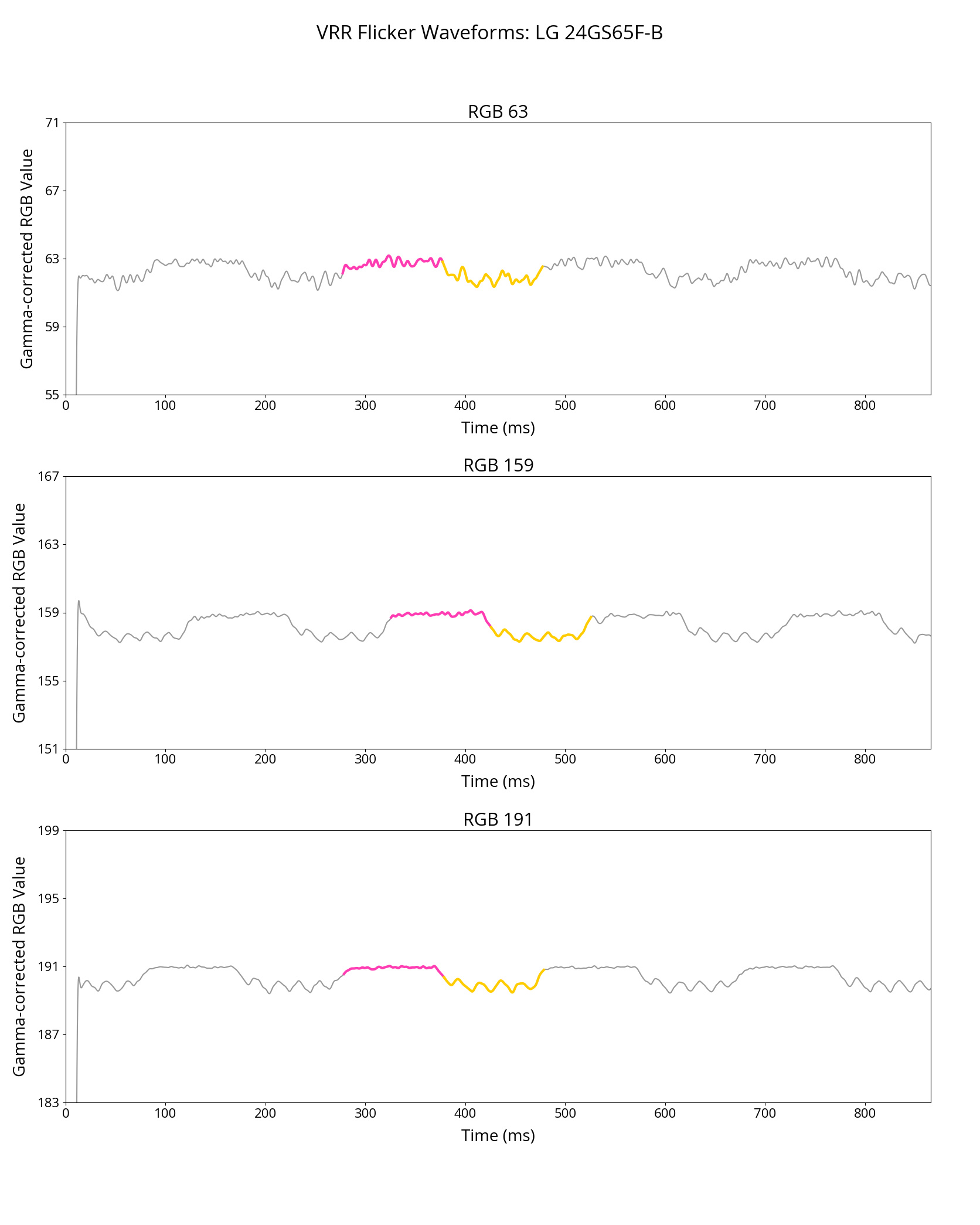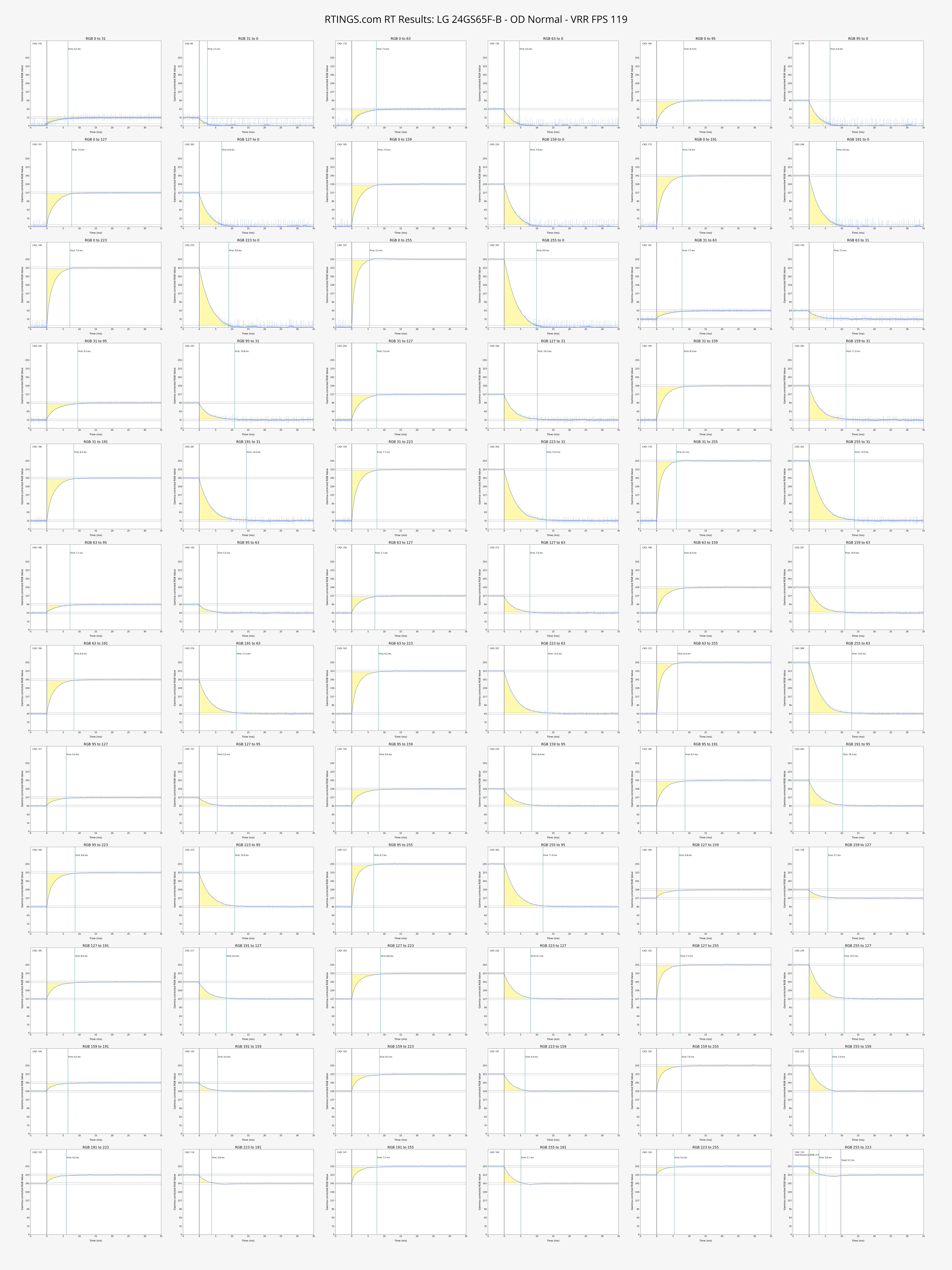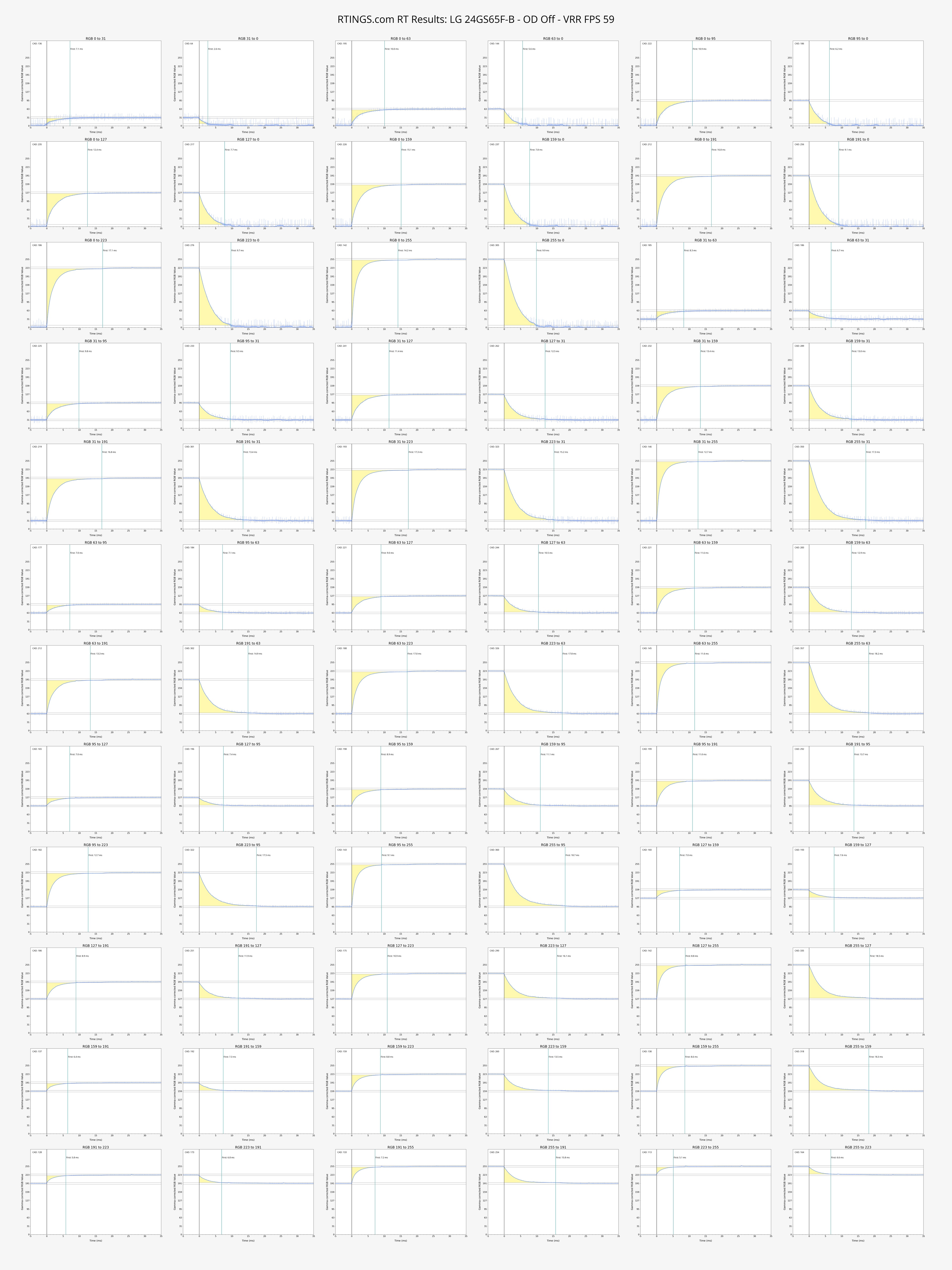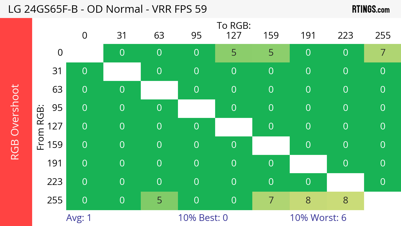 The LG 24GS65F-B has good motion handling across its VRR range. The 'Fast' Response Time setting performs the best at most refresh rates, with only a bit of blur, but it has more inverse ghosting than 'Normal' and 'Off' at low refresh rates. The 'Faster' setting has such high CAD that it passes the limits of our chart, which you can see in an alternative graph.